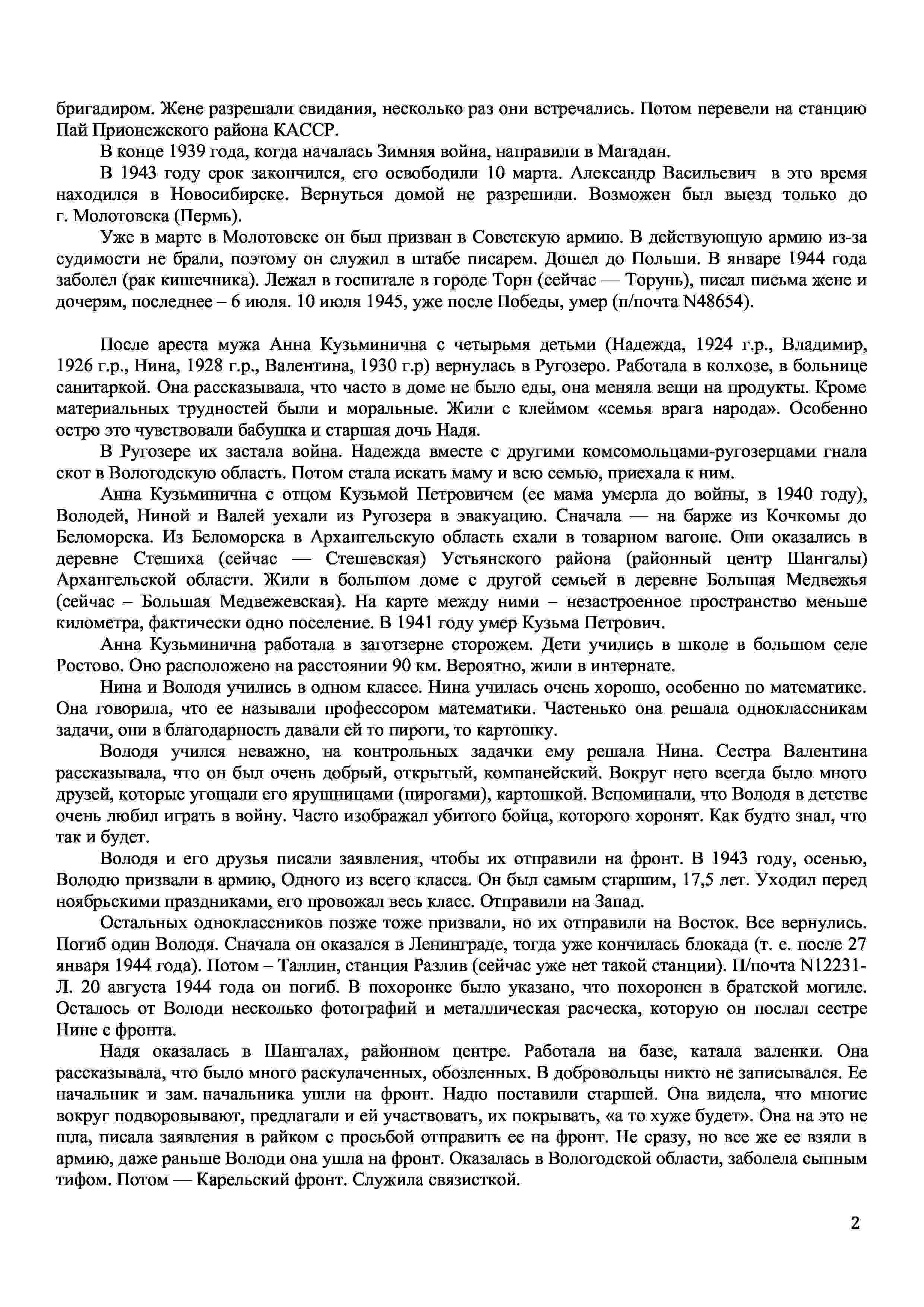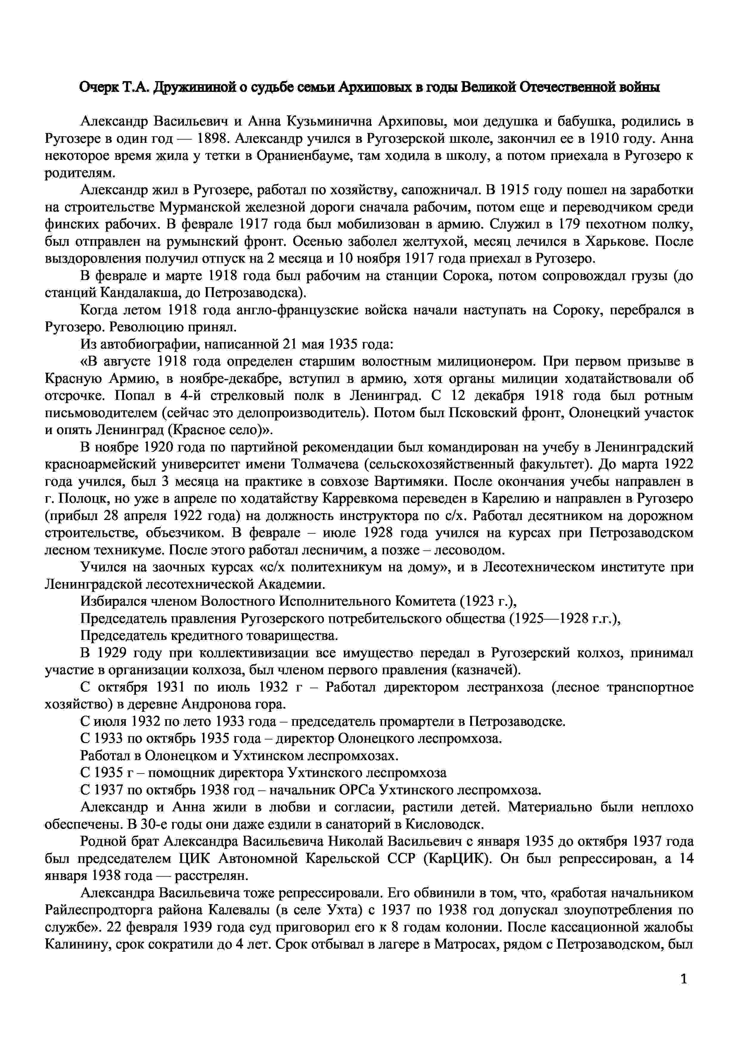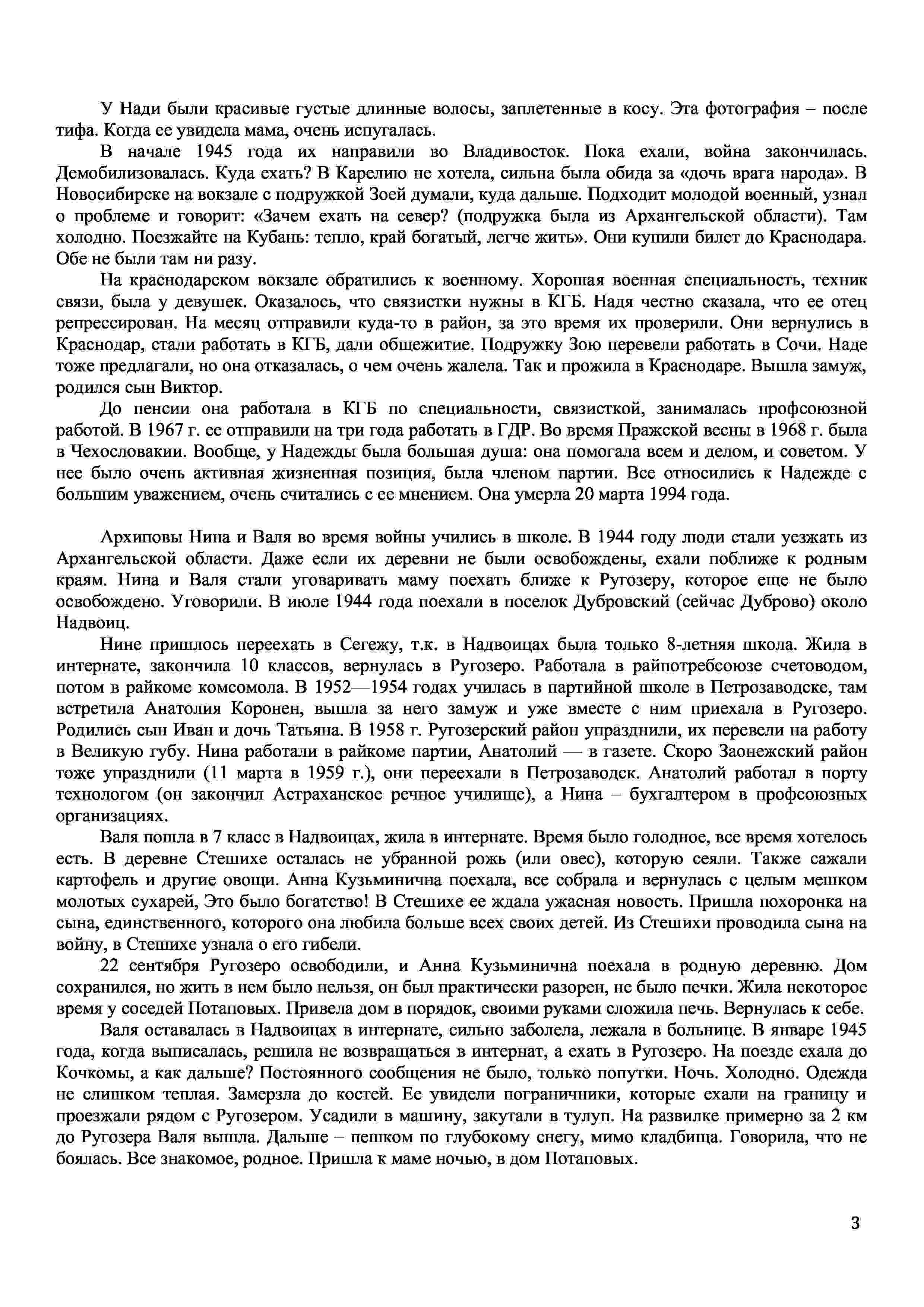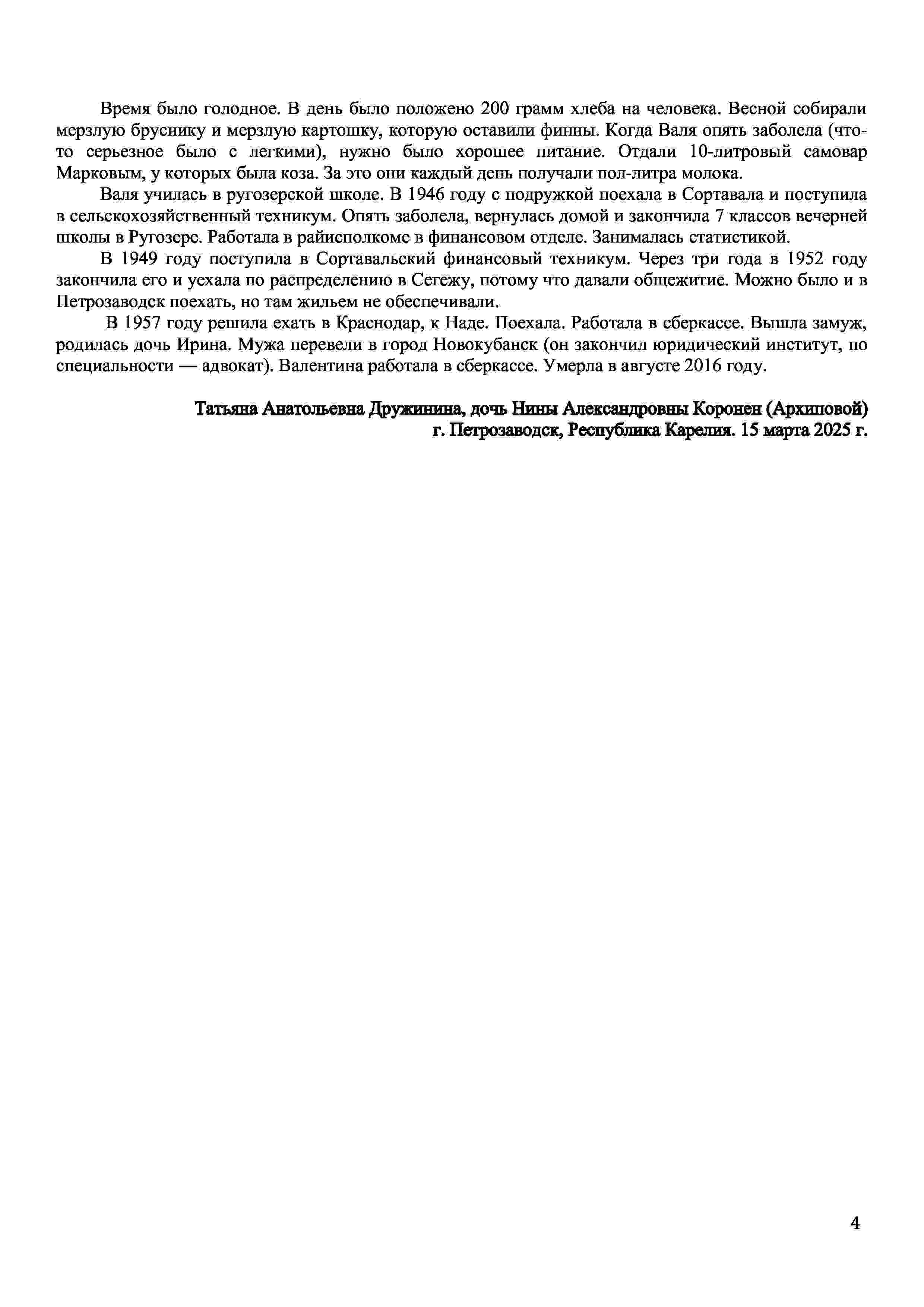 Материалы переданы Татьяной Анатольевной Дружининой (г. Петрозаводск, Республика Карелия), дочерью Нины Александровны Коронен (Архиповой).