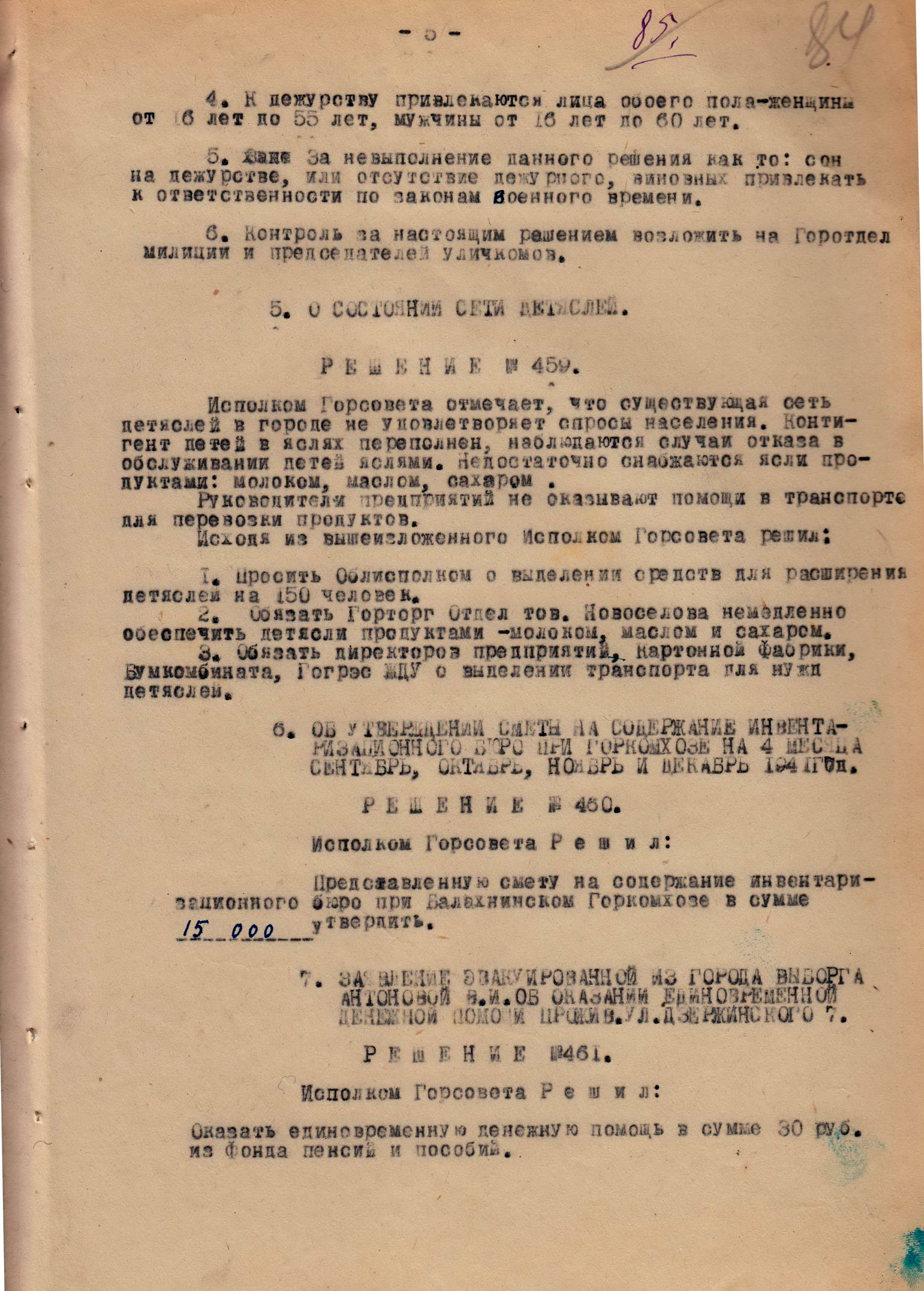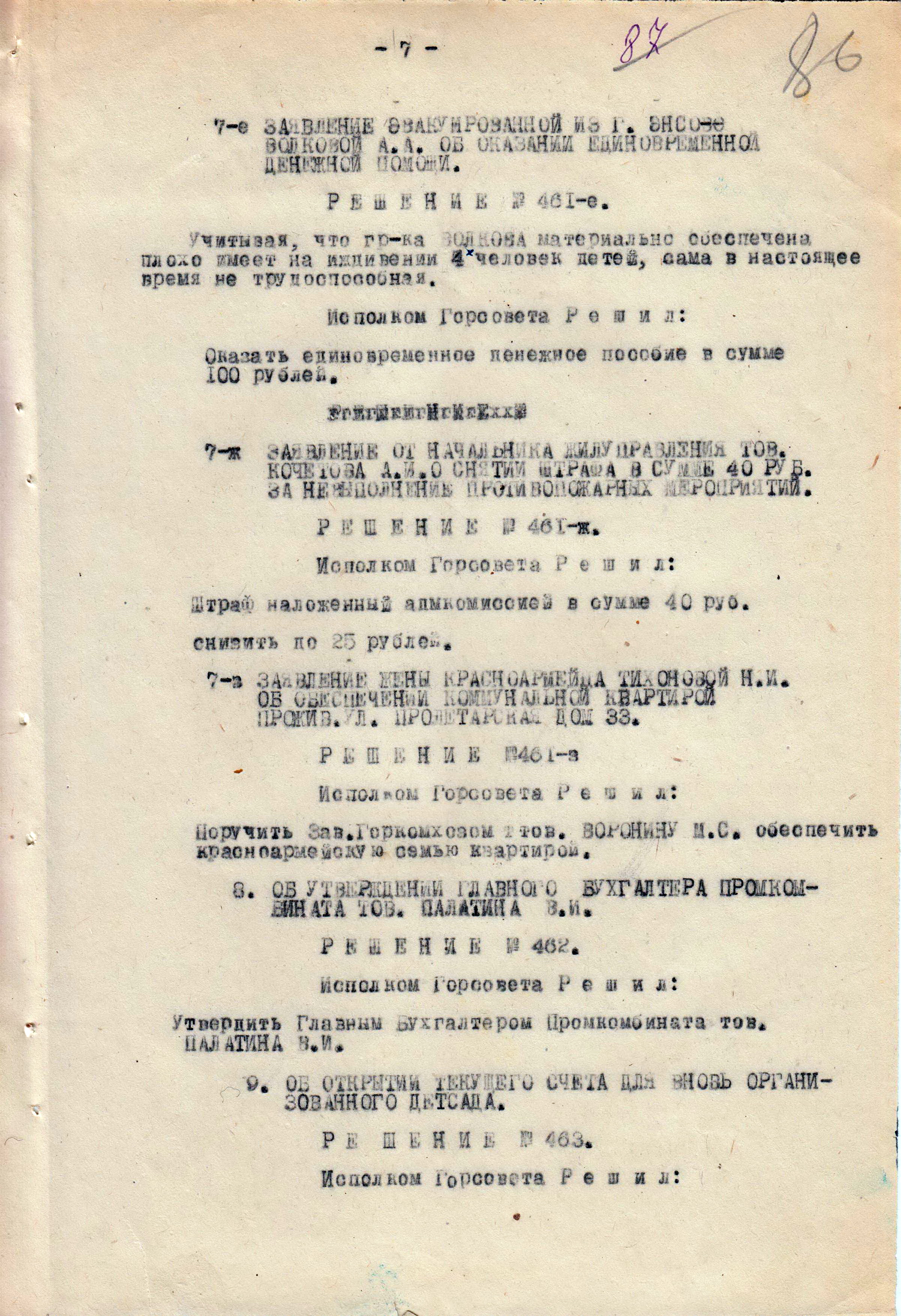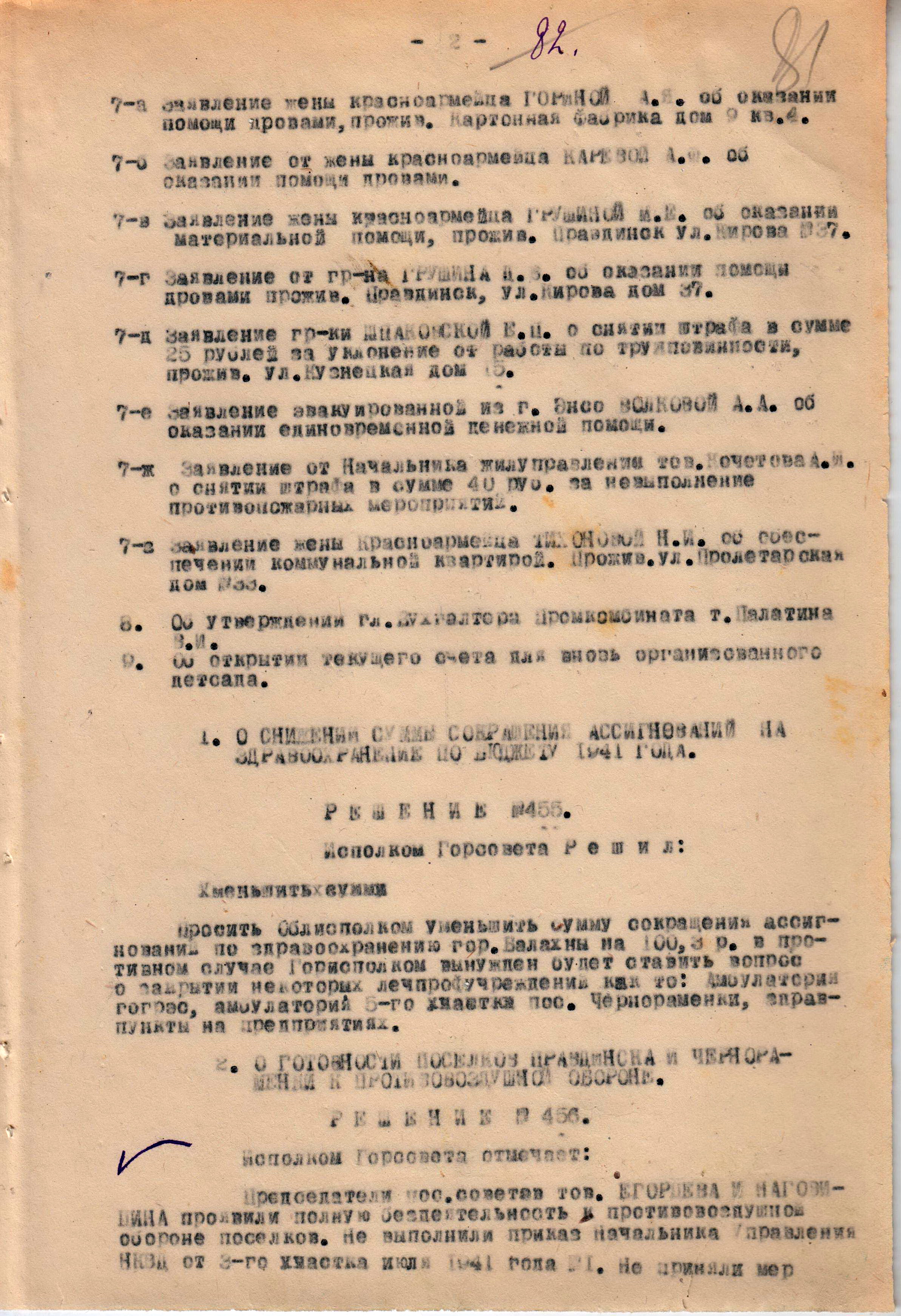 Решения из протокола заседания исполнительного комитета Балахнинского городского совета депутатов трудящихся об оказании единовременной денежной помощи. 18 сентября 1941 г.