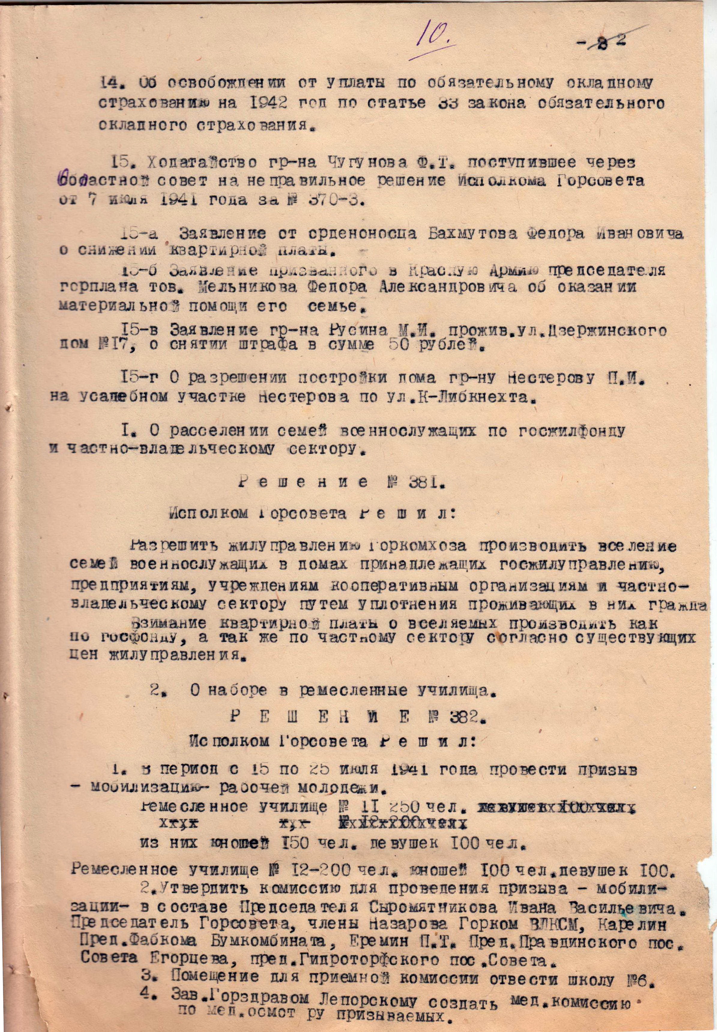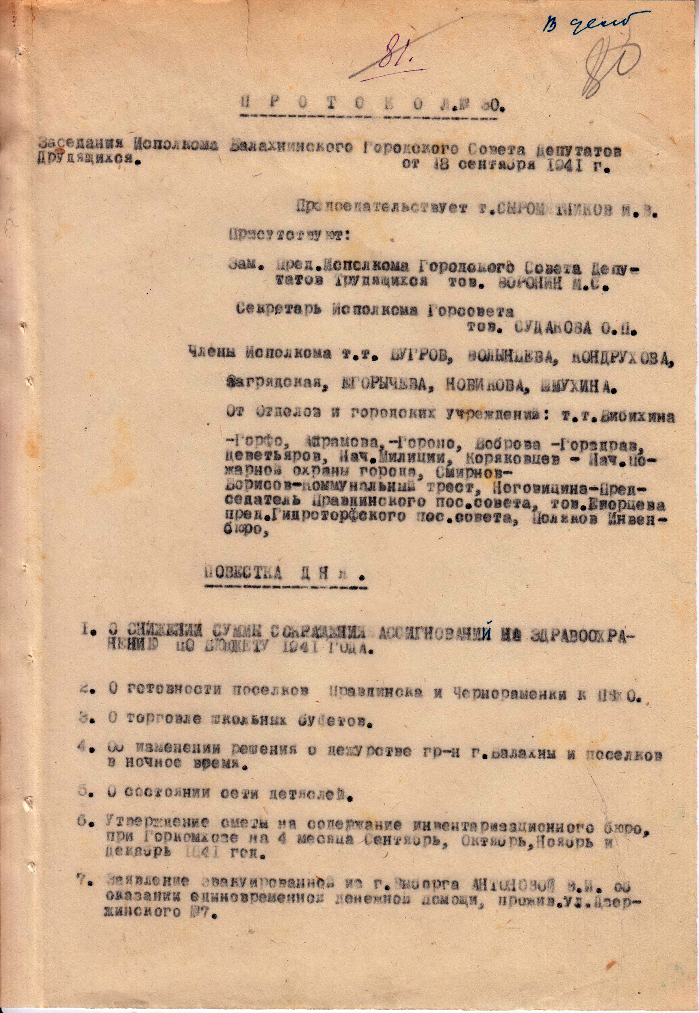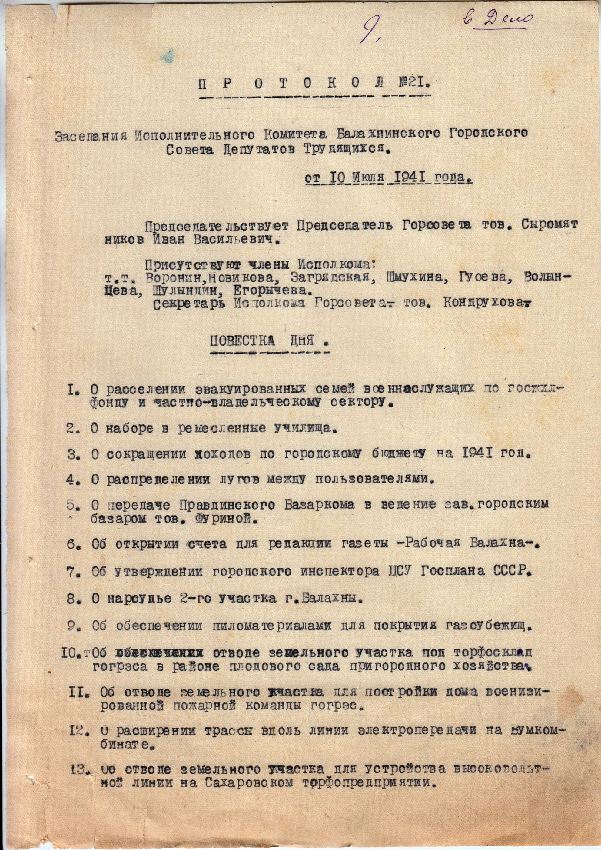 Фрагмент протокола заседания исполнительного комитета Балахнинского городского совета депутатов трудящихся №21. 10 июля 1941 г.