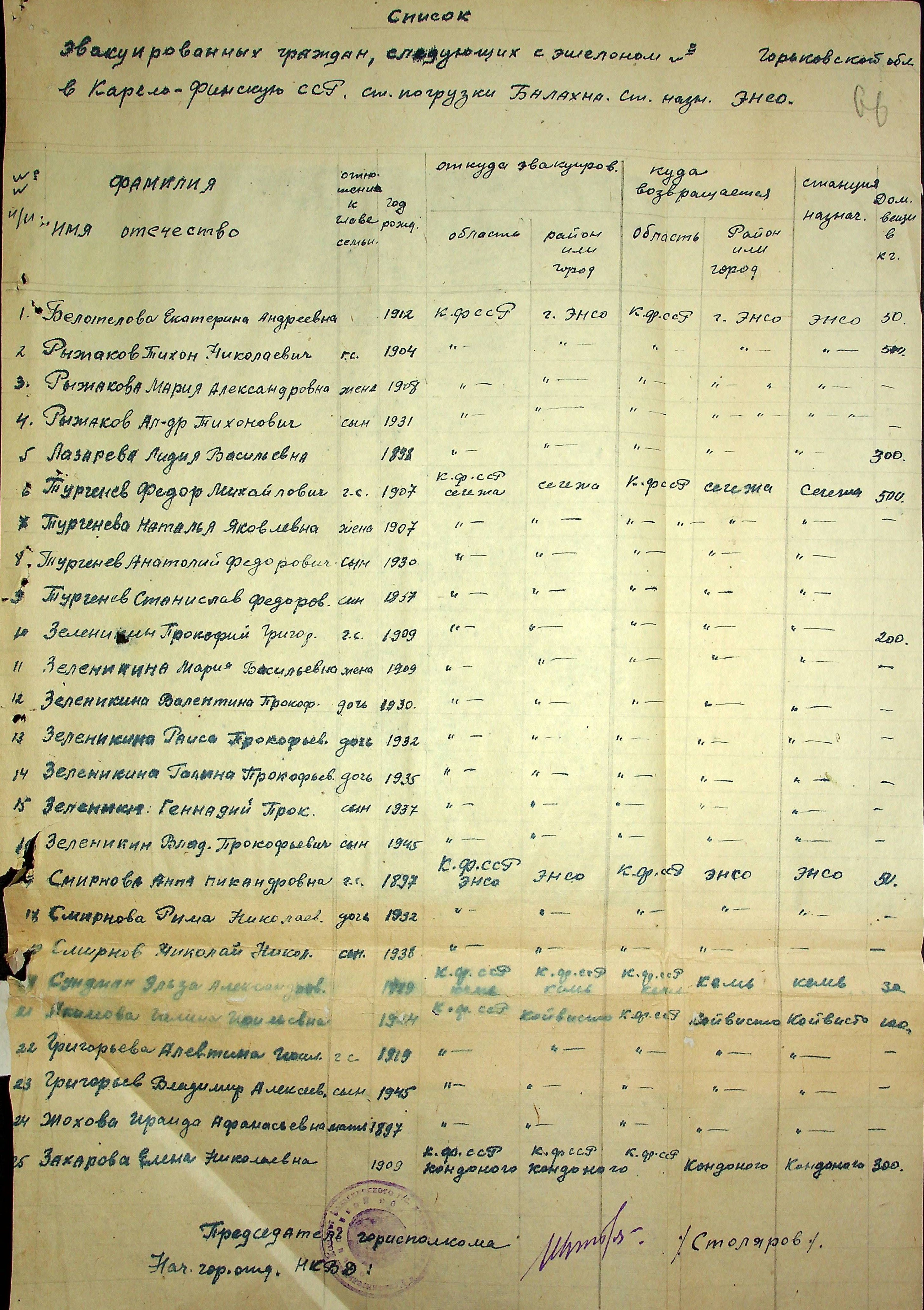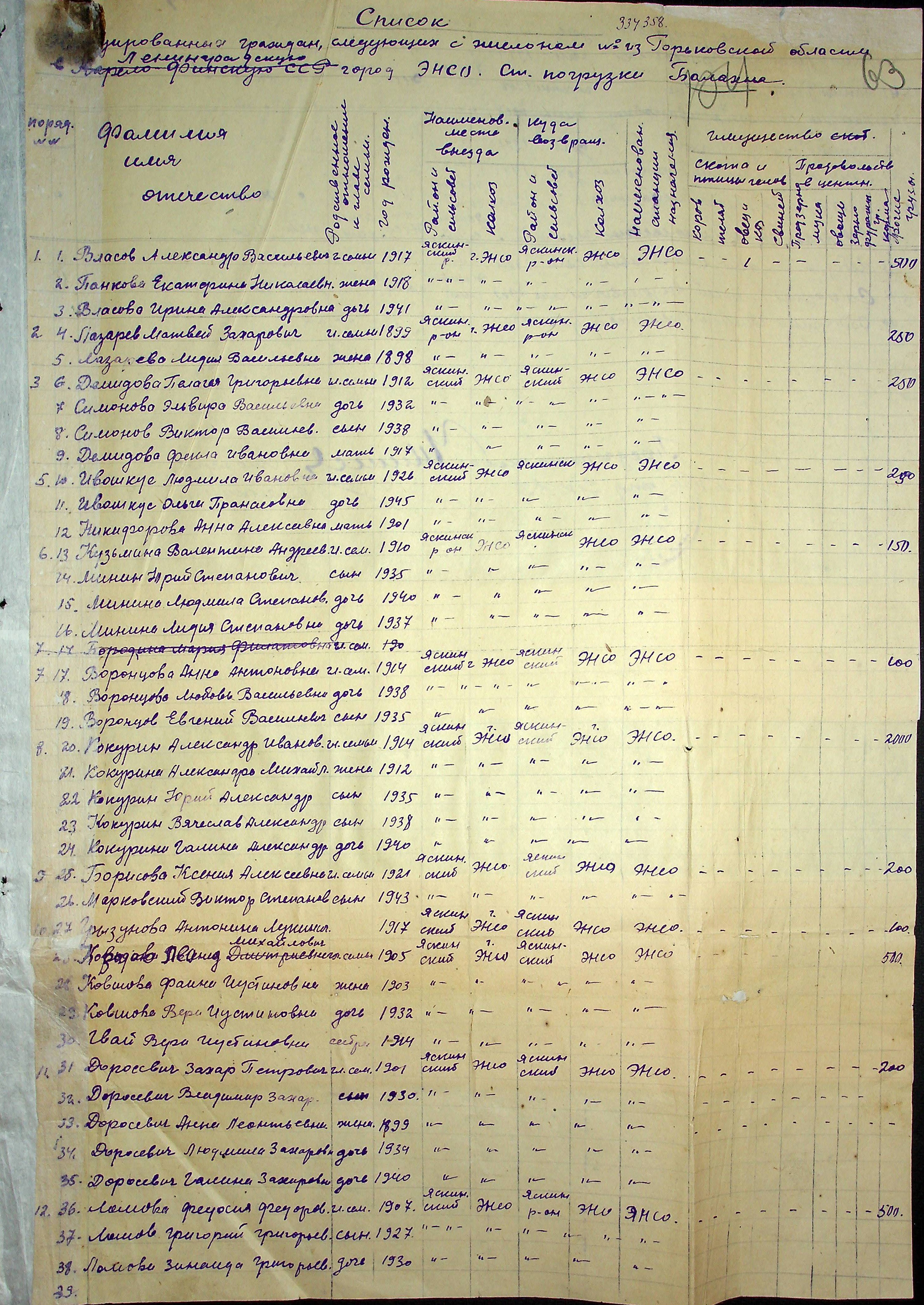 Список реэвакуированных граждан, следующих с эшелоном № 334 358 из Горьковской области в Ленинградскую (Карело-Финскую ССР) г. Энсо, станция погрузки — Балахна. Не ранее 1945 г.