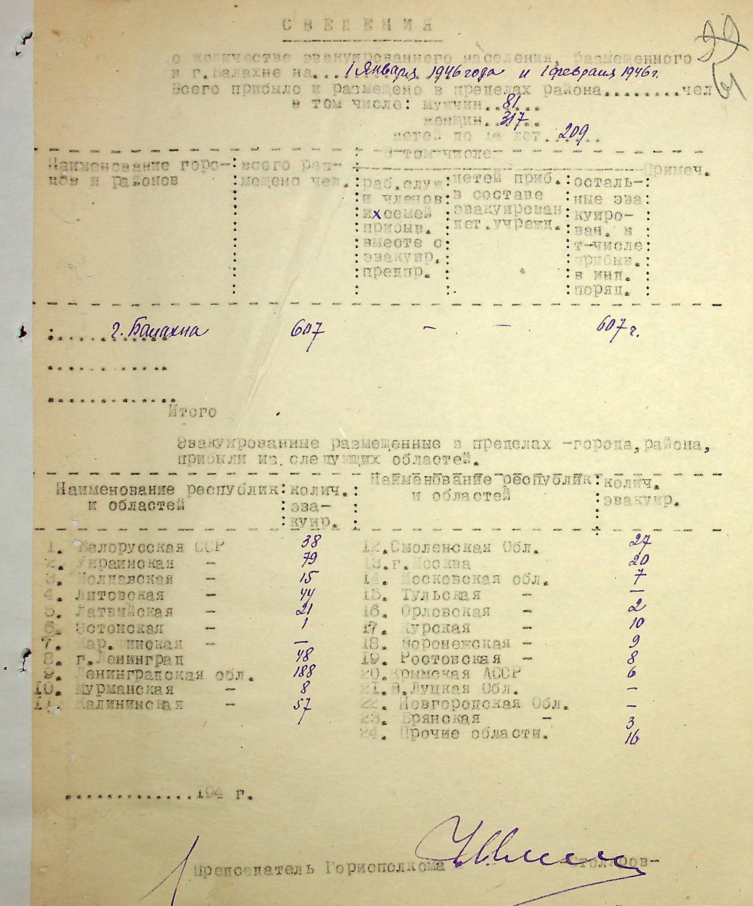 Сведения о количестве эвакуированного населения, размещенного в г. Балахне на 1 января 1946 г. 1 февраля 1946 г.