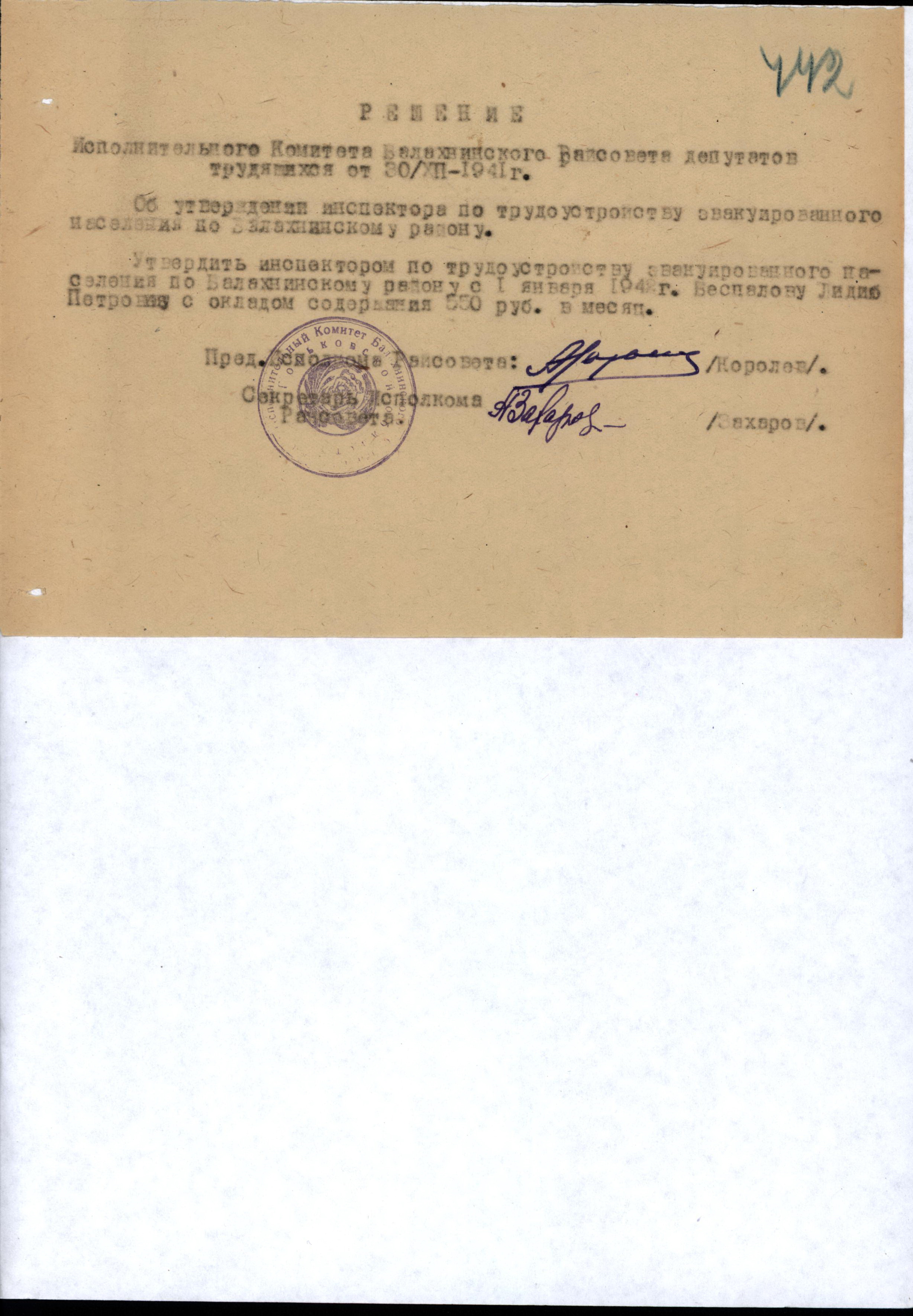 Решение исполнительного комитета Балахнинского райсовета депутатов трудящихся об утверждении инспектора по трудоустройству эвакуированного населения по Балахнинскому району. 30 декабря 1941 г.