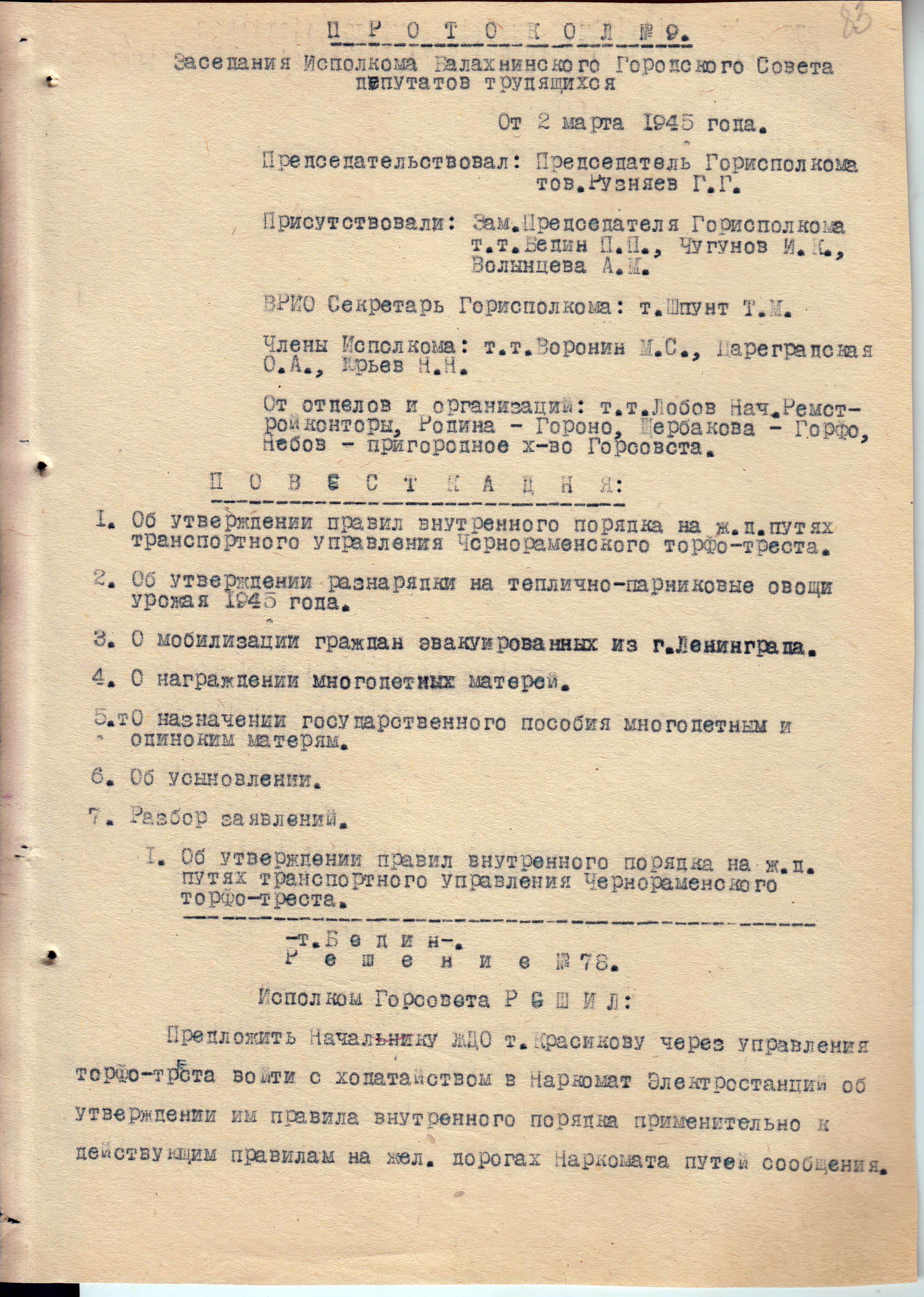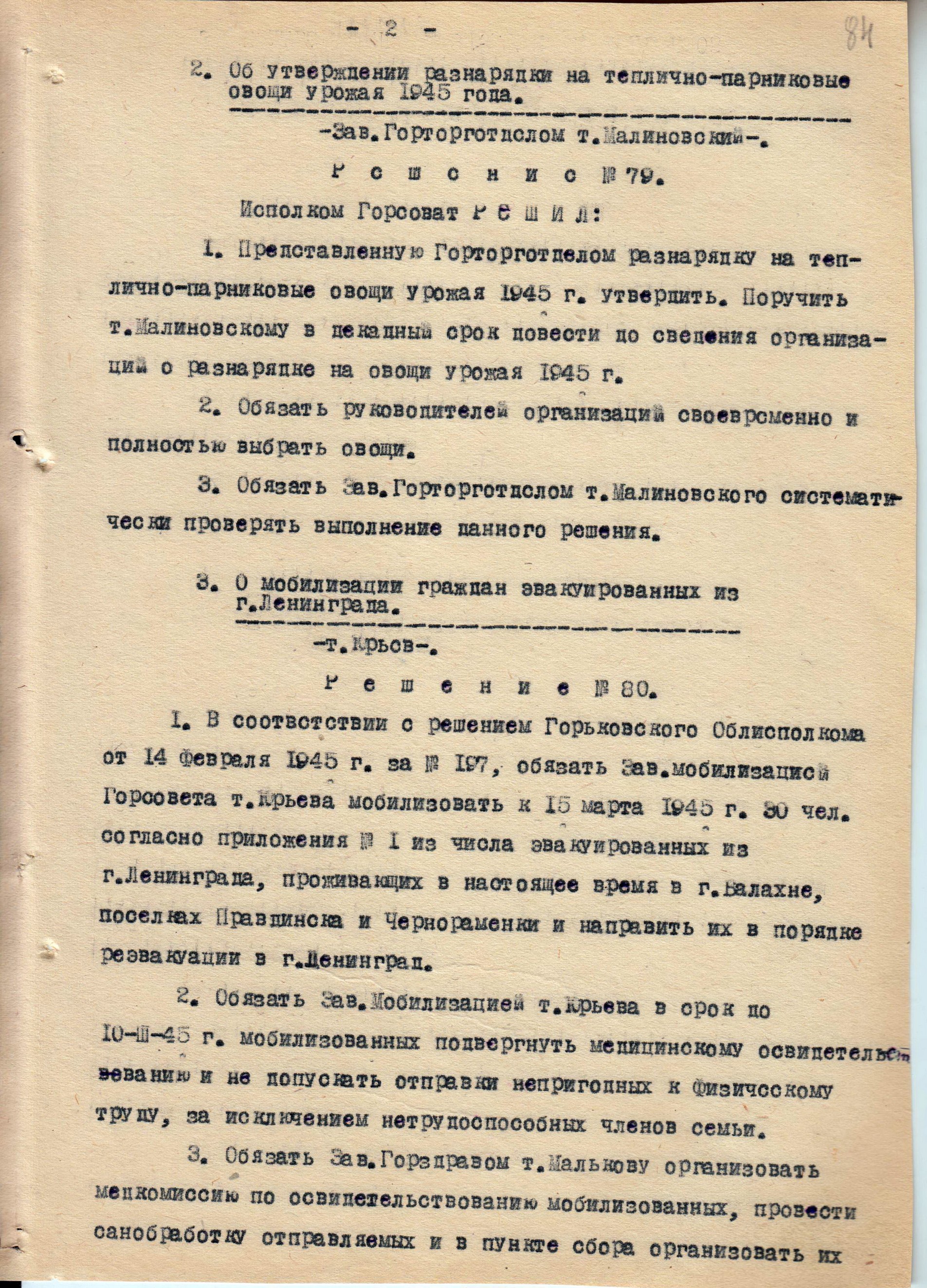 Из протокола заседания исполнительного комитета Балахнинского городского совета депутатов трудящихся №9 о мобилизации граждан, эвакуированных из Ленинграда. 2 марта 1945 г.