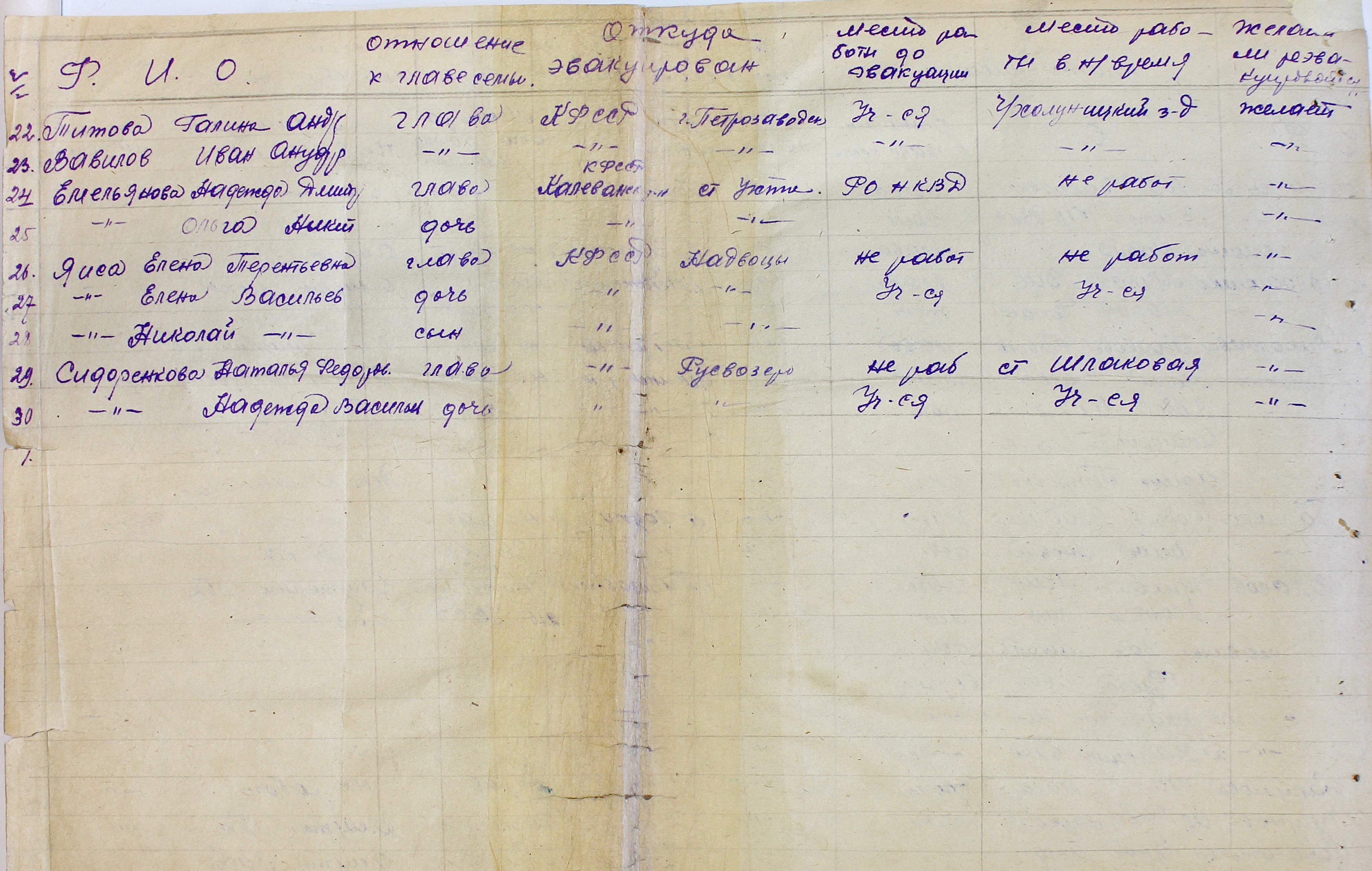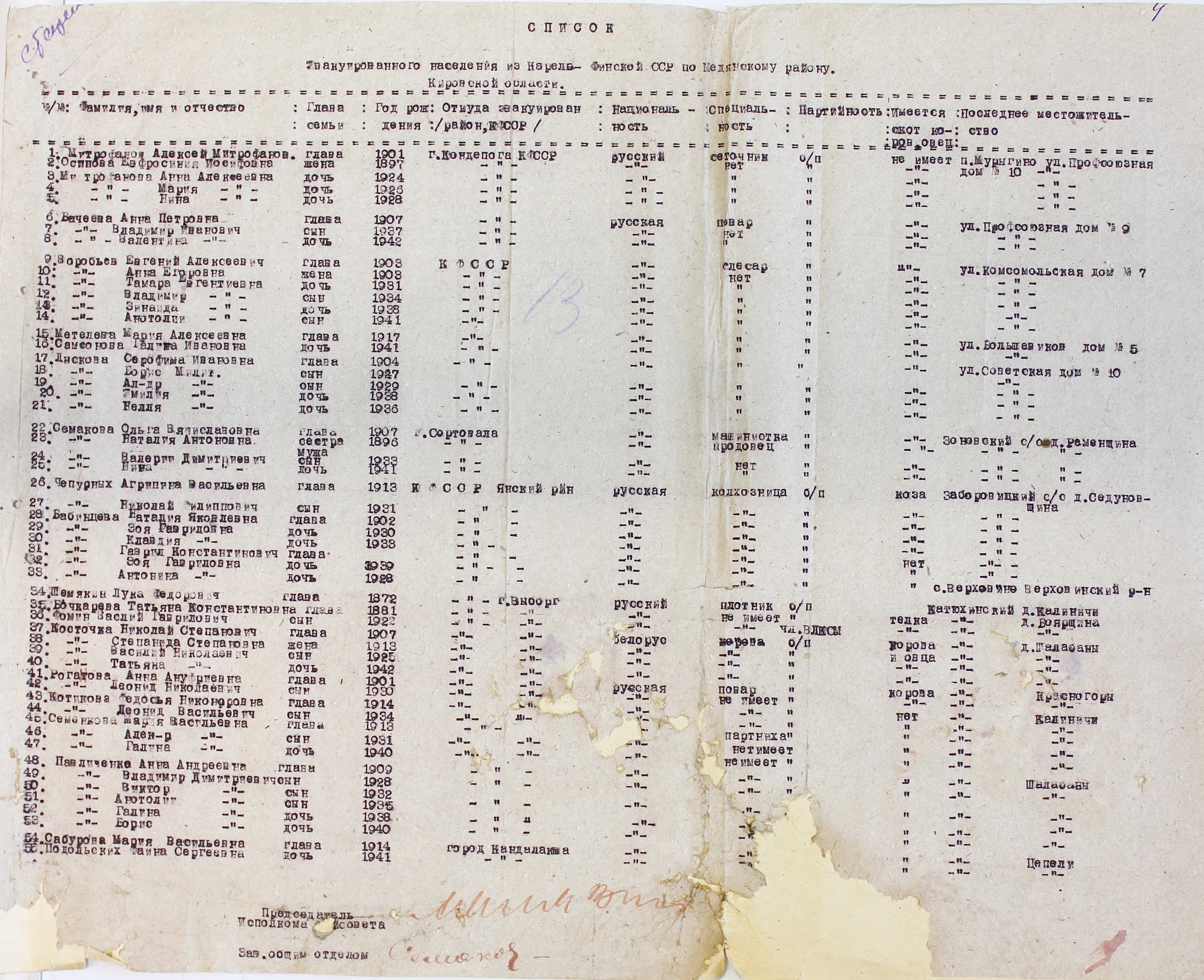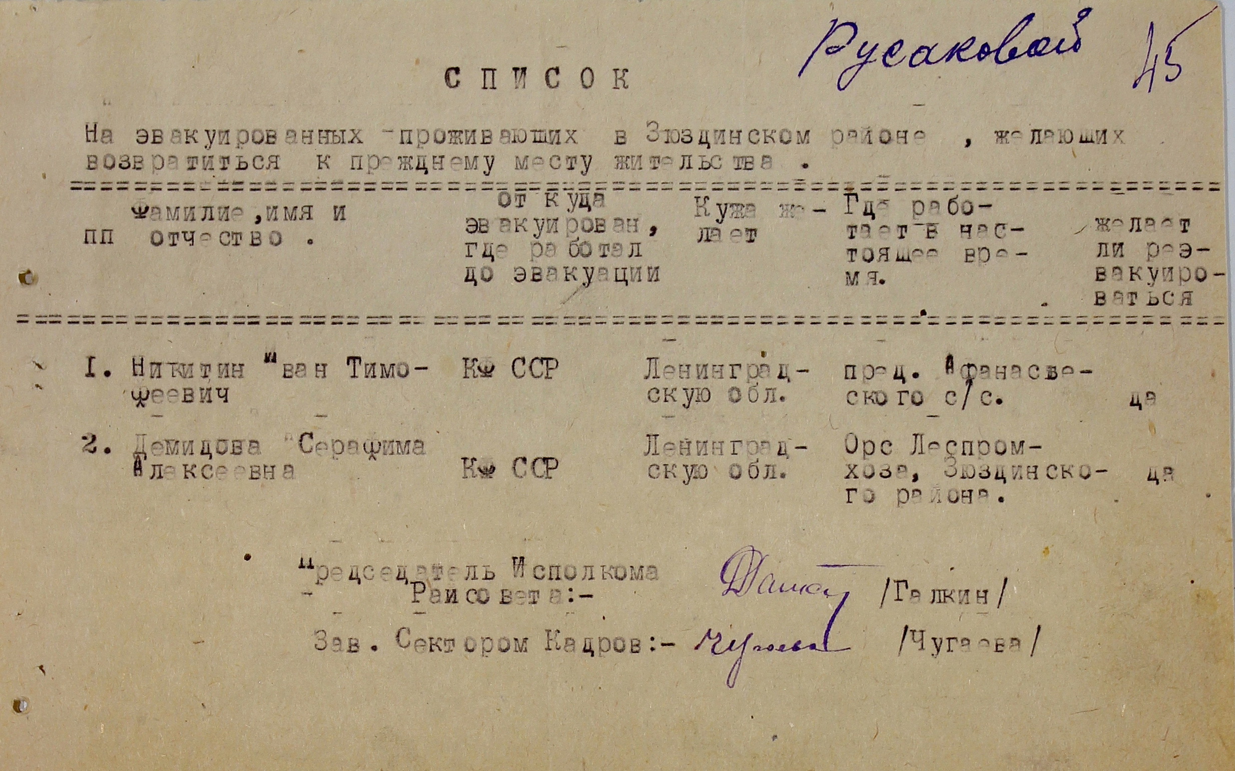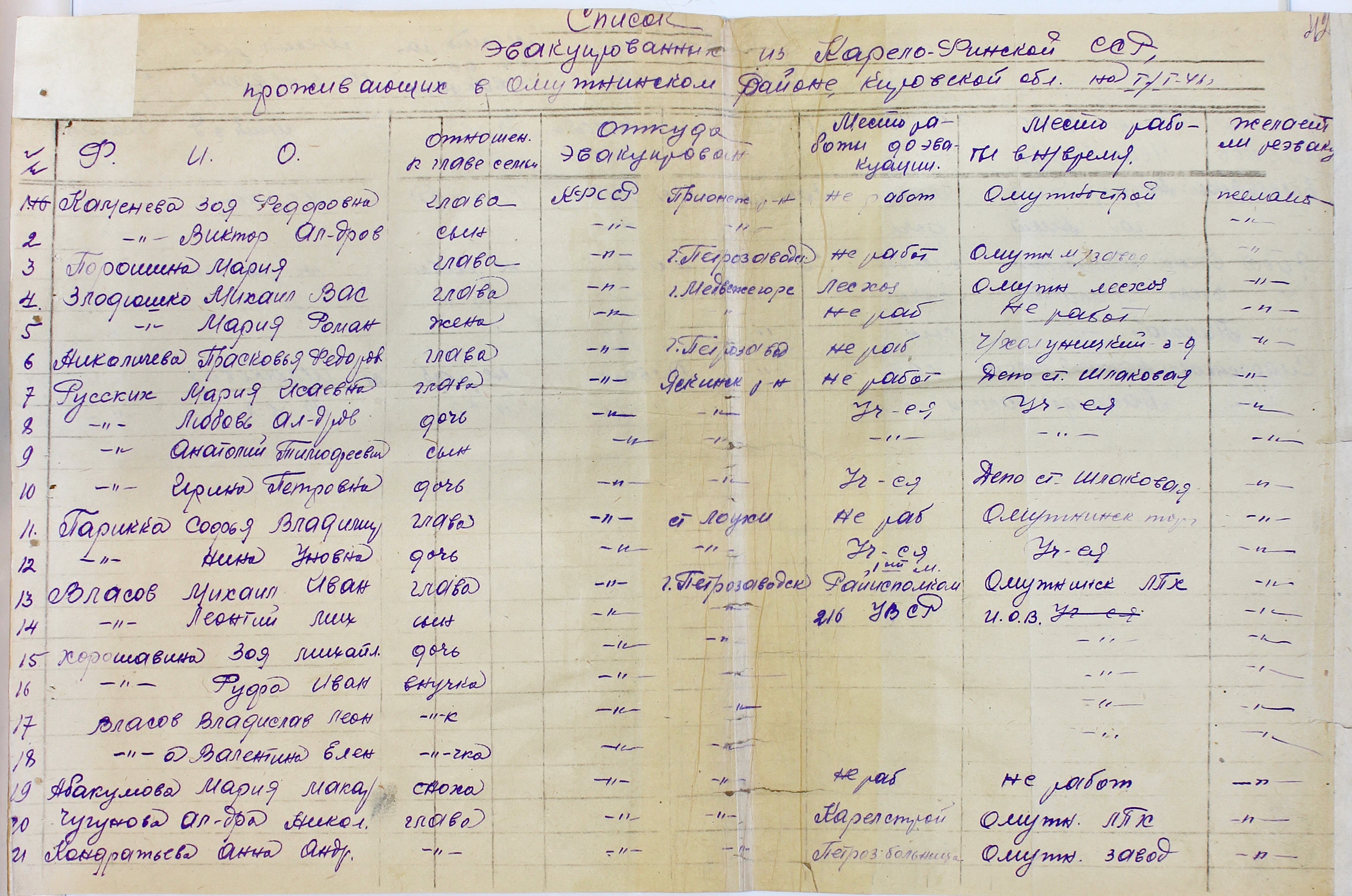 Список граждан, эвакуированных в годы Великой Отечественной войны из Карело-Финской ССР в Зюздинский район Кировской области и подлежащих реэвакуации. 1945 г.