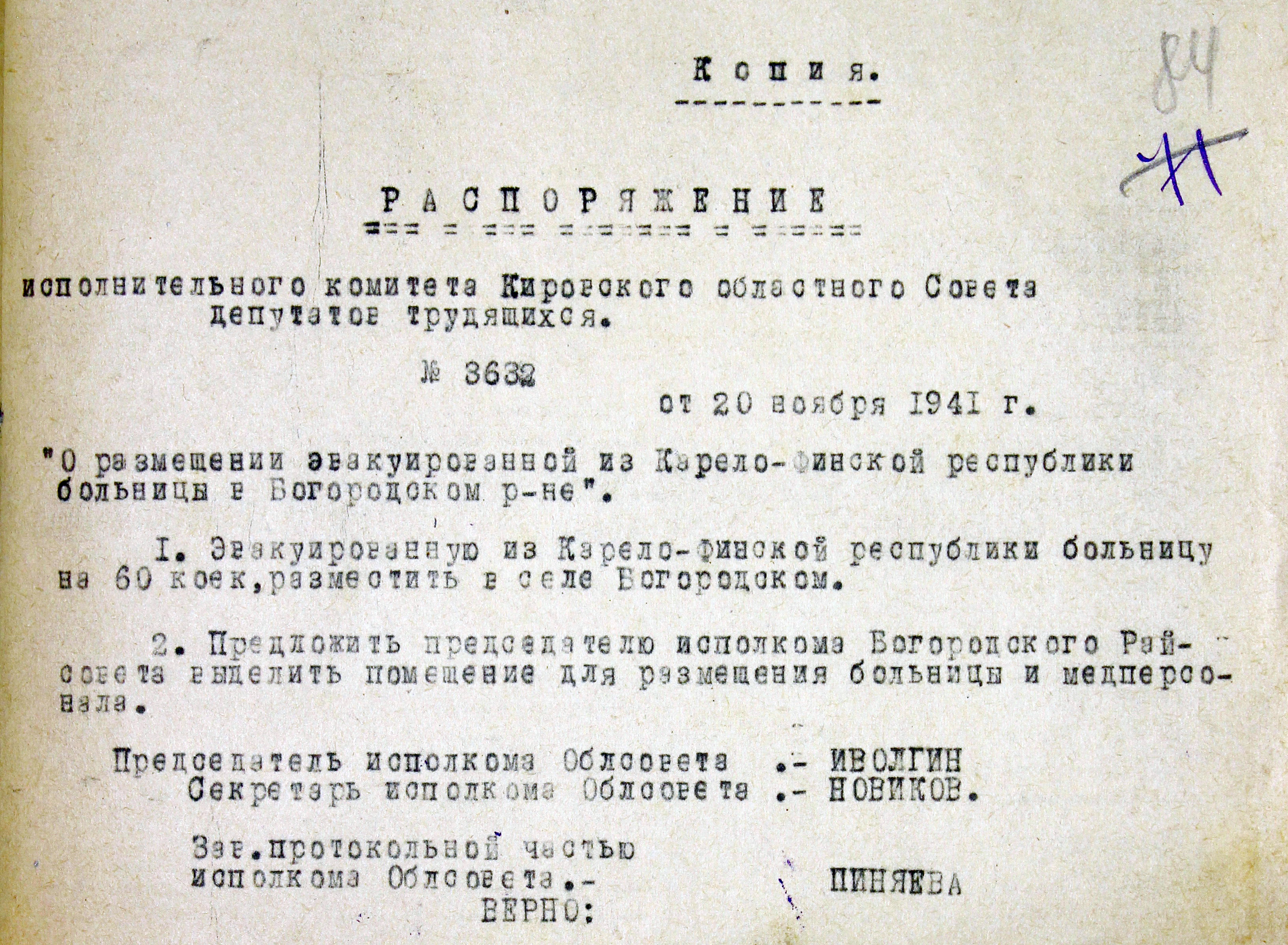 Распоряжение Кировского облисполкома №3632 «О размещении эвакуированной из Карело-Финской республики больницы в Богородском районе». 20 ноября 1941 г. Копия.
