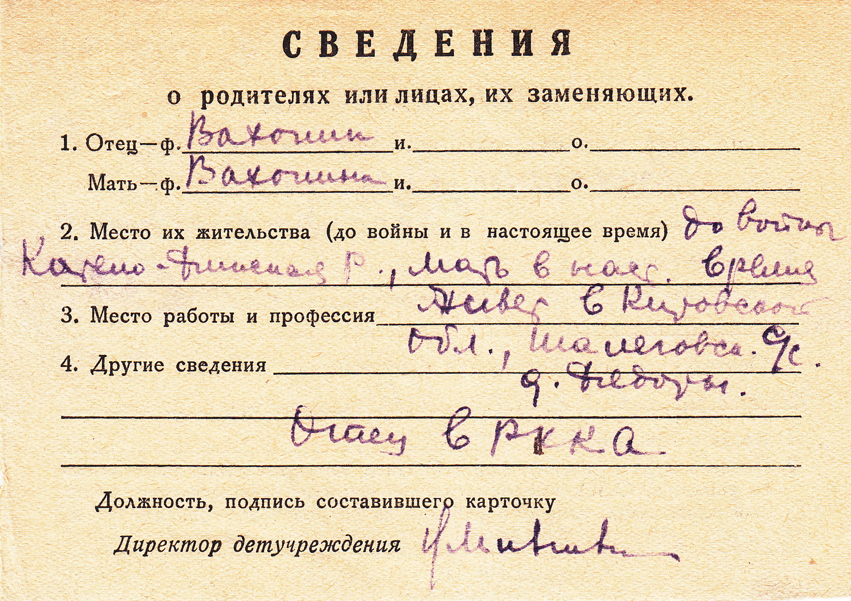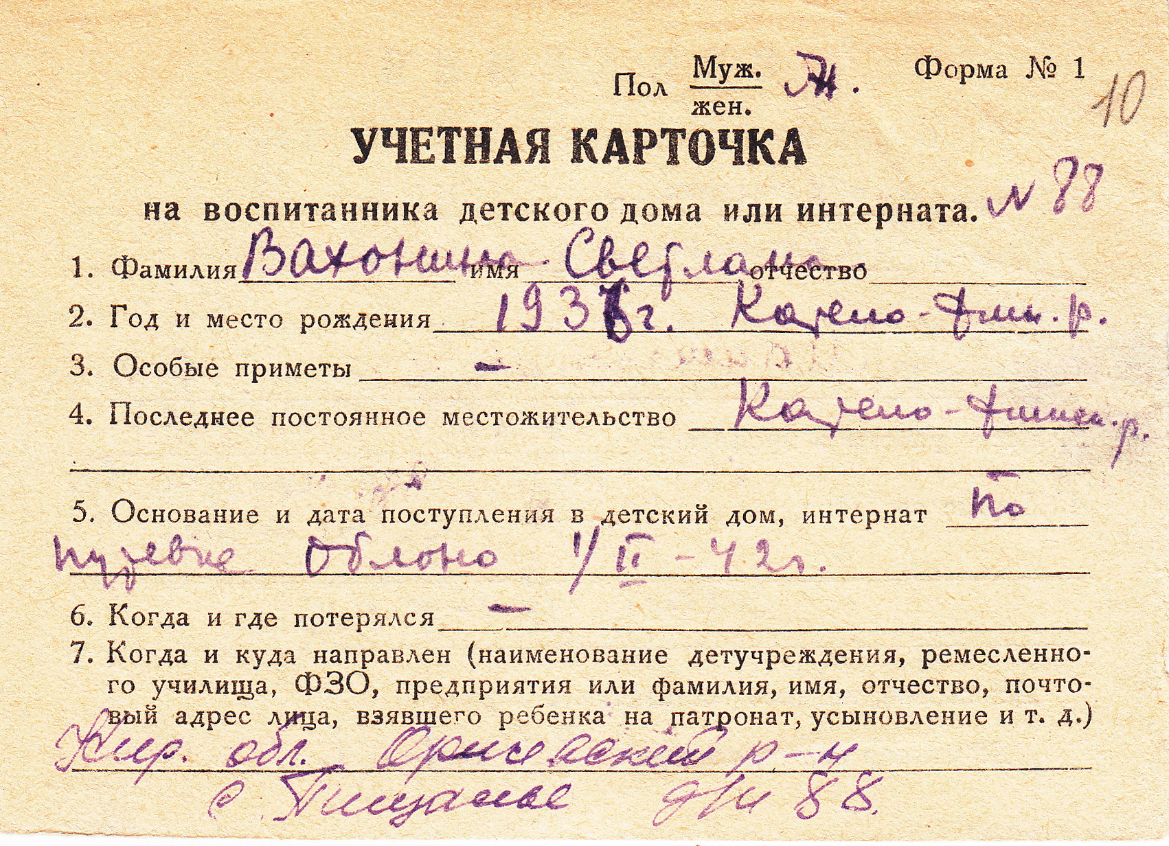 Учетная карточка, составленная на воспитанницу детского интерната № 88 с. Пищалье Оричевского района Кировской области Вахонину Светлану, эвакуированную из Карело-Финской ССР. Не ранее 1942 г.