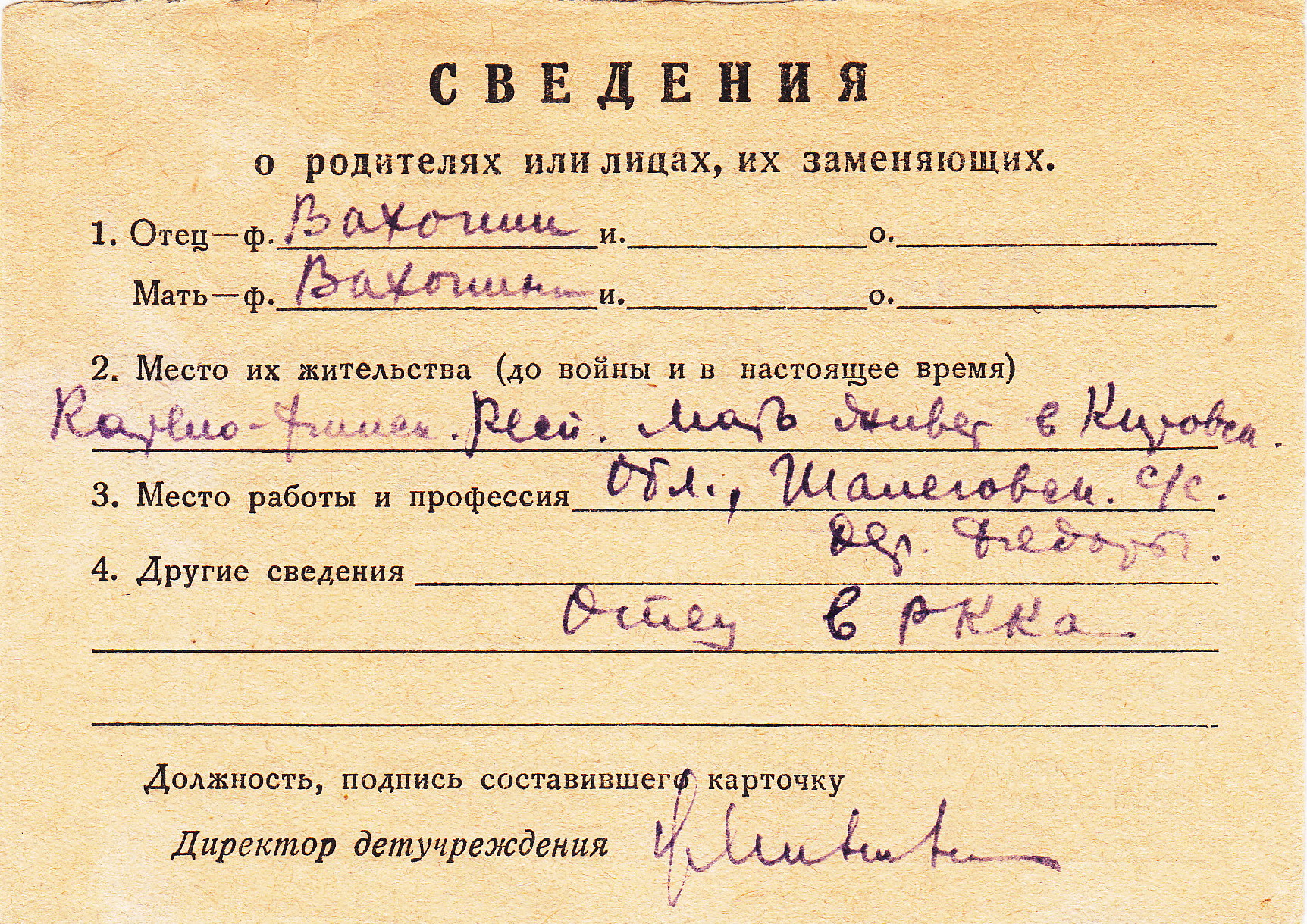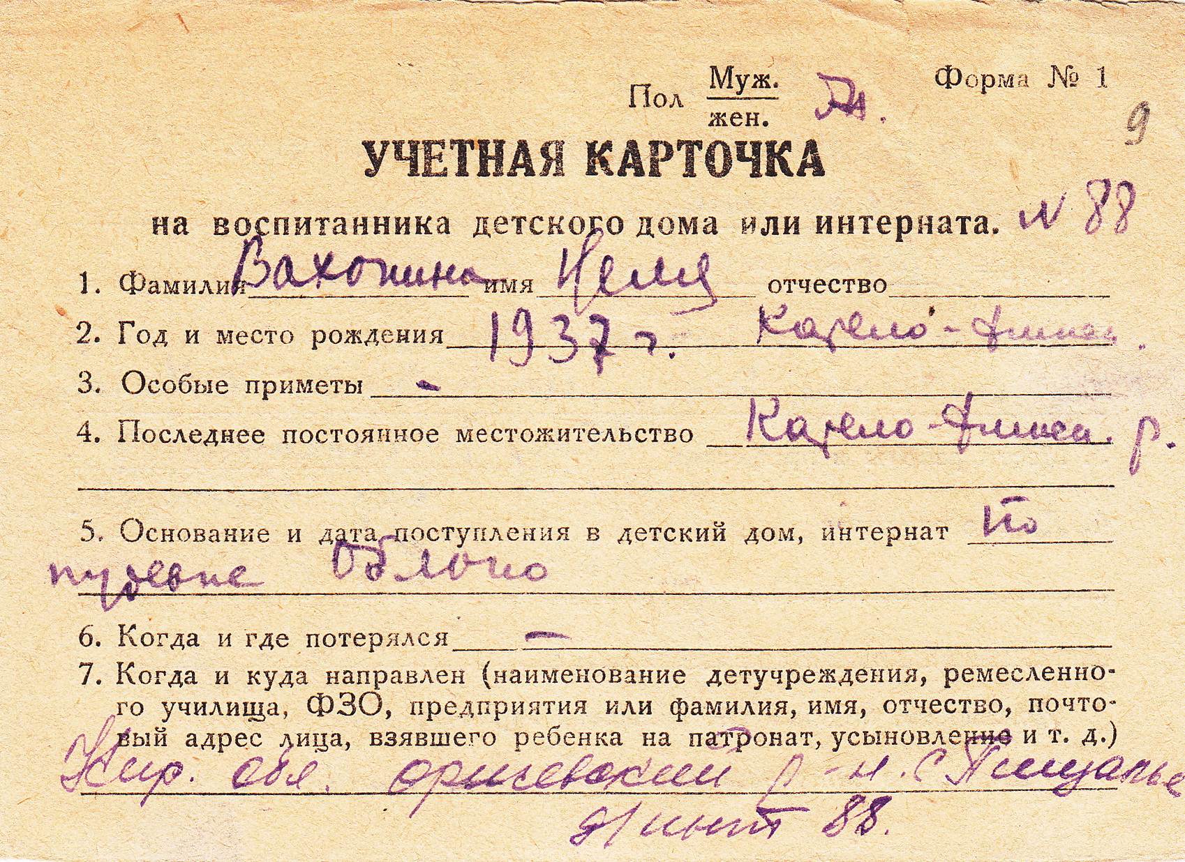 Учетная карточка, составленная на воспитанницу детского интерната № 88 с. Пищалье Оричевского района Кировской области Вахонину Нелю, эвакуированную из Карело-Финской ССР. Не ранее 1942 г.