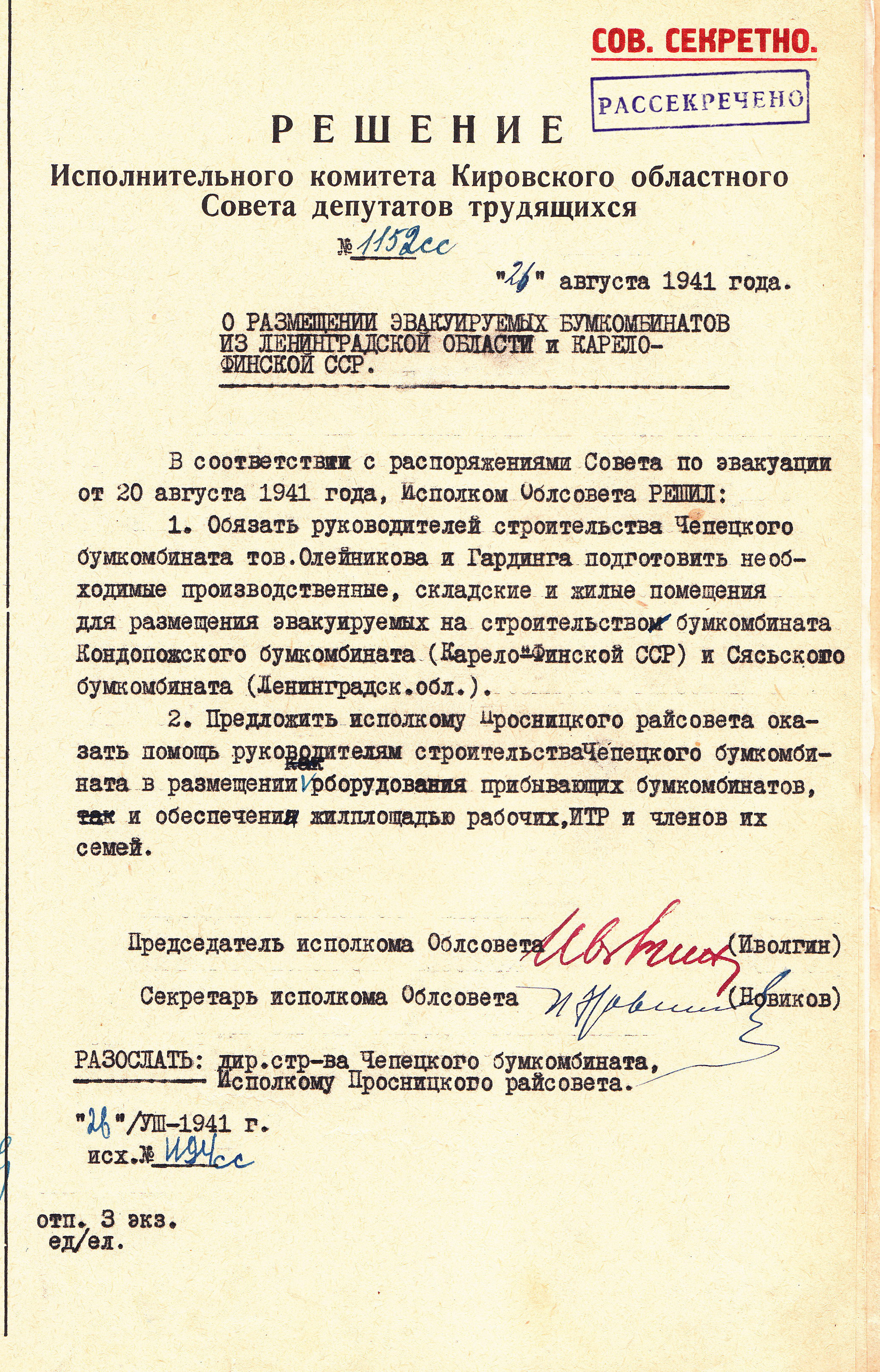Решение Кировского облисполкома №1152сс о размещении эвакуируемых бумкомбинатов из Ленинградской области и Карело-Финской ССР. 26 августа 1941 г.
