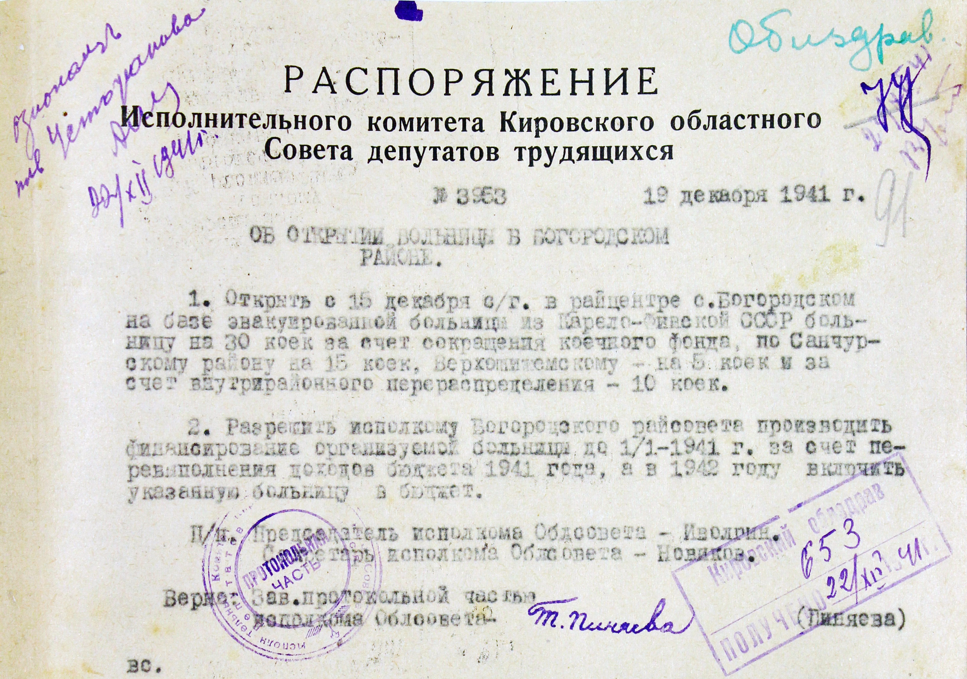 Распоряжение Кировского облисполкома №3953 об открытии больницы в Богородском районе. 19 декабря 1941 г.