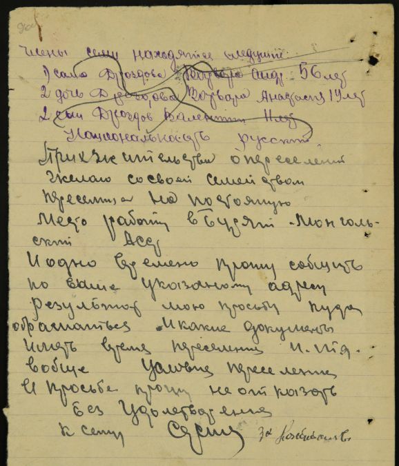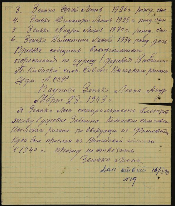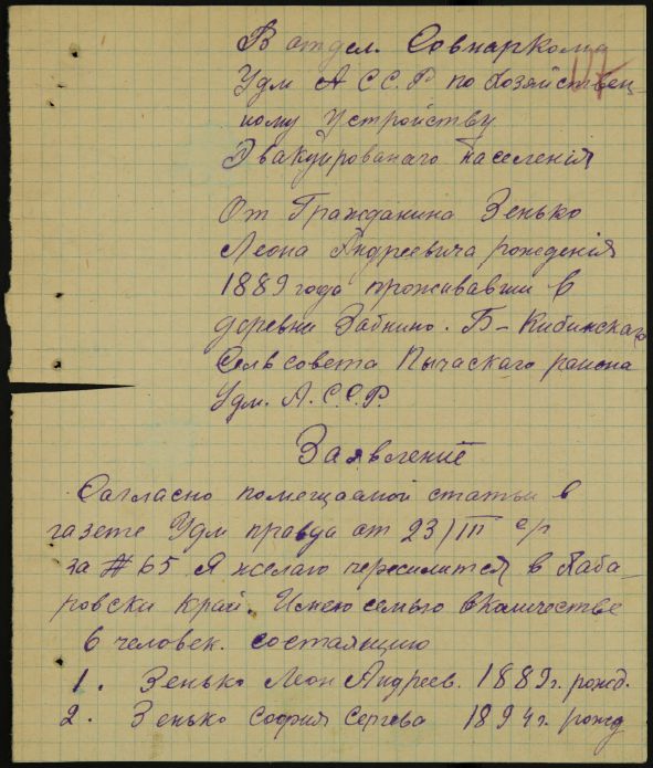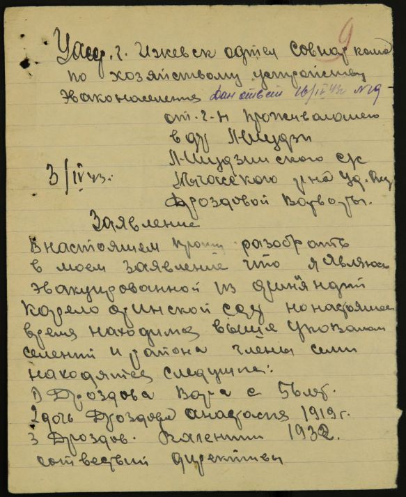 Заявление Дроздовой Варвары, эвакуированной из Карело-Финской ССР в д. Лудзи-Шудзи Пычасского района УАССР, в отдел по хозяйственному устройству СНК УАССР, о предоставлении ей разрешения переселиться в Бурято-Монгольскую АССР.