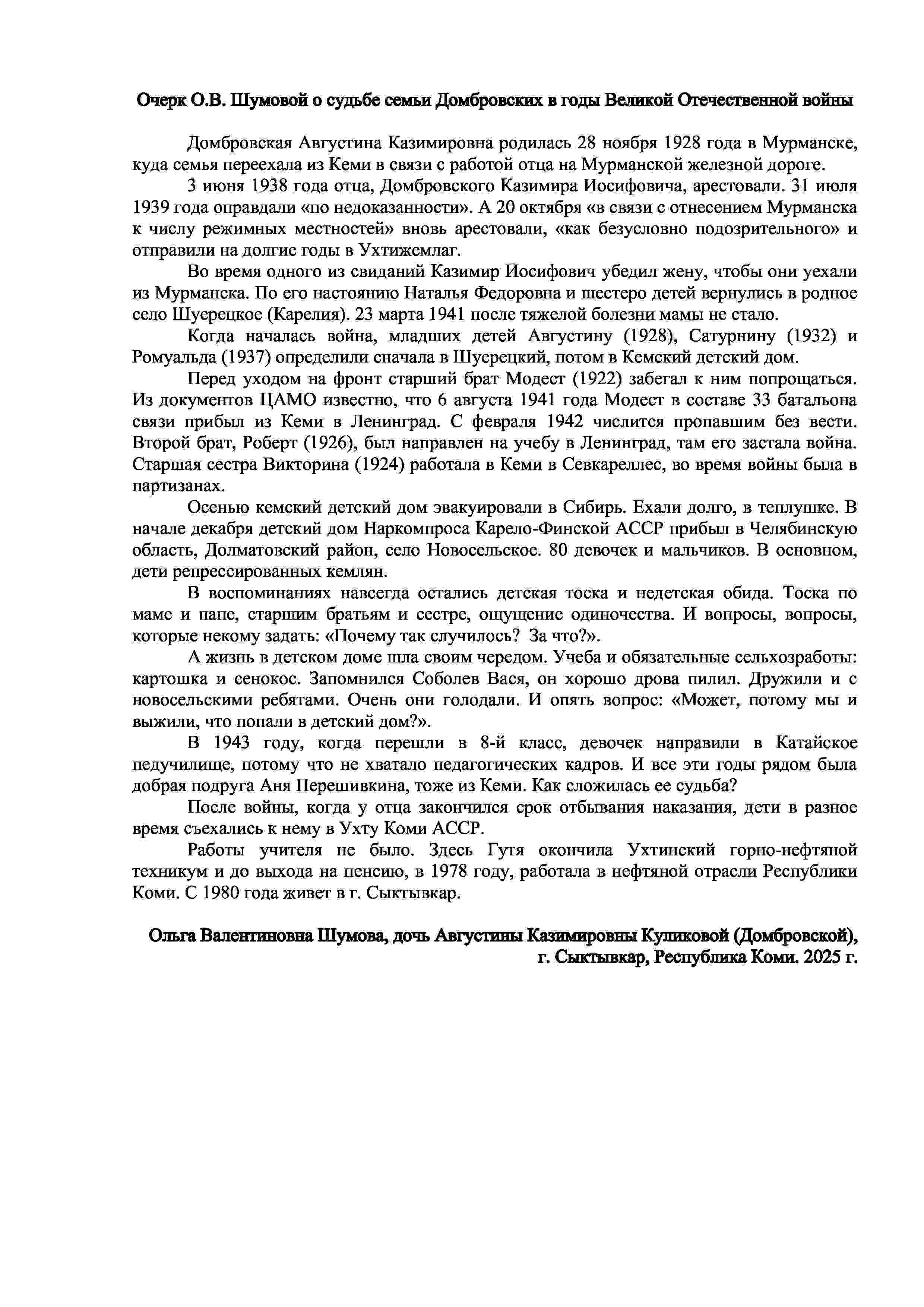 Материалы переданы Ольгой Валентиновной Шумовой (г. Сыктывкар, Республика Коми), дочерью Августины Казимировны Куликовой (Домбровской).