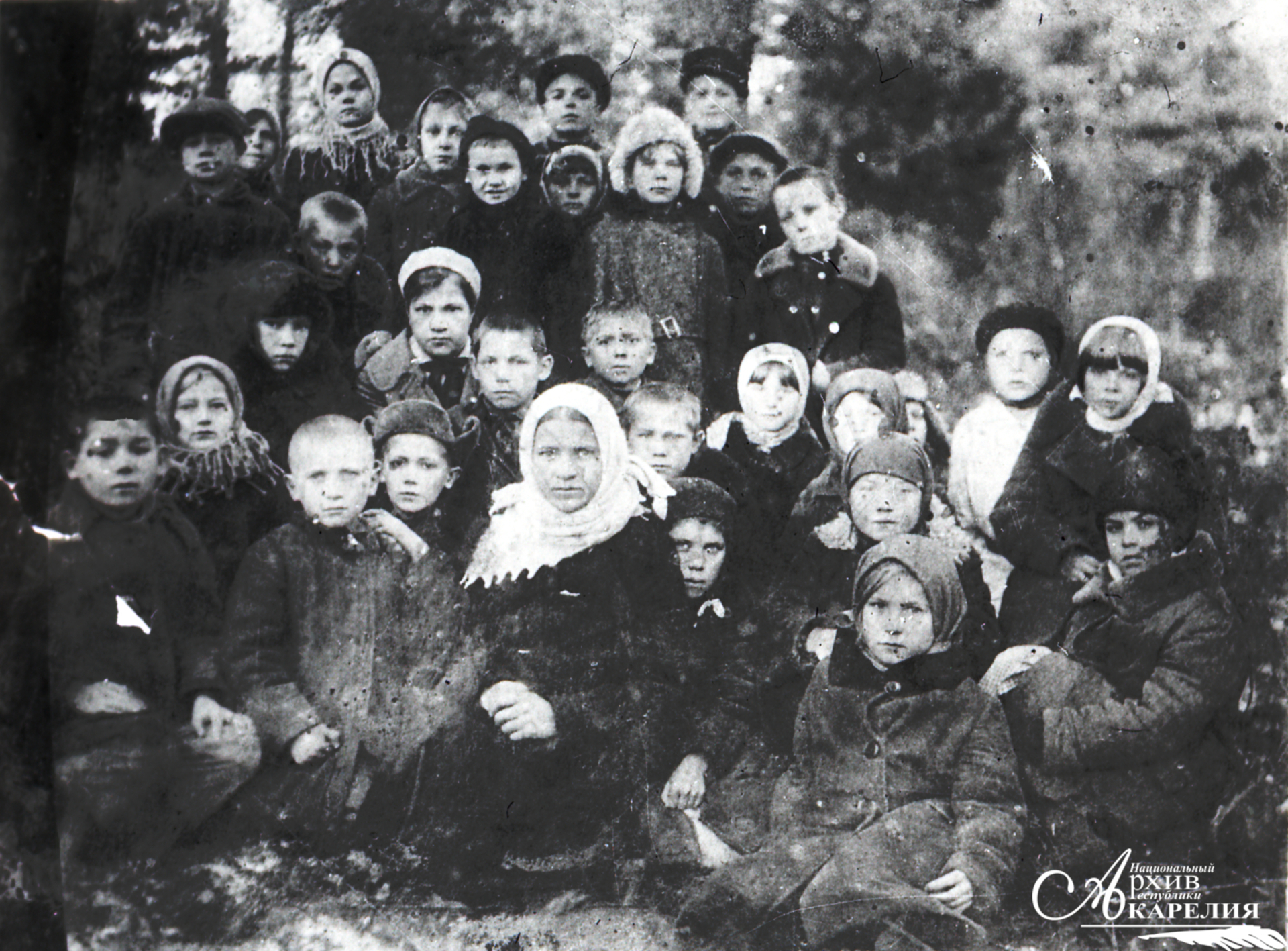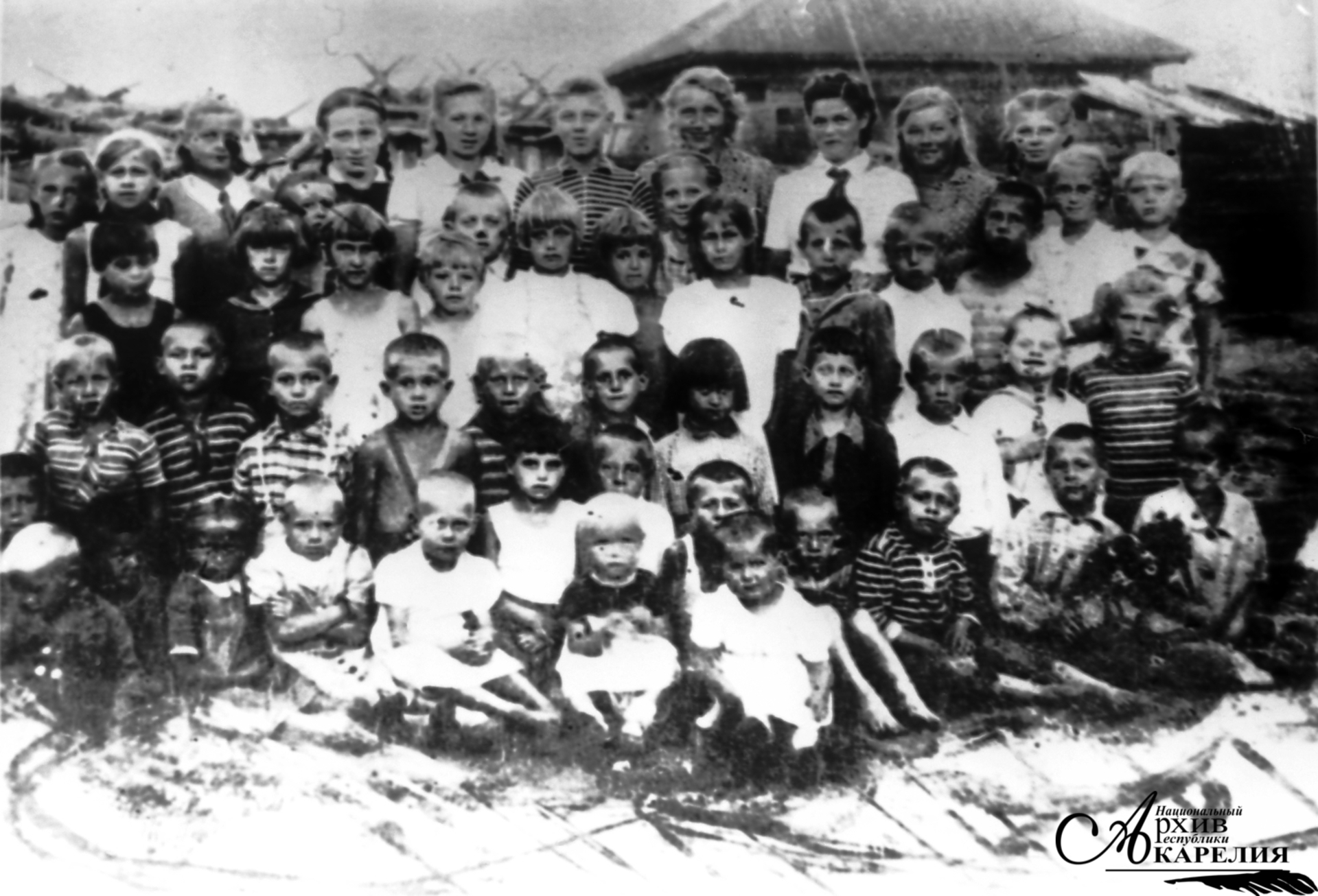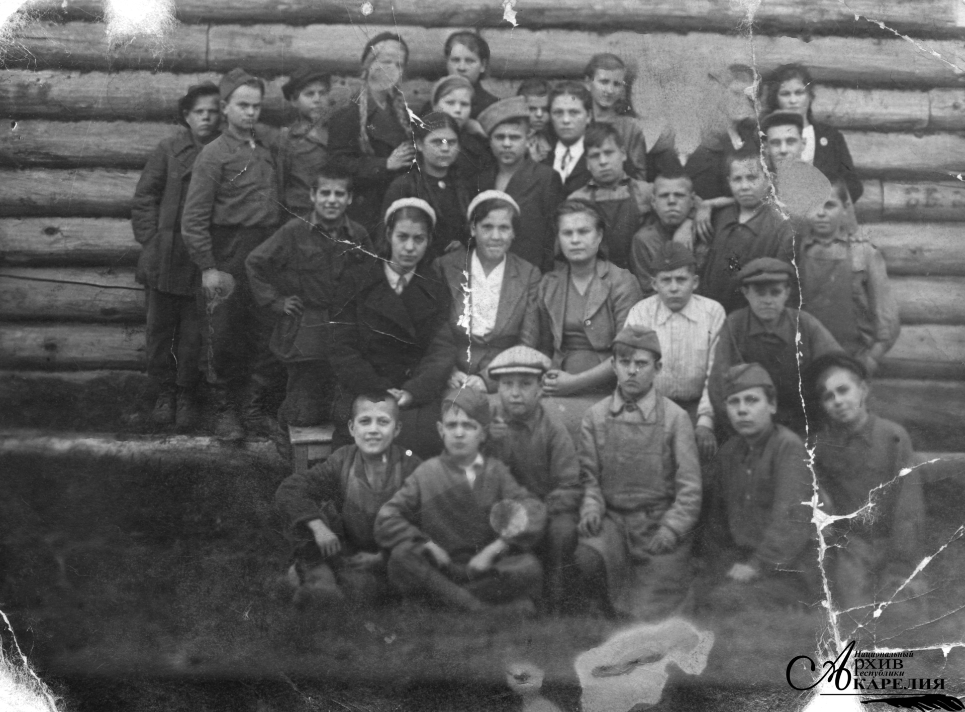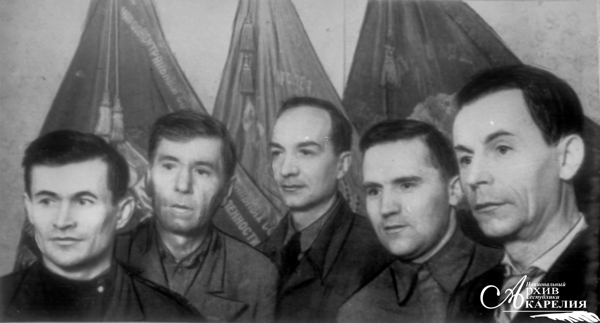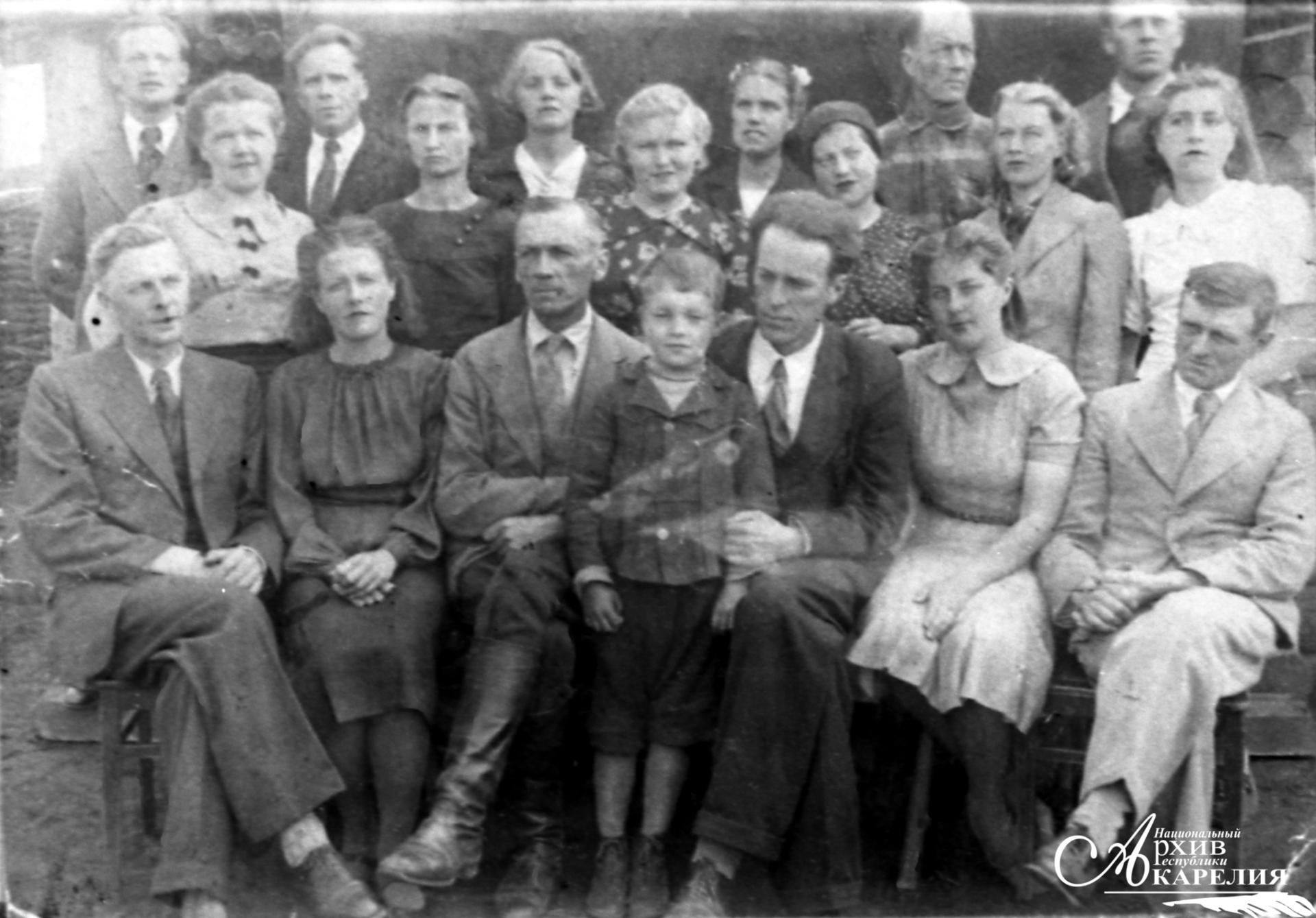 Группа артистов Республиканского финского драматического театра КФССР во время эвакуации в Омскую область (в составе: К. Э. Раутио, Л. И. Теппонен, К. И. Севандер, Е. Я. Севандер, И. Виитанен, И. А. Такала, М. Е. Любовин, Г. Роутту, Л. Салми, С. Ф. Бочарникова и др.). с. Большеречье Омской области.