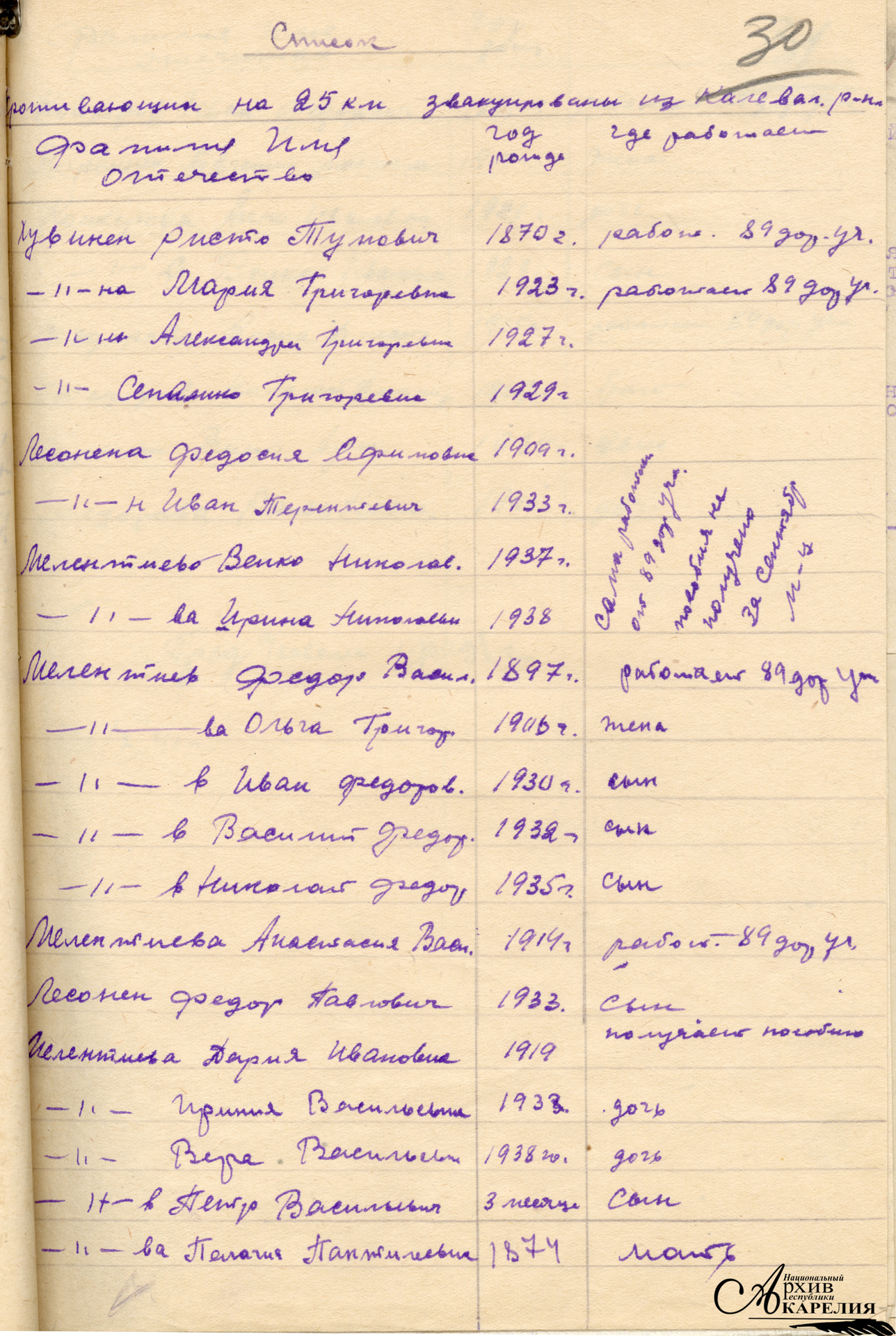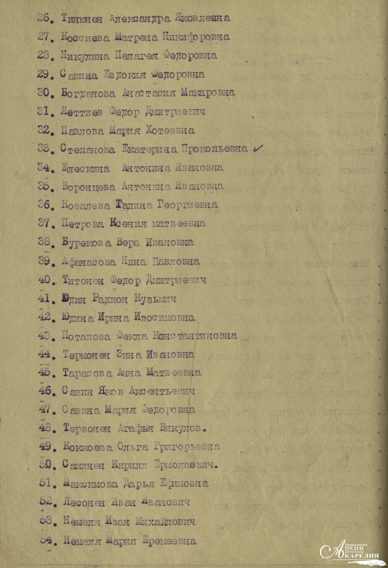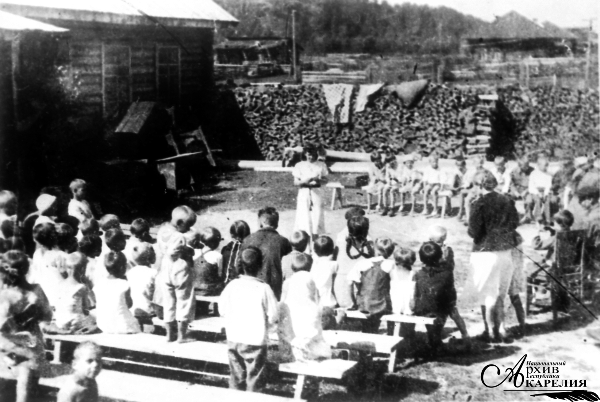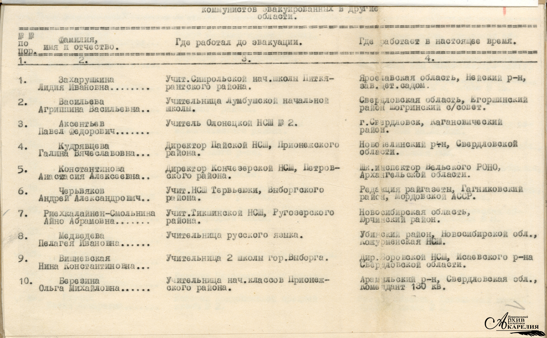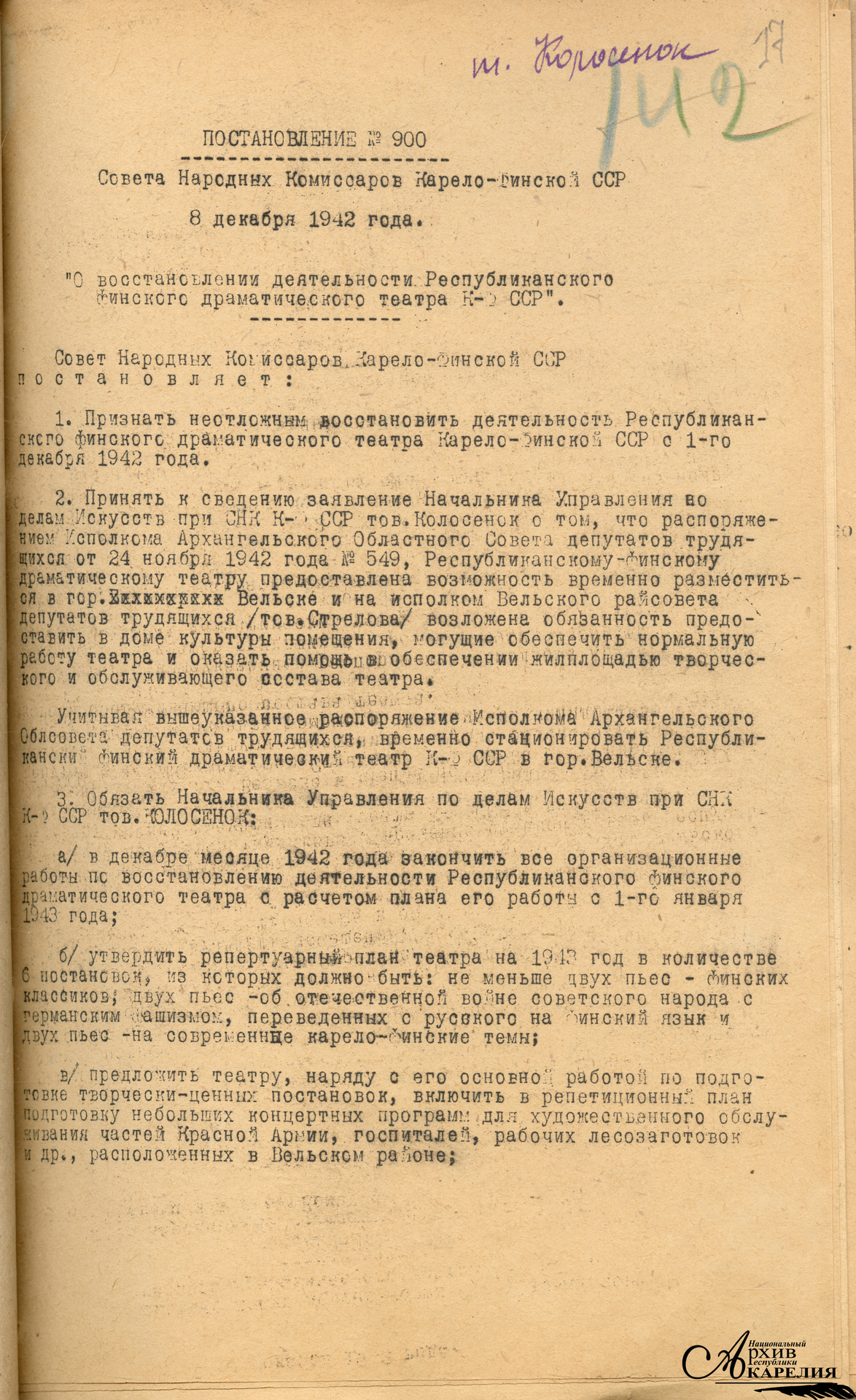 Группа артистов Республиканского финского драматического театра КФССР во время эвакуации в Омскую область (в составе: К. Э. Раутио, Л. И. Теппонен, К. И. Севандер, Е. Я. Севандер, И. Виитанен, И. А. Такала, М. Е. Любовин, Г. Роутту, Л. Салми, С. Ф. Бочарникова и др.). с. Большеречье Омской области.