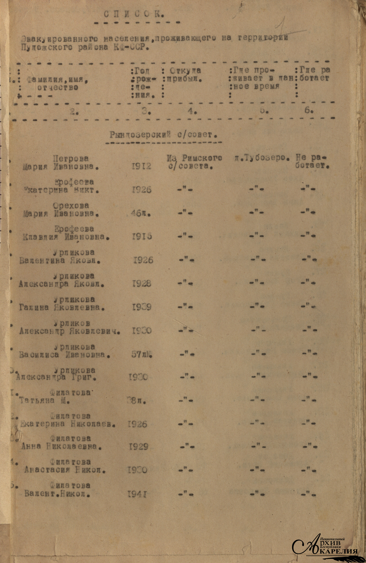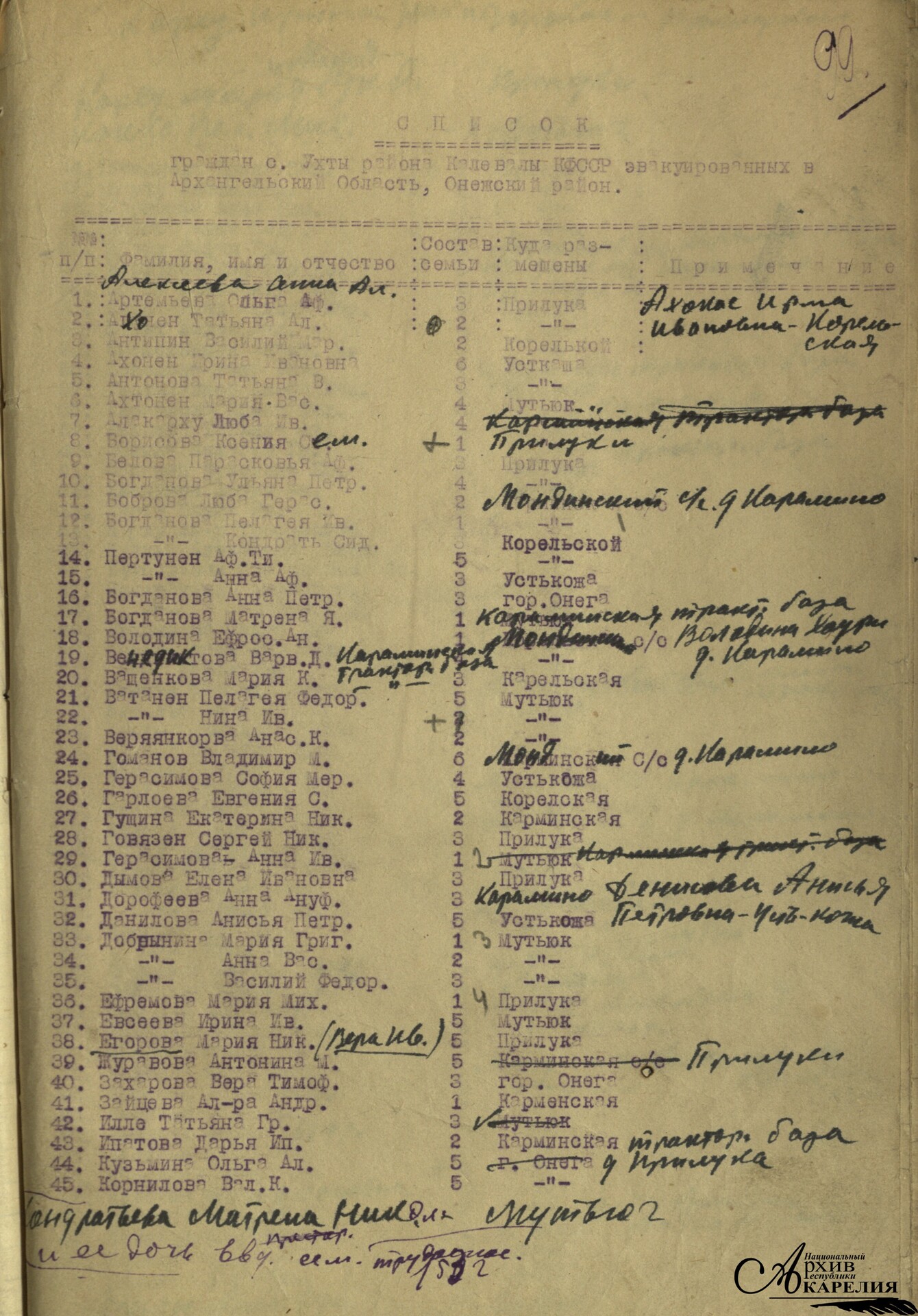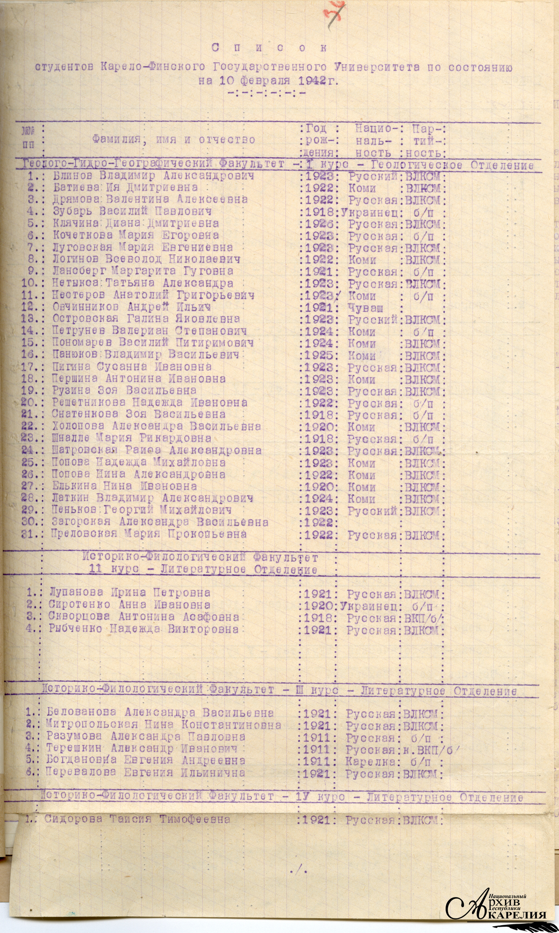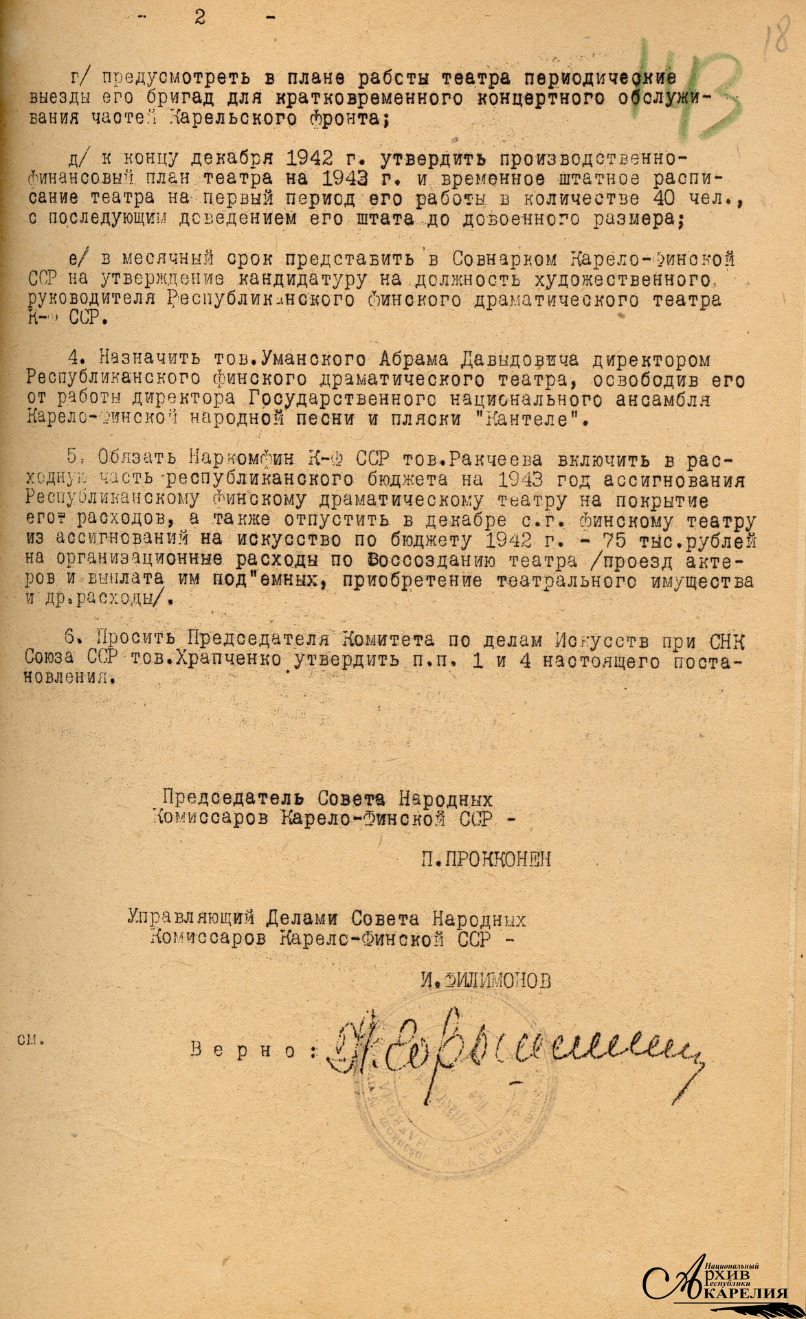 Группа артистов Республиканского финского драматического театра КФССР во время эвакуации в Омскую область (в составе: К. Э. Раутио, Л. И. Теппонен, К. И. Севандер, Е. Я. Севандер, И. Виитанен, И. А. Такала, М. Е. Любовин, Г. Роутту, Л. Салми, С. Ф. Бочарникова и др.). с. Большеречье Омской области.