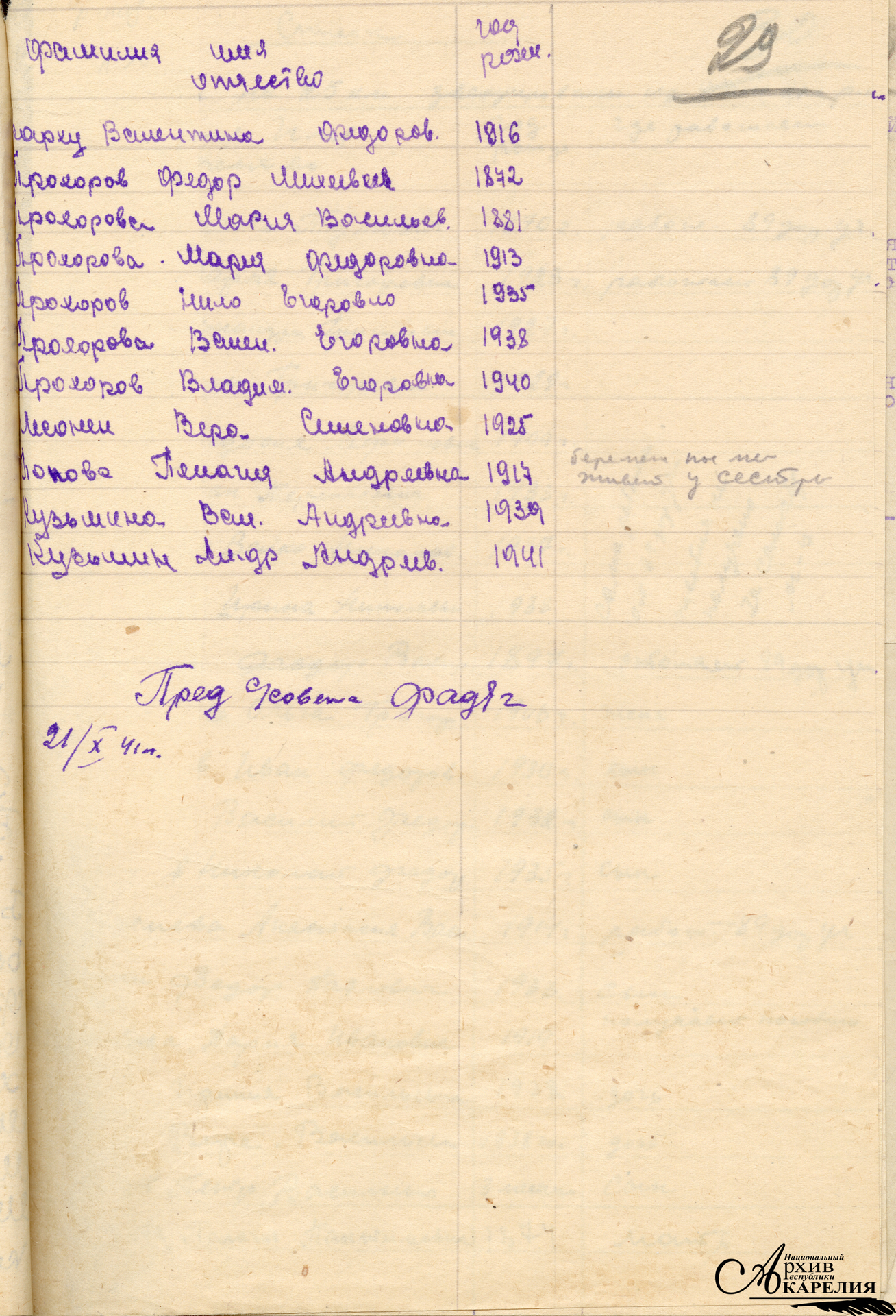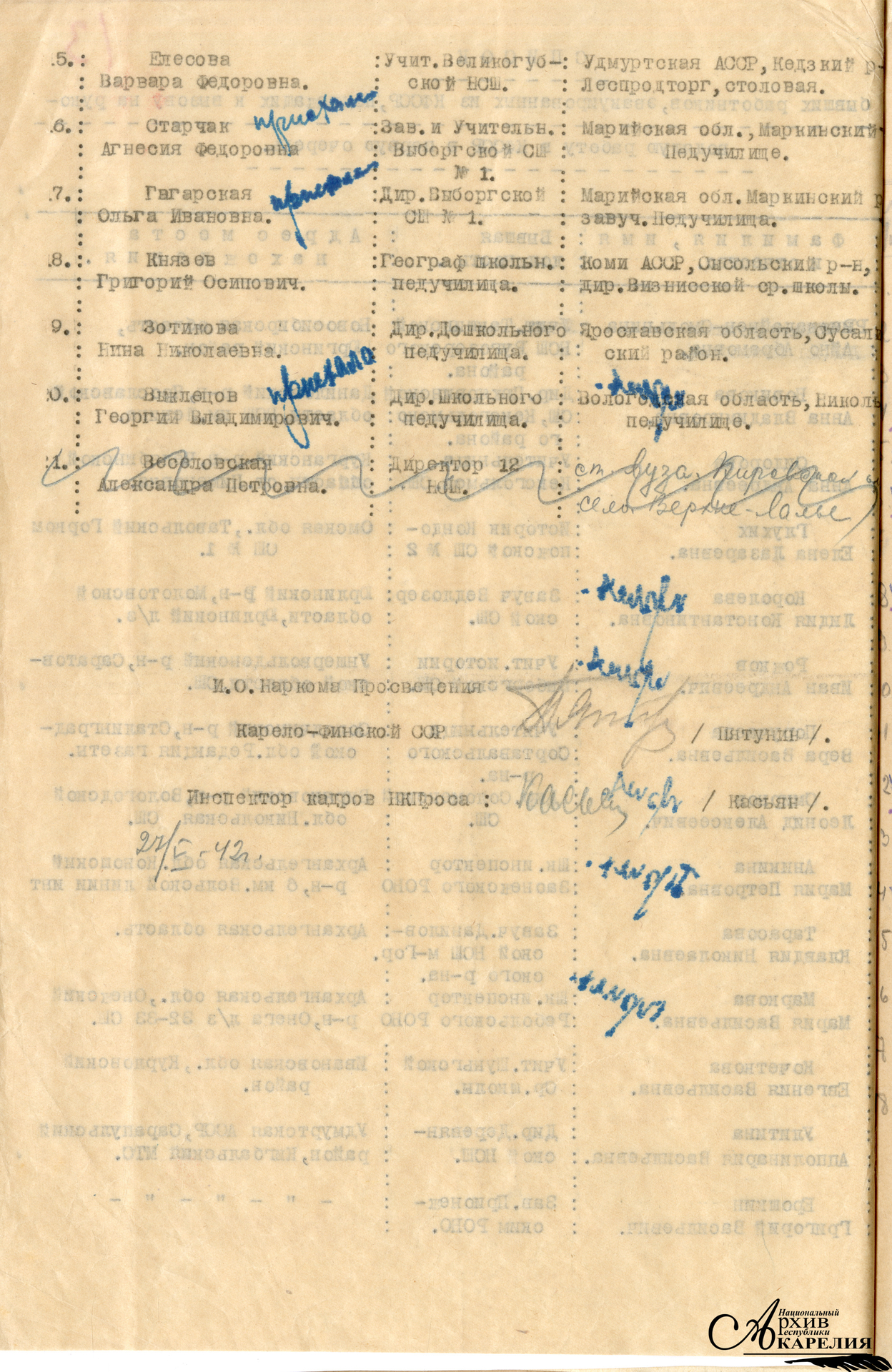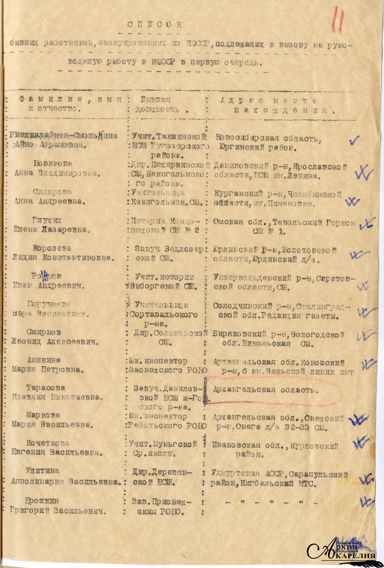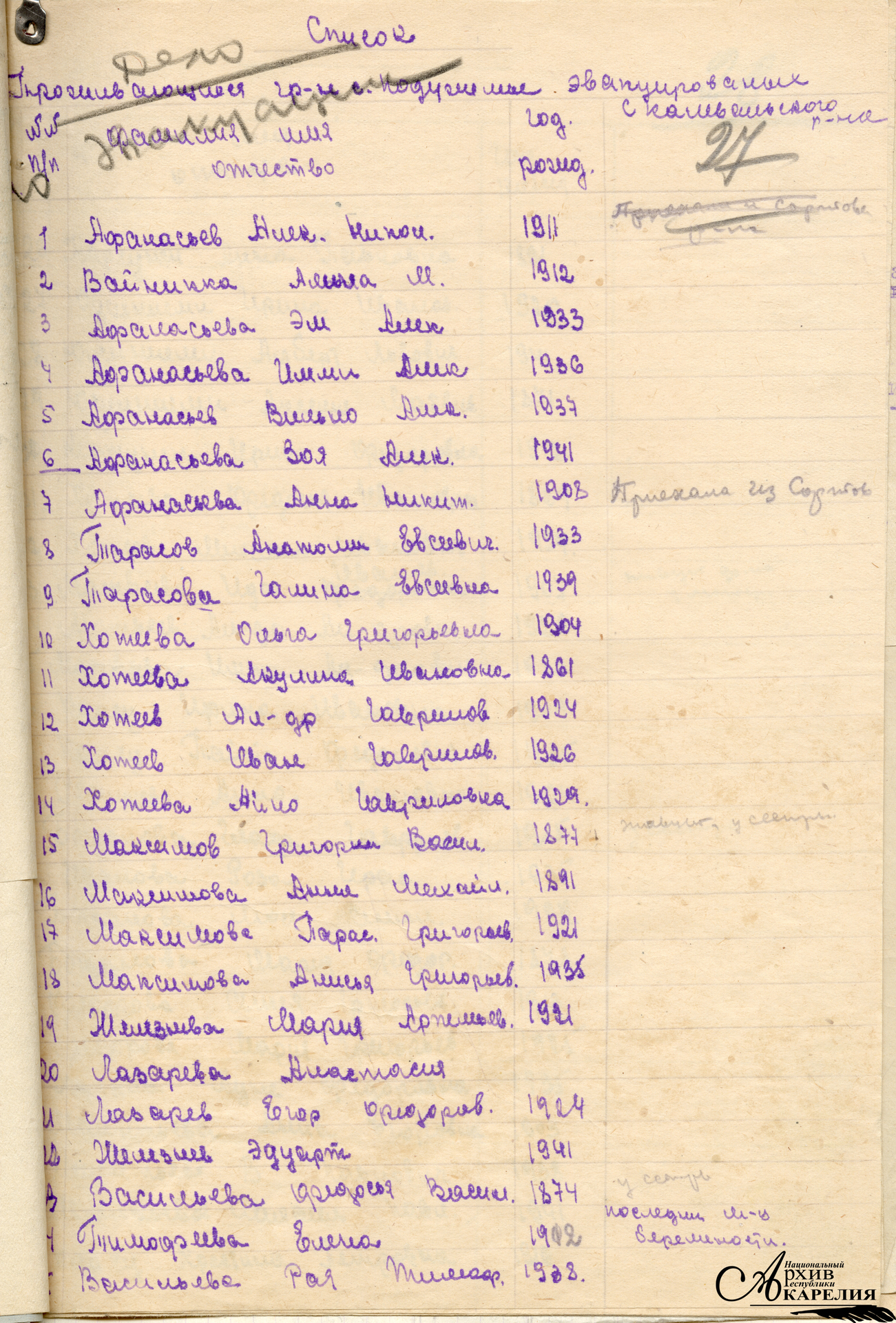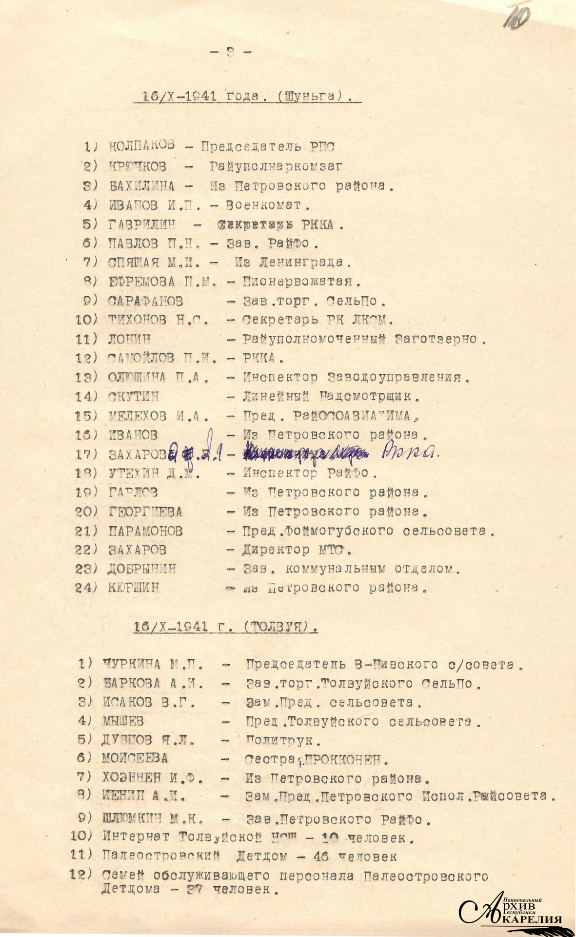 Группа артистов Республиканского финского драматического театра КФССР во время эвакуации в Омскую область (в составе: К. Э. Раутио, Л. И. Теппонен, К. И. Севандер, Е. Я. Севандер, И. Виитанен, И. А. Такала, М. Е. Любовин, Г. Роутту, Л. Салми, С. Ф. Бочарникова и др.). с. Большеречье Омской области.