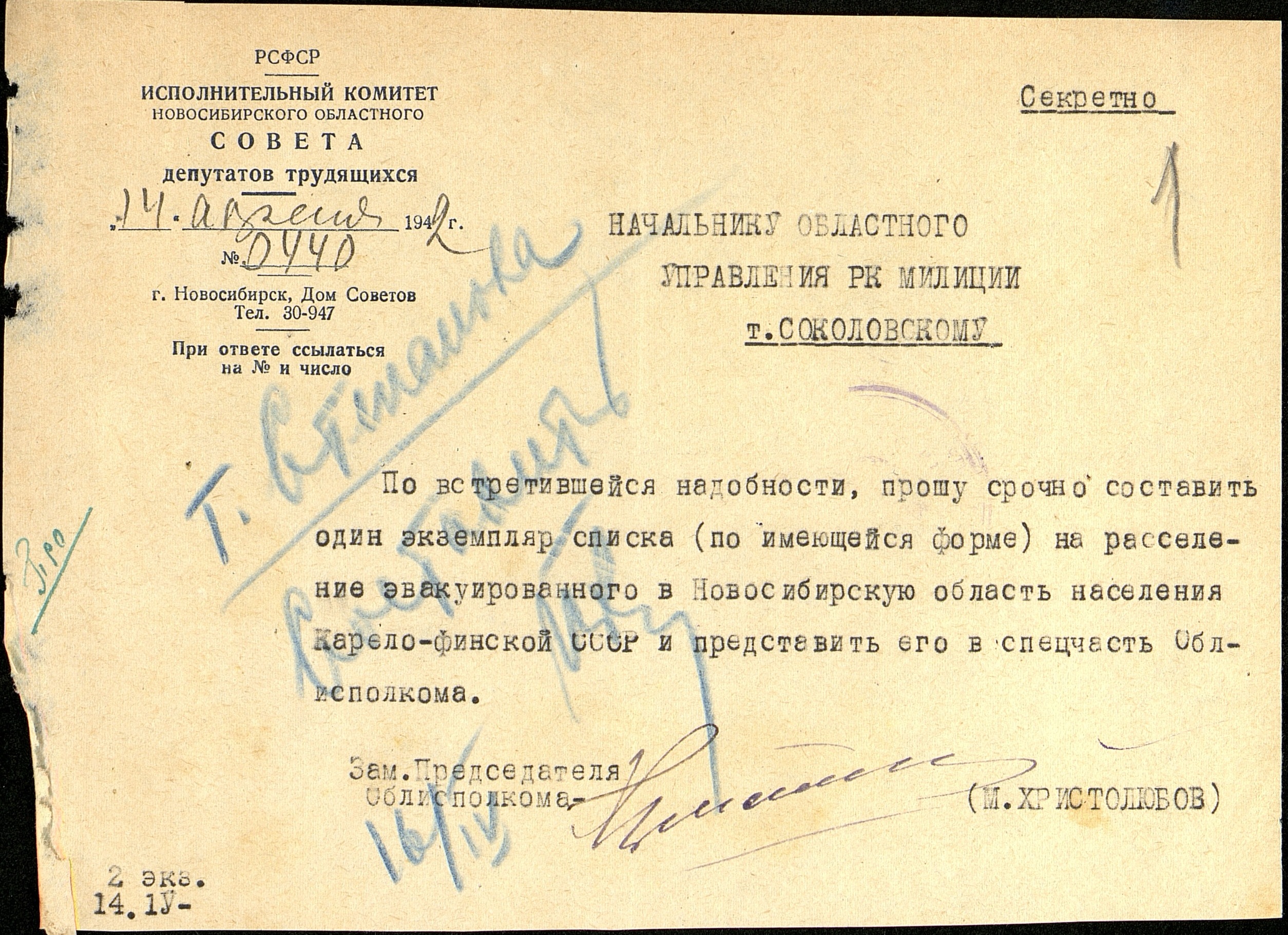 М. Христолюбова начальнику областного управления рабоче-крестьянской милиции Соколовскому о составлении списка на расселение эвакуированного в Новосибирскую область населения Карело-Финской ССР.