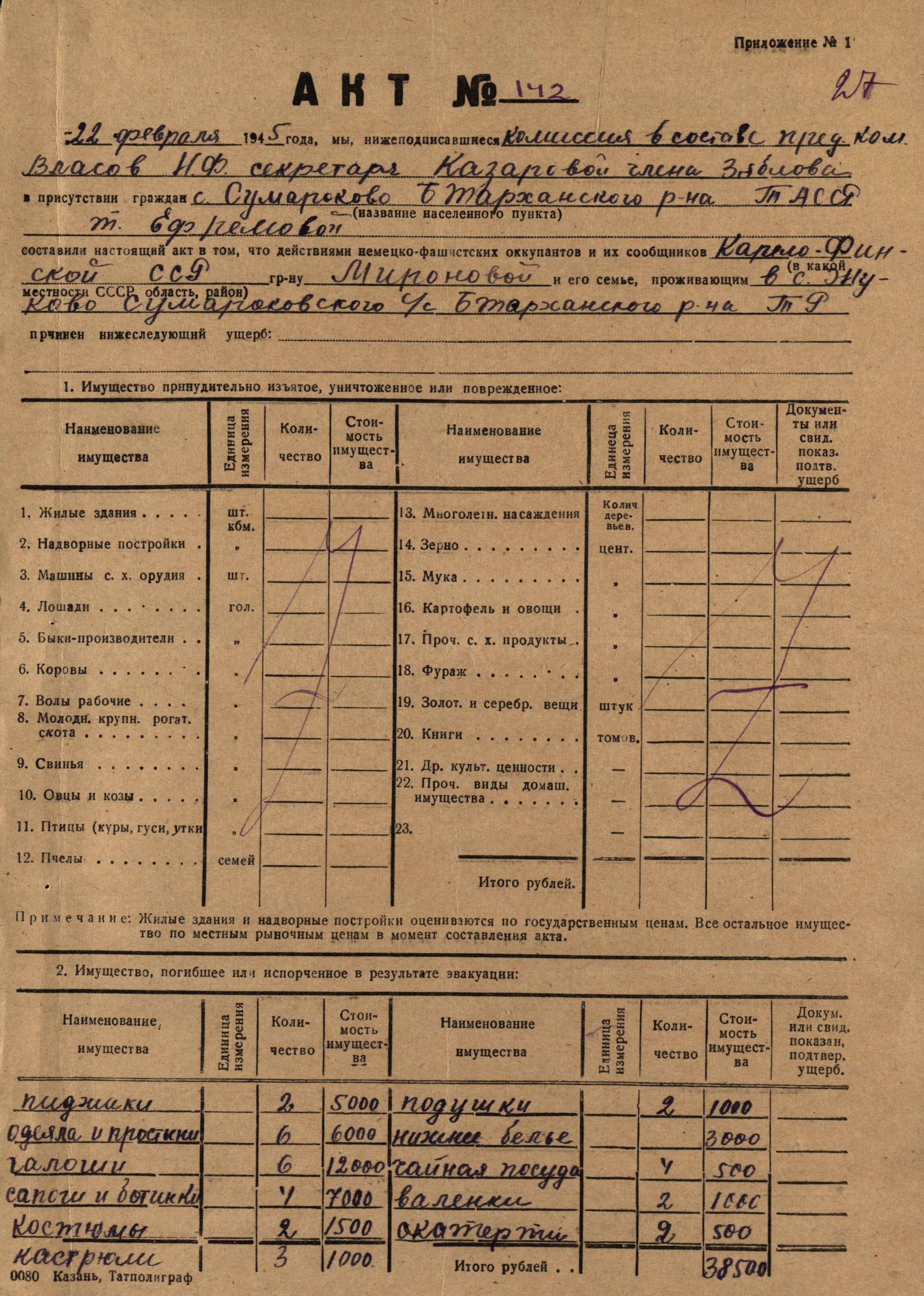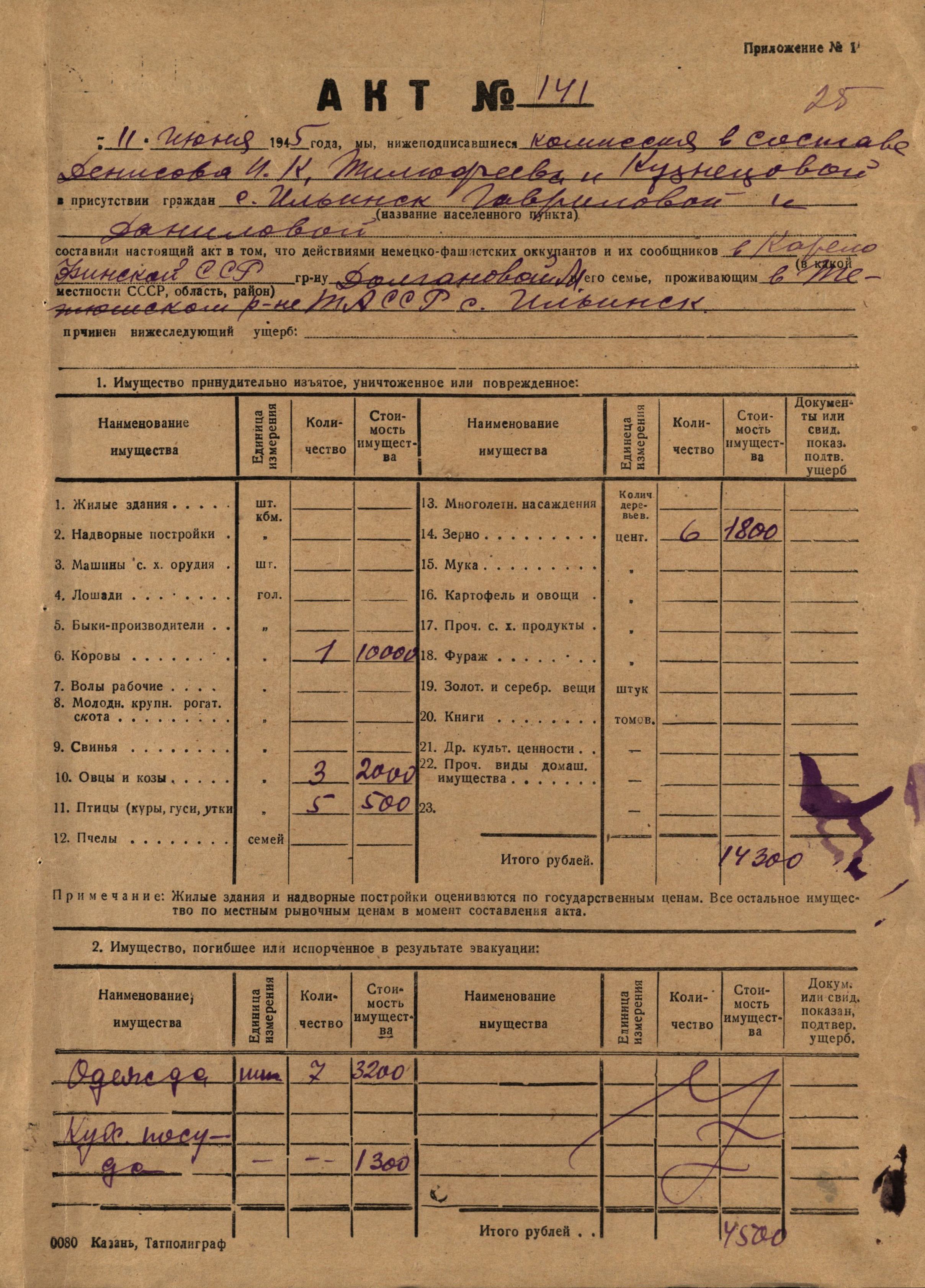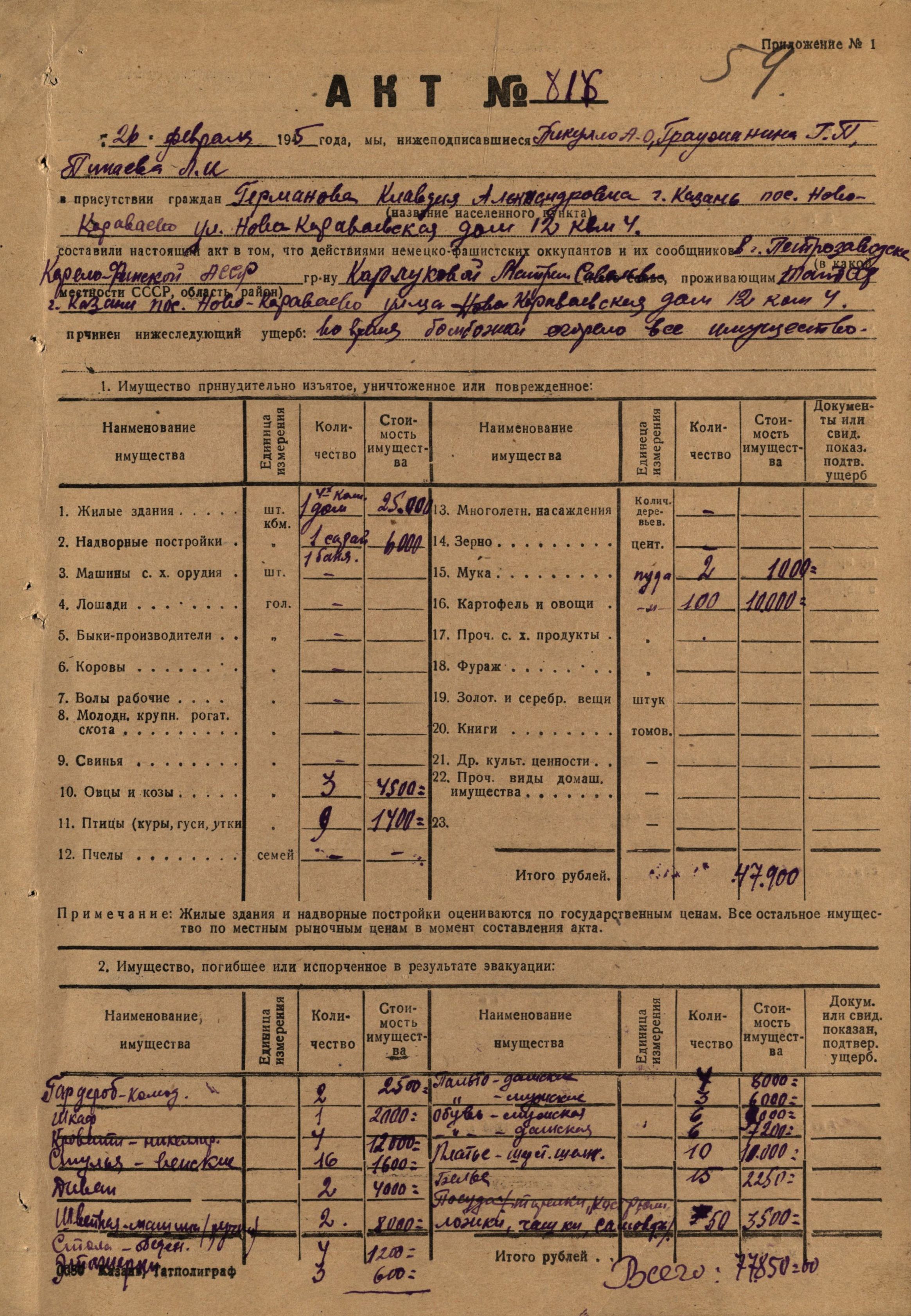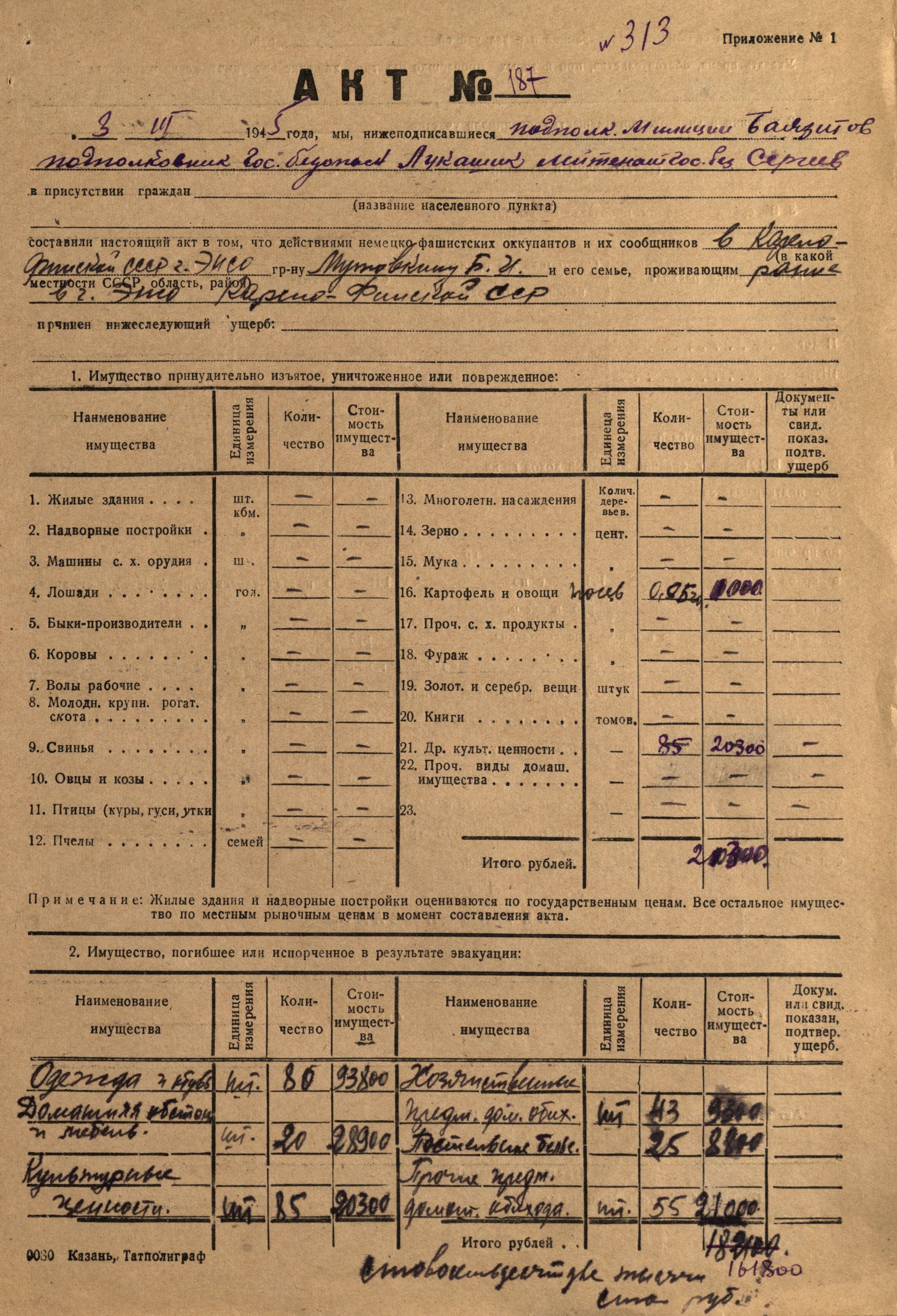 Акт ущерба, причиненного немецко-фашистскими захватчиками и их сообщниками гражданам, эвакуированным из Карело-Финской ССР в ТАССР.