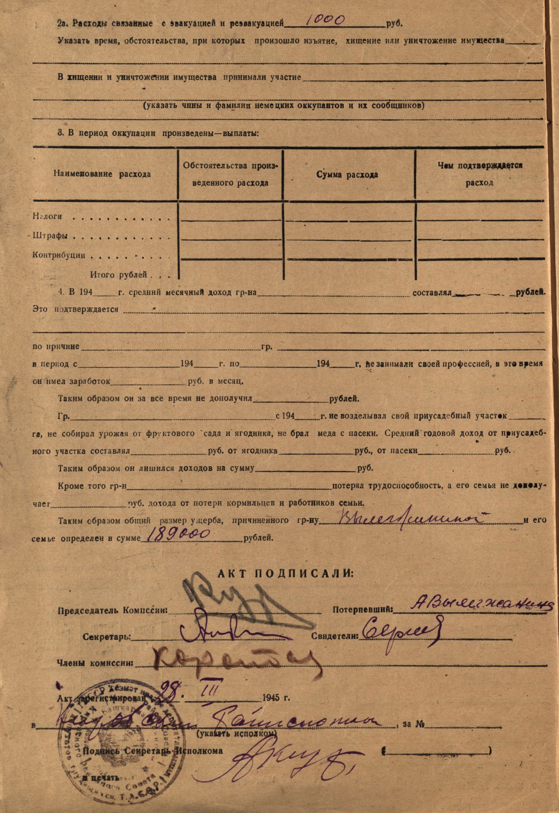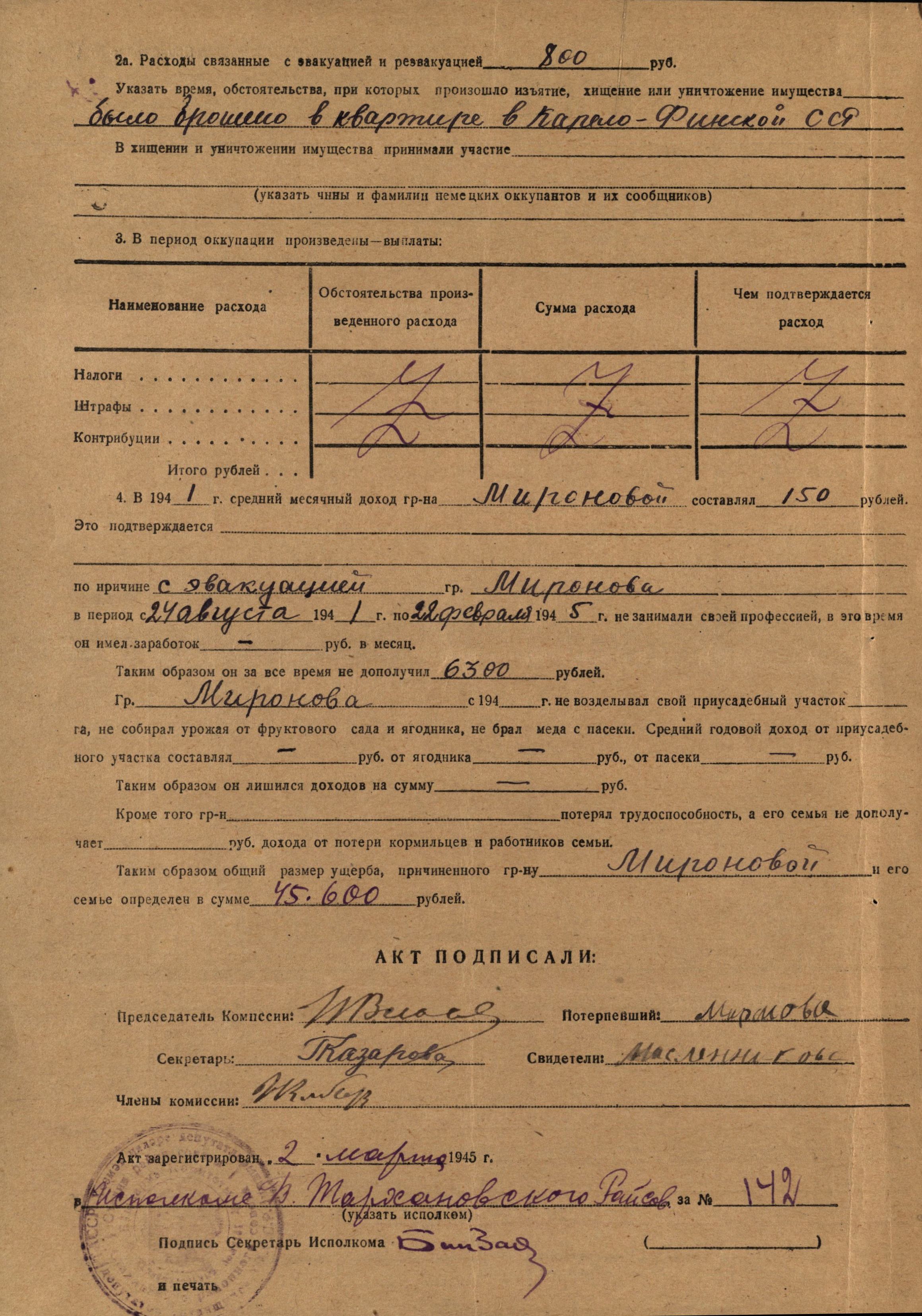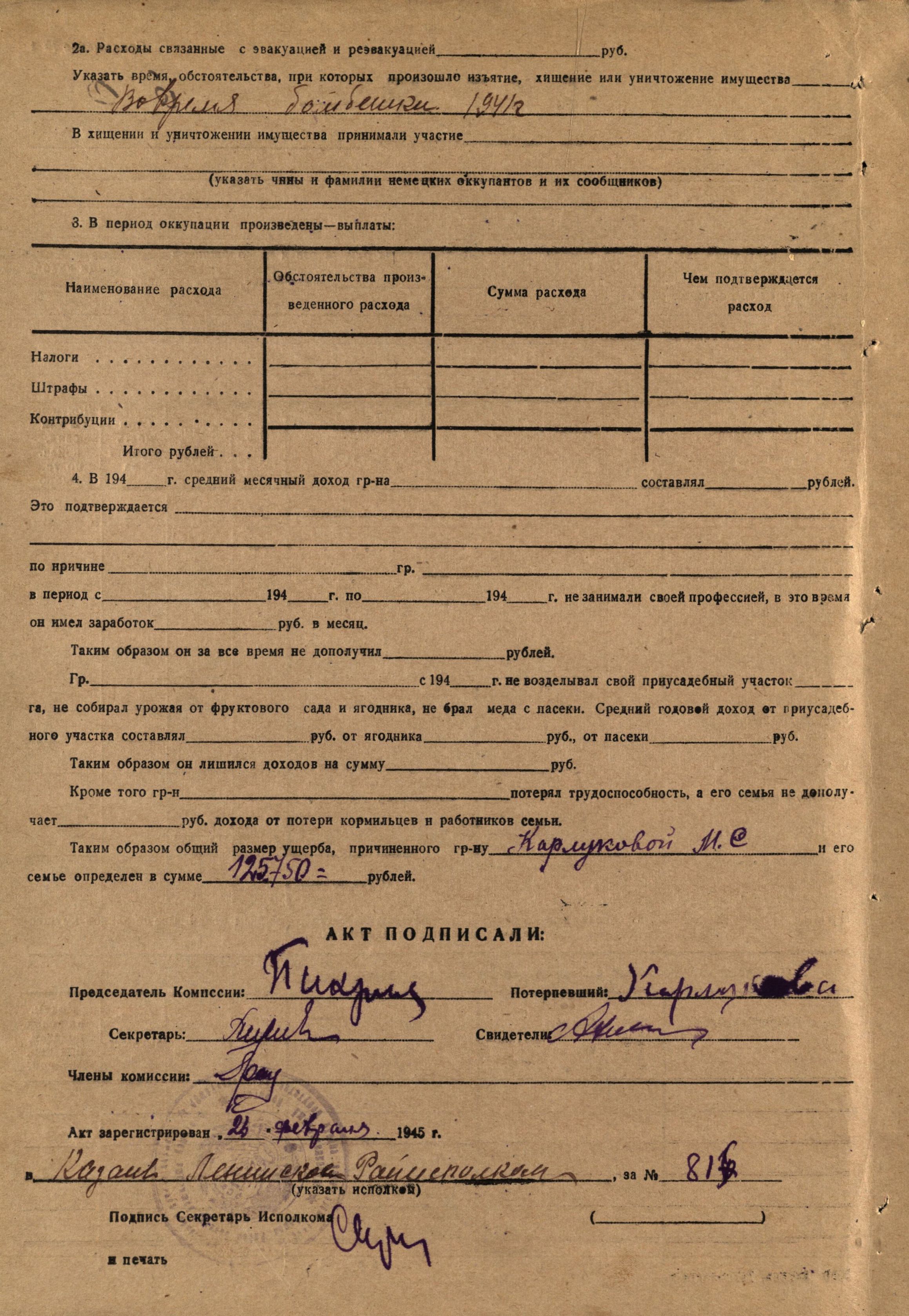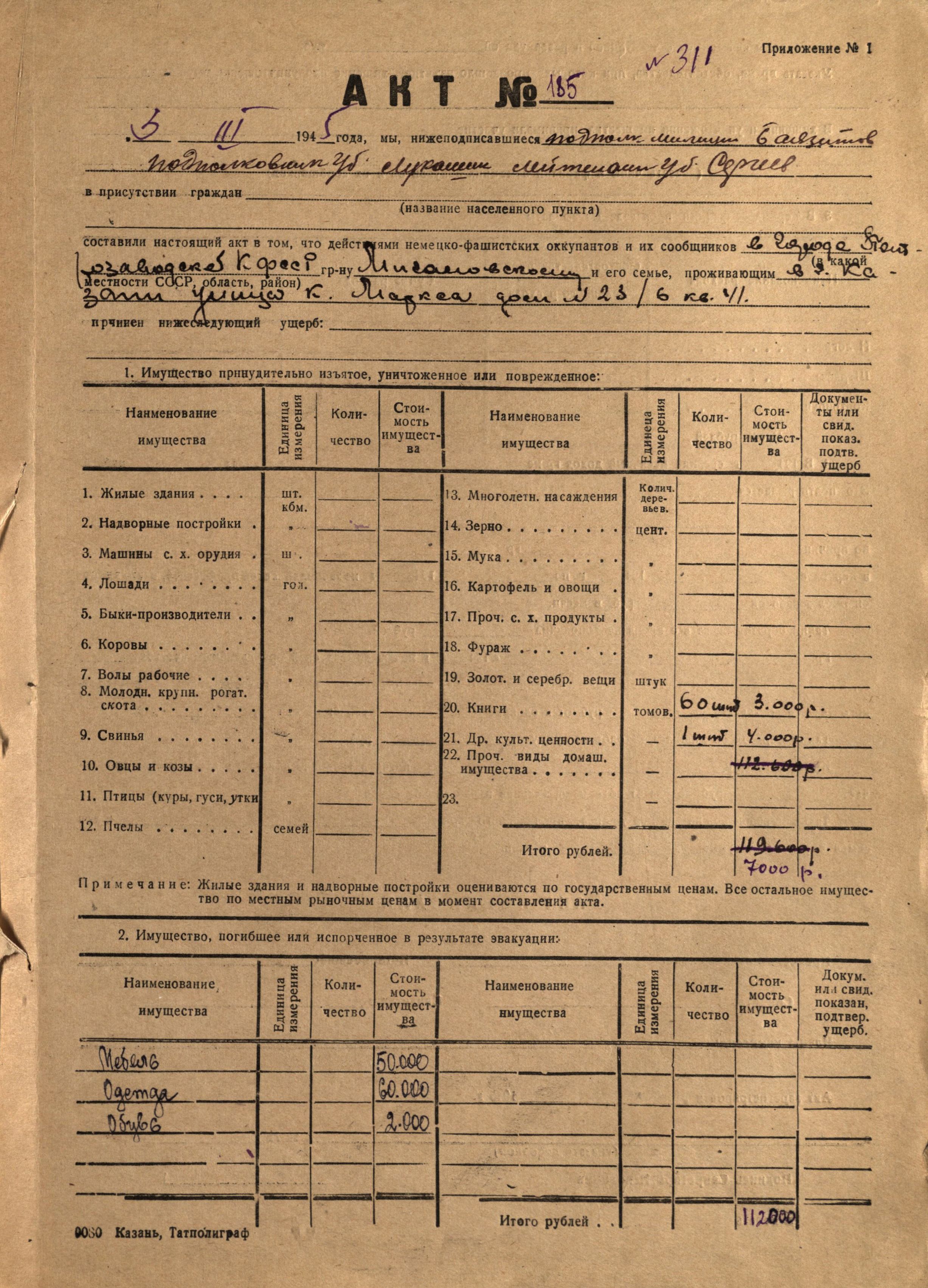 Акт ущерба, причиненного немецко-фашистскими захватчиками и их сообщниками гражданам, эвакуированным из Карело-Финской ССР в ТАССР.