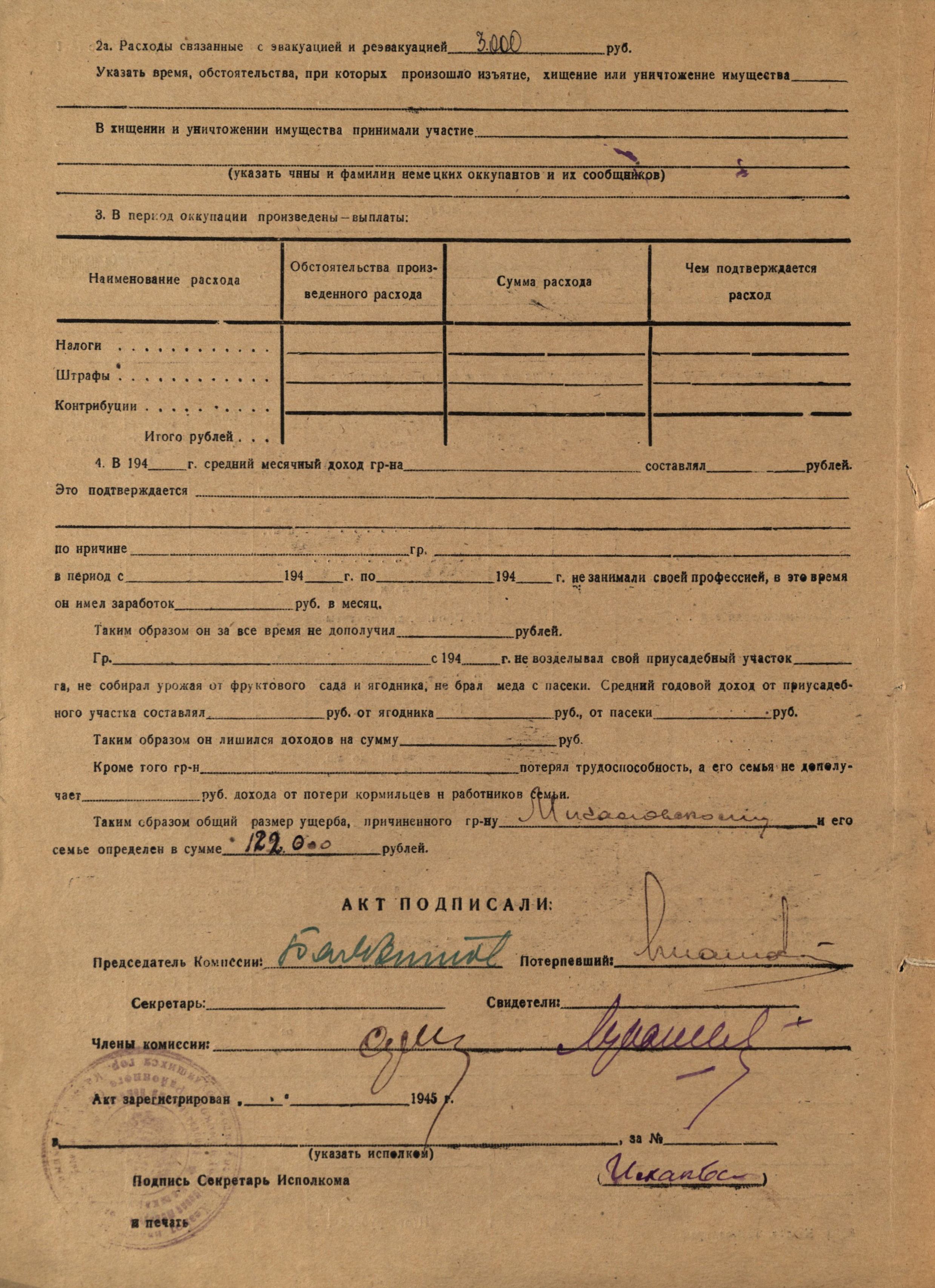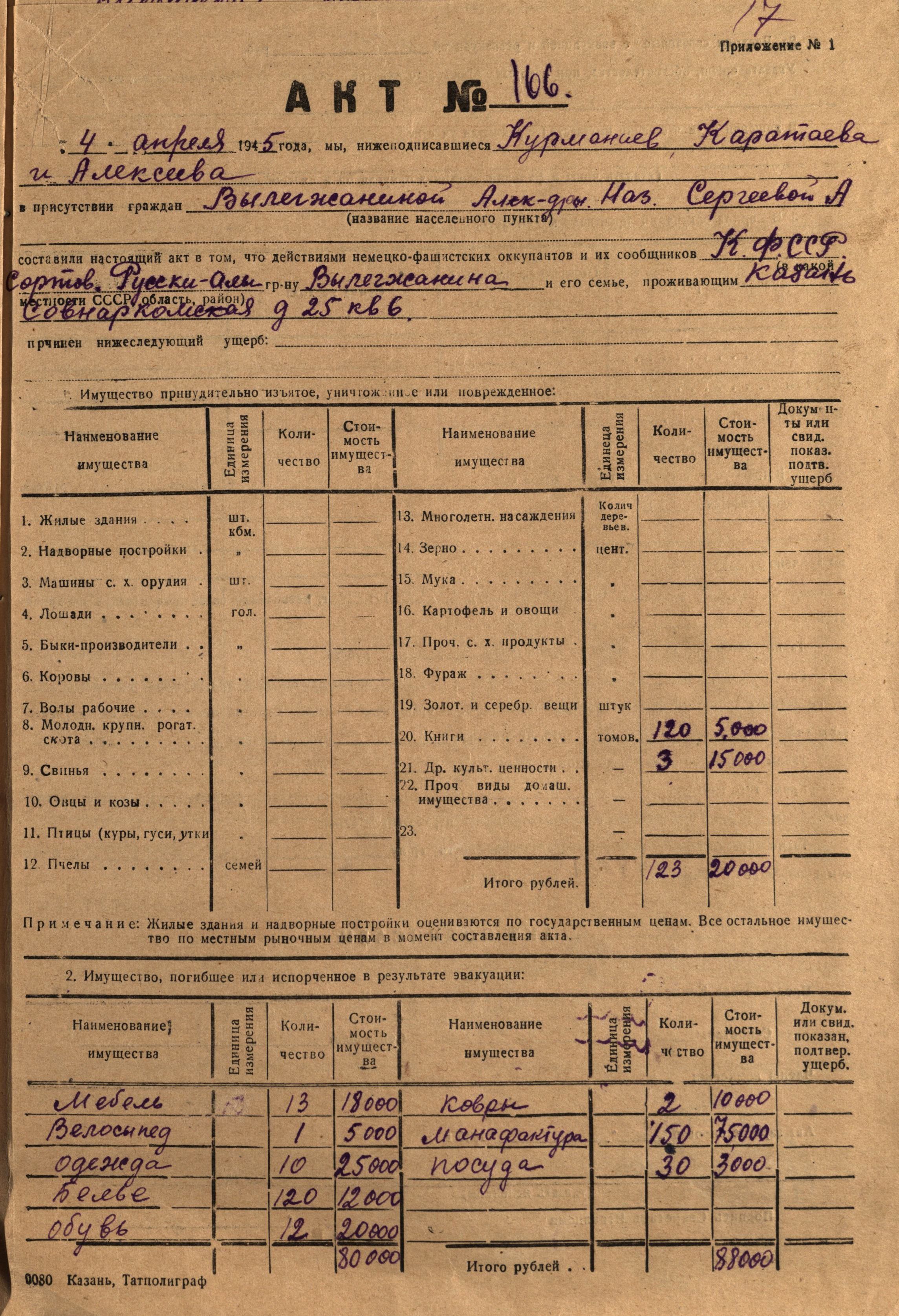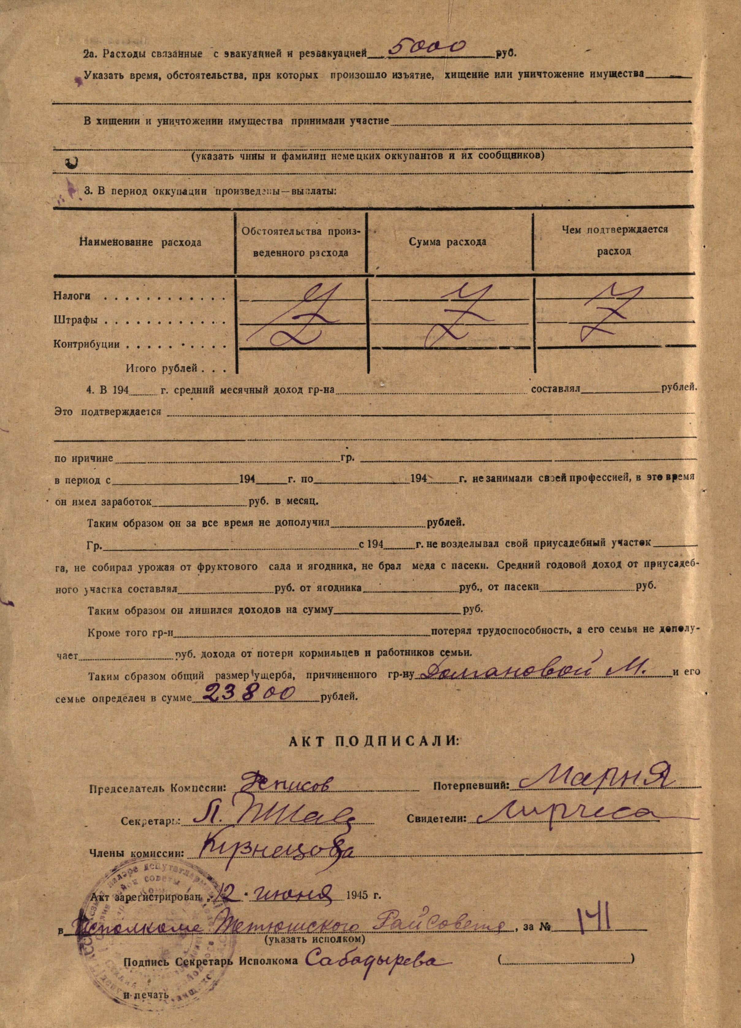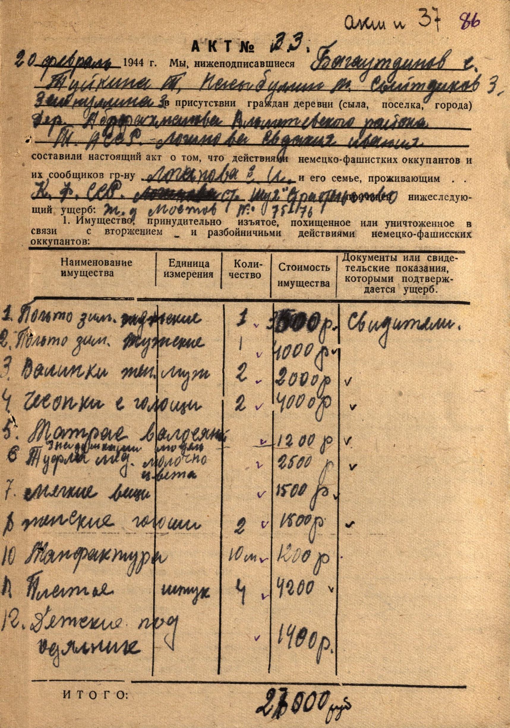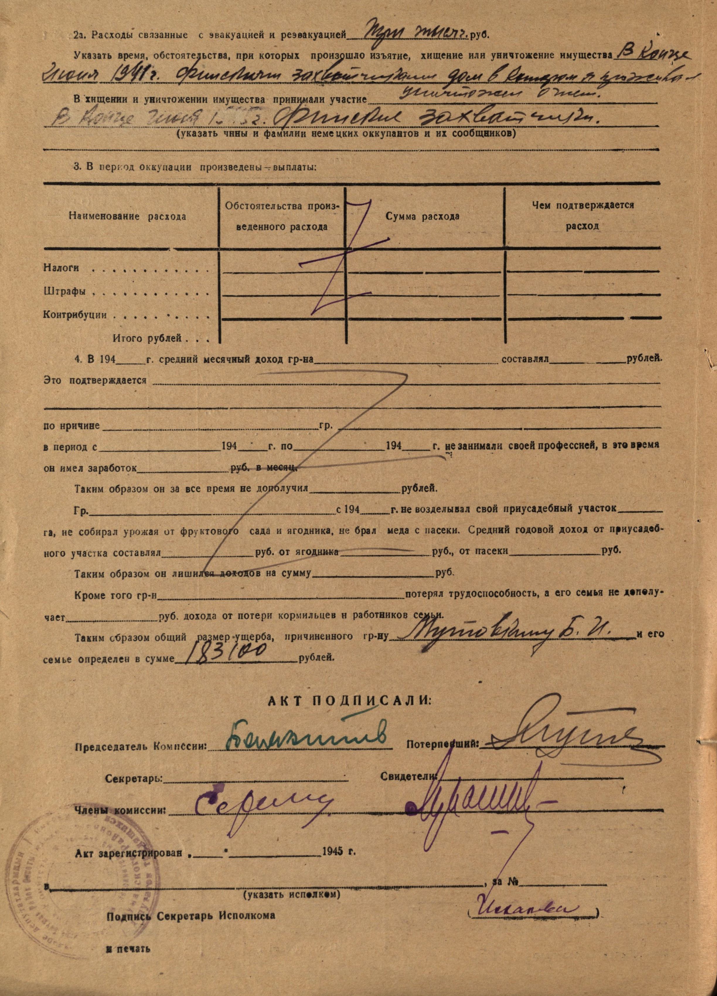 Акт ущерба, причиненного немецко-фашистскими захватчиками и их сообщниками гражданам, эвакуированным из Карело-Финской ССР в ТАССР.
