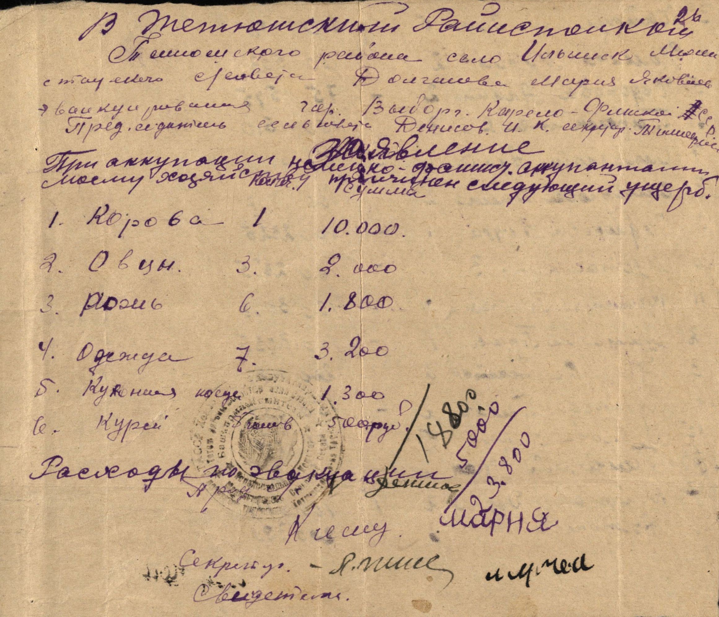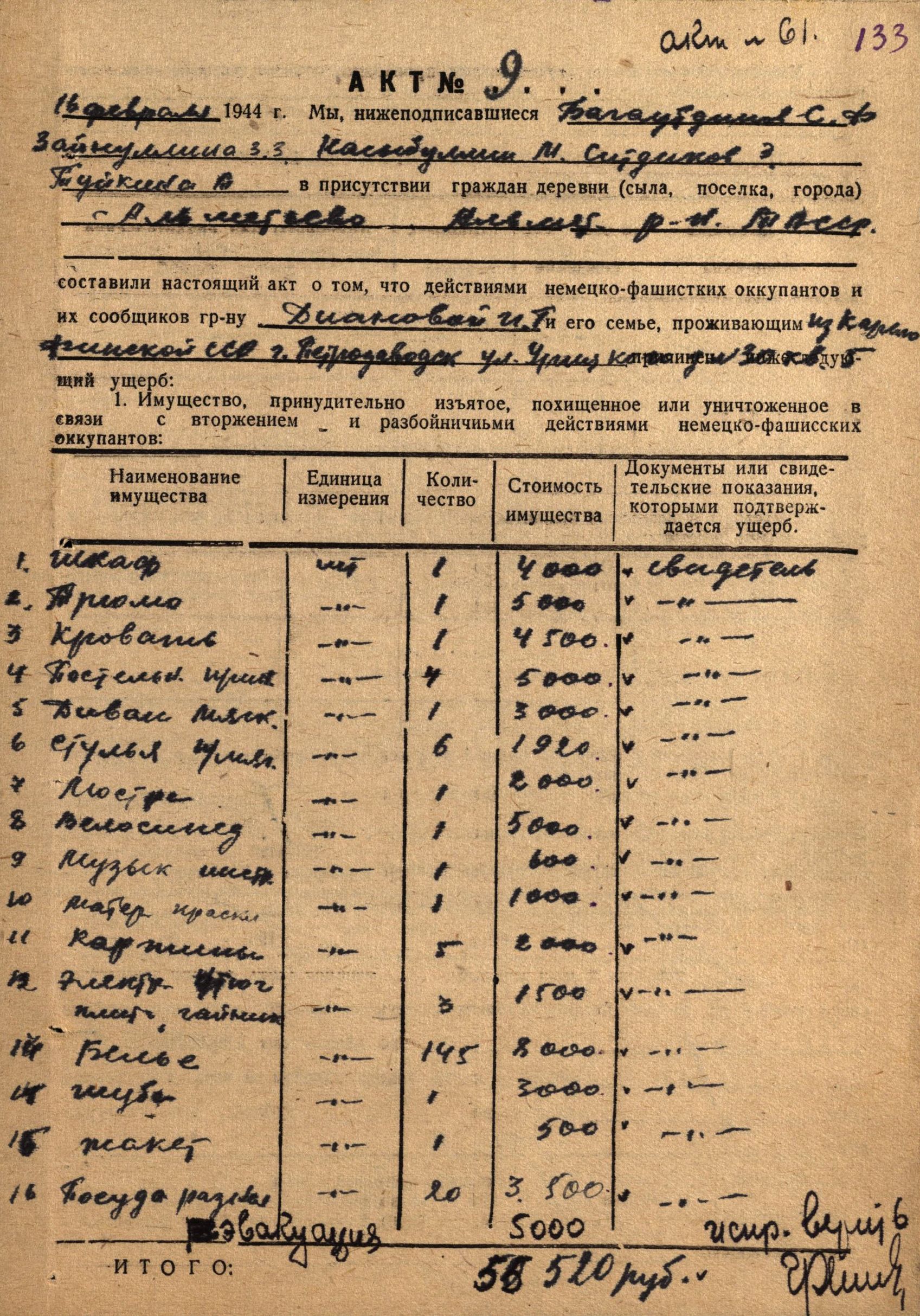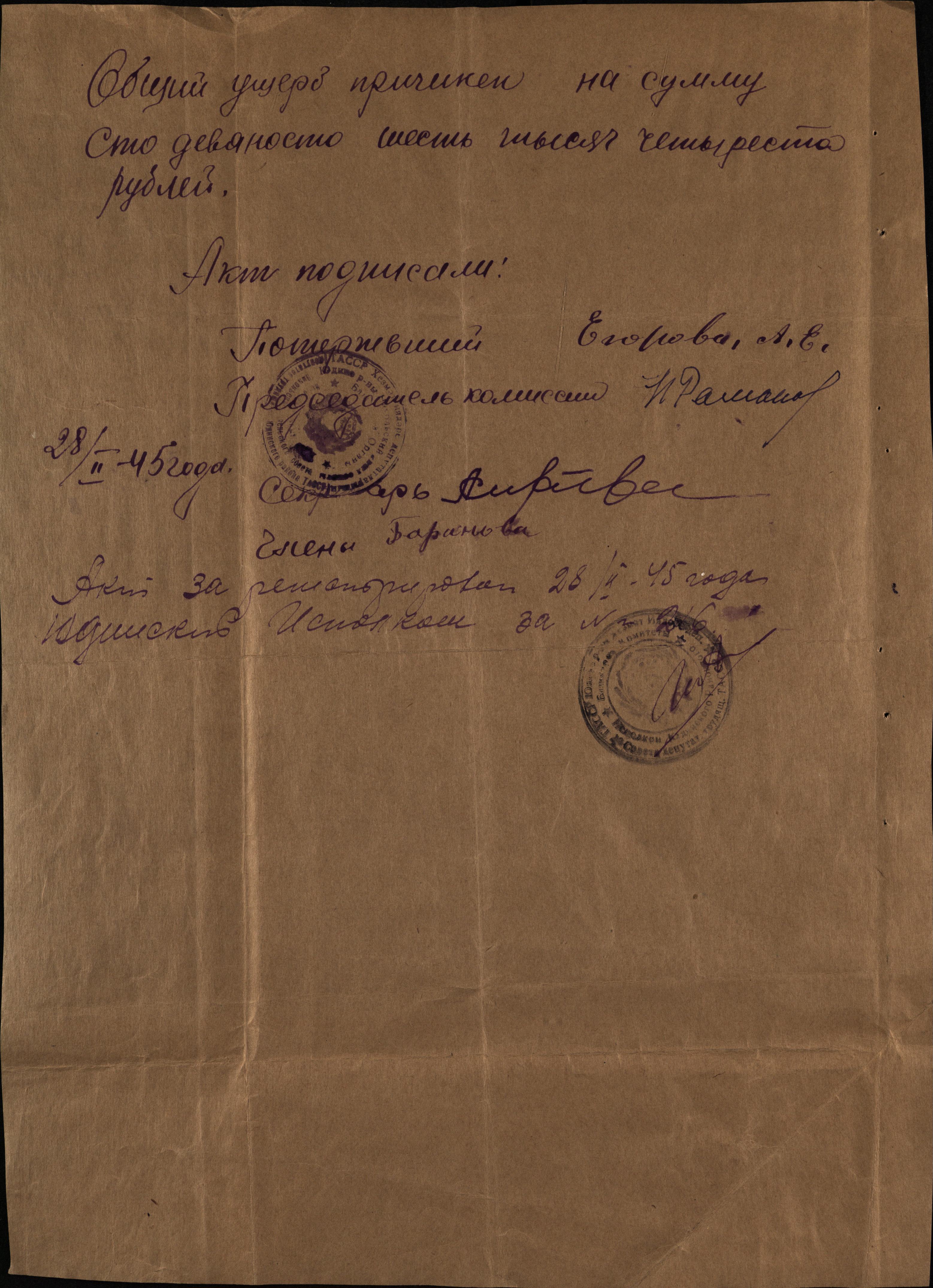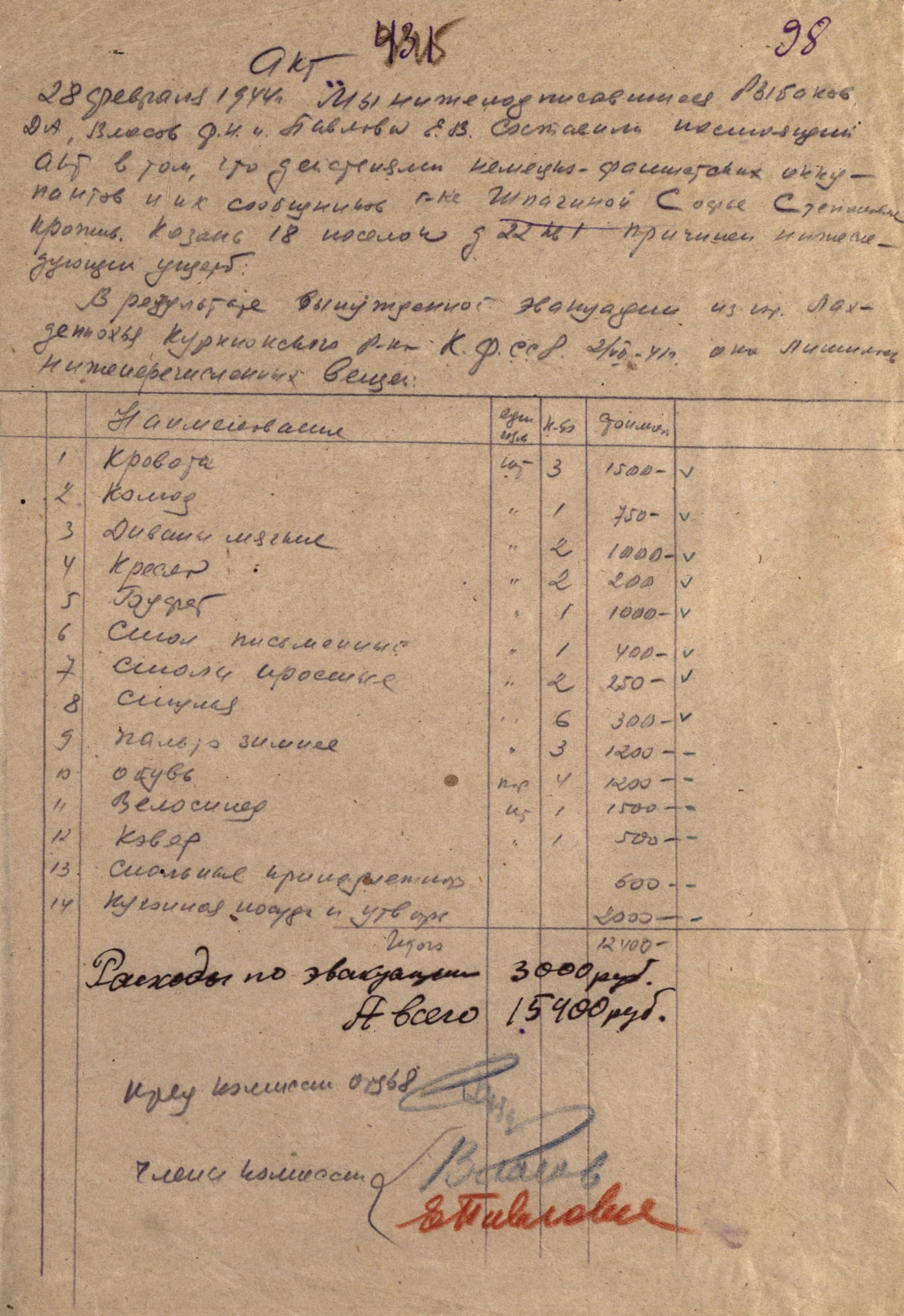 Акт ущерба, причиненного немецко-фашистскими захватчиками и их сообщниками гражданам, эвакуированным из Карело-Финской ССР в ТАССР.