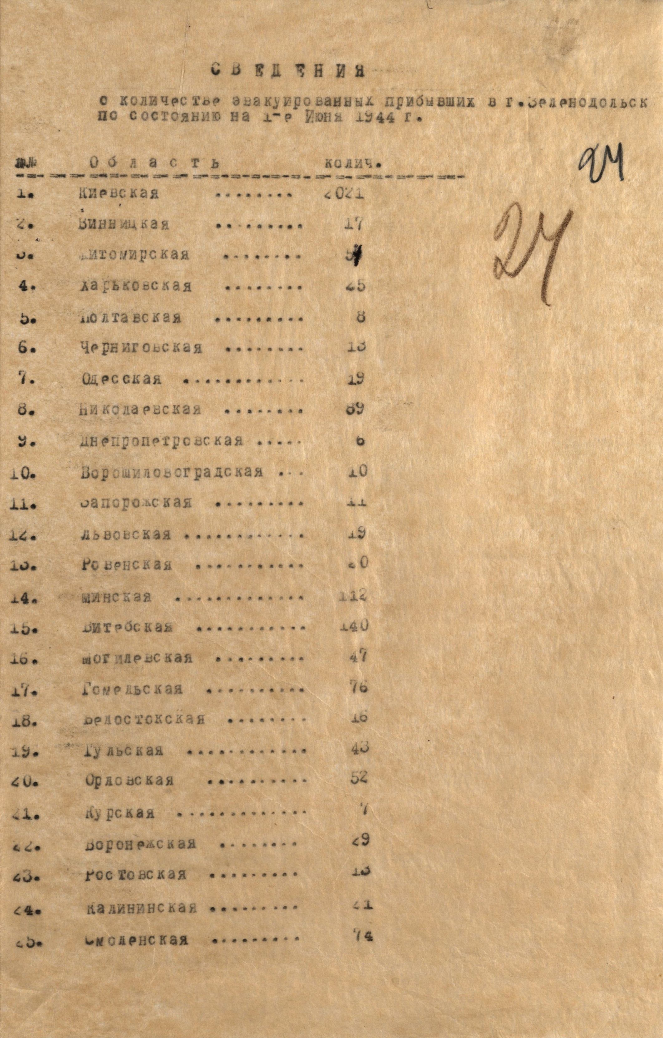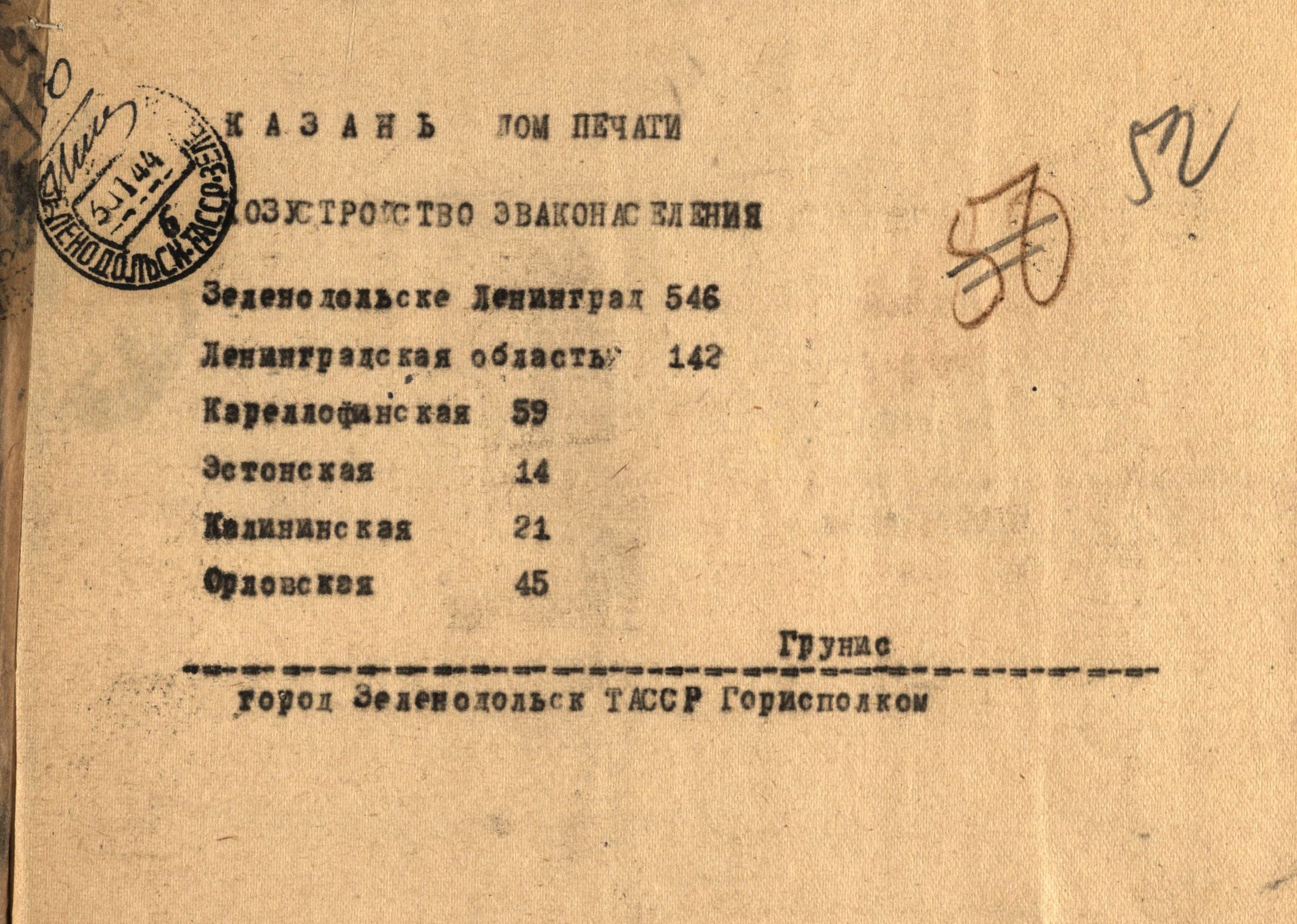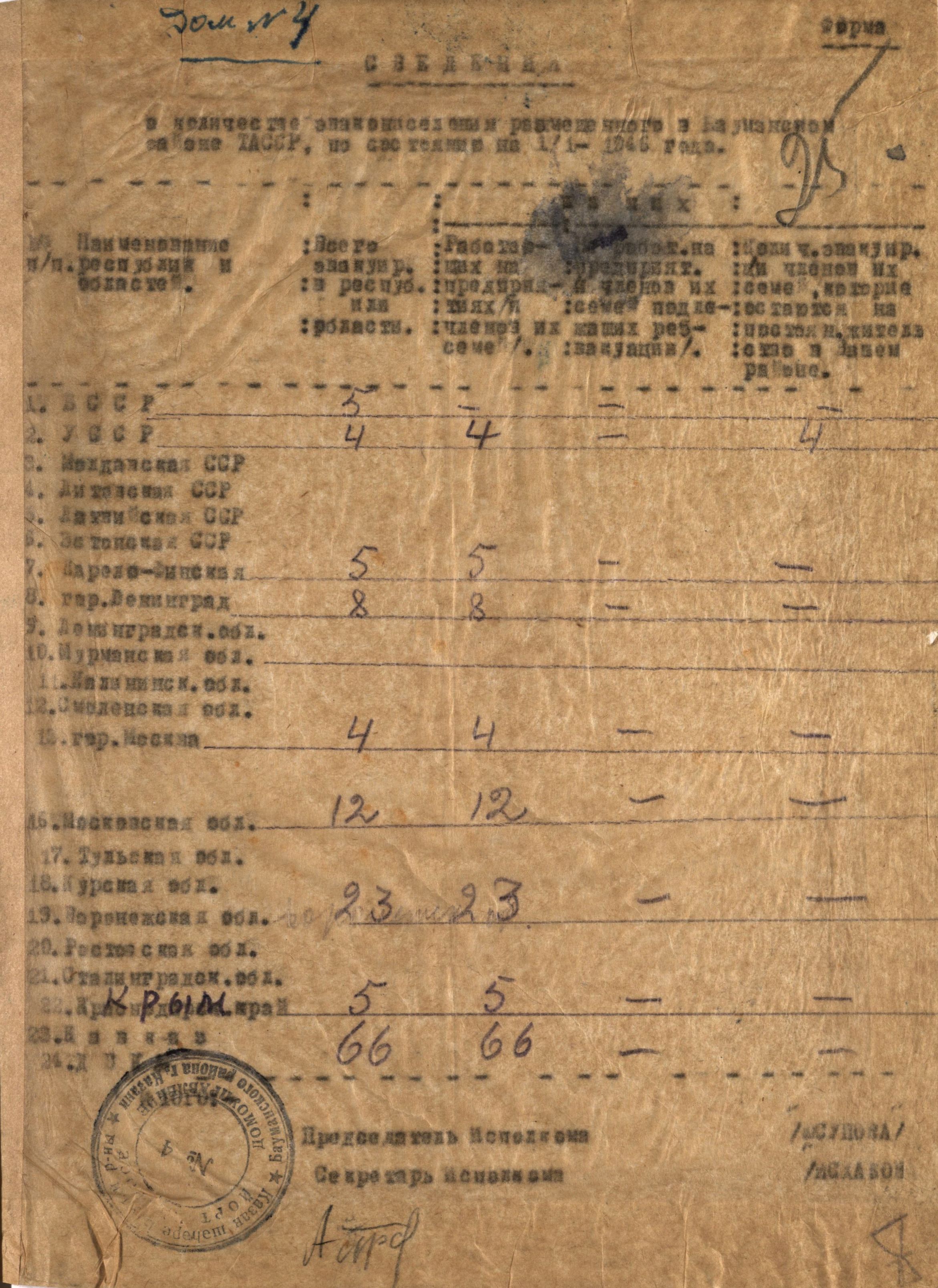 Сведения о количестве эвакуированных из Карело-Финской ССР, проживающих в г. Зеленодольске.