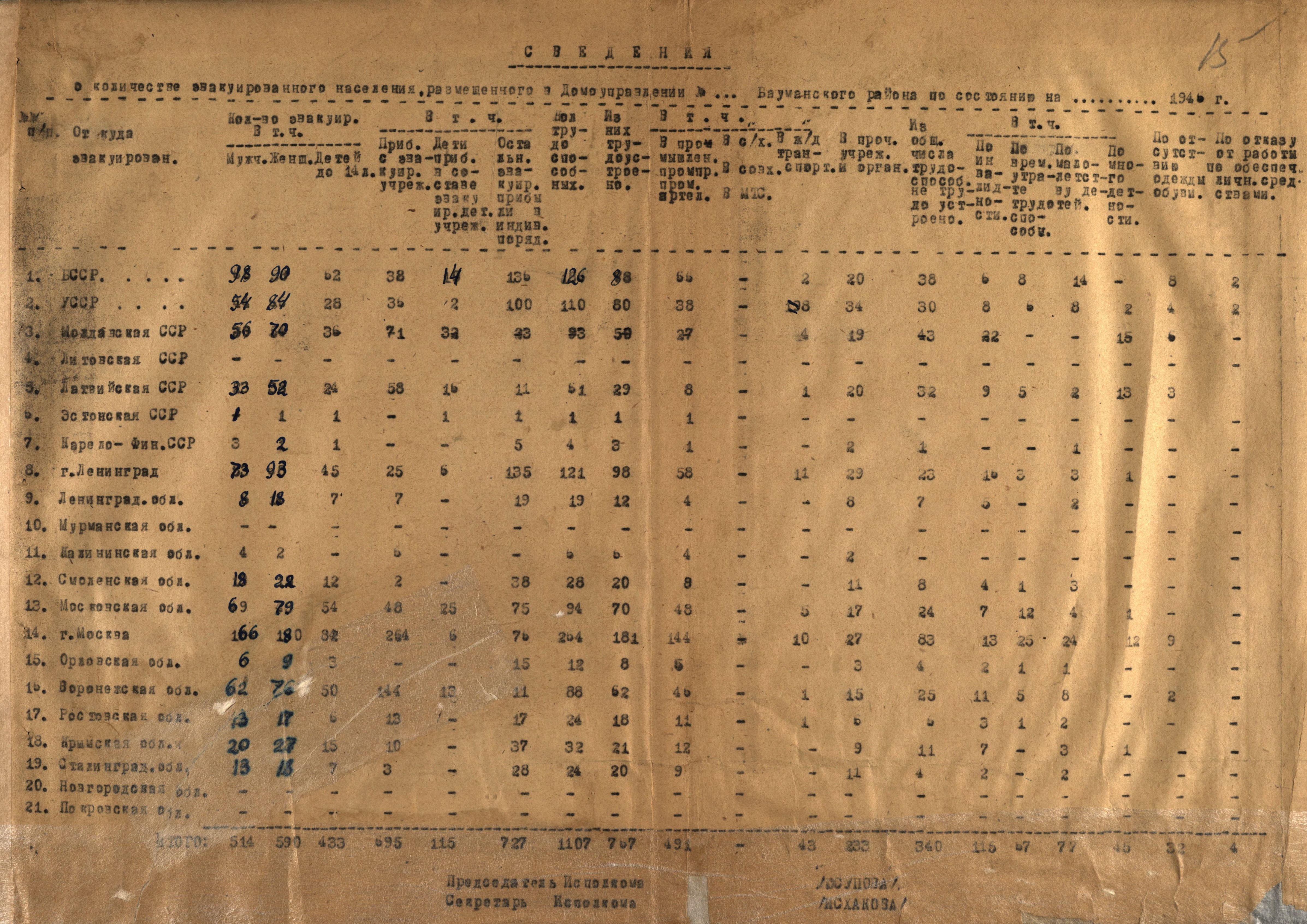 Сведения о количестве эвакуированного населения, размещенного в Бауманском районе ТАССР.