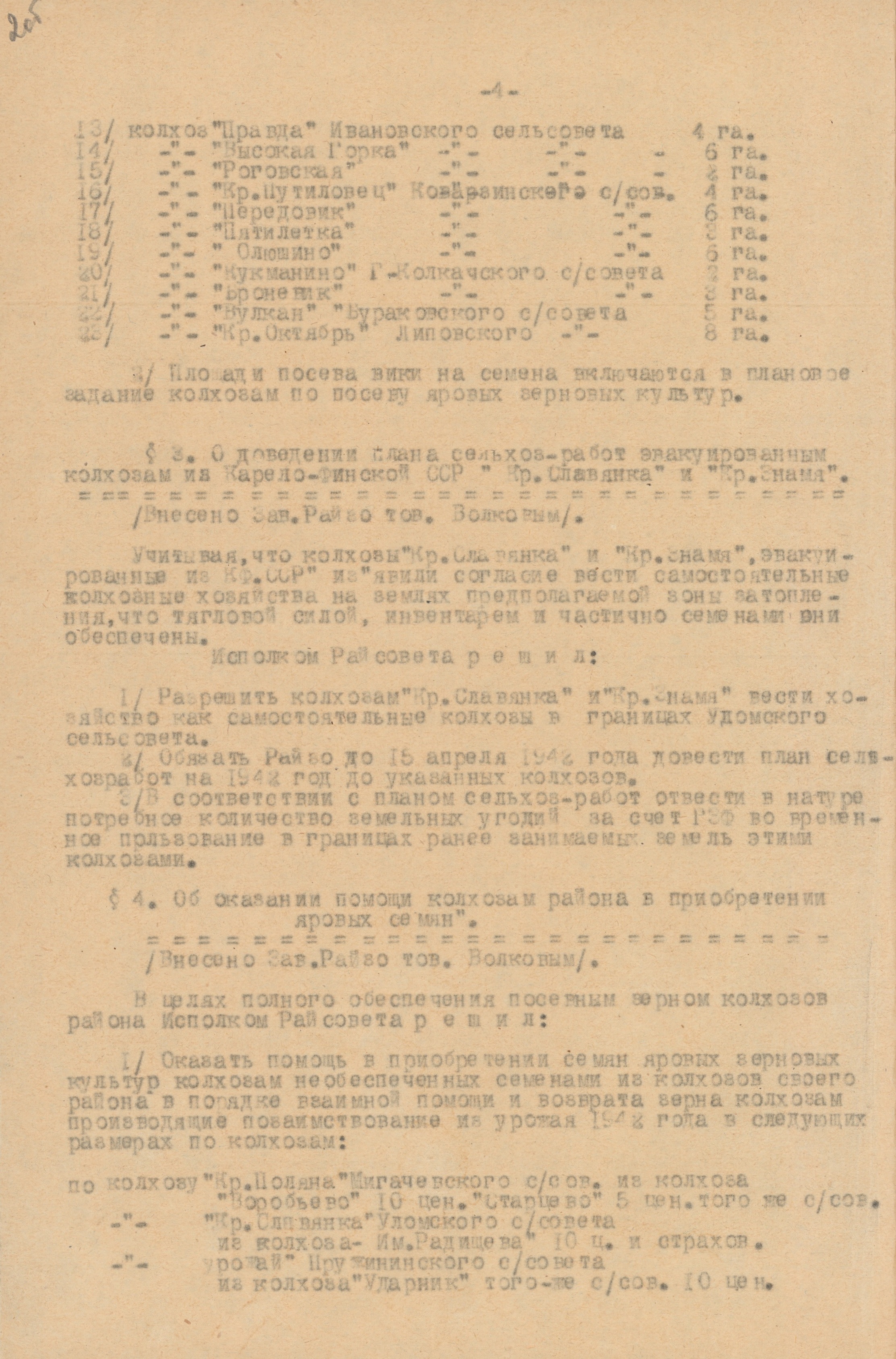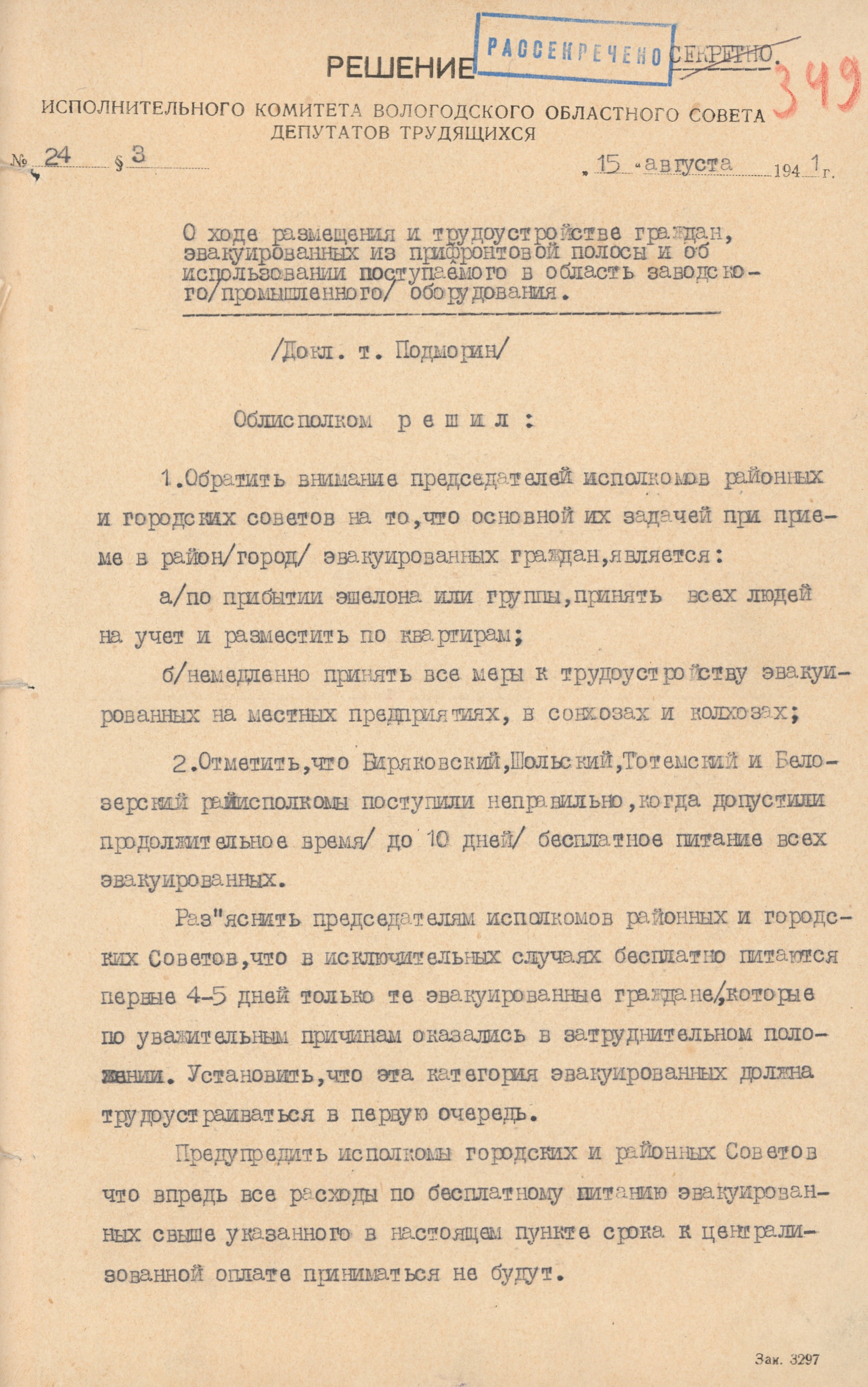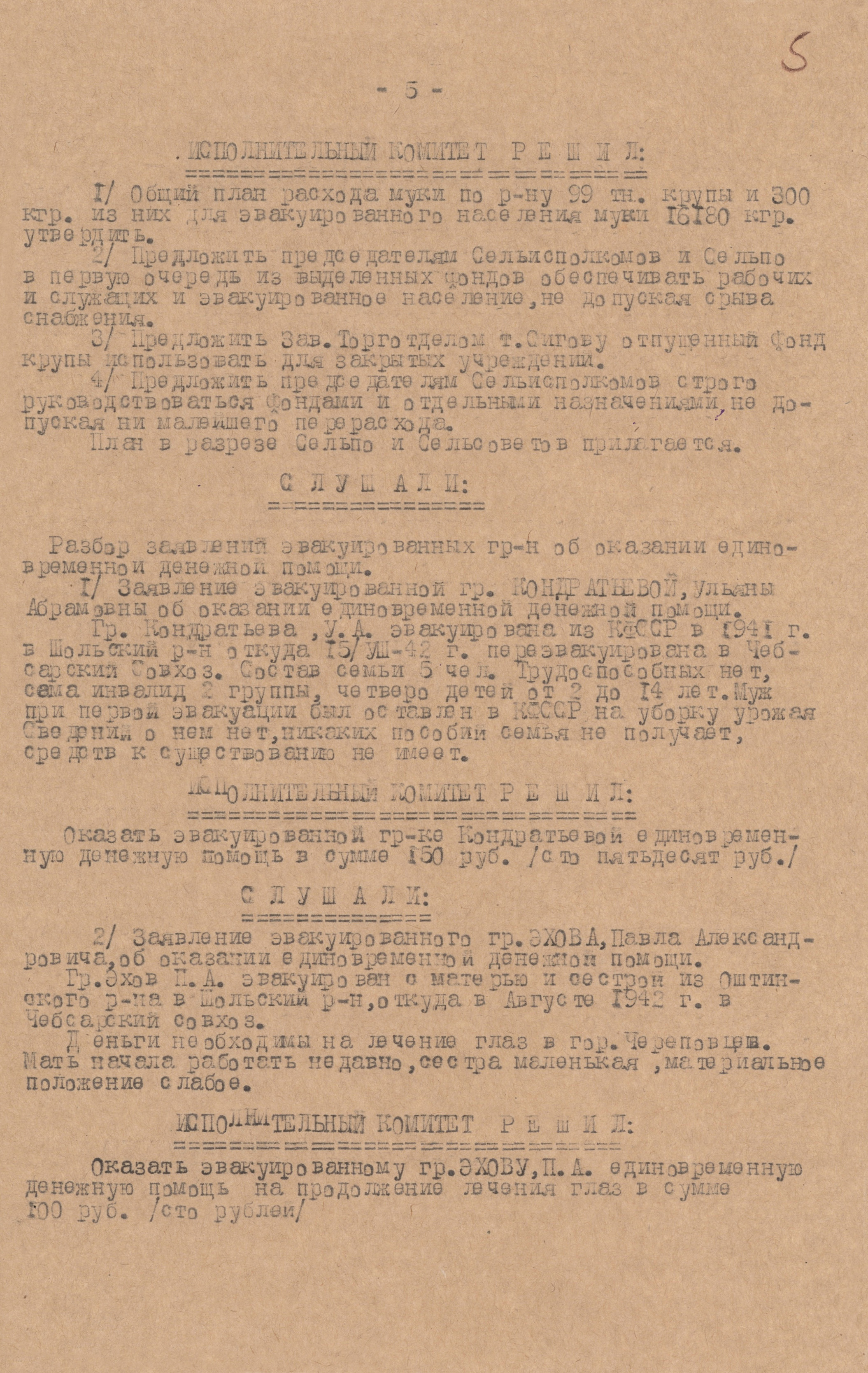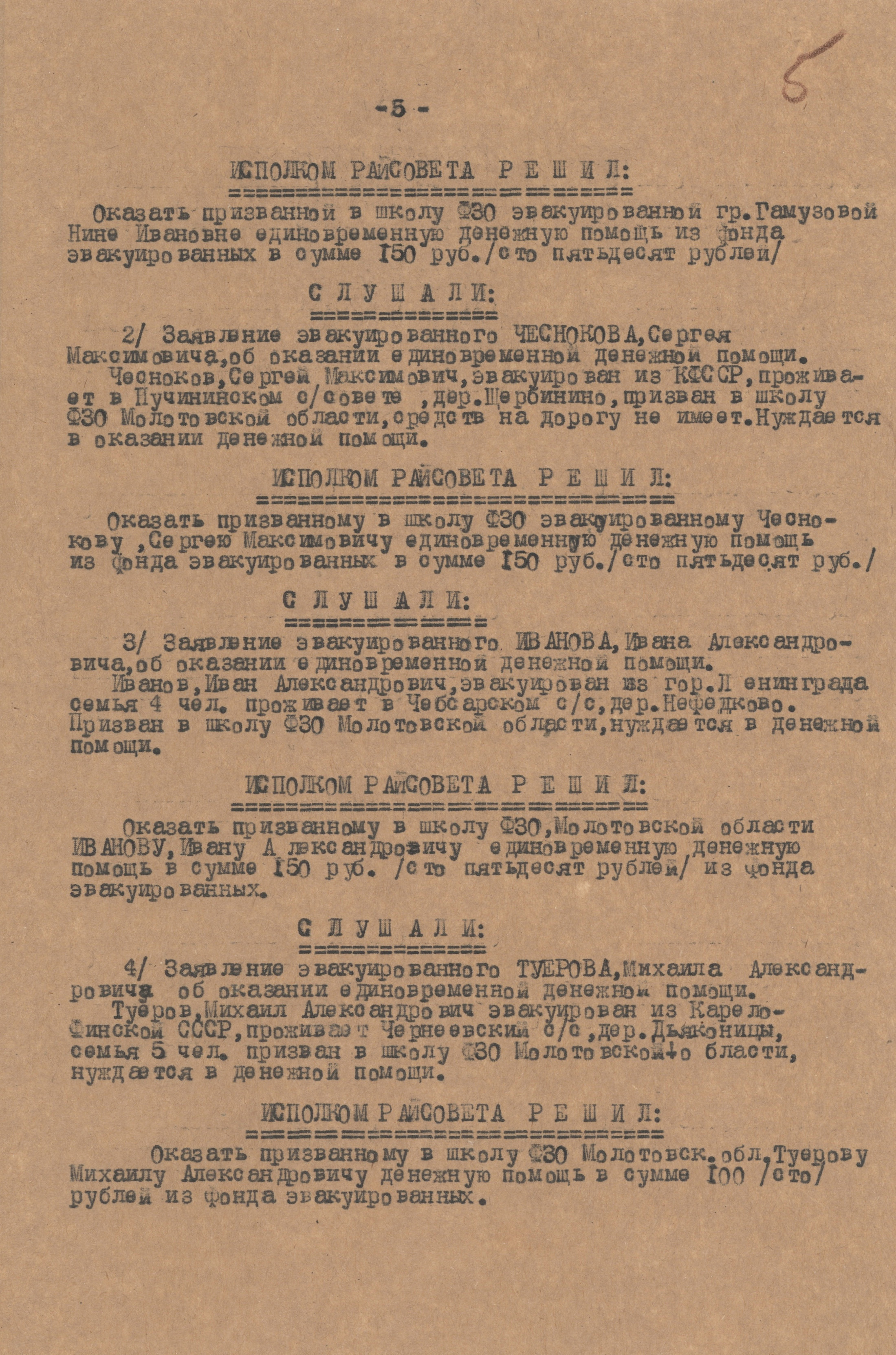 Из протокола № 37 заседания исполкома Чебсарского райсовета депутатов трудящихся Вологодской области о разборе заявлений, эвакуированных из КФССР С. М. Чеснокова и М. А. Туерова об оказании единовременной денежной помощи в связи с призывом в школу ФЗО Молотовской области.
