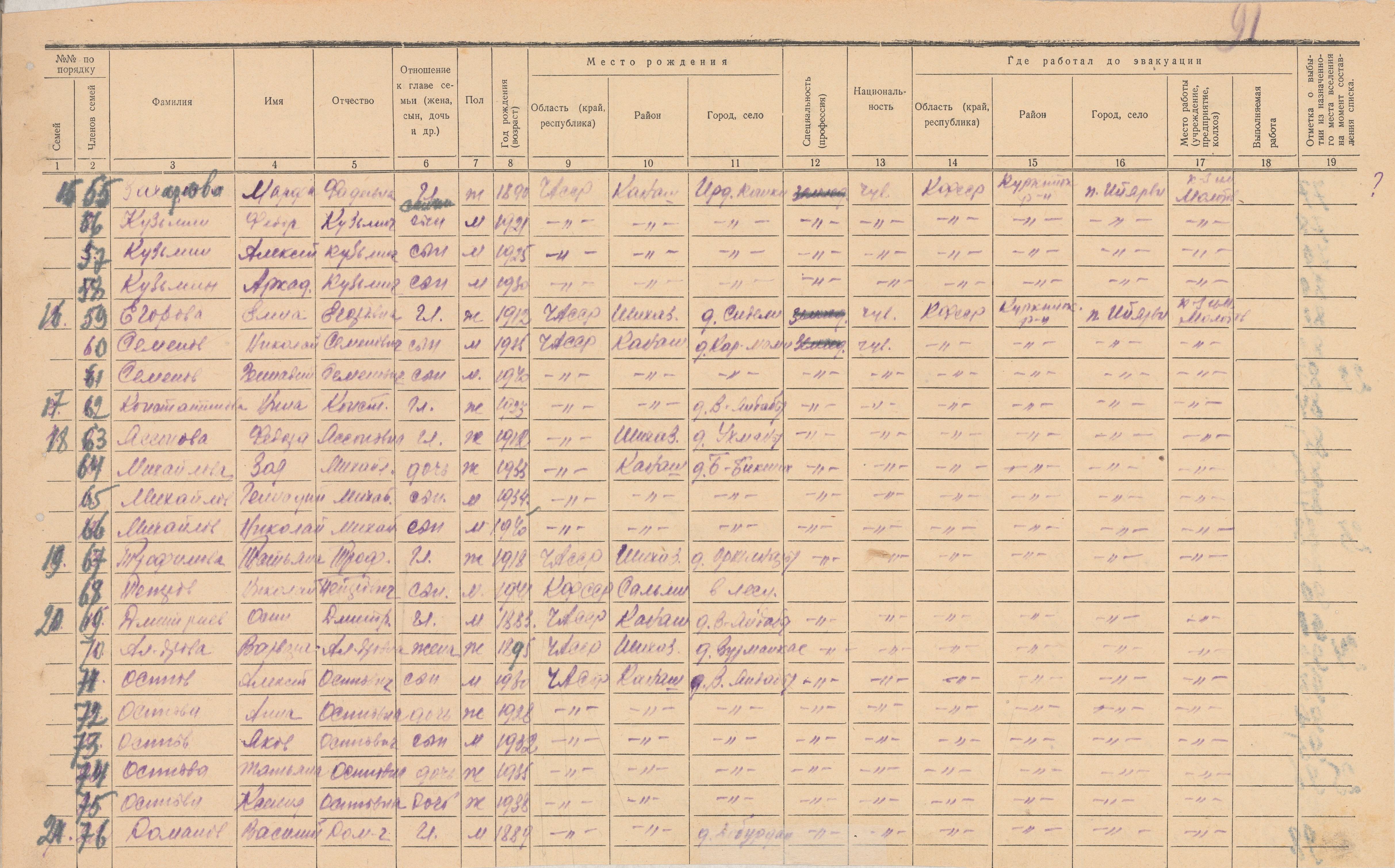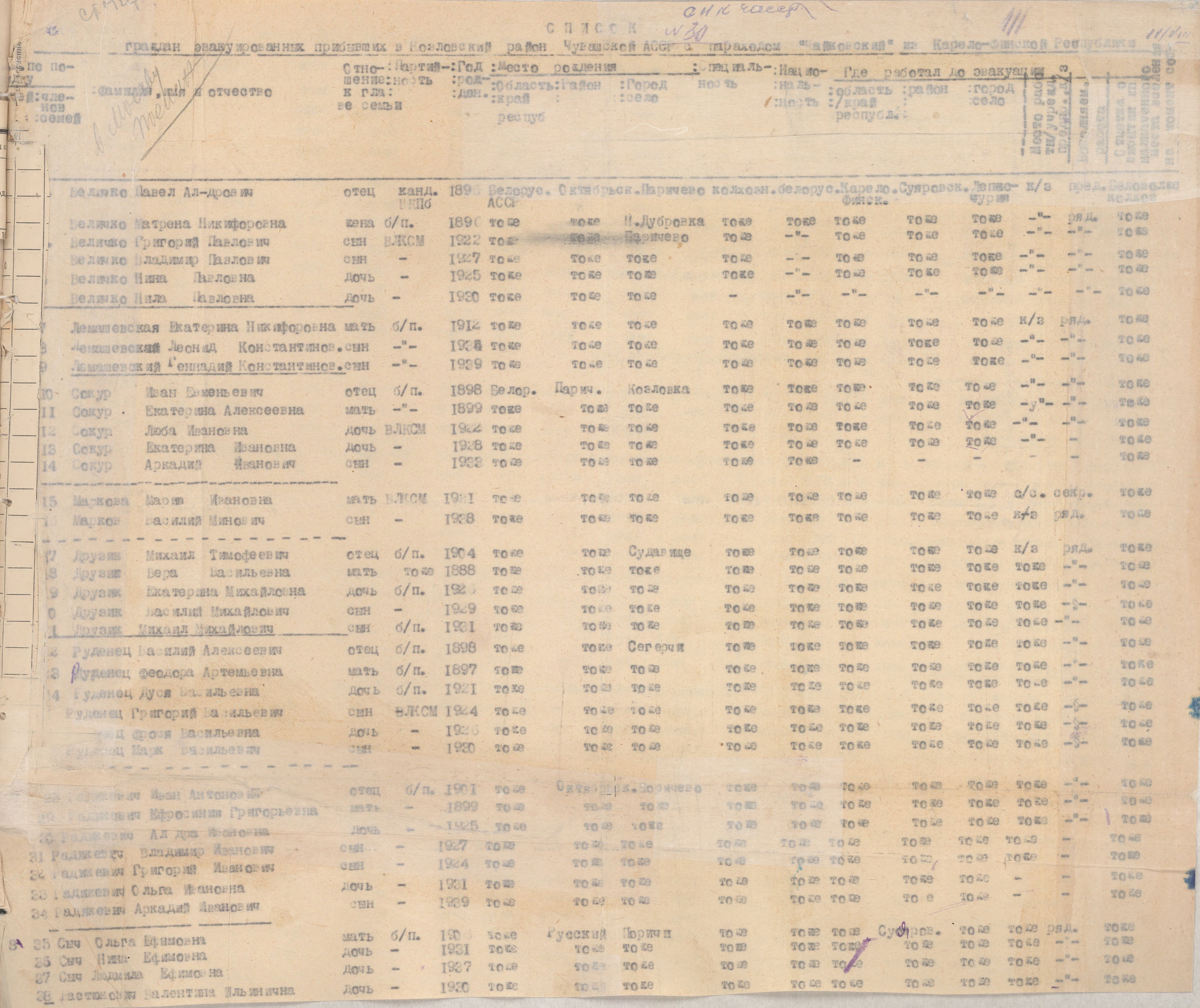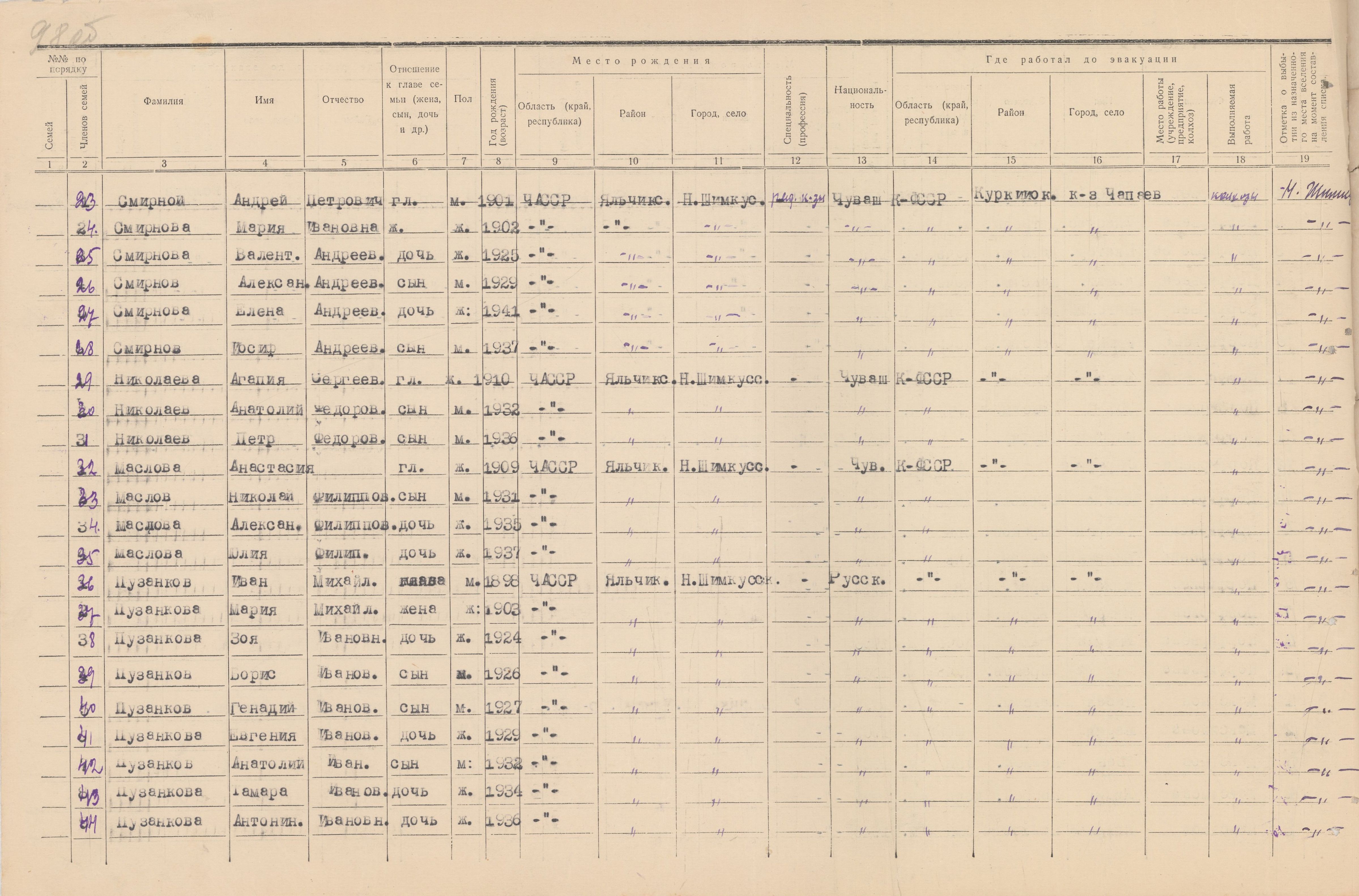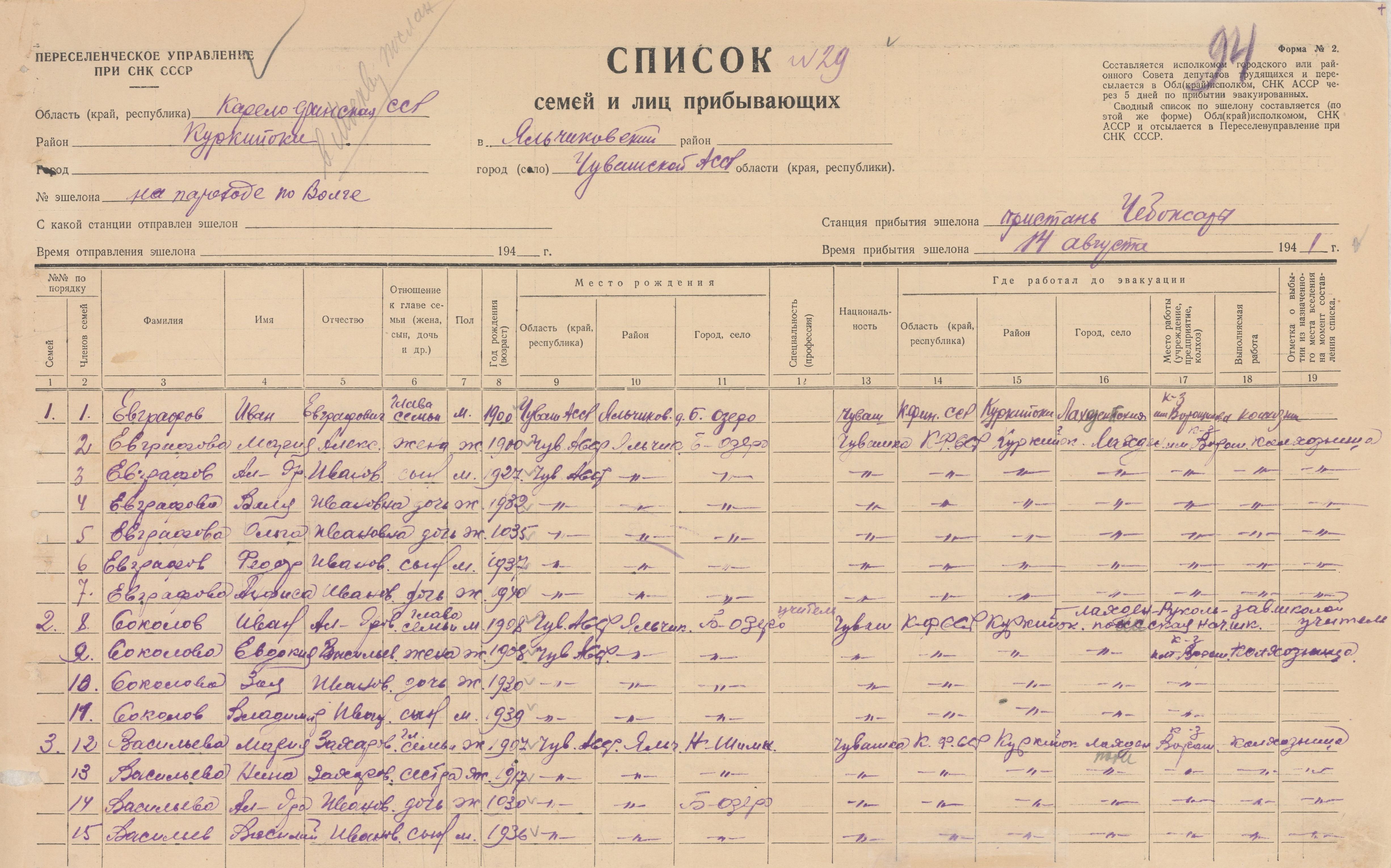 Список эвакуированных граждан в Ядринский район Чувашской АССР из Карело-Финской ССР.