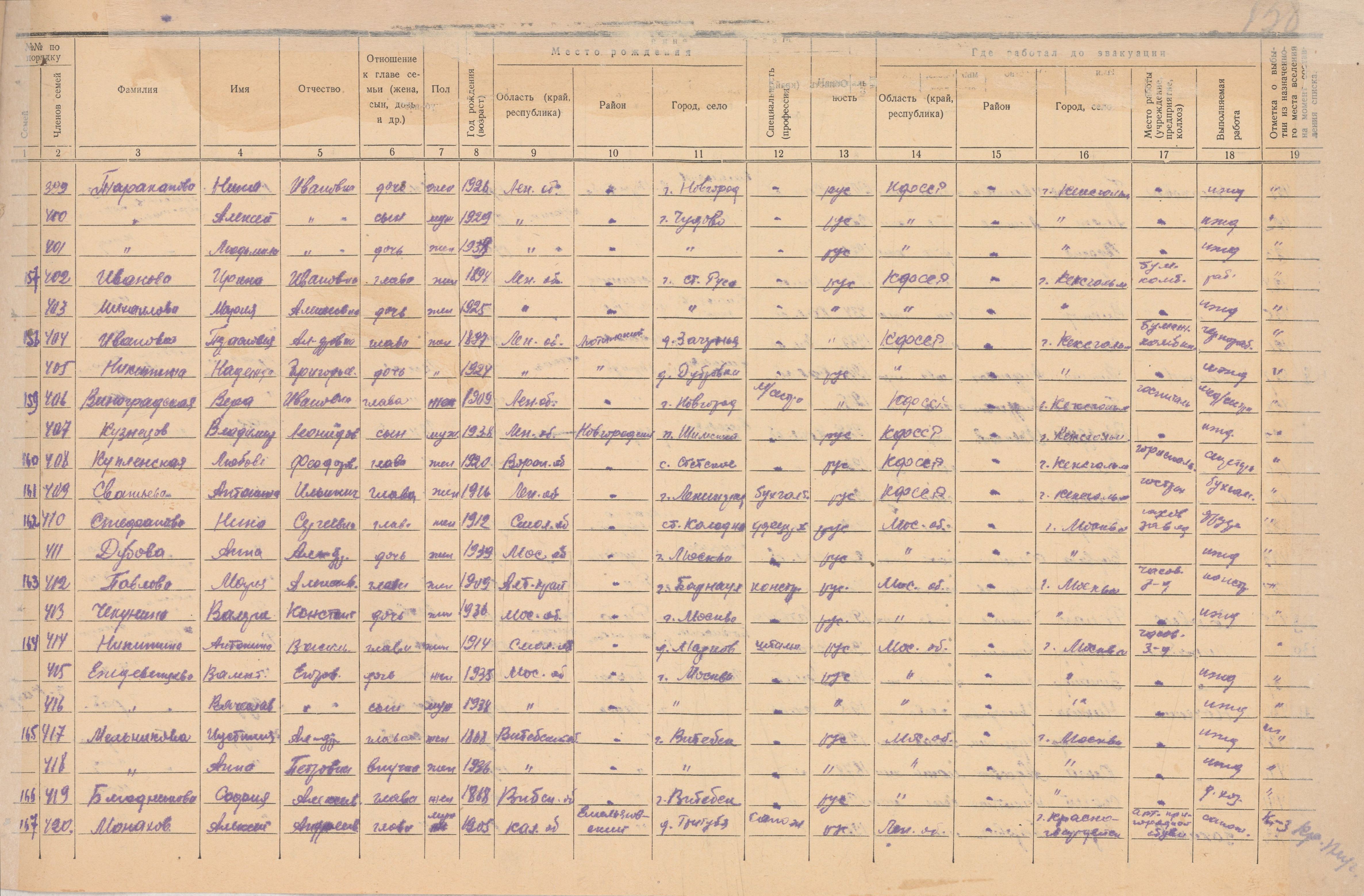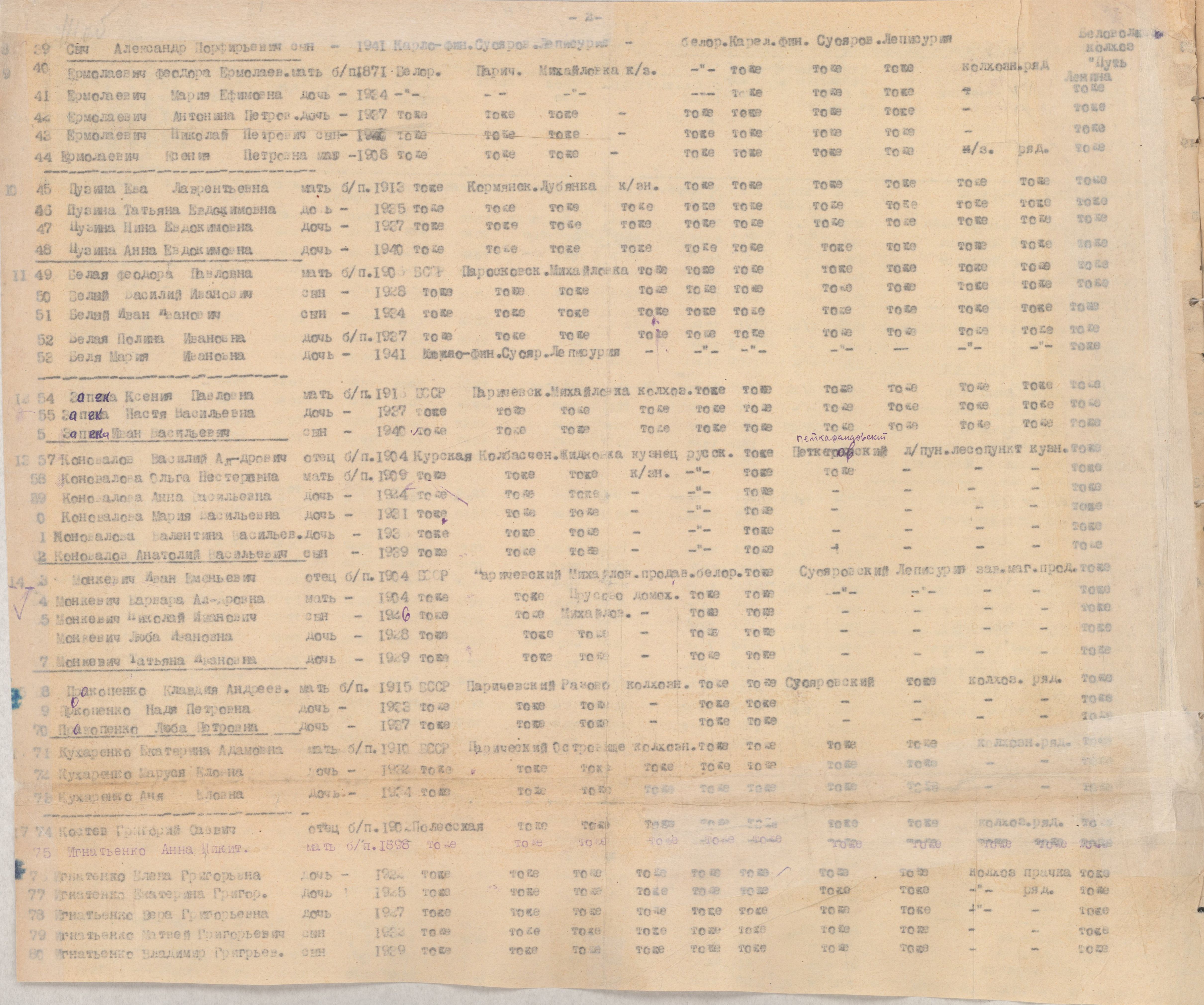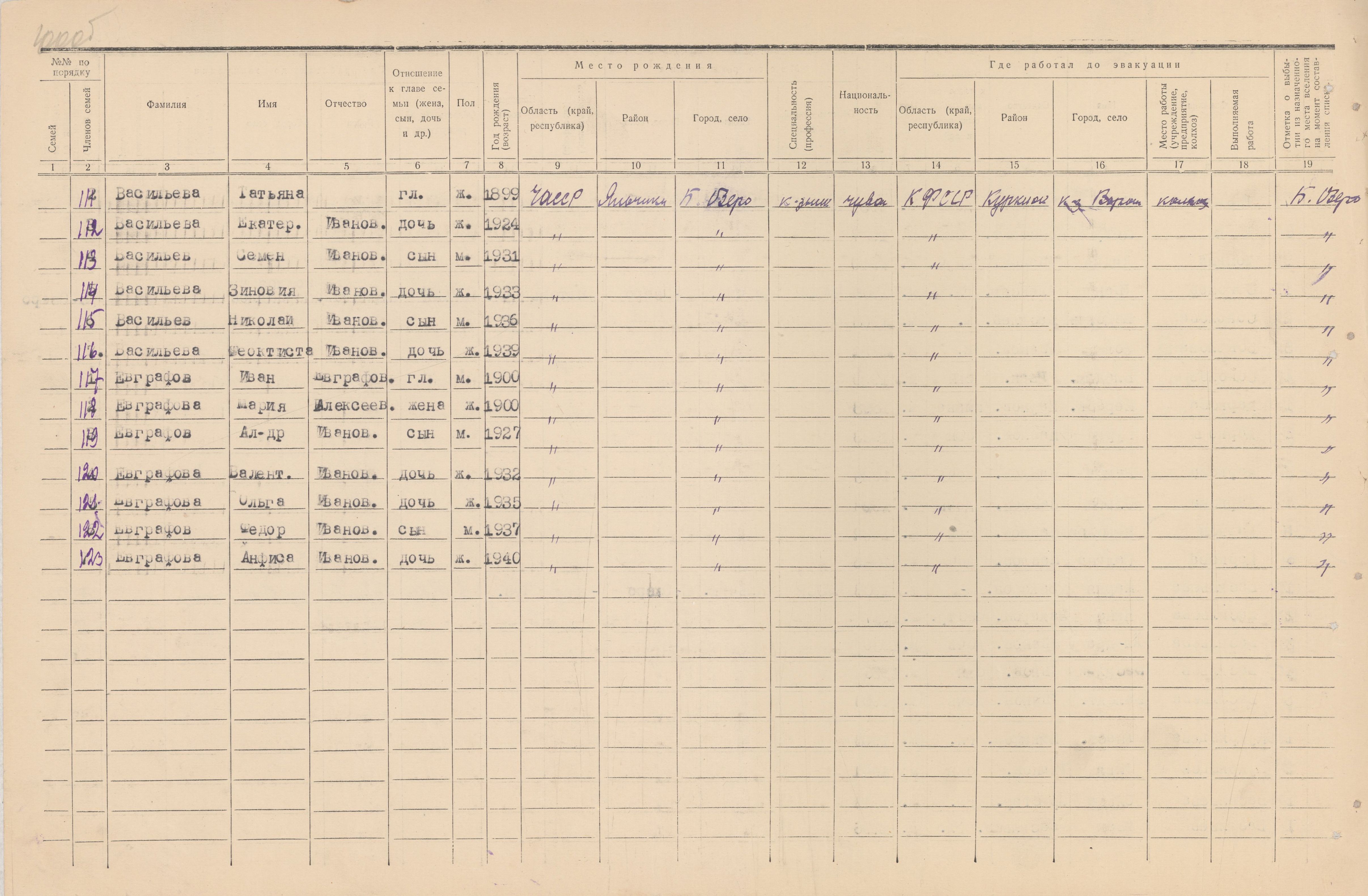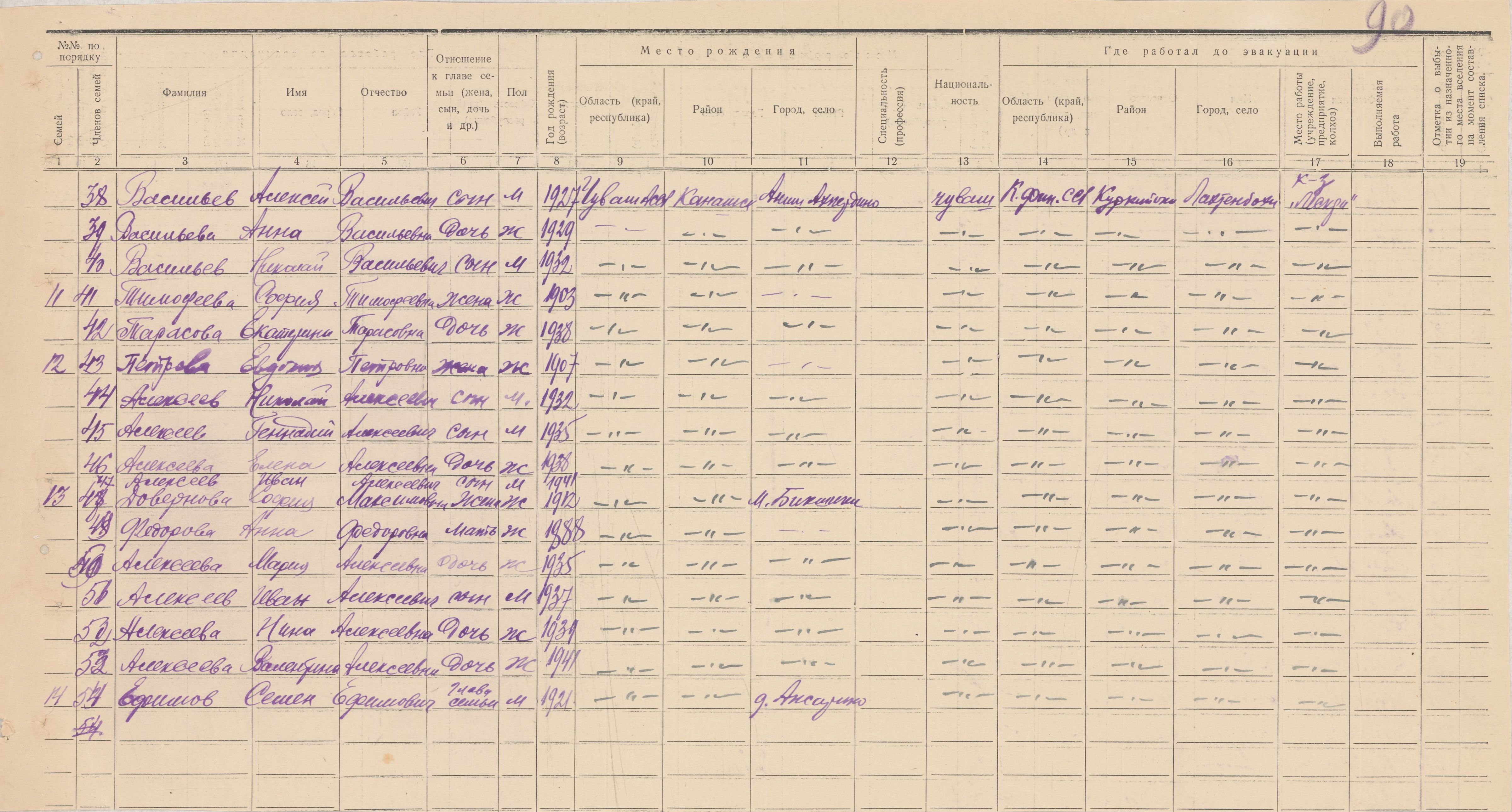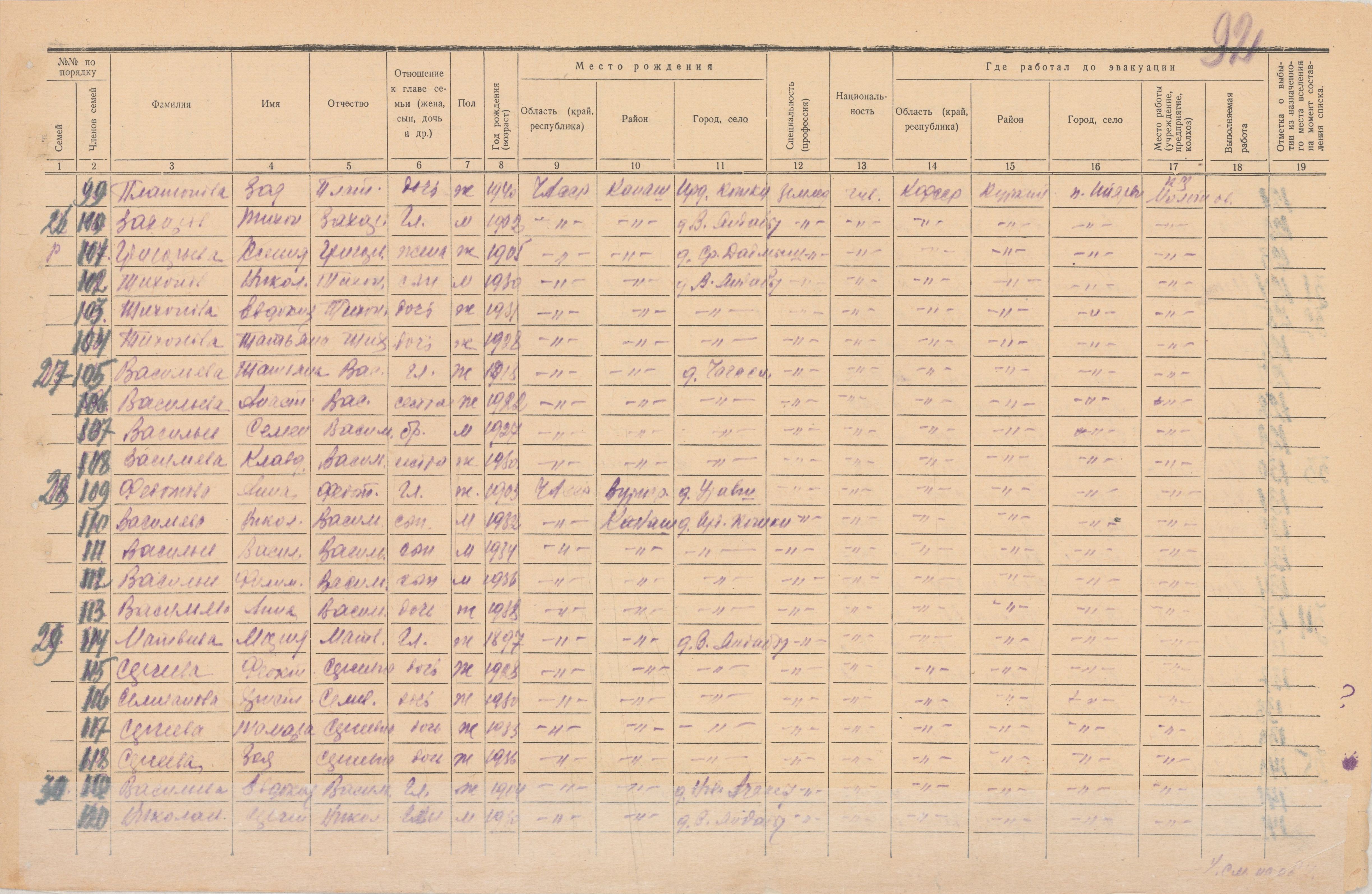 Список эвакуированных граждан в Ядринский район Чувашской АССР из Карело-Финской ССР.
