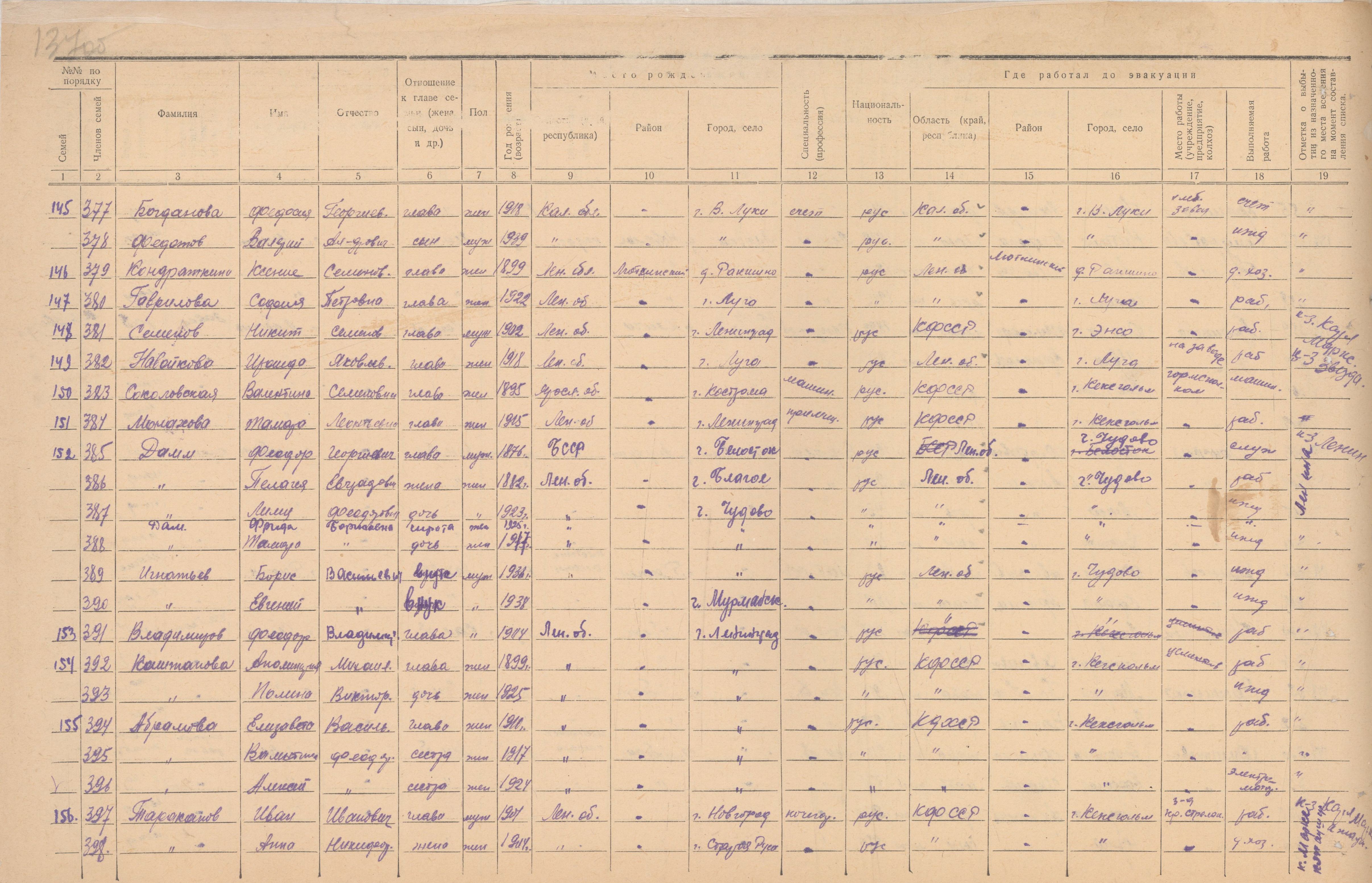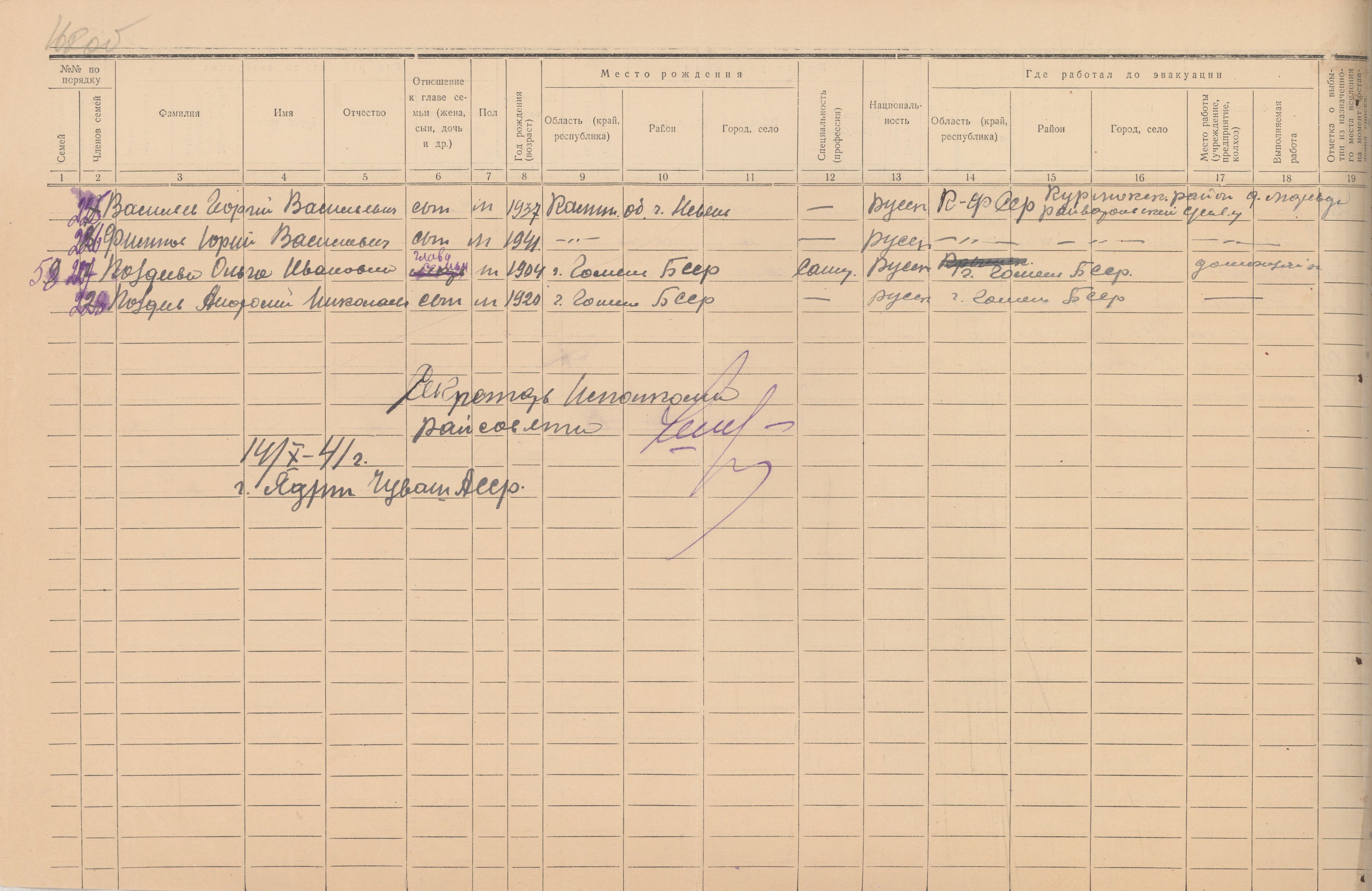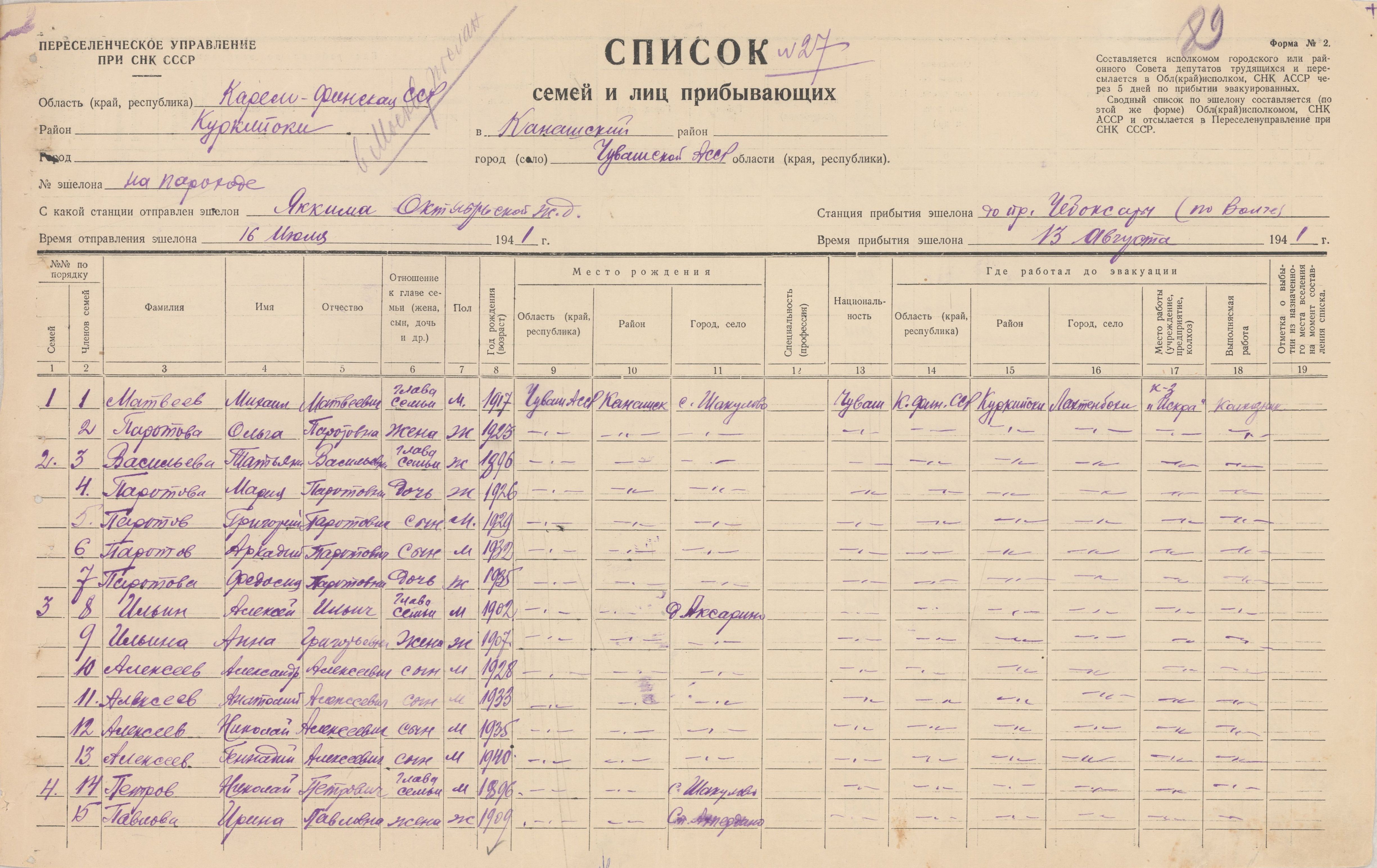 Список эвакуированных граждан, прибывших в Канашский район Чувашской АССР из Карело-Финской Республики.