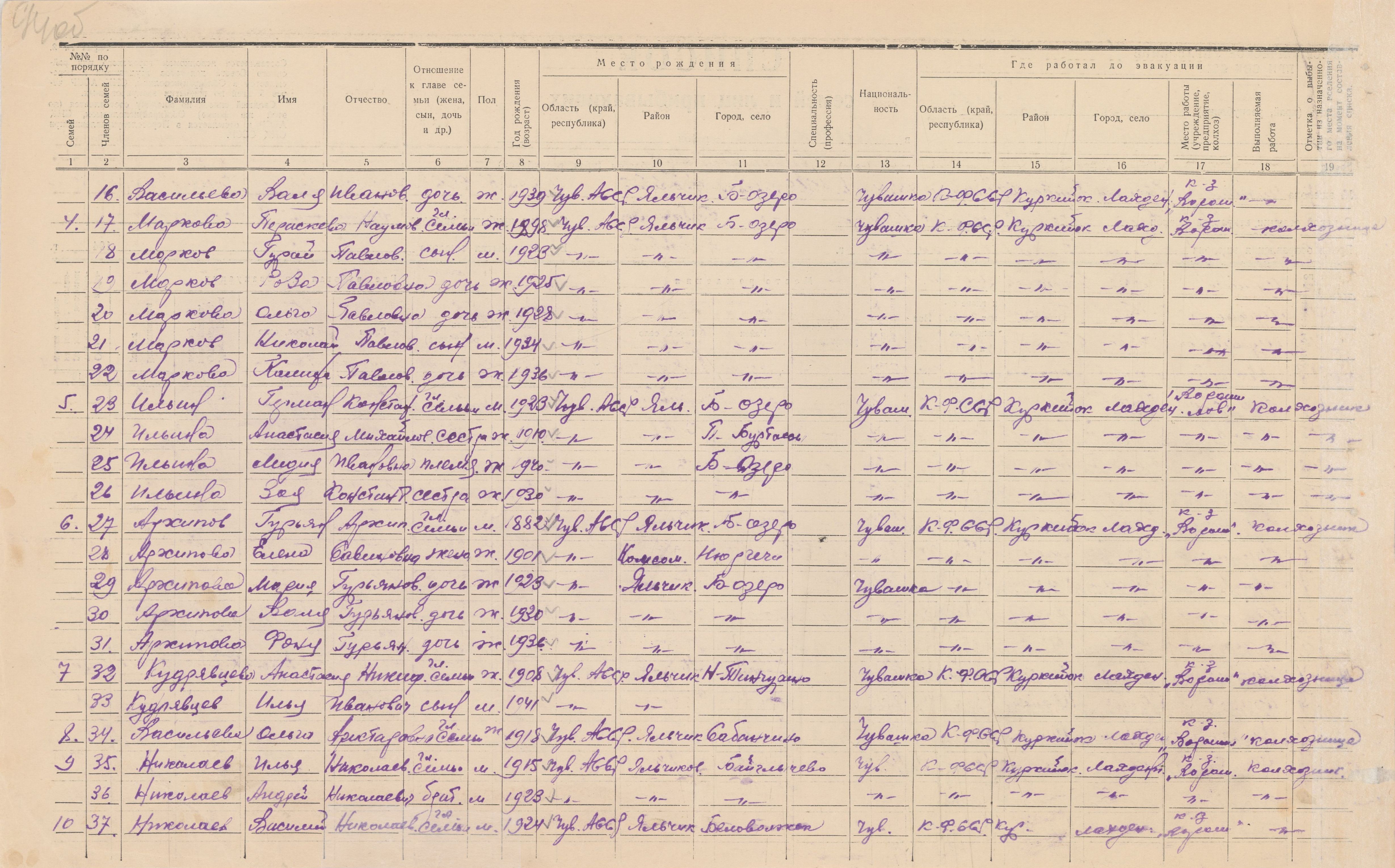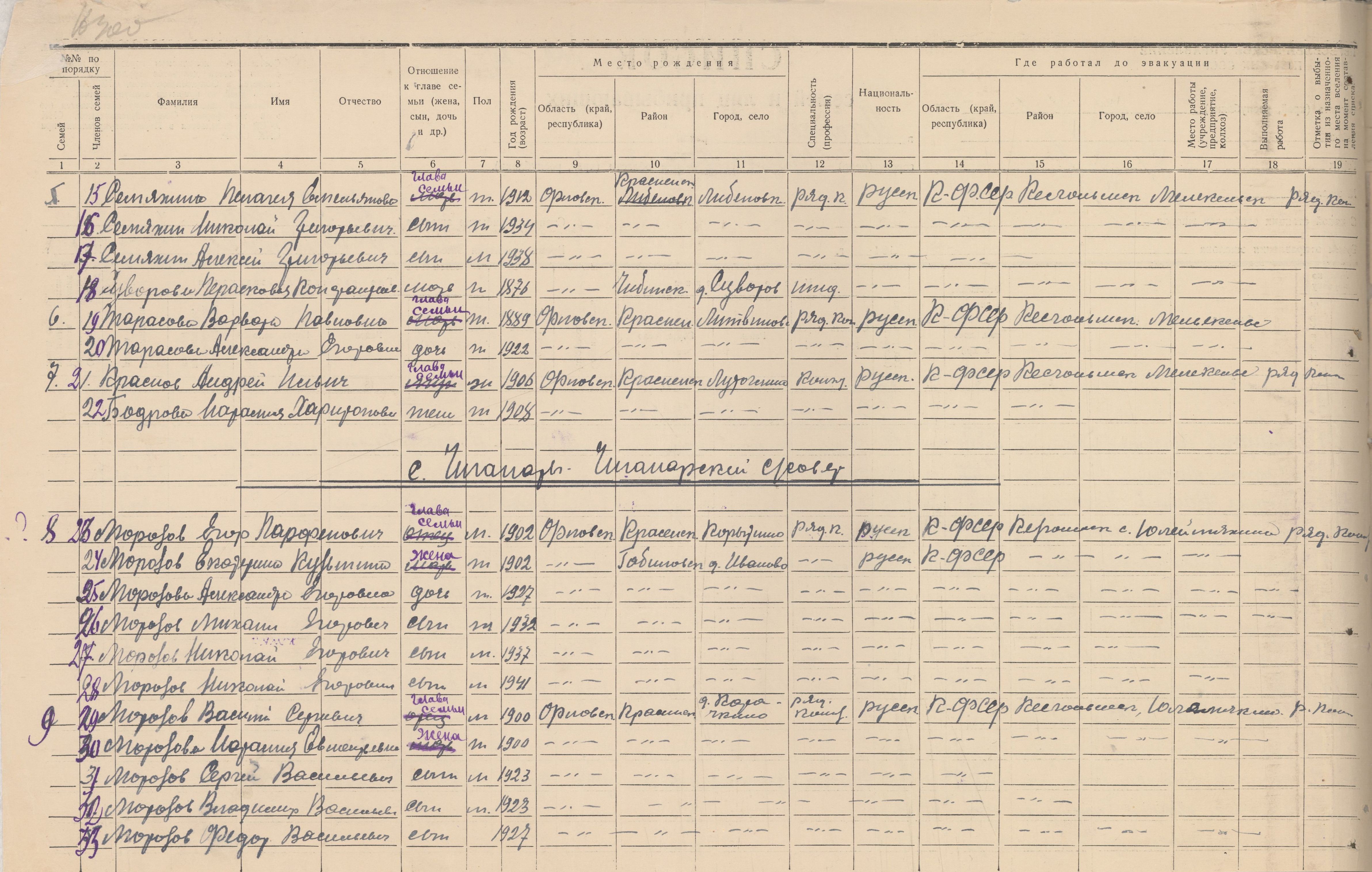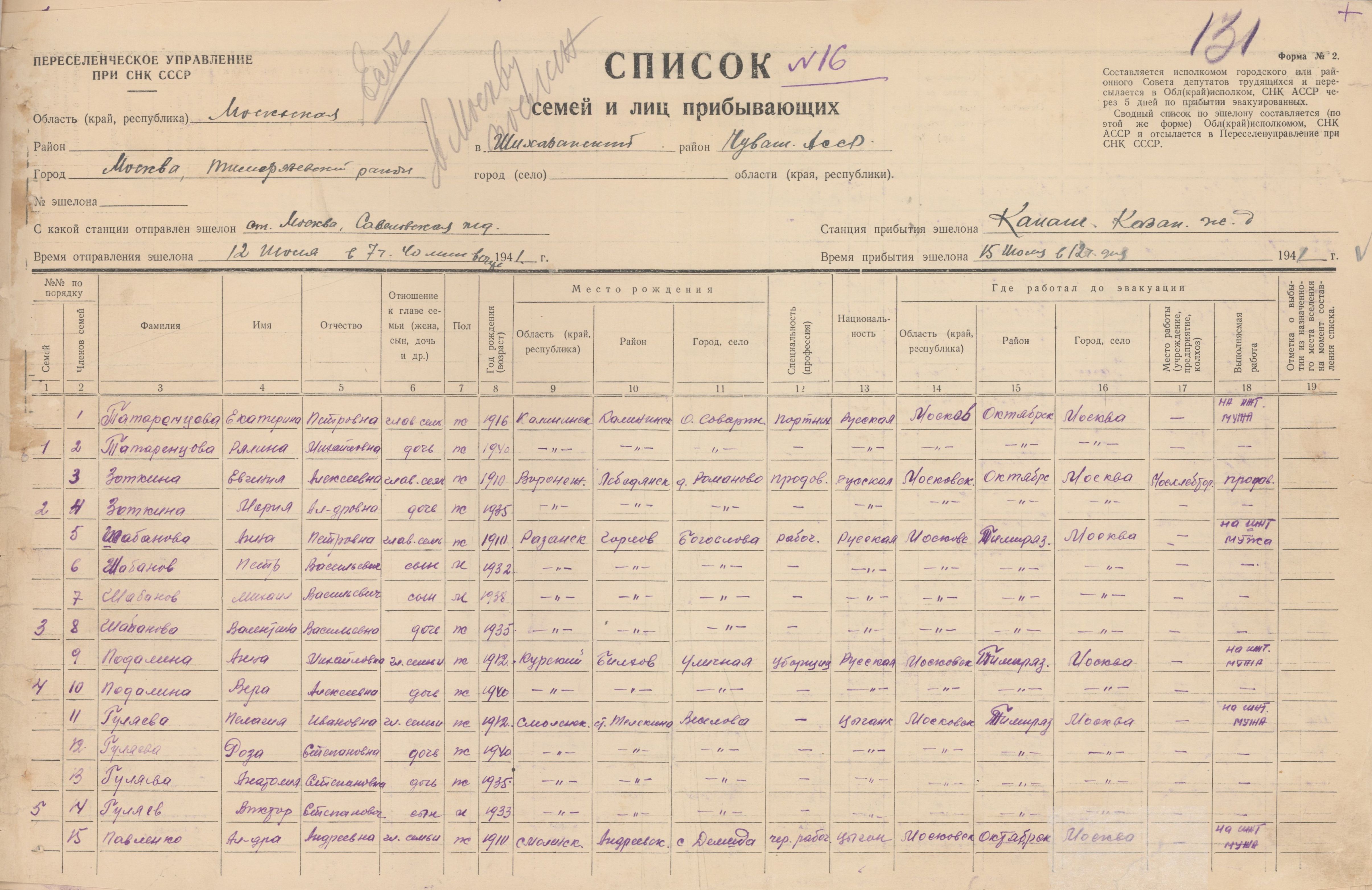 Список эвакуированных граждан, прибывших в Шихазанский район Чувашской АССР из Москвы.