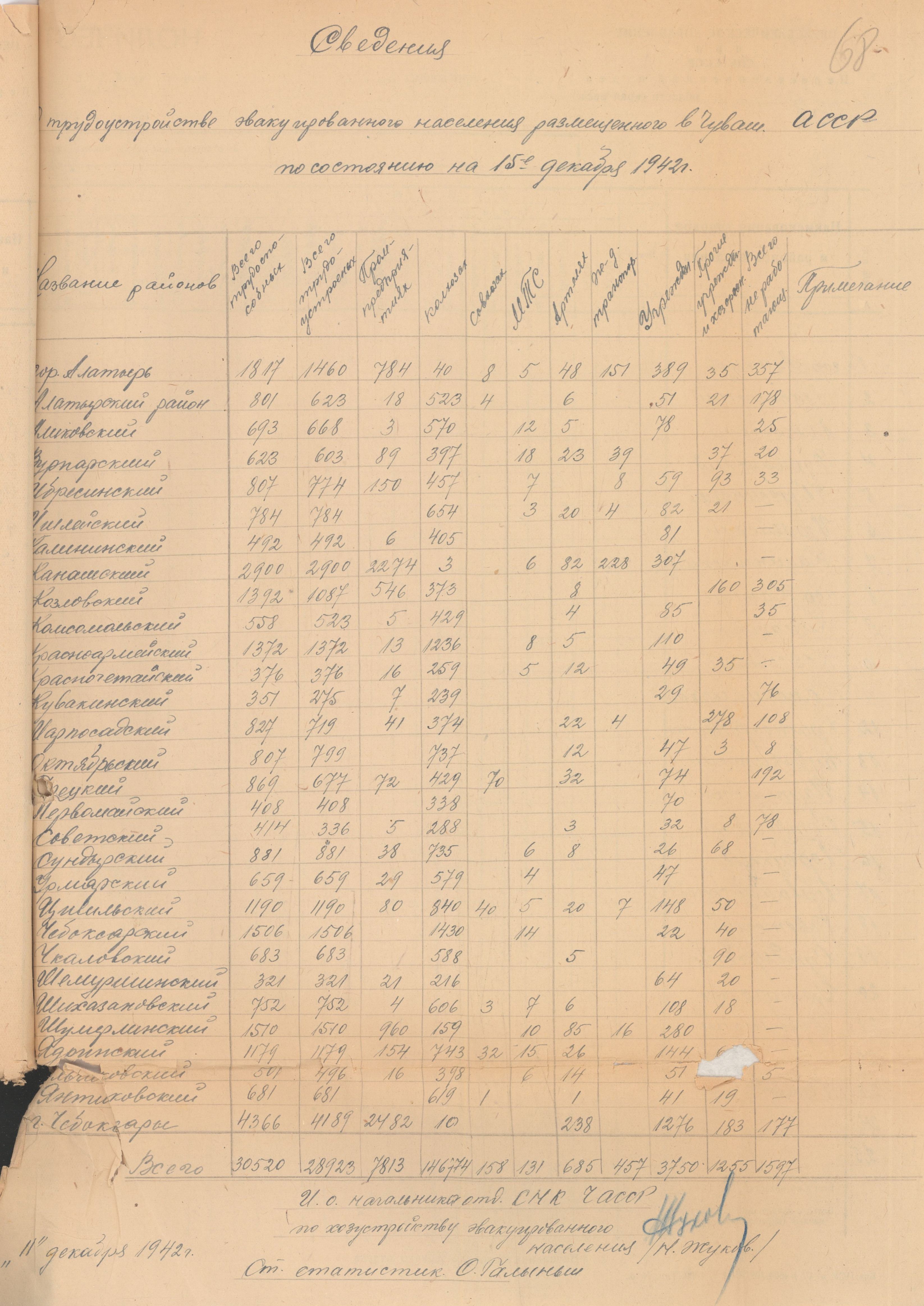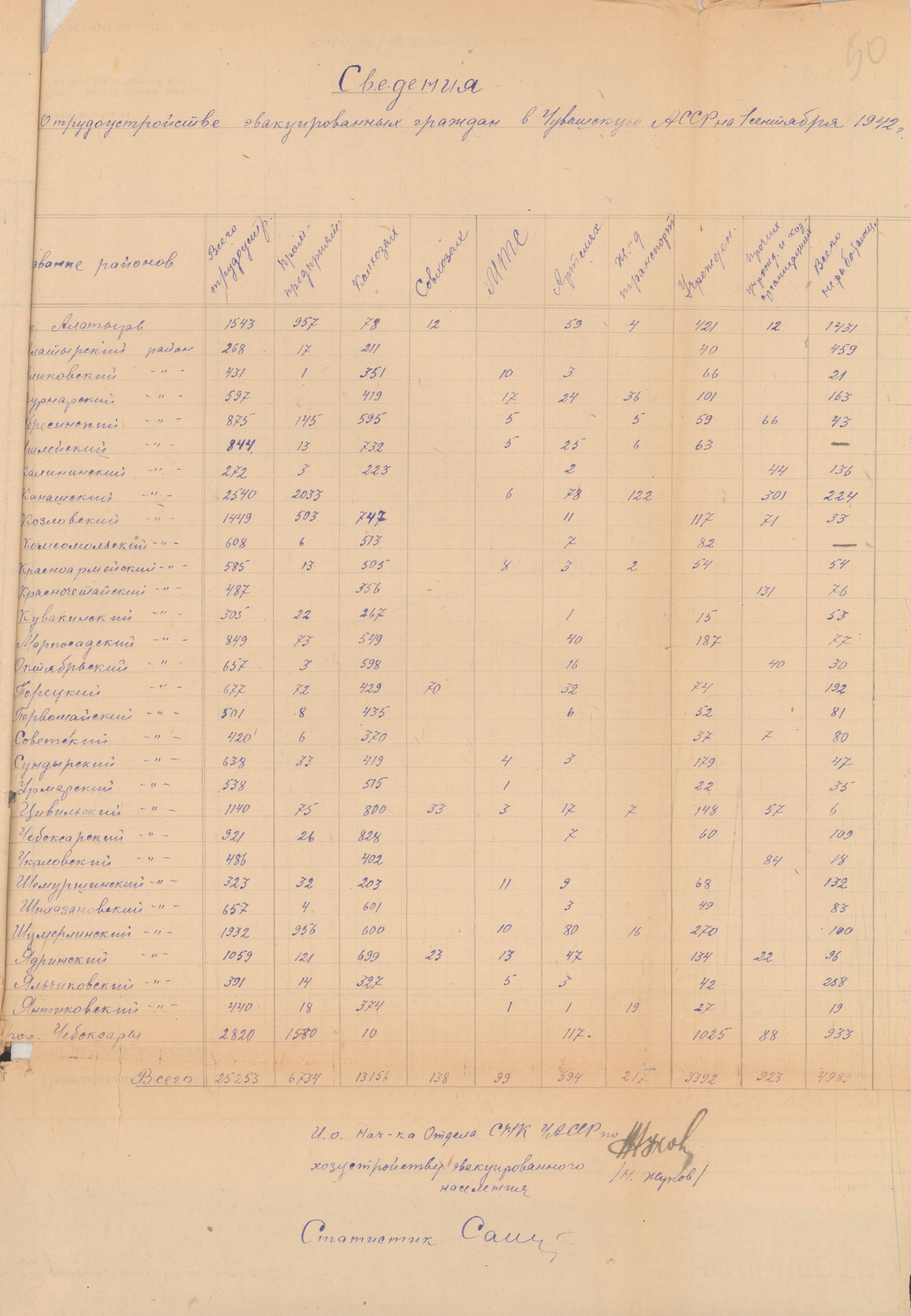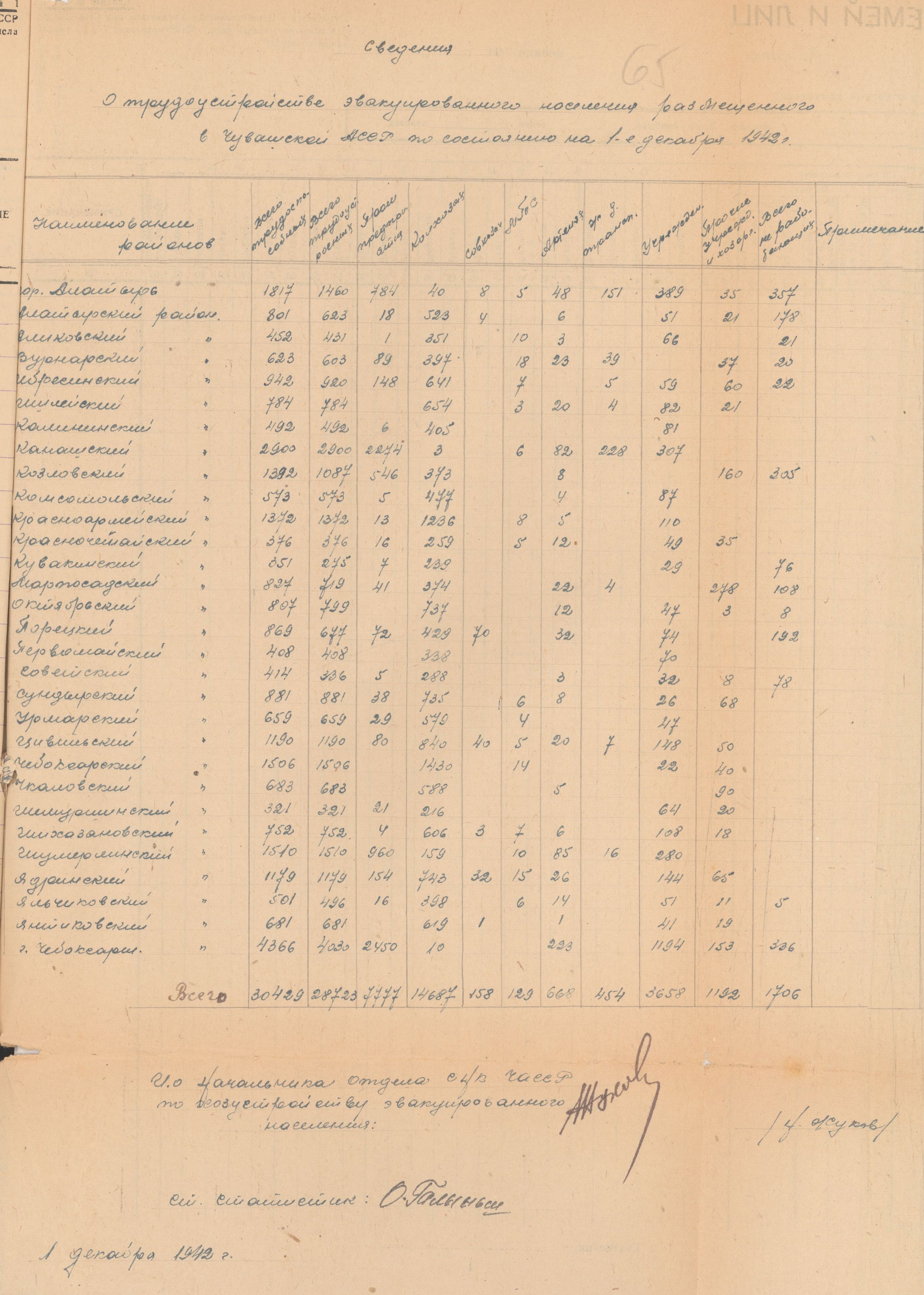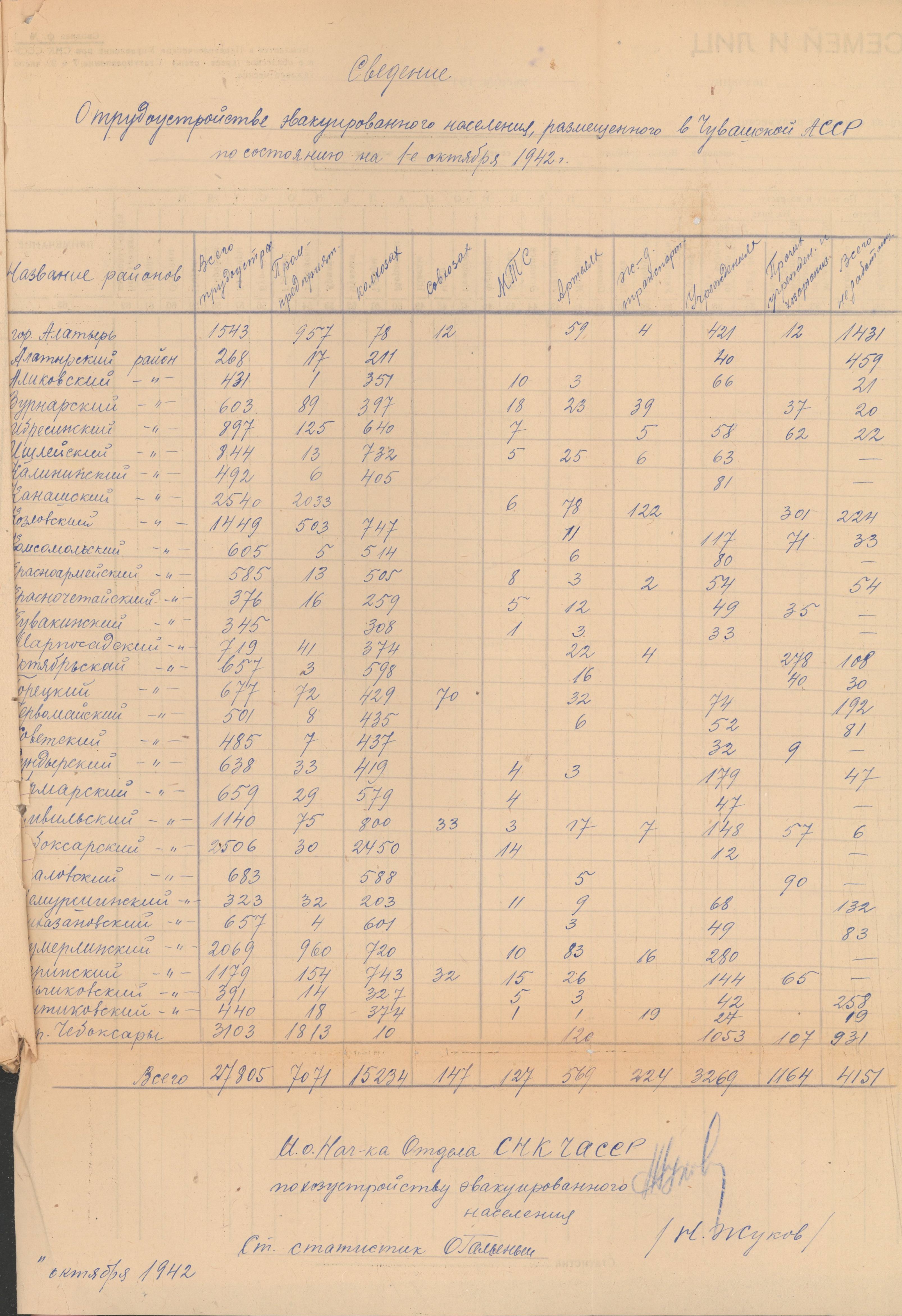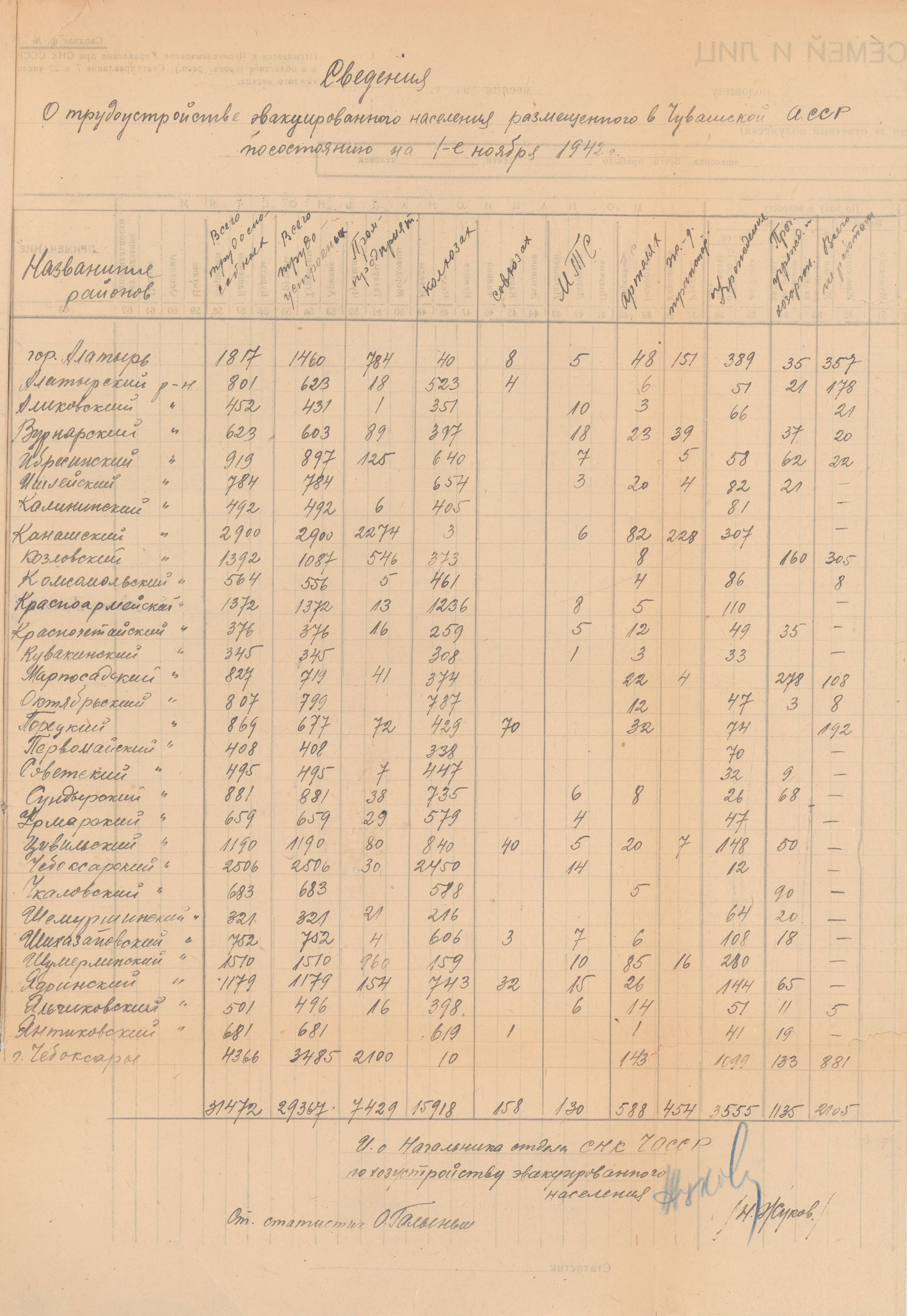 Сведения о трудоустройстве населения эвакуированного в Чувашскую АССР