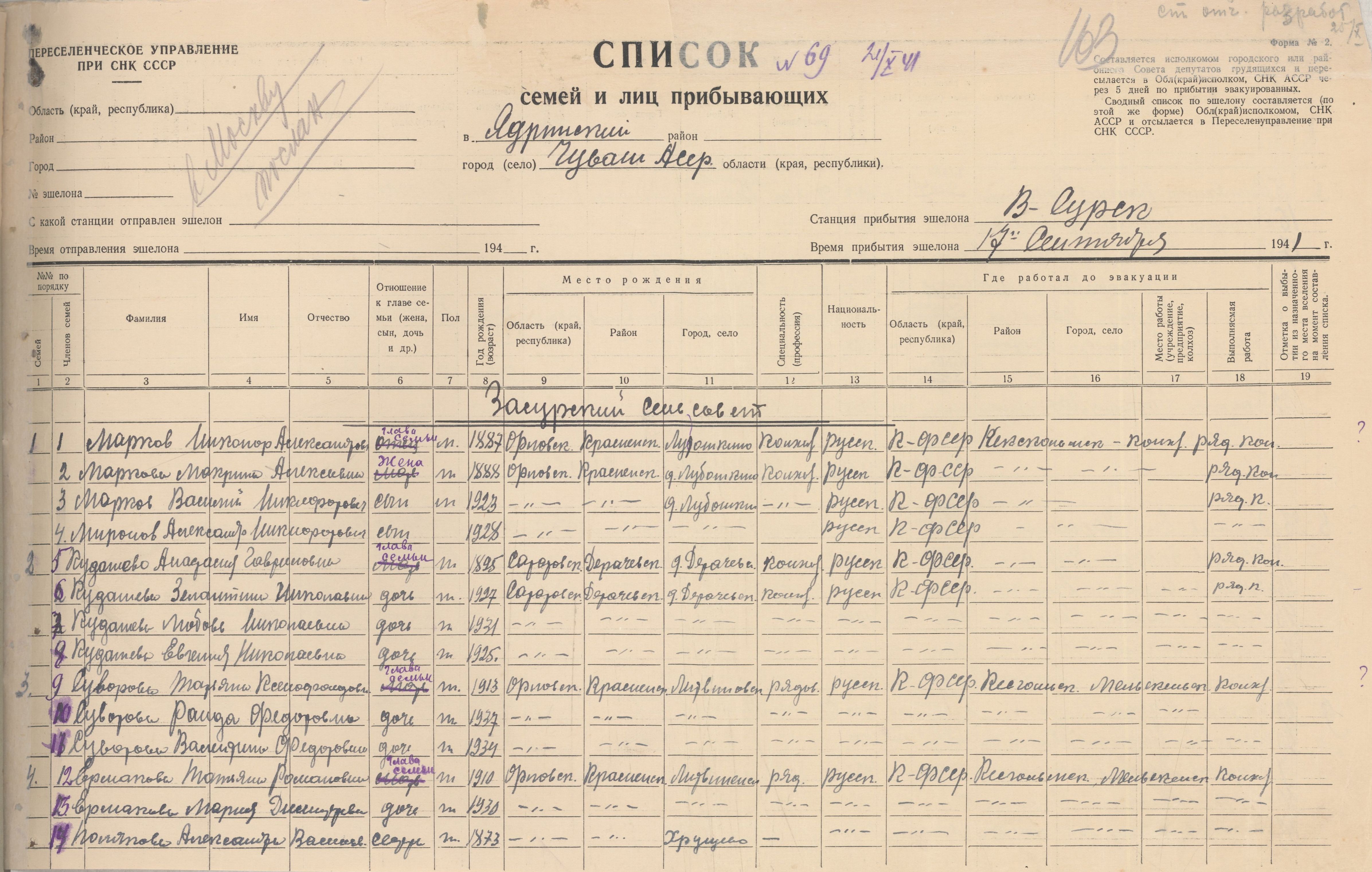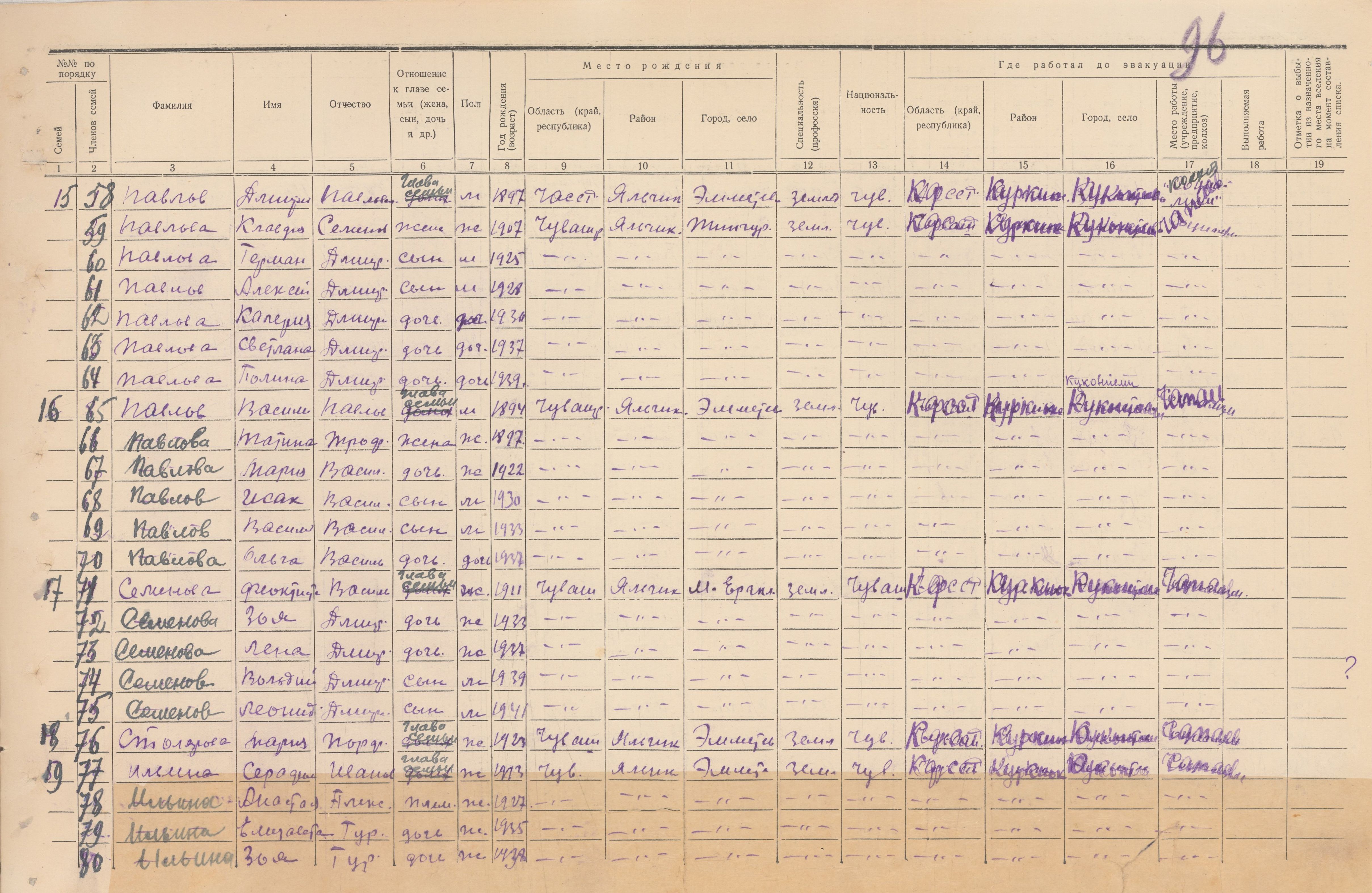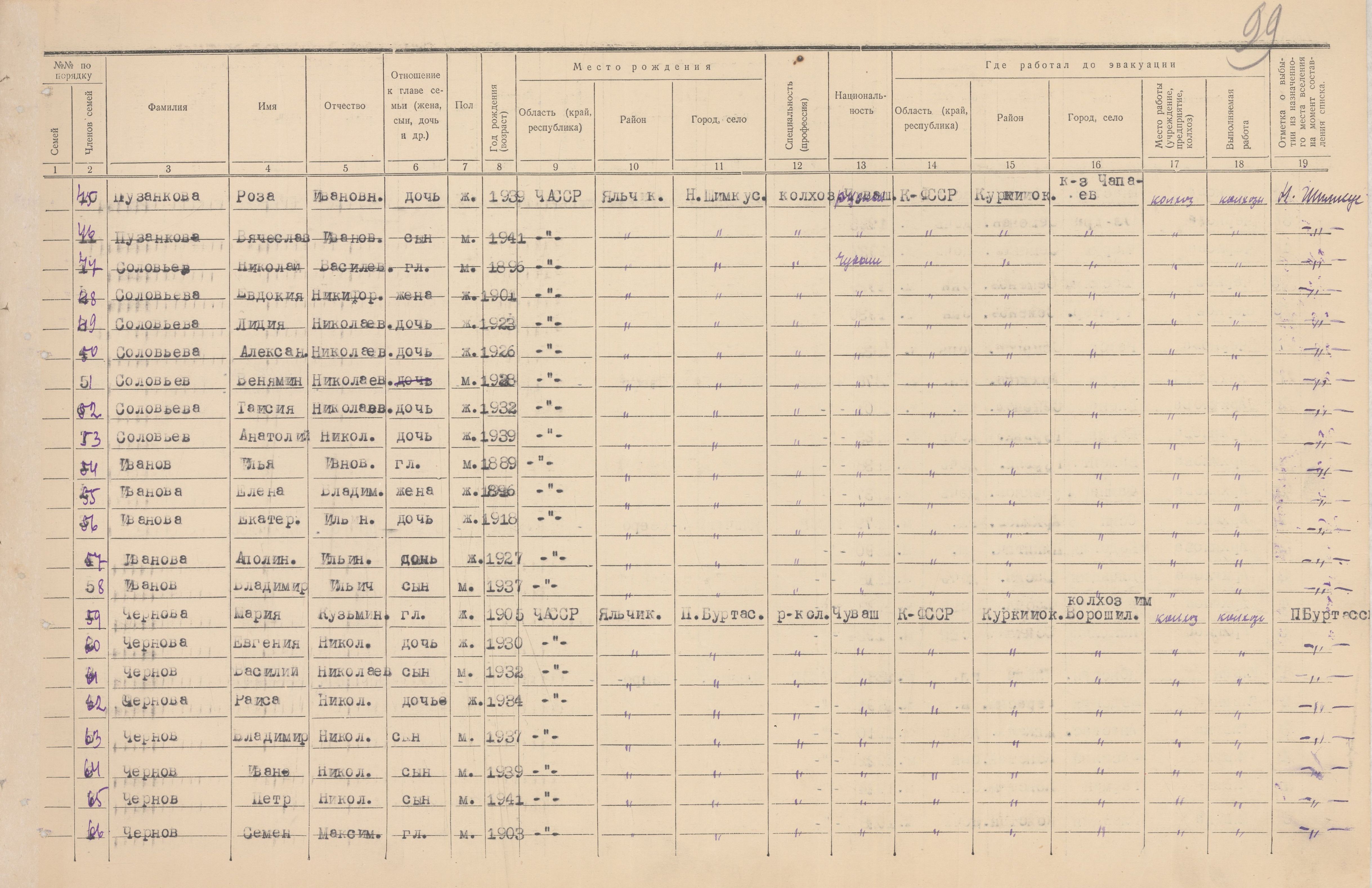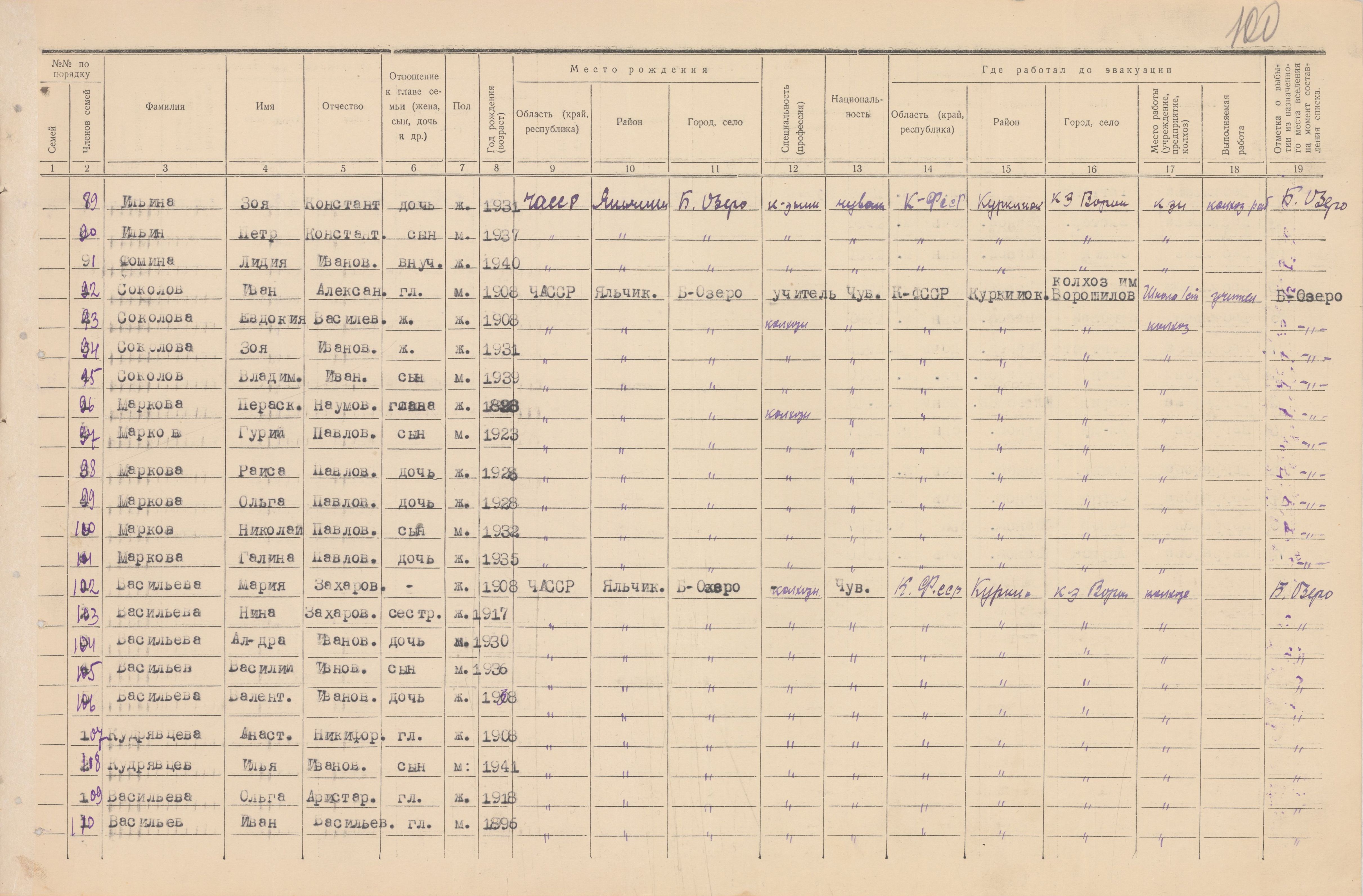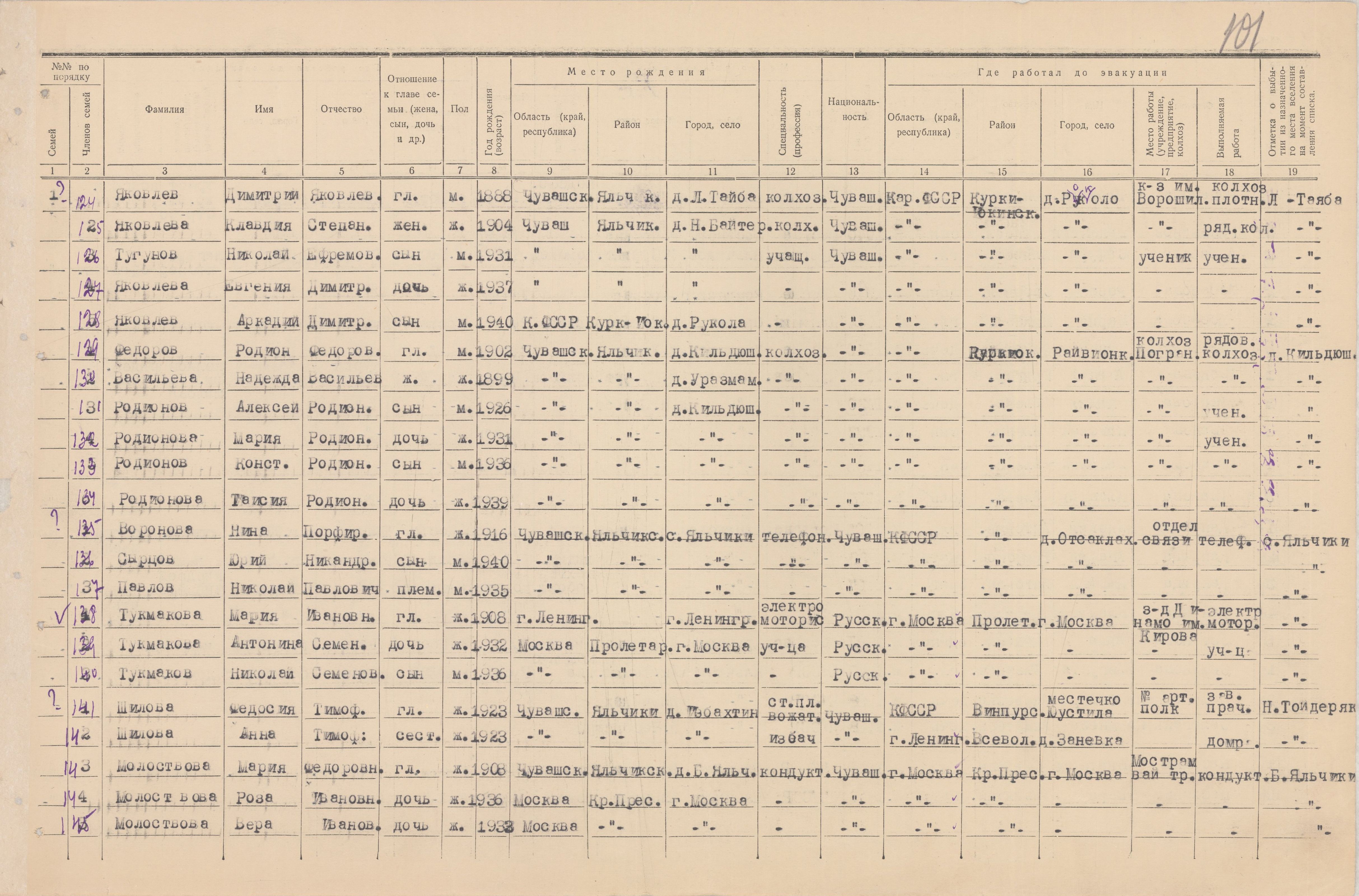 Список эвакуированных граждан, прибывших в Козловский район Чувашской АССР из Карело-Финской ССР на пароходе «Чайковский».