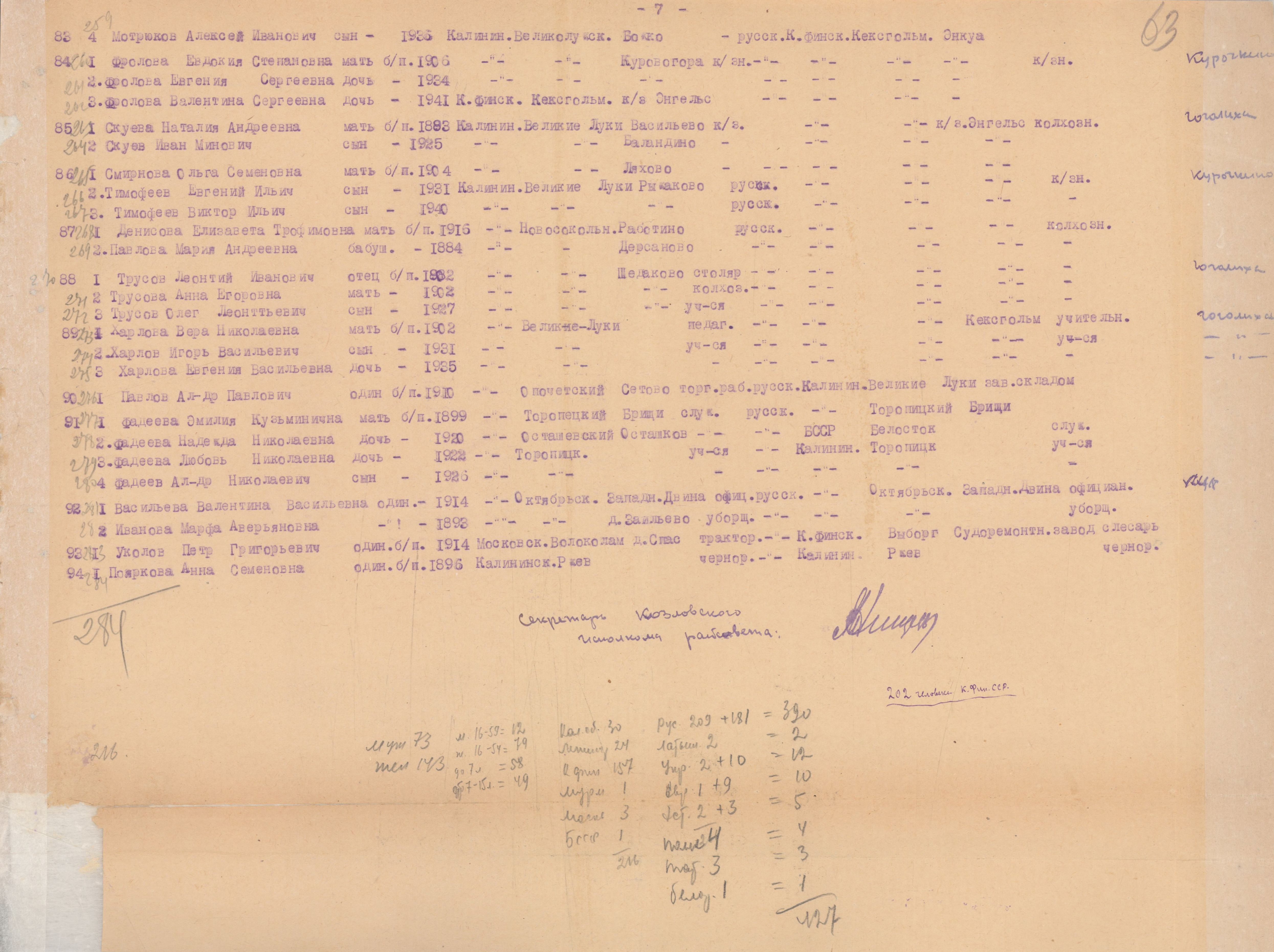 Список №64 эвакуированных граждан, прибывших произвольно в Козловский район Чувашской АССР из Карело-Финской ССР.