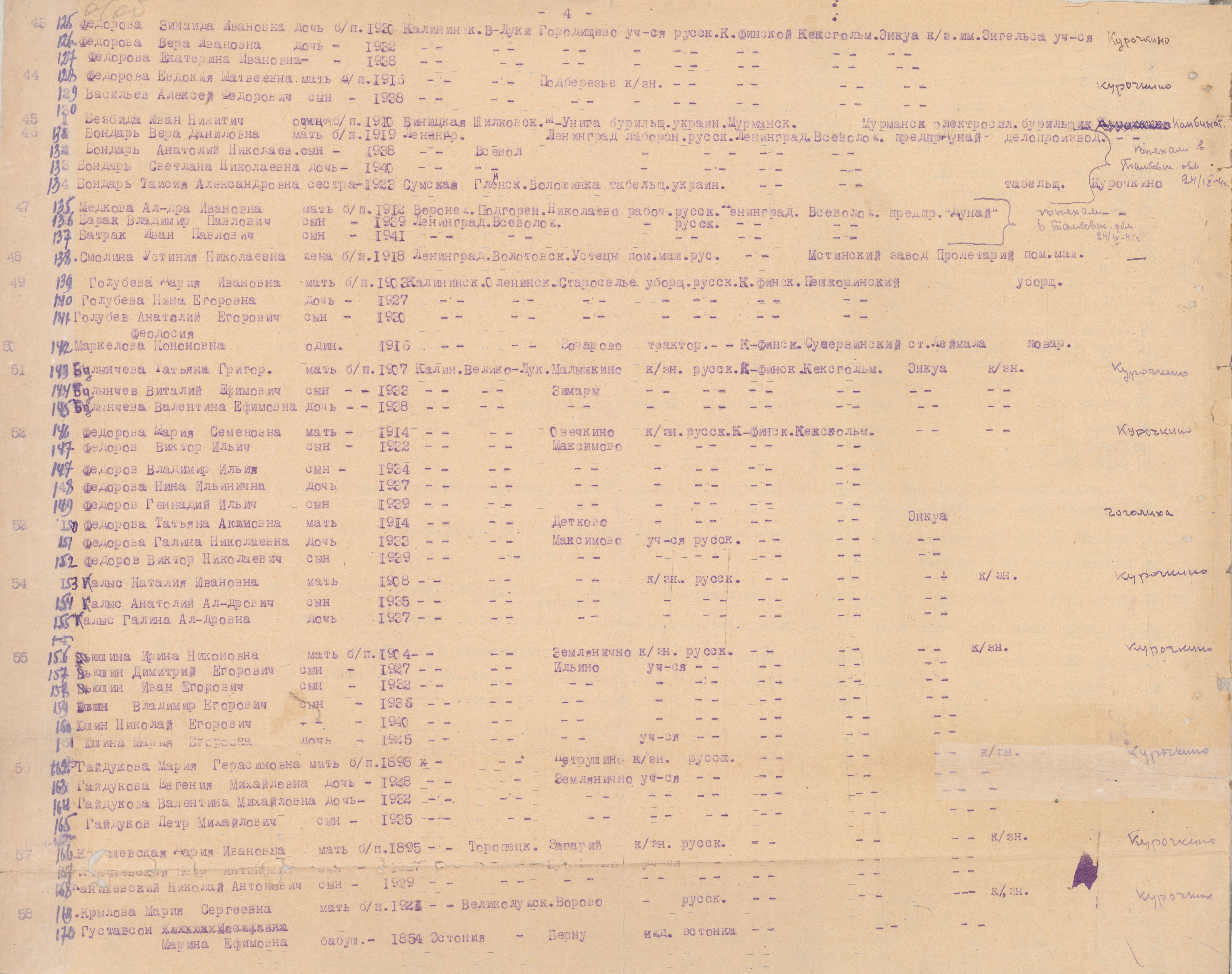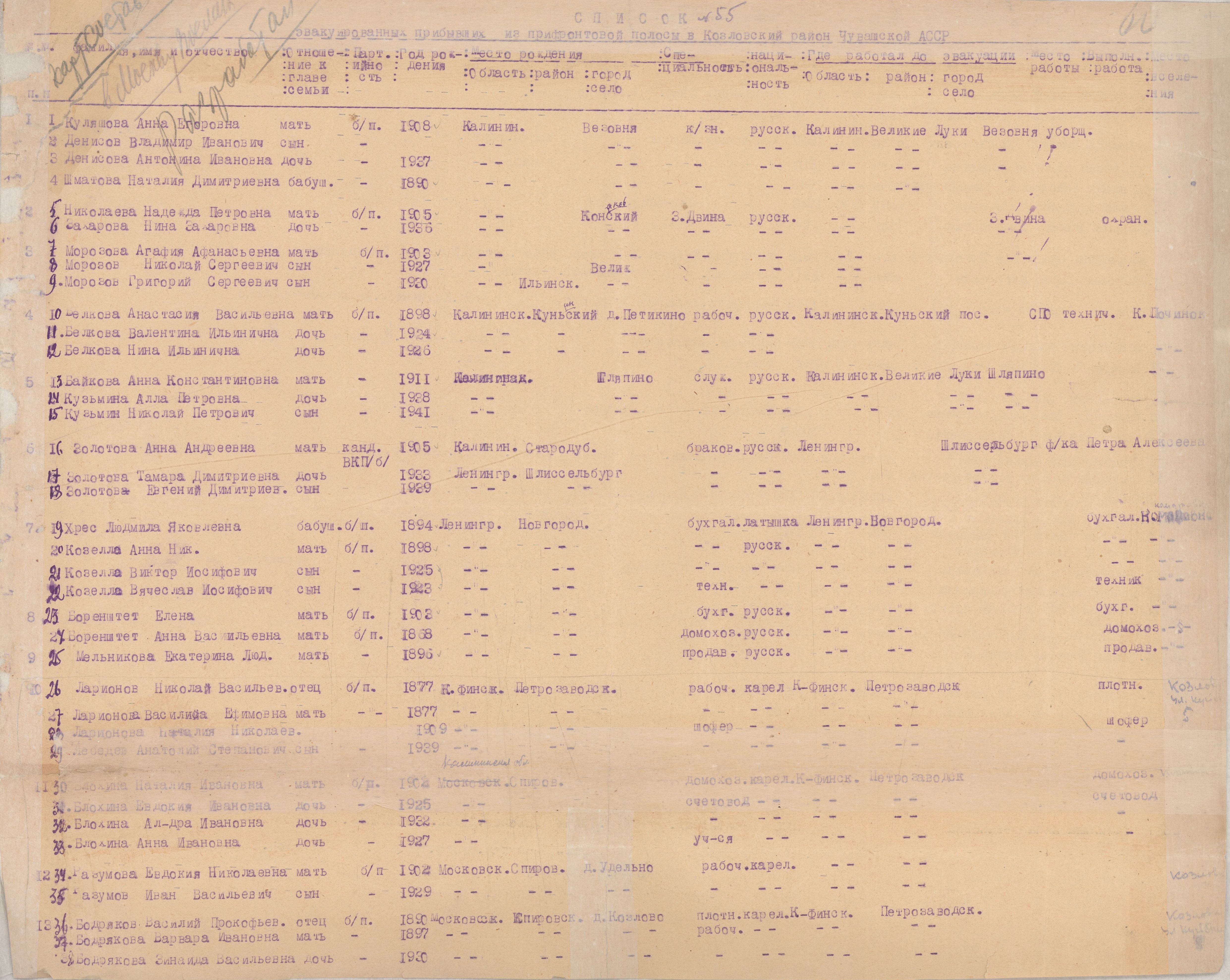 Список № 55 эвакуированных граждан, прибывших в Козловский район Чувашской АССР из Карело-Финской ССР.