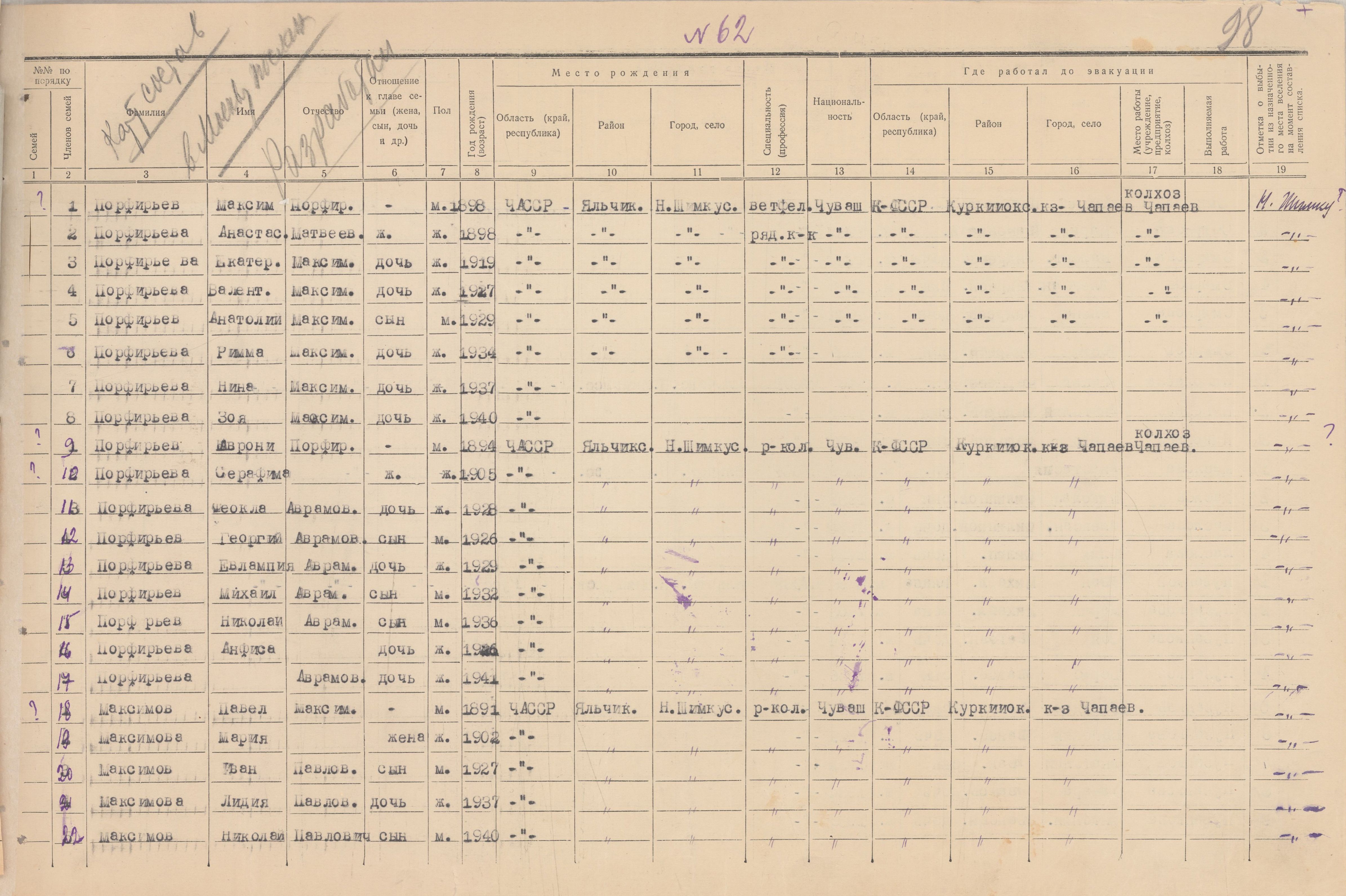 Список №62 эвакуированных граждан, уроженцев Яльчикского района Чувашской АССР, из Карело-Финской Республики.