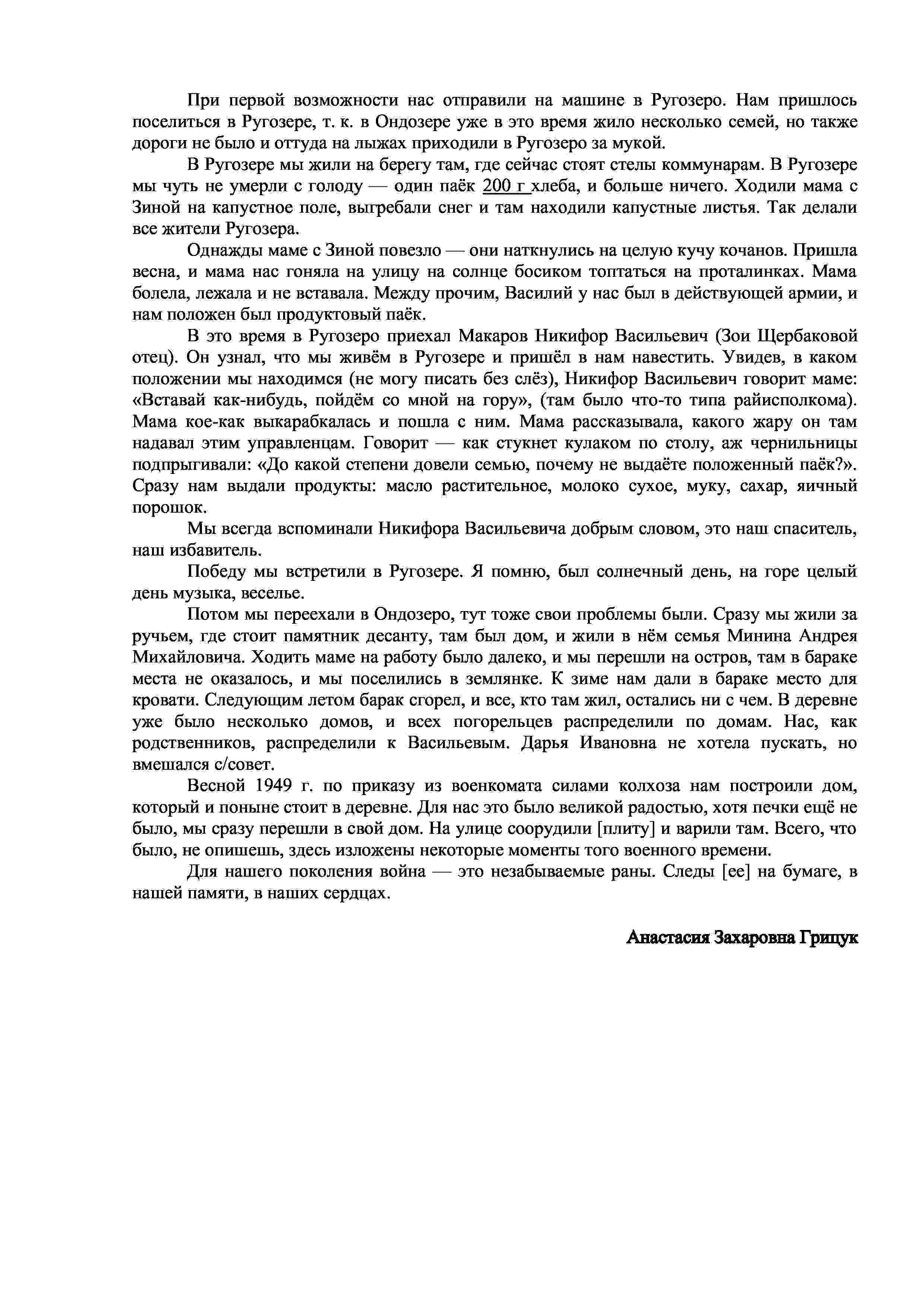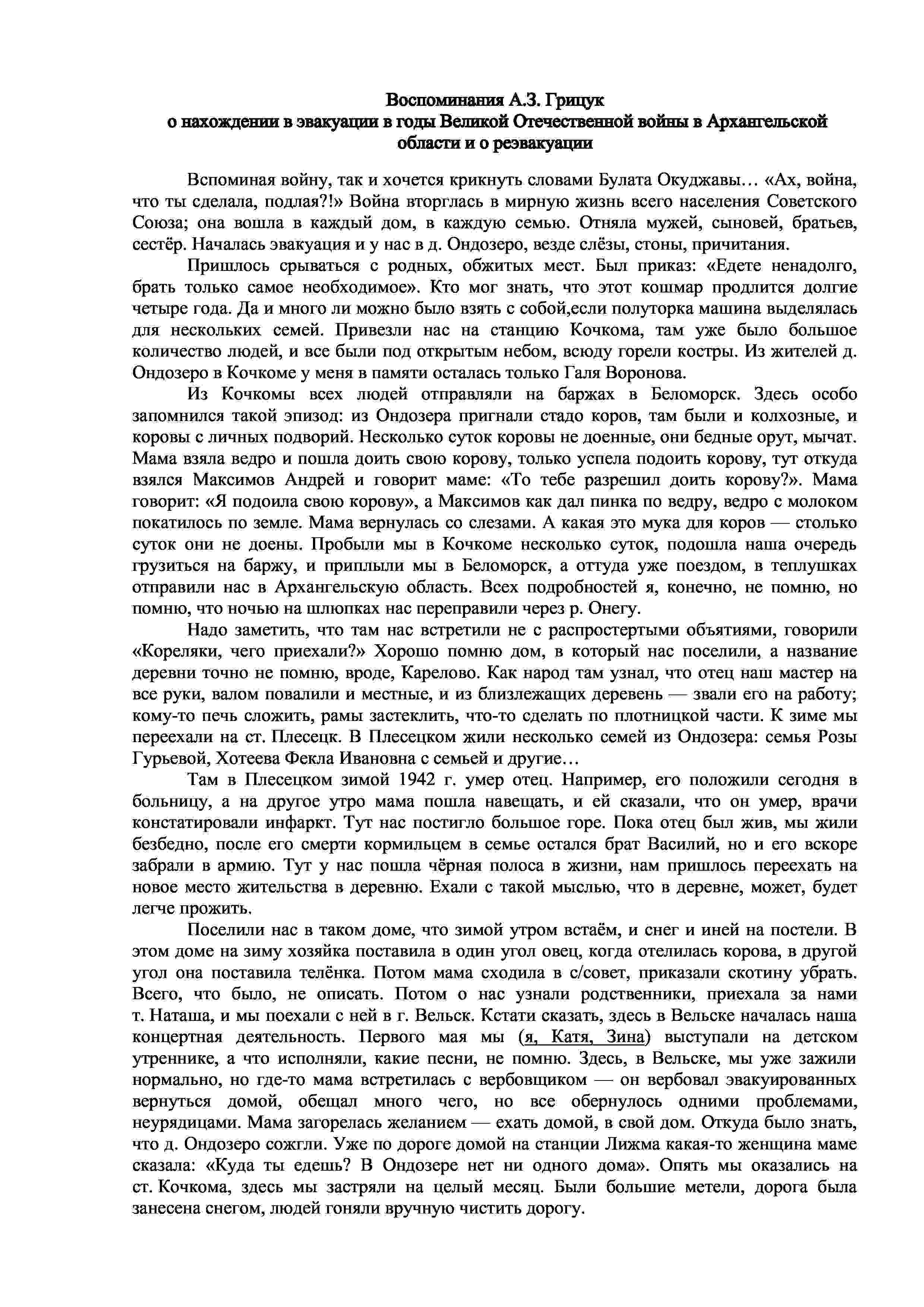 В 1941 г. были эвакуированы в Архангельскую область. Победу встретили в с. Ругозеро, куда переехали в конце войны. Позднее вернулись в д. Ондозеро.