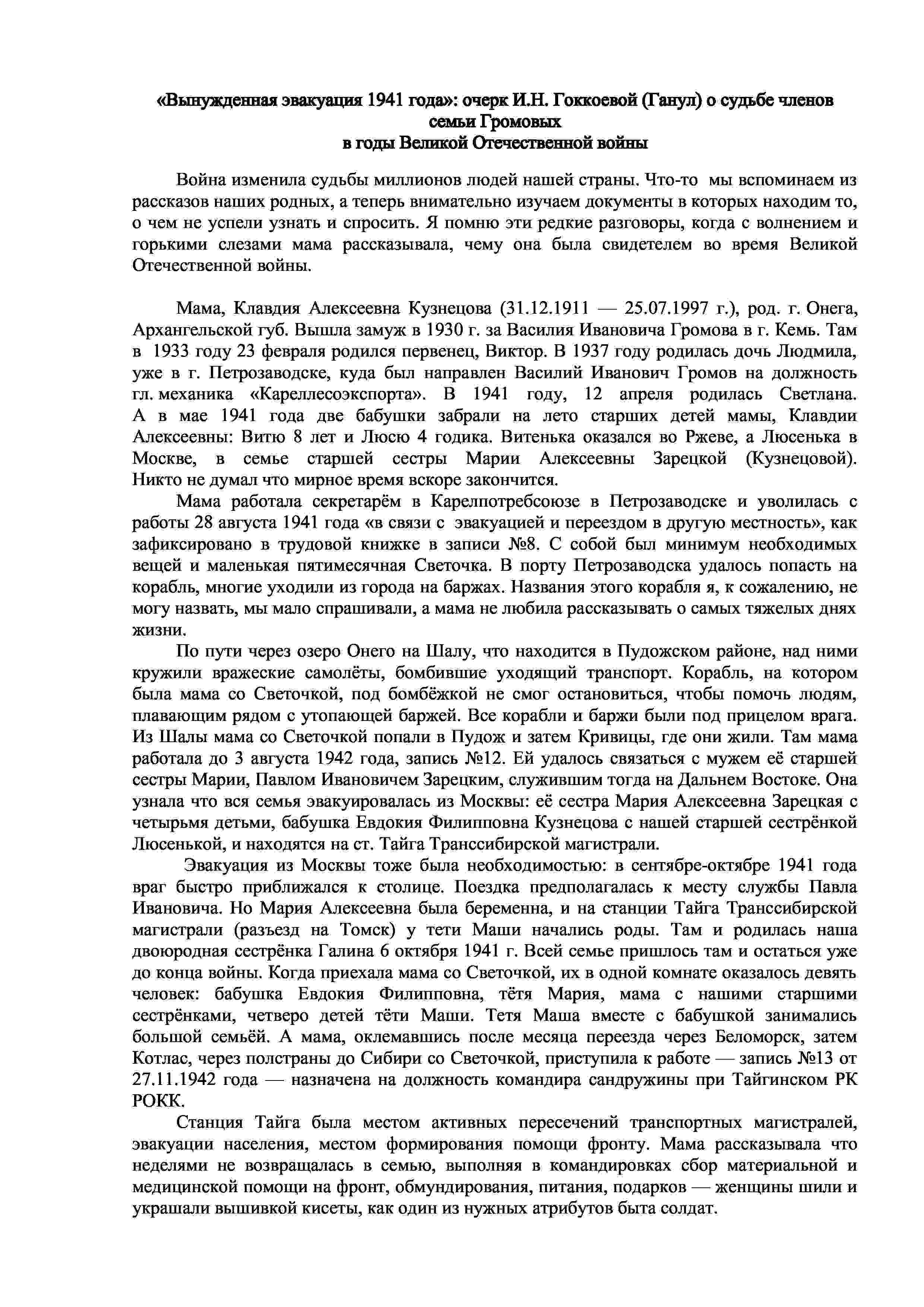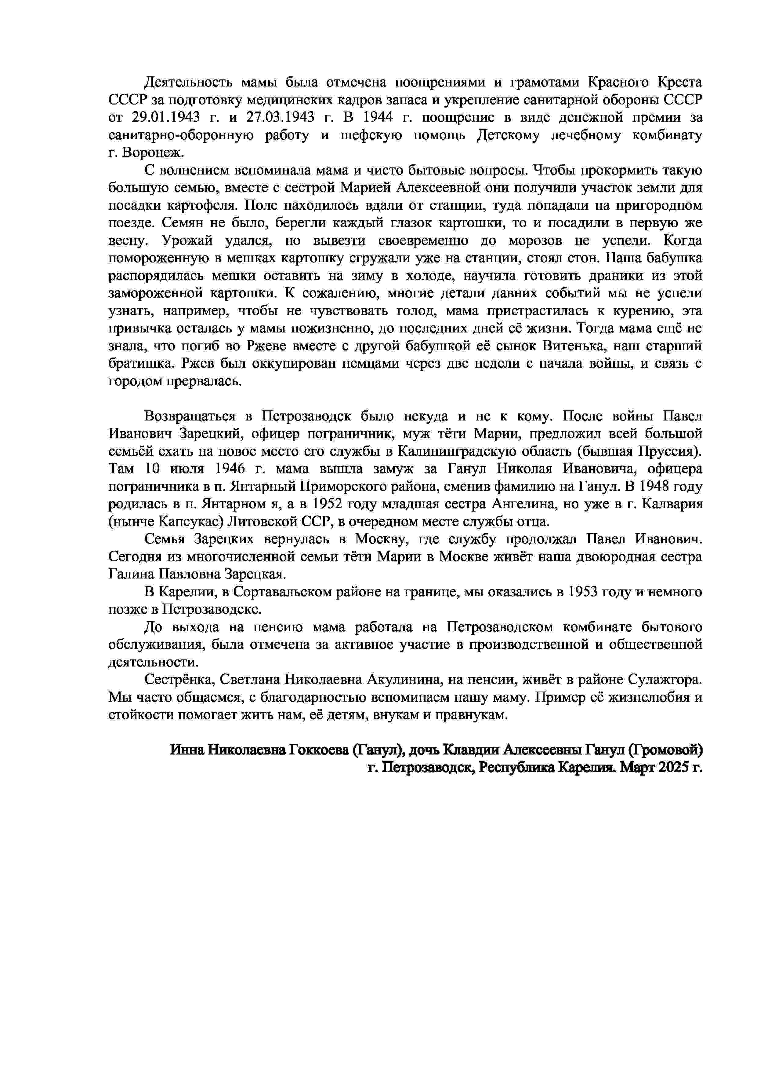 Материалы переданы Инной Николаевной Гоккоевой (Ганул) (г. Петрозаводск, Республика Карелия), дочерью Клавдии Алексеевны Ганул (Громовой).