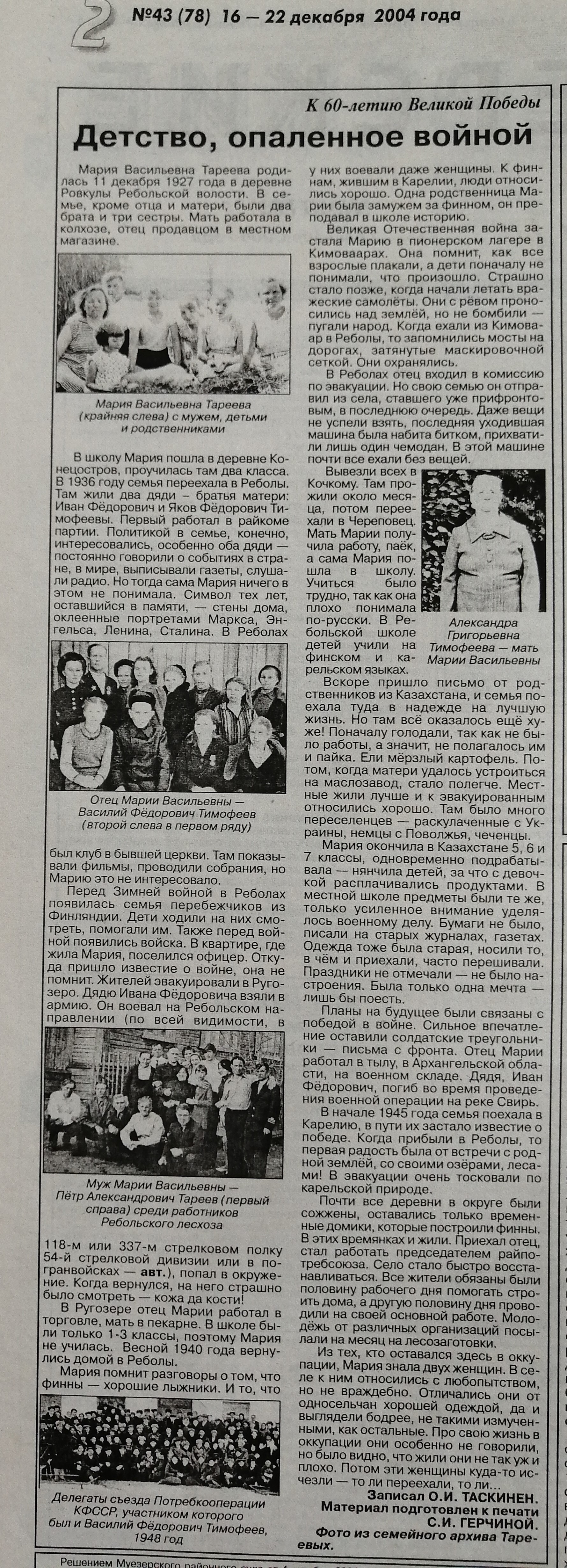 Накануне Великой Отечественной войны семьи Гундаревых, Моисеевых, Е.В. Моккиевой, Риккиевых, Силиных, Тимофеевых проживали в Ребольском и Ругозерском районах. В 1941 г. семьи были эвакуированы в Архангельскую, Вологодскую, Кировскую, Новосибирскую (ныне — Кемеровскую) области, Чувашскую АССР, Казахскую ССР. Позднее в разное время вернулись в Карелию.