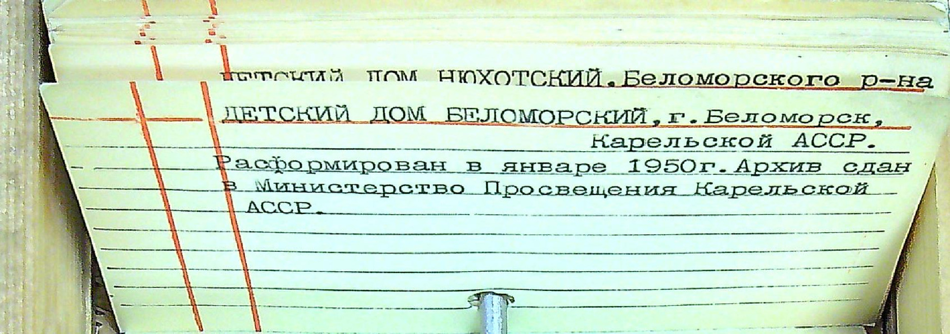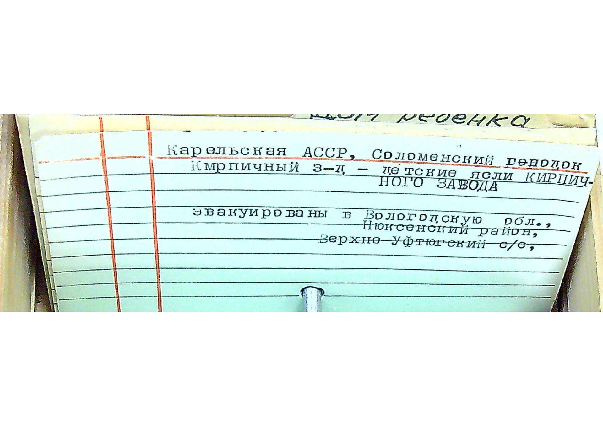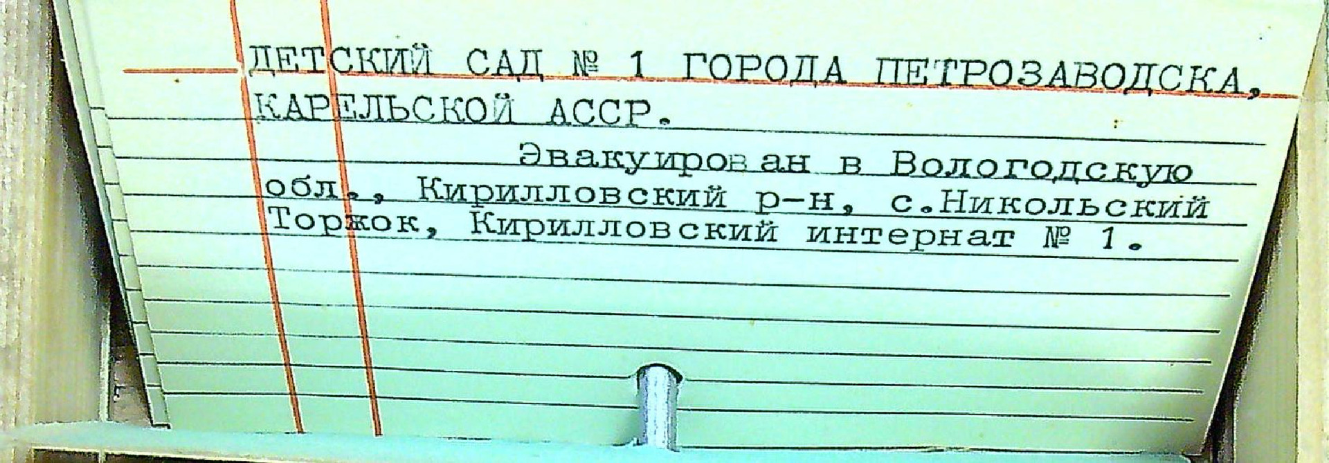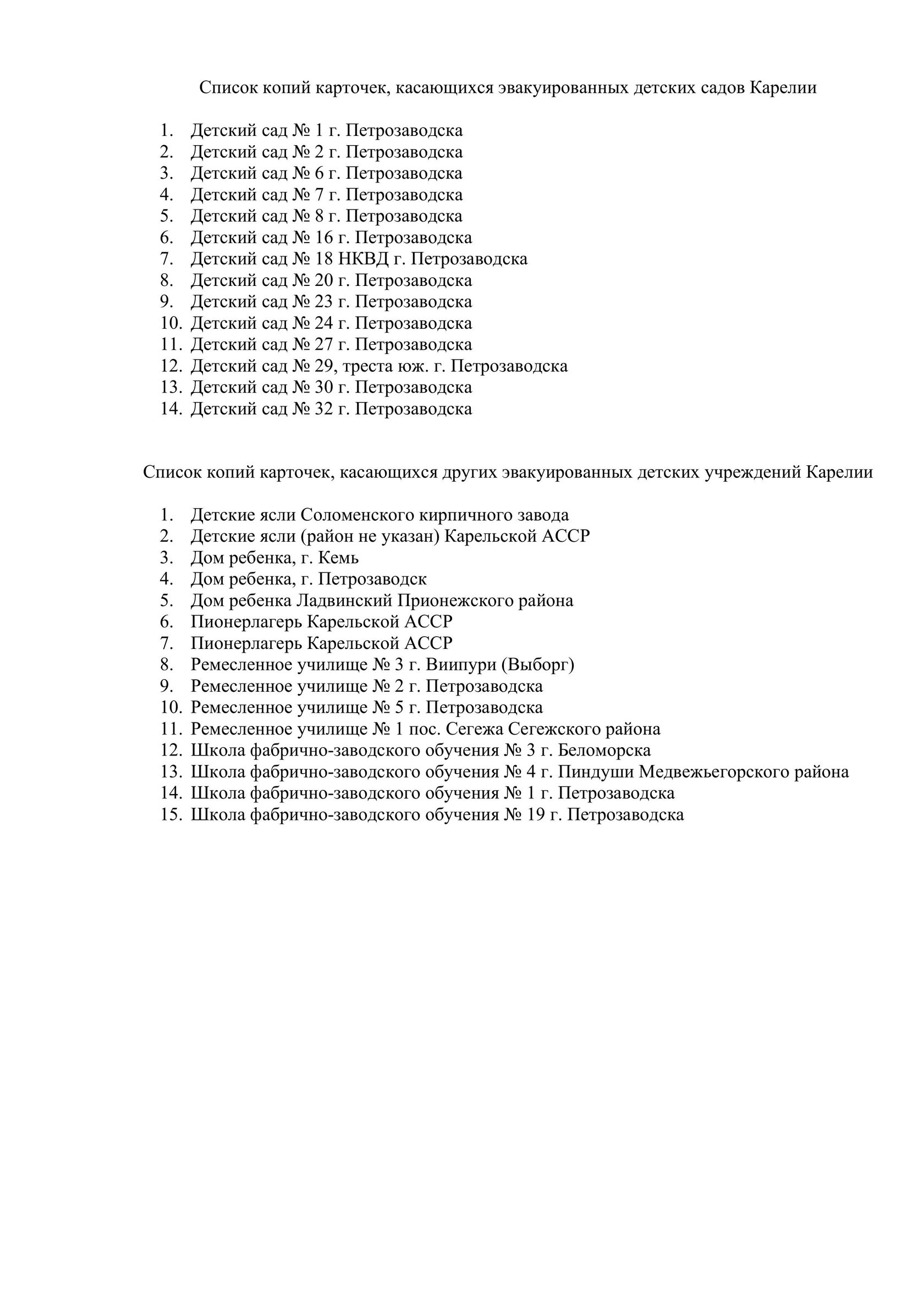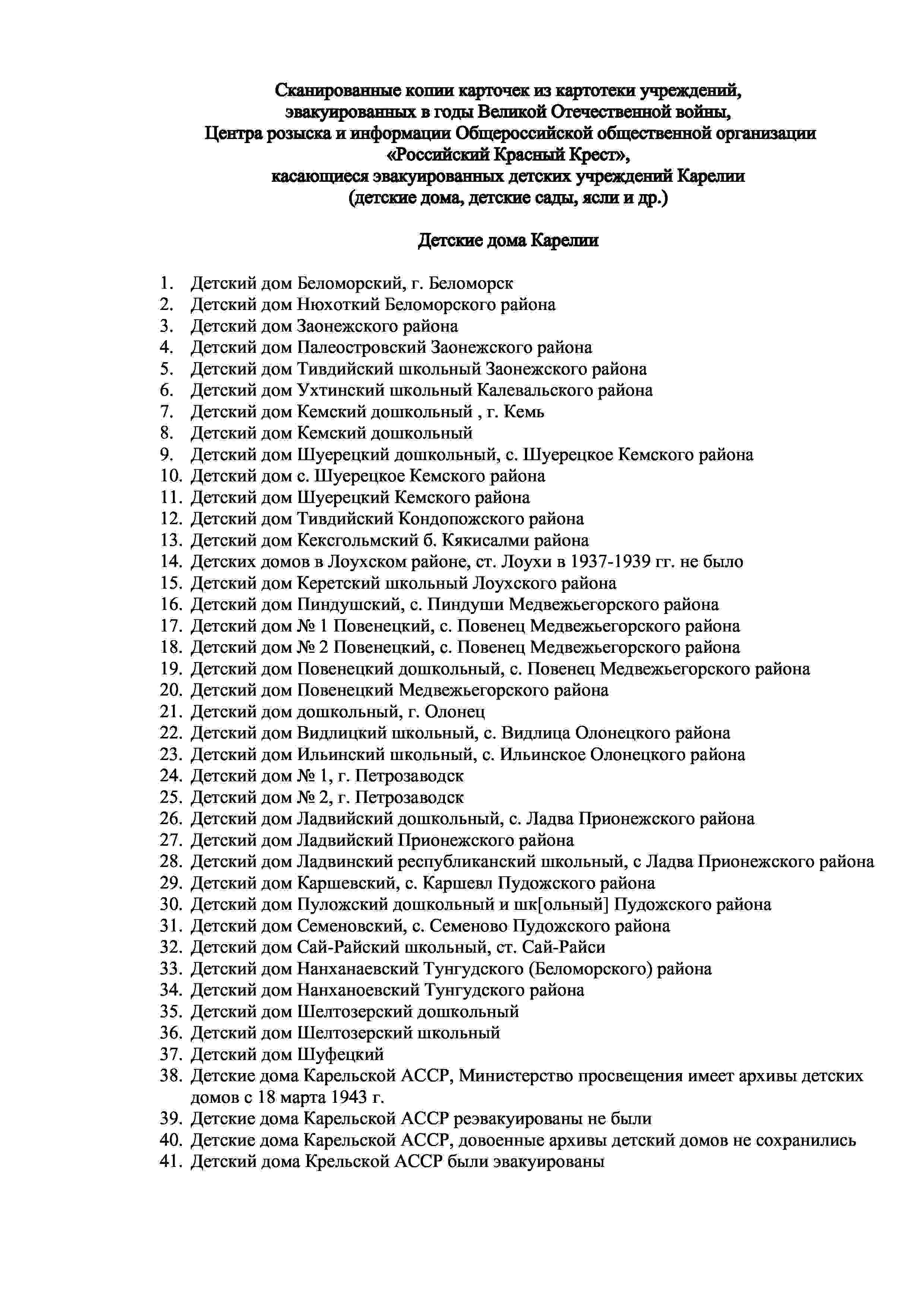 Список копий карточек из картотеки учреждений, эвакуированных в годы Великой Отечественной войны, Центра розыска и информации Общероссийской общественной организации «Российский Красный Крест», касающиеся эвакуированных детских учреждений Карелии (детские дома, детские сады, ясли и др.).