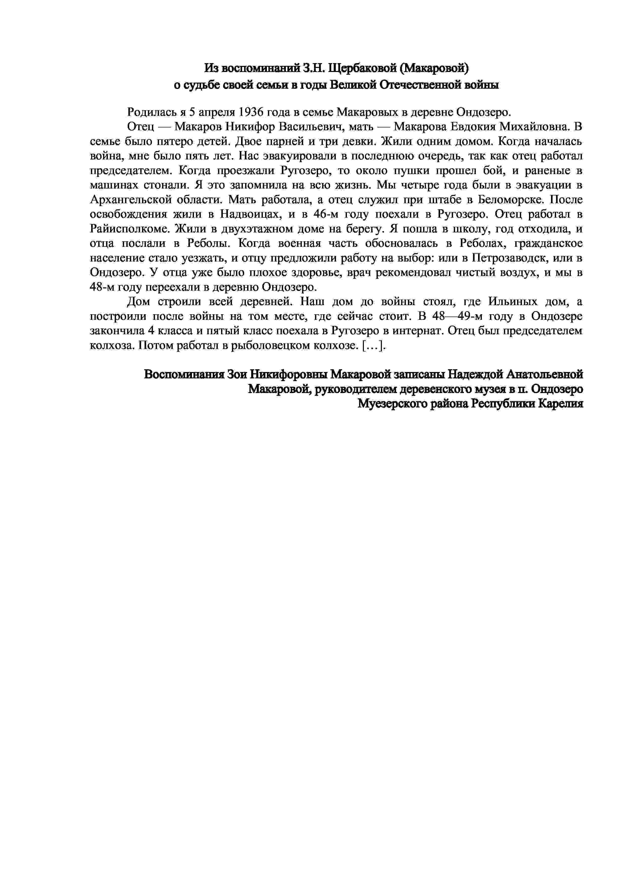 Материалы переданы Надеждой Анатольевной Макаровой, руководителем деревенского музея в п. Ондозеро, и Татьяной Николаевной Петренко (п. Ондозеро Муезерского района Республики Карелия).