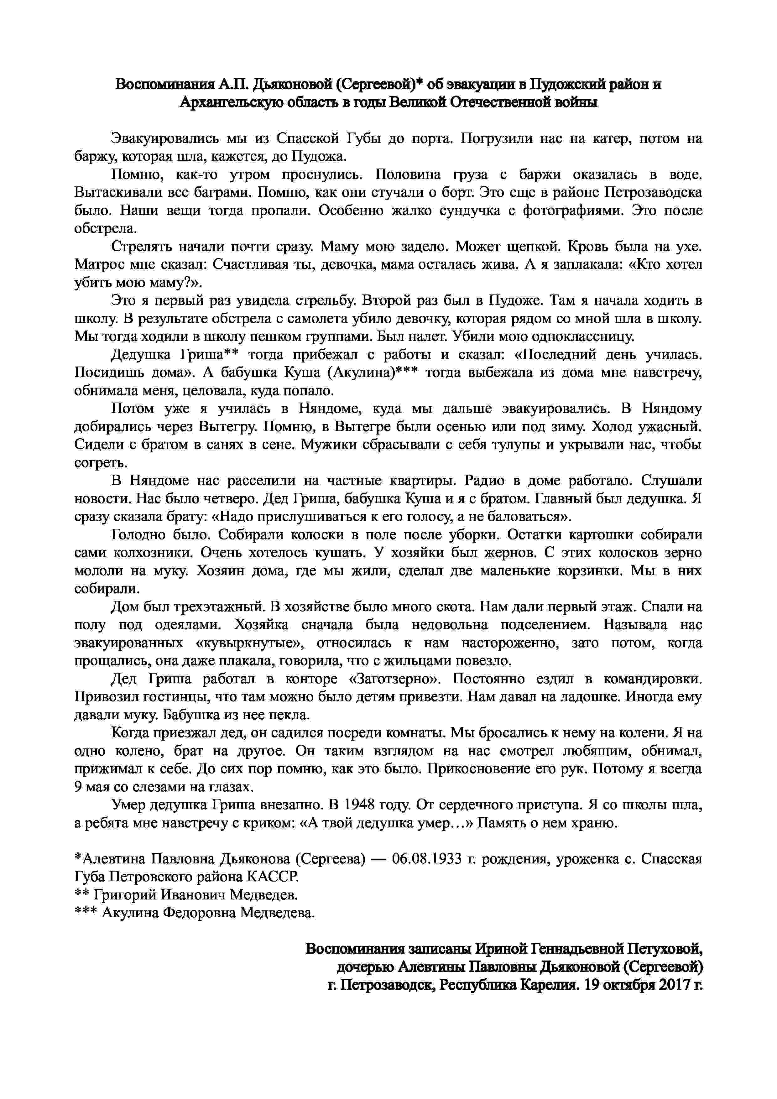 Материалы переданы Ириной Геннадьевной Петуховой (г. Петрозаводск, Республика Карелия), дочерью Алевтины Павловны Дьяконовой (Сергеевой).