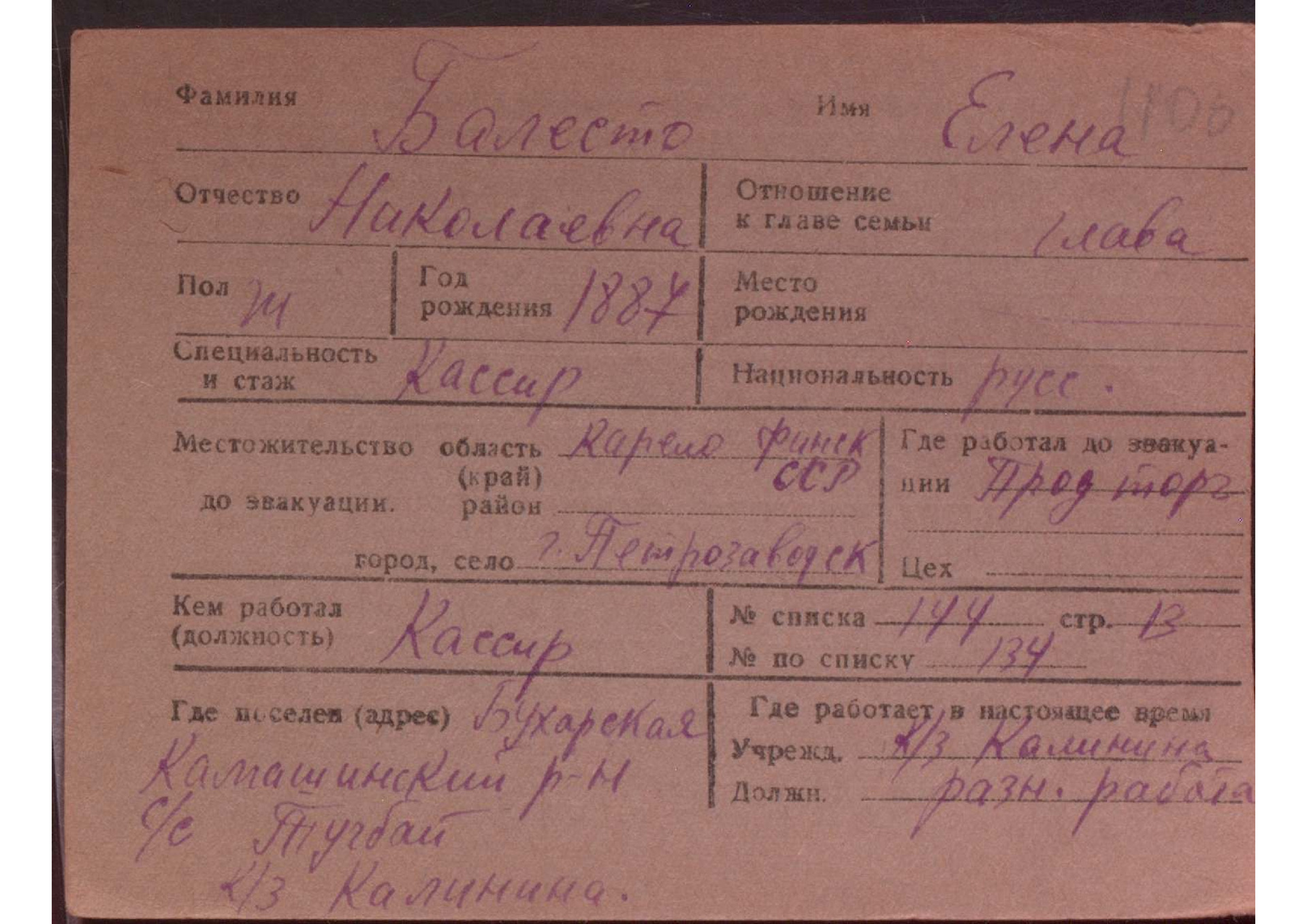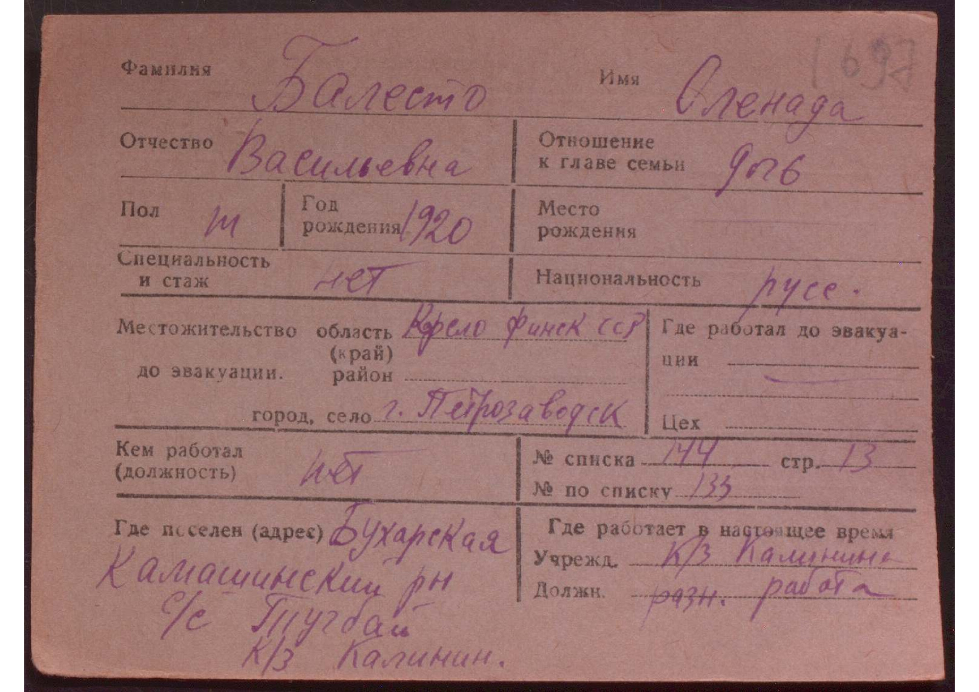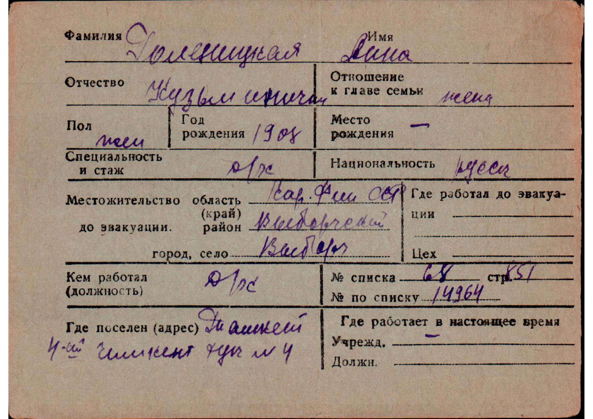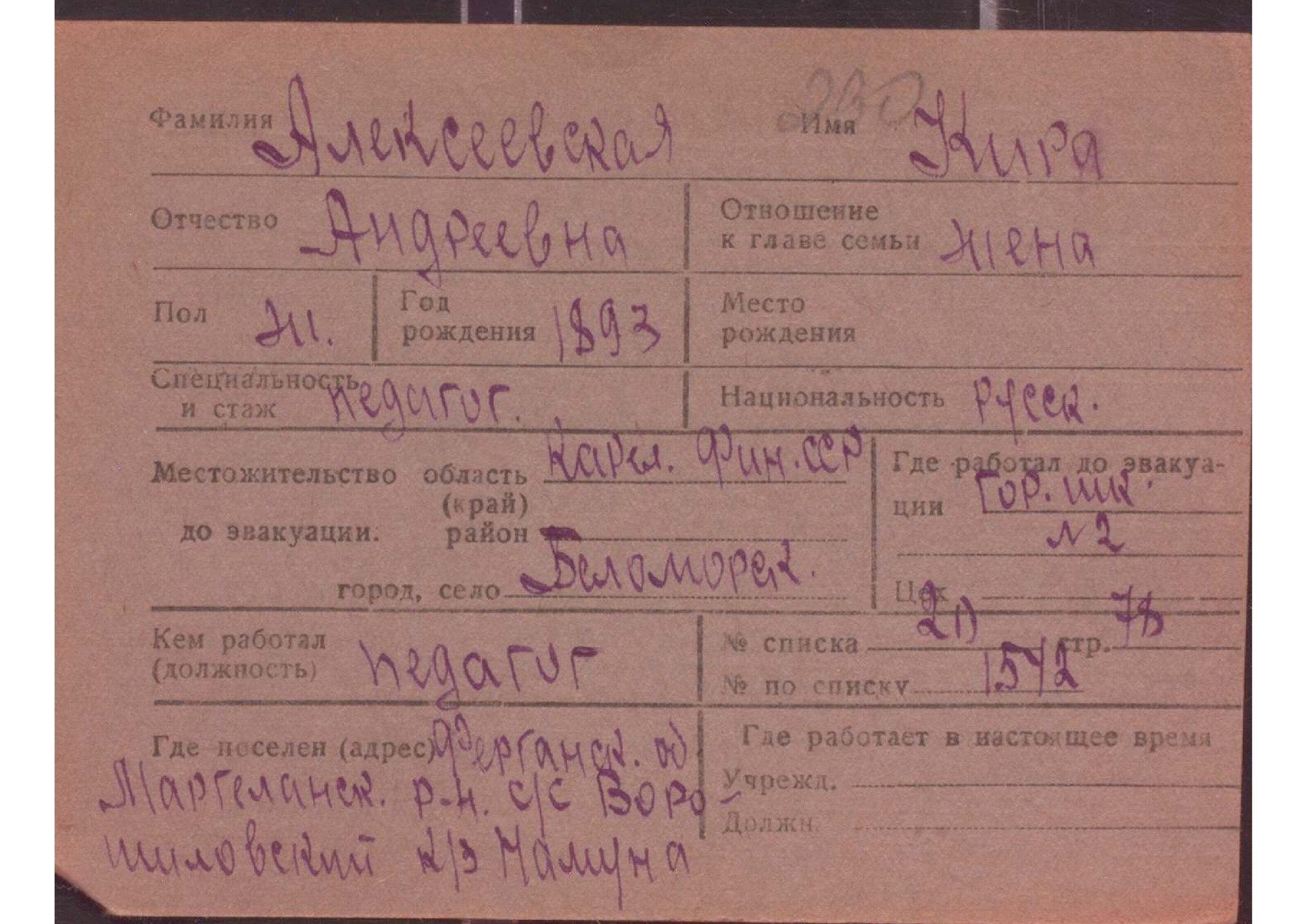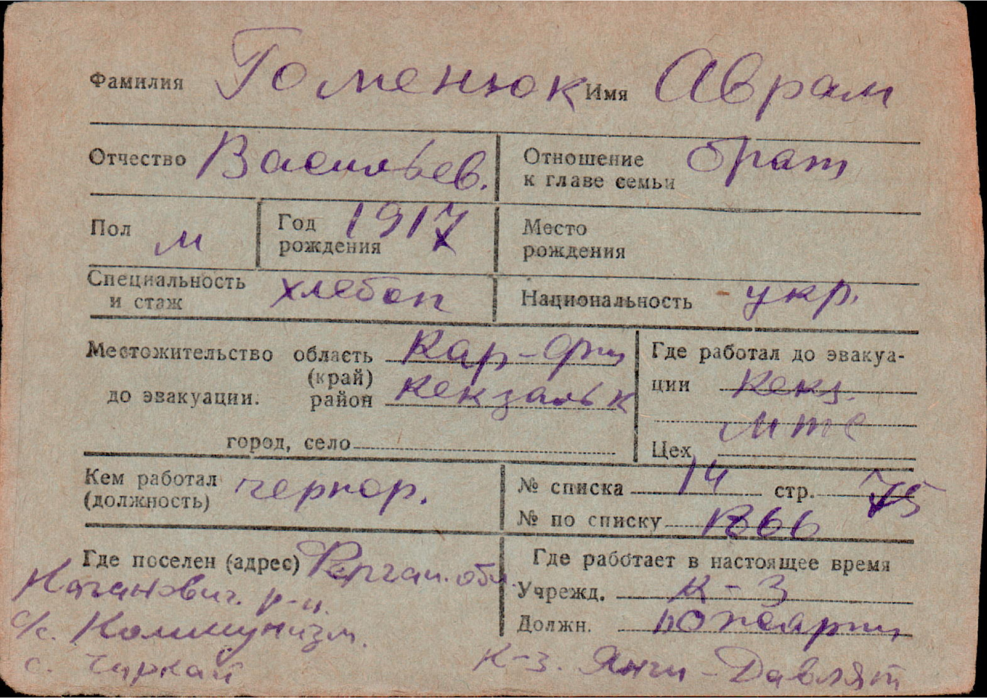 Карточки на эвакуированных из прифронтовой полосы граждан.