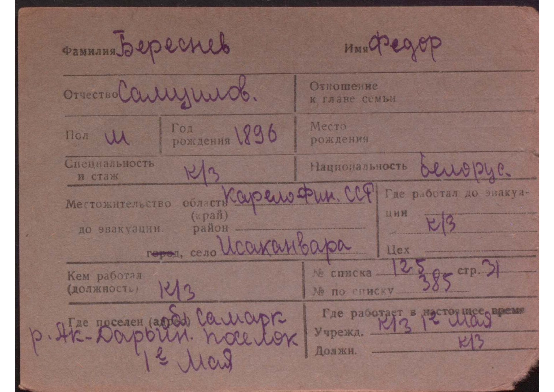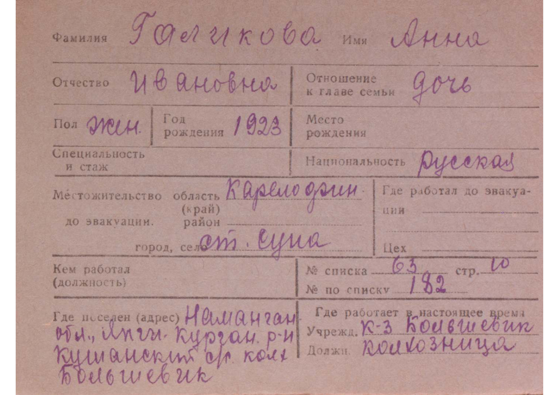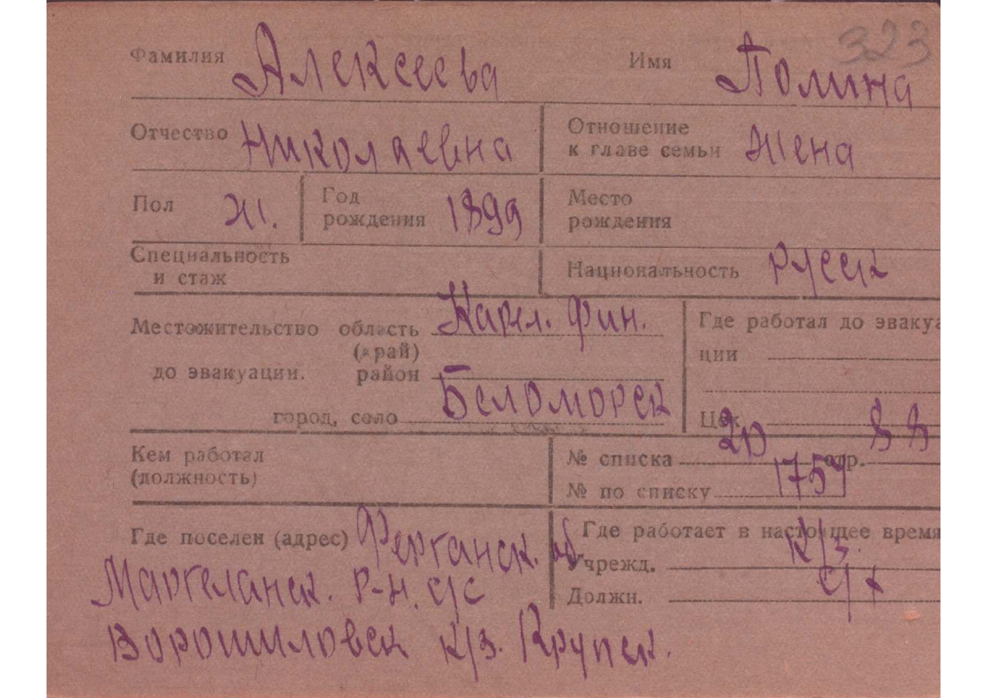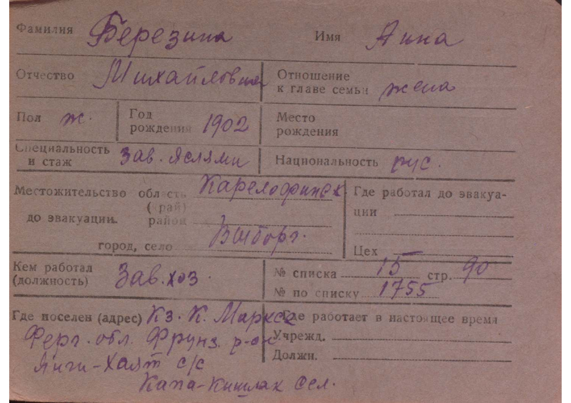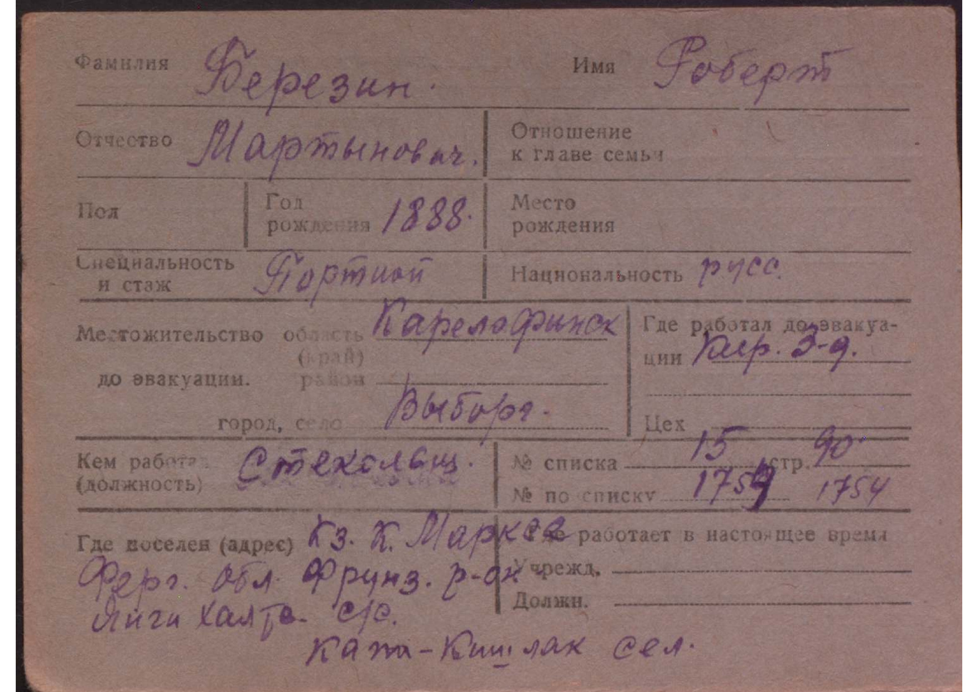 Карточки на эвакуированных из прифронтовой полосы граждан.