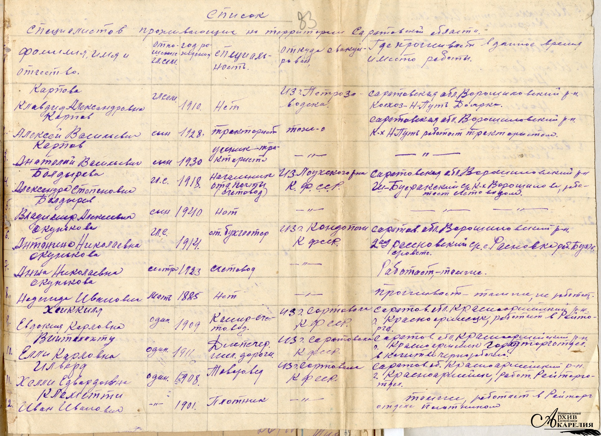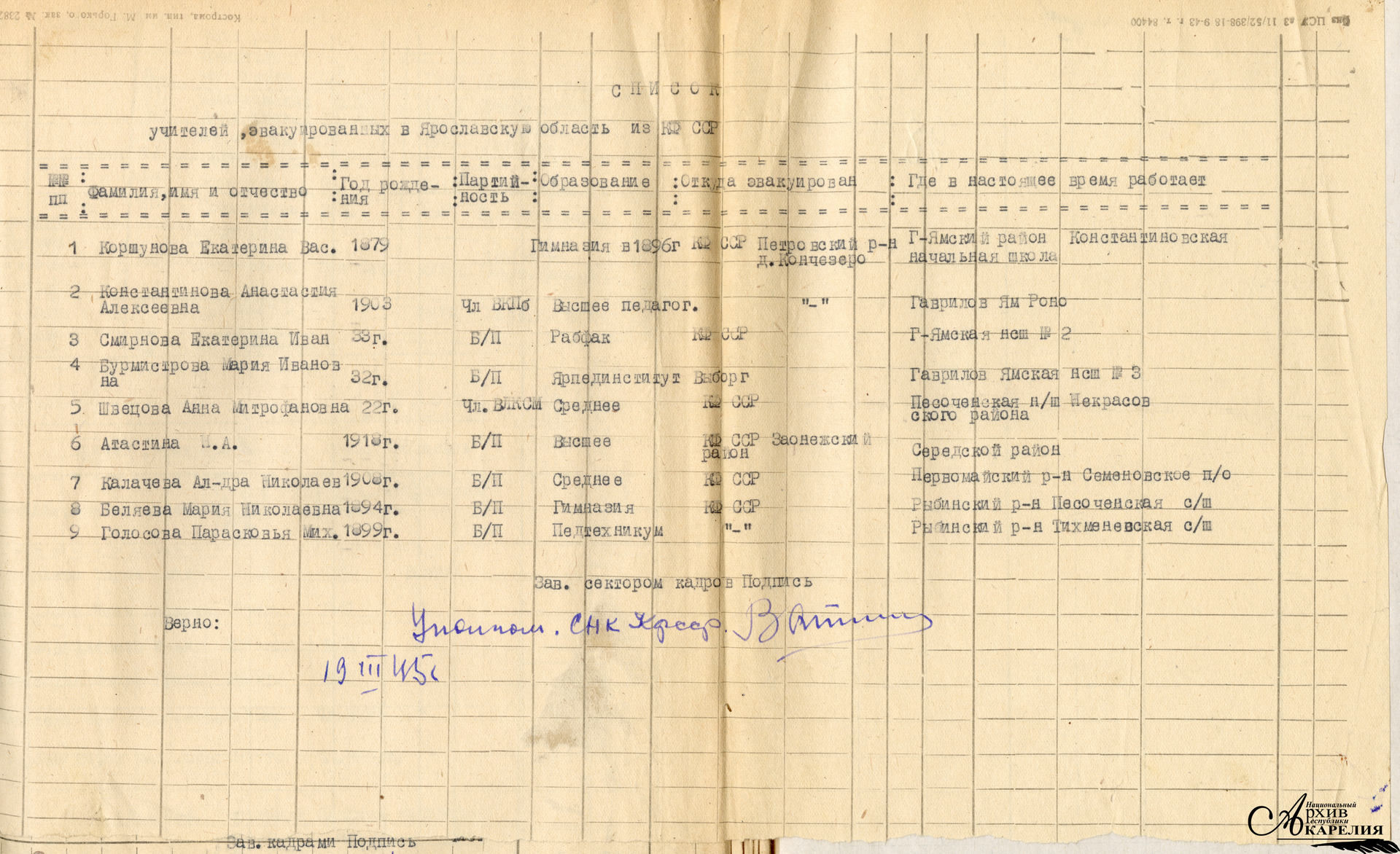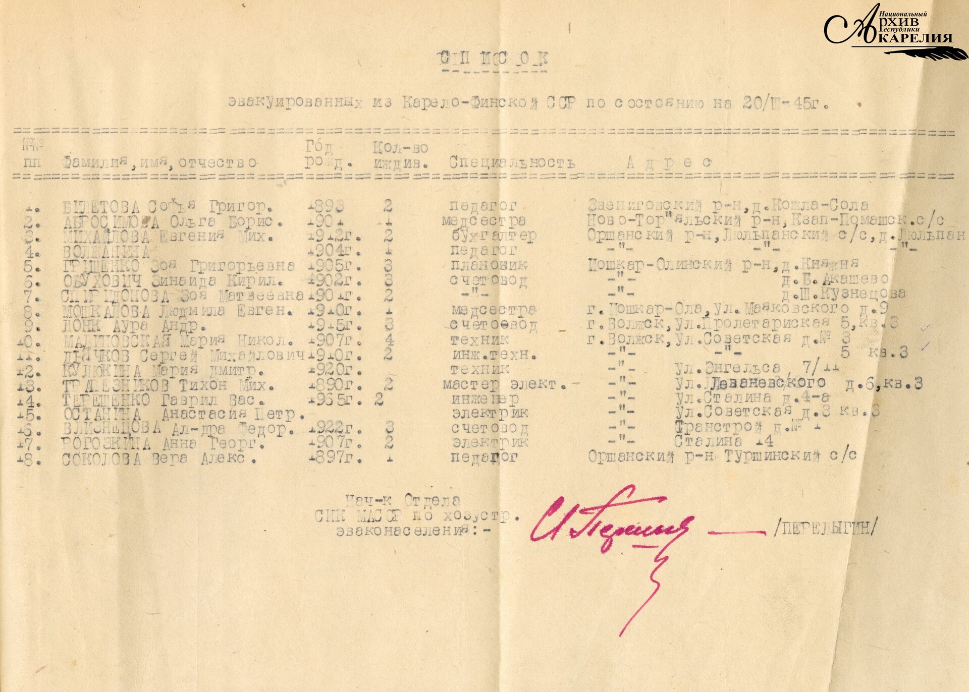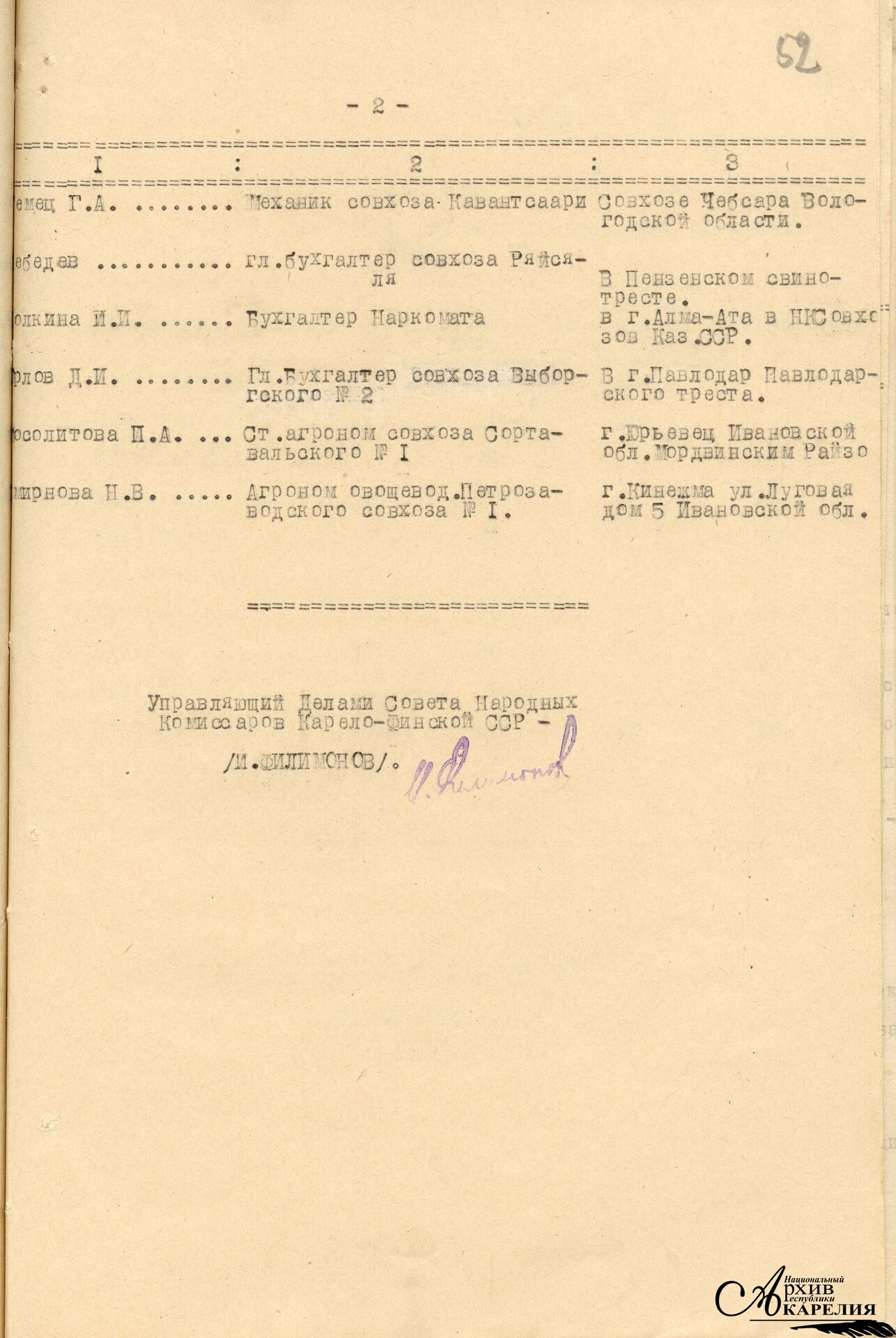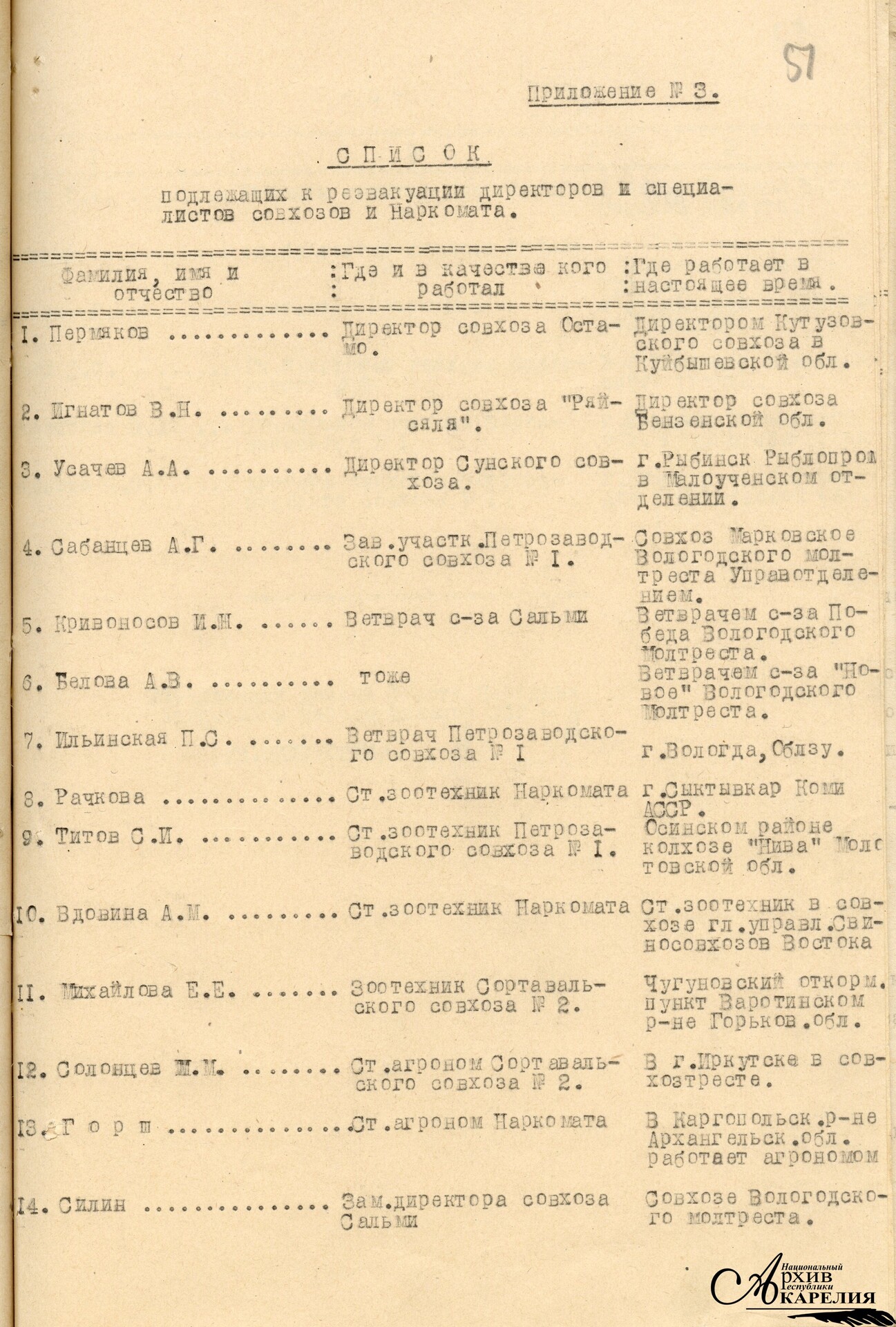 Список специалистов сельского хозяйства (агрономов, механиков, ветврачей), эвакуированных из КФССР и проживающих в Ярославской области, составленный уполномоченным СНК КФССР по Ярославской области Вайноненом для подготовки возвращения в КФССР.