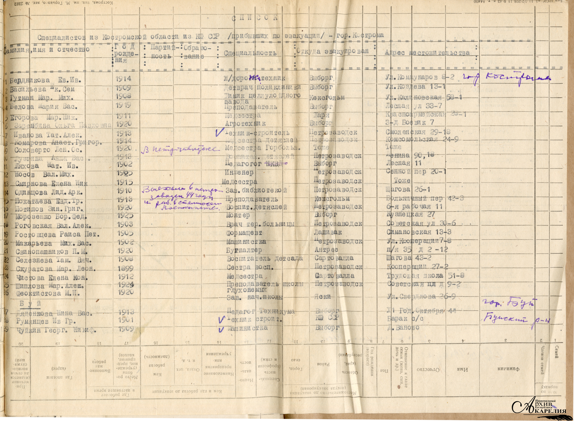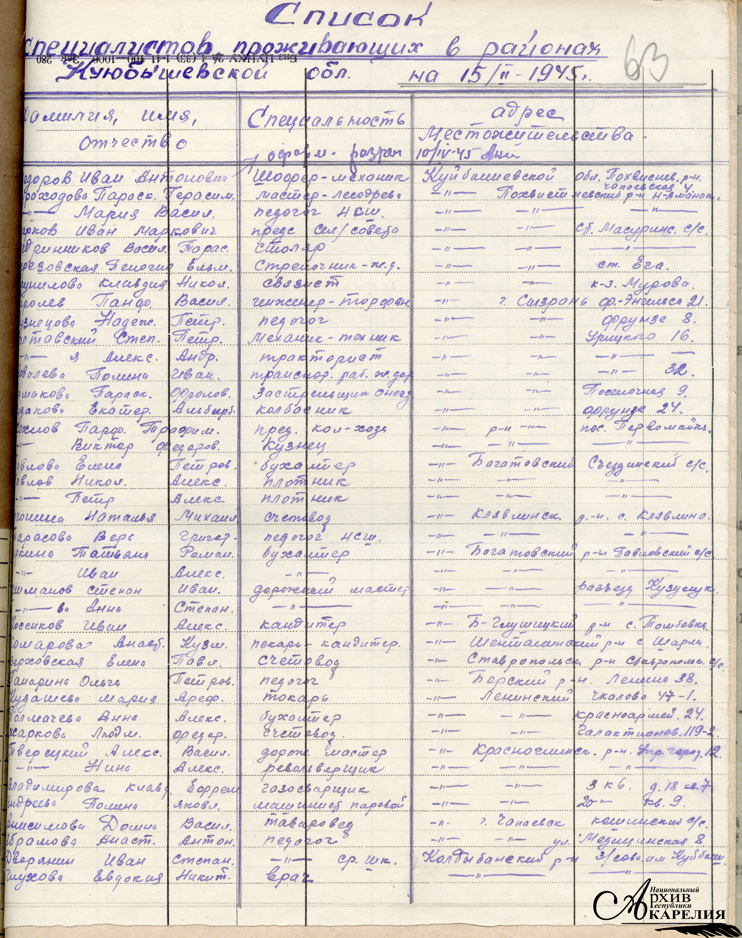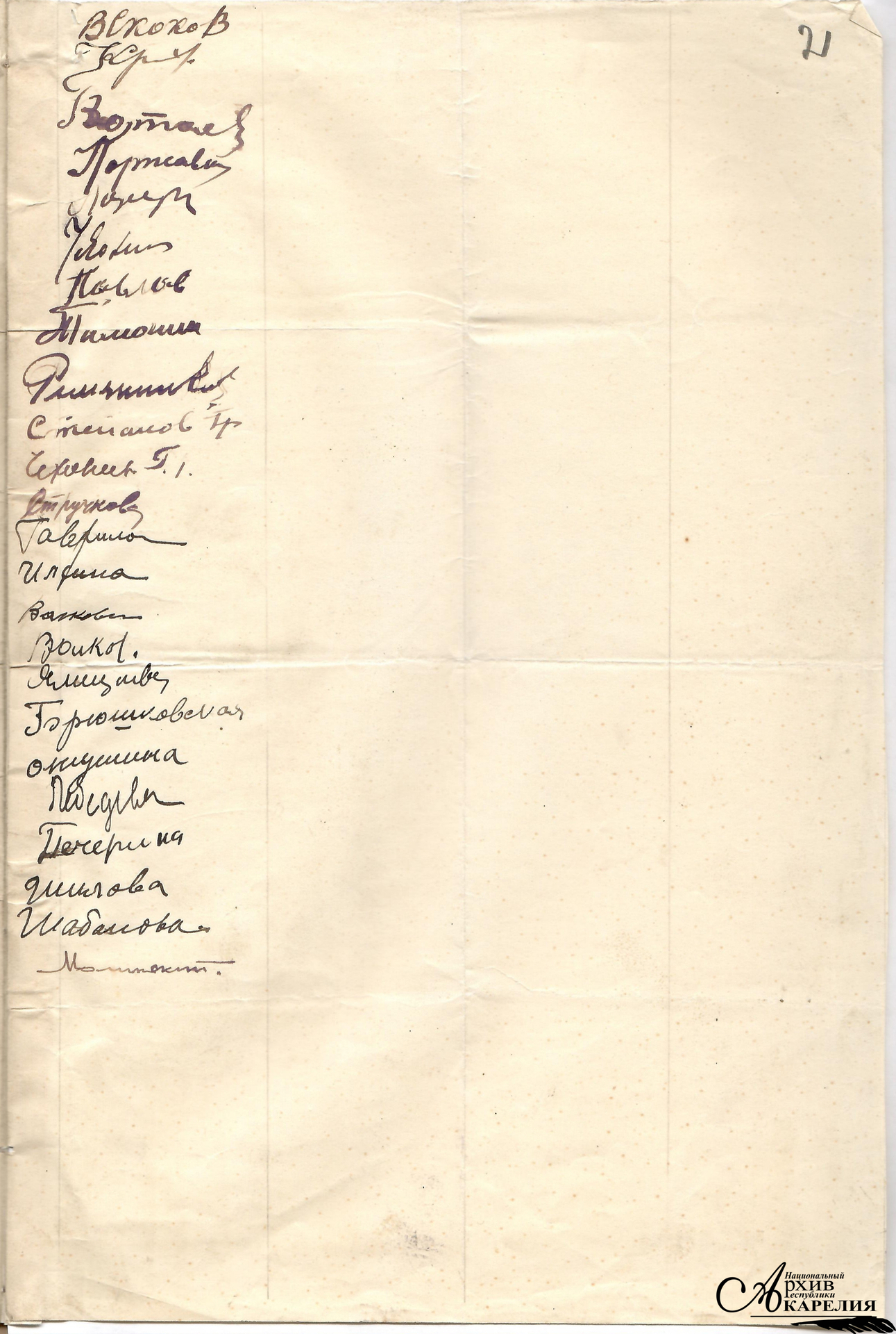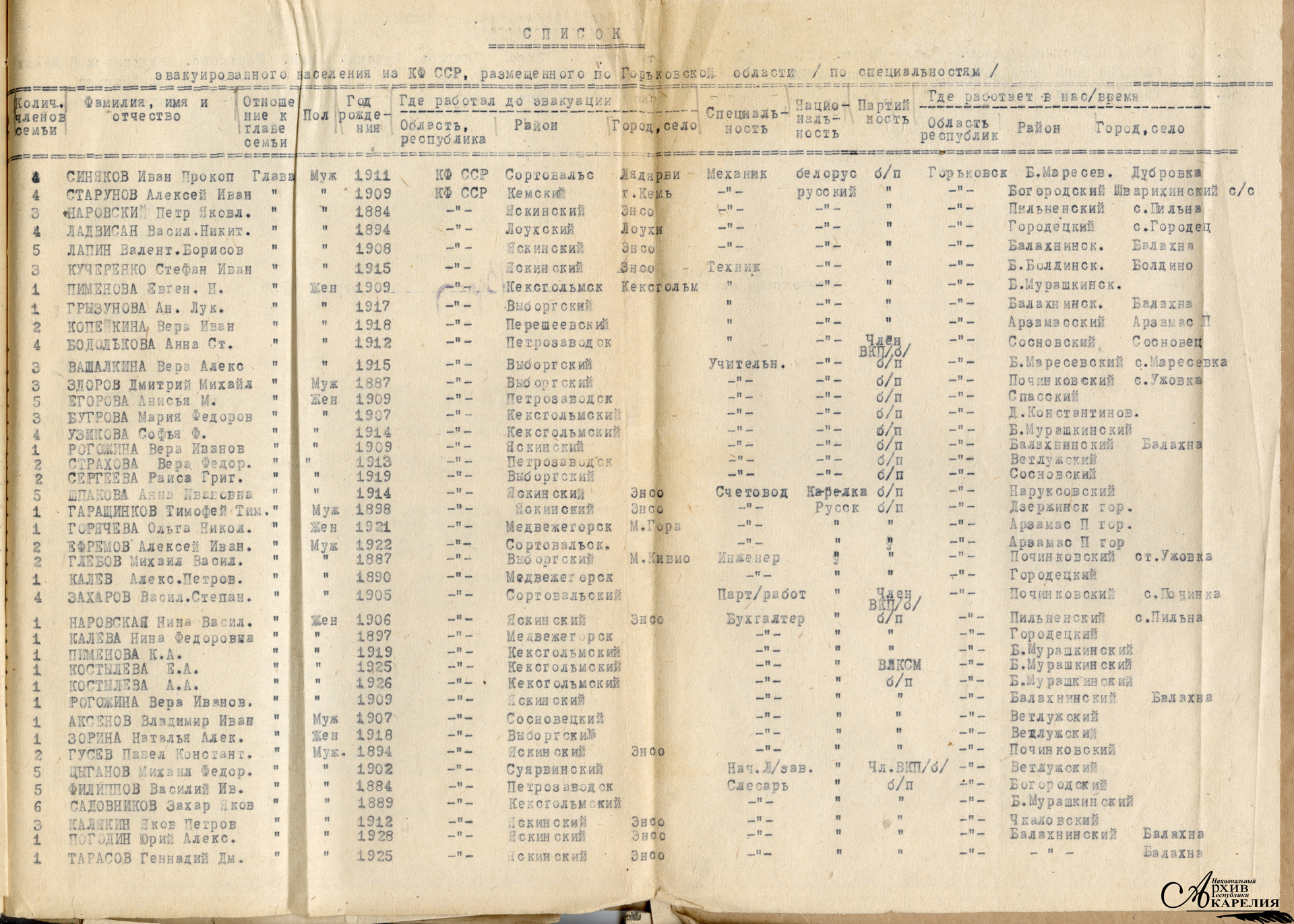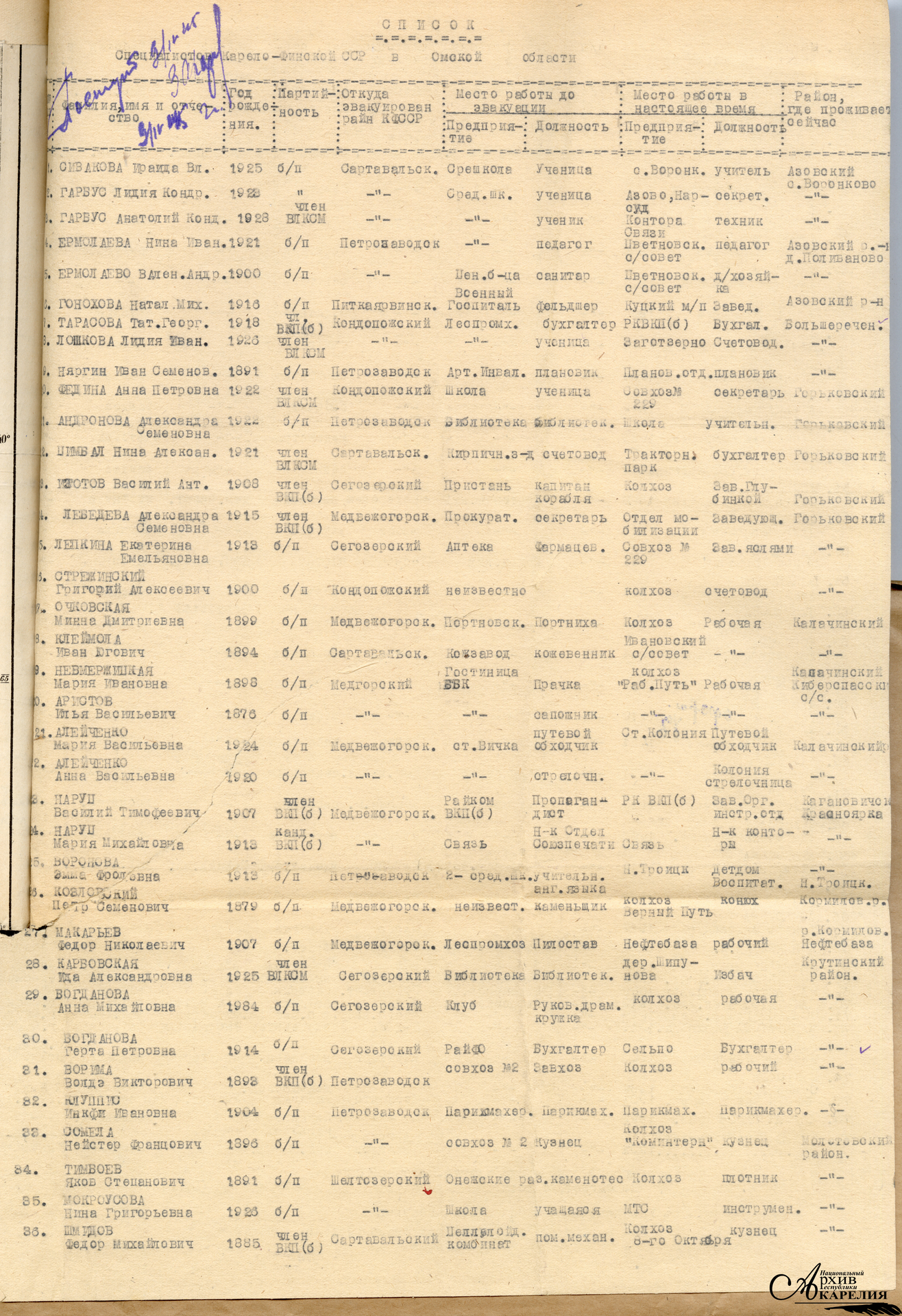 Список специалистов сельского хозяйства (агрономов, механиков, ветврачей), эвакуированных из КФССР и проживающих в Ярославской области, составленный уполномоченным СНК КФССР по Ярославской области Вайноненом для подготовки возвращения в КФССР.