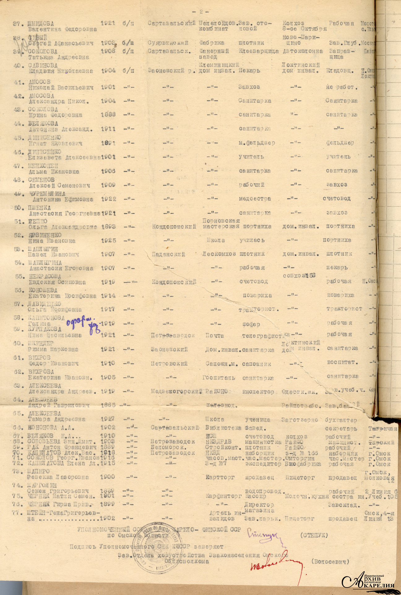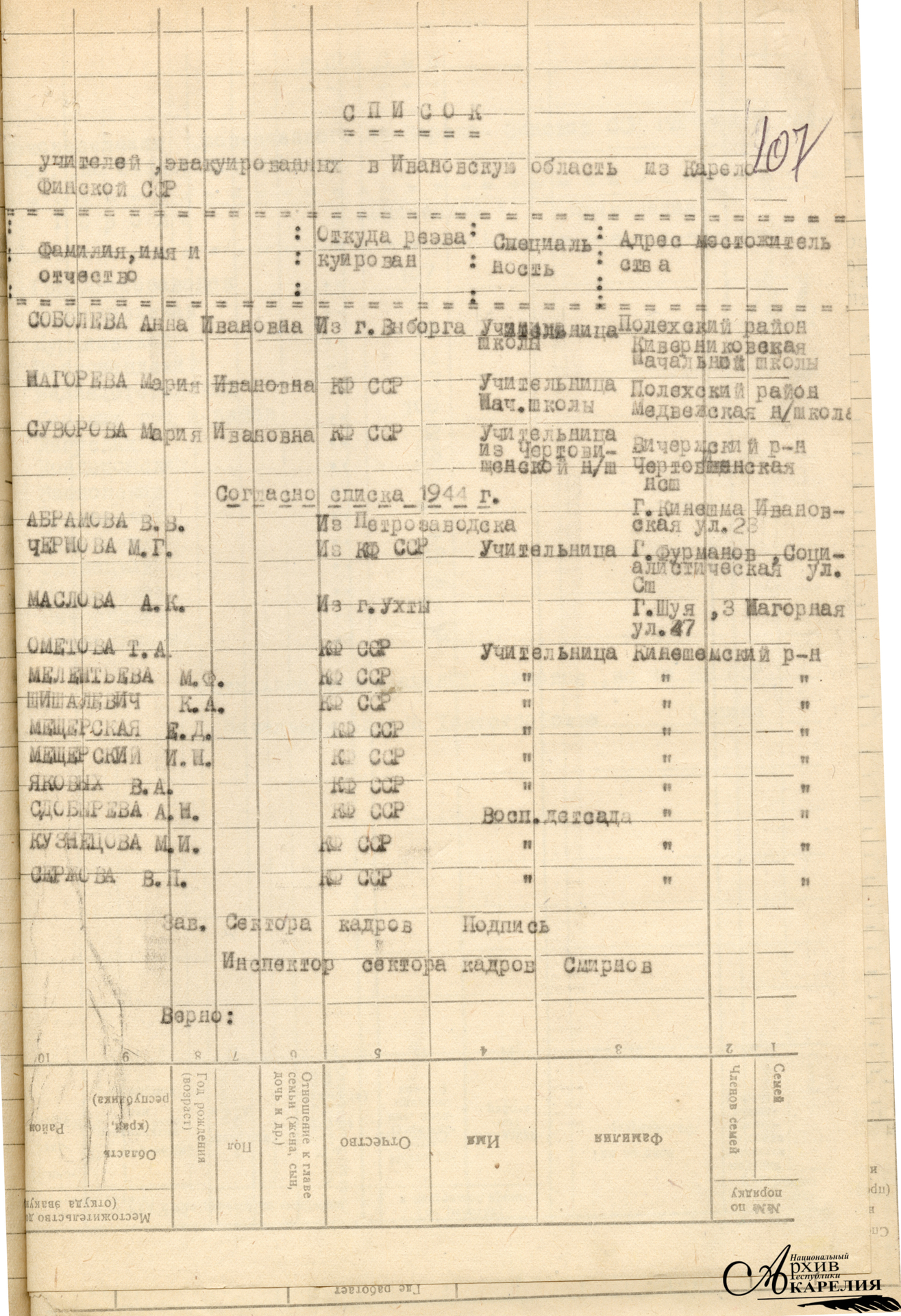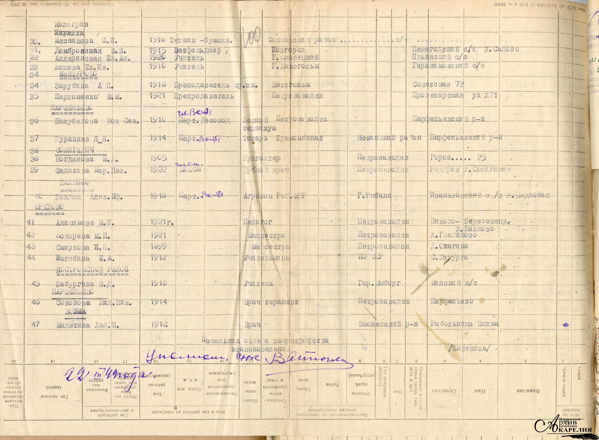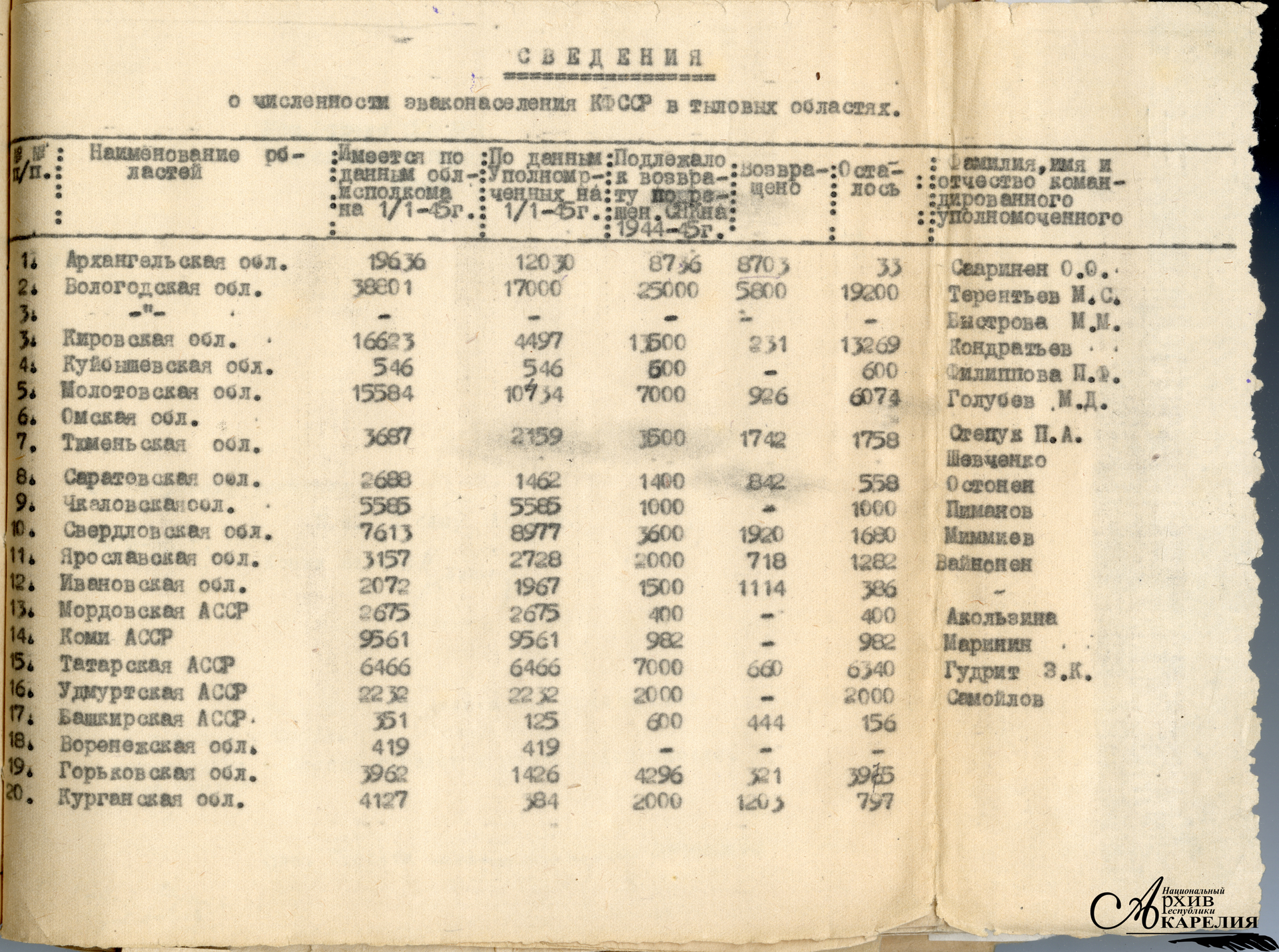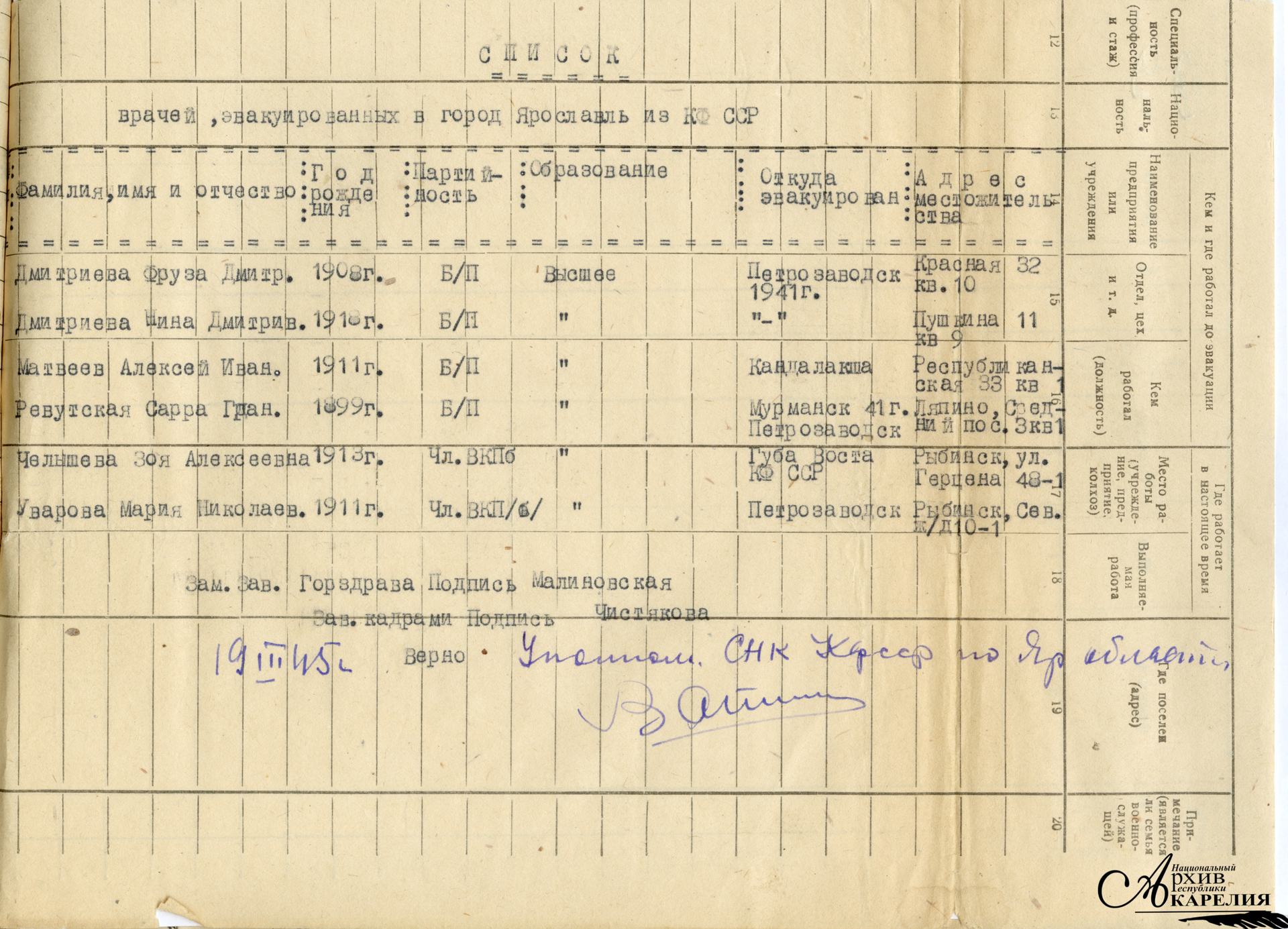 Список специалистов сельского хозяйства (агрономов, механиков, ветврачей), эвакуированных из КФССР и проживающих в Ярославской области, составленный уполномоченным СНК КФССР по Ярославской области Вайноненом для подготовки возвращения в КФССР.
