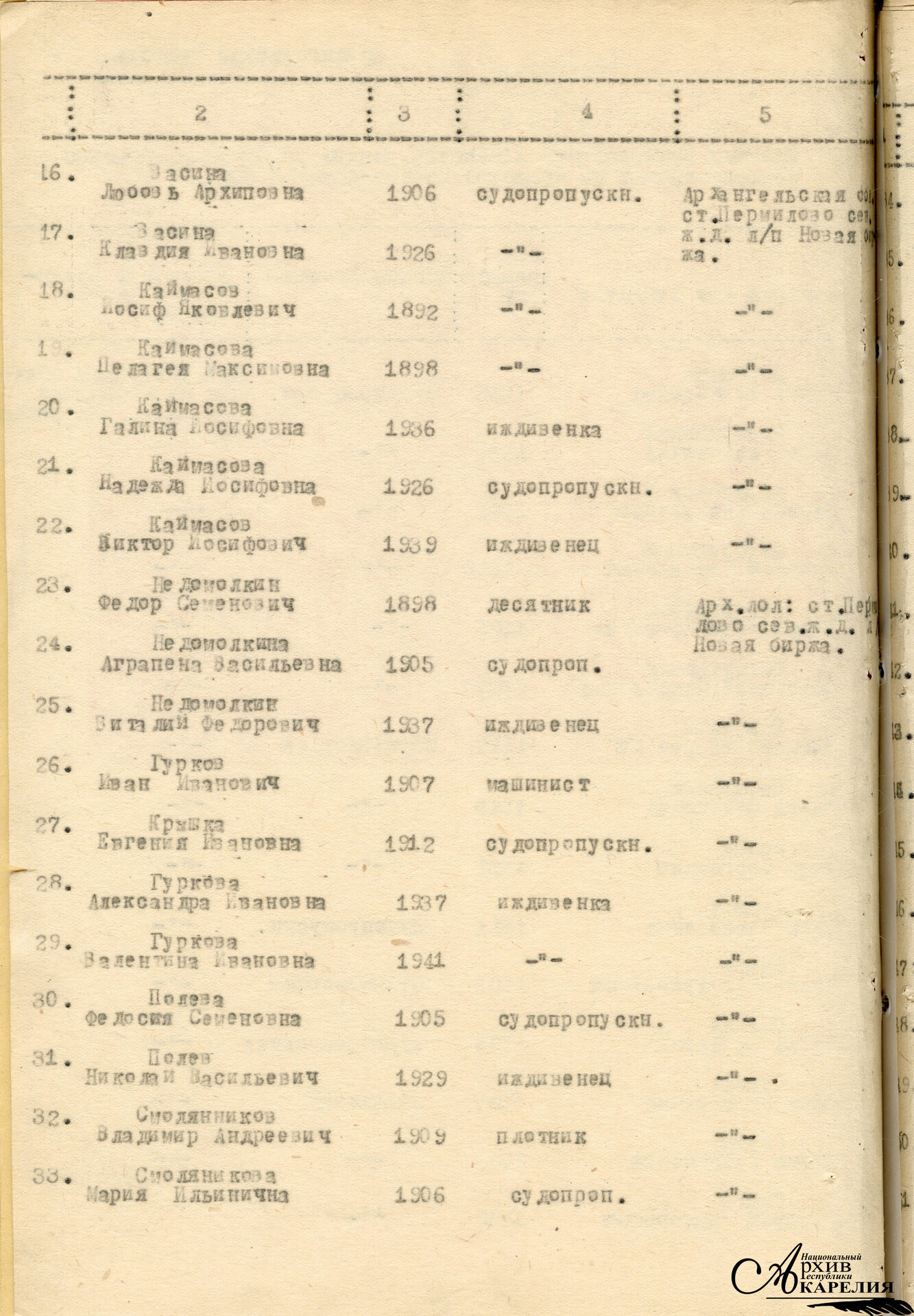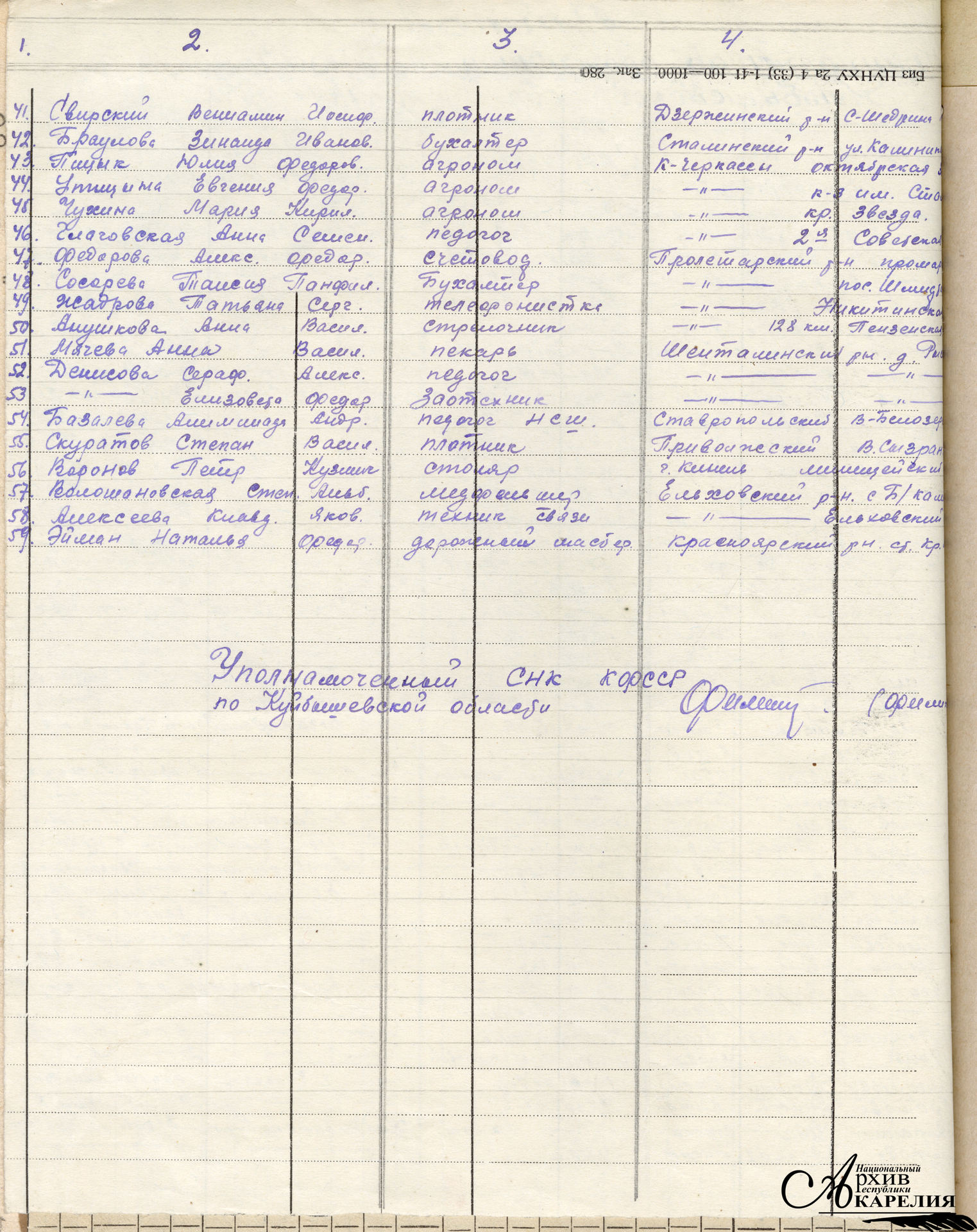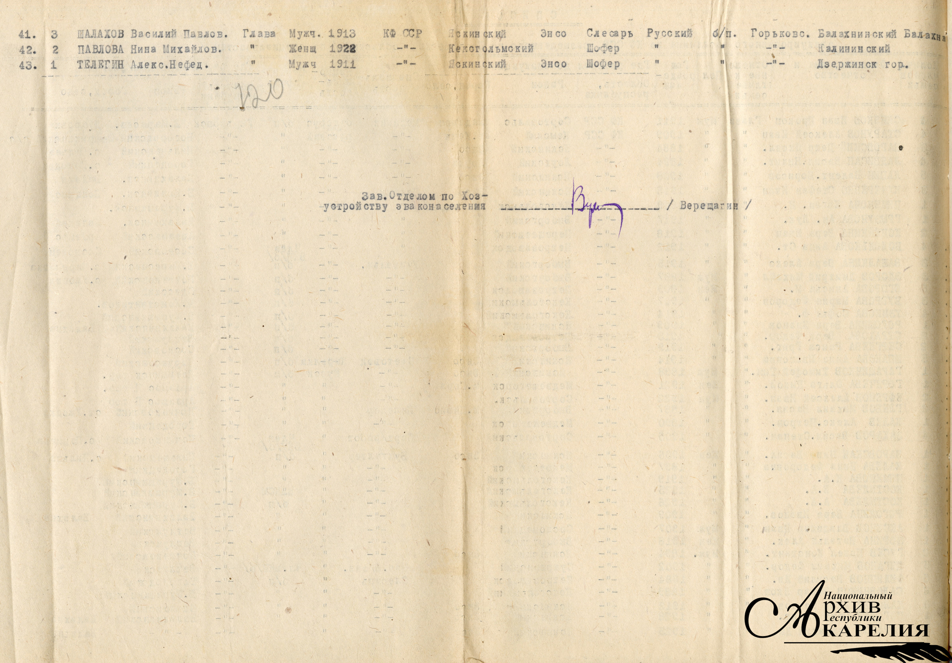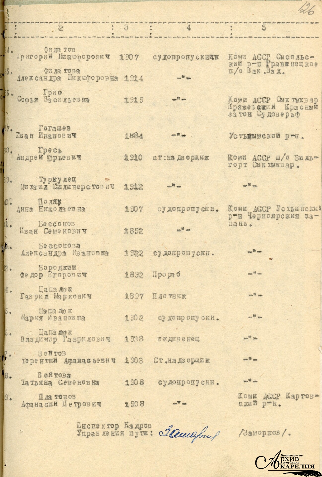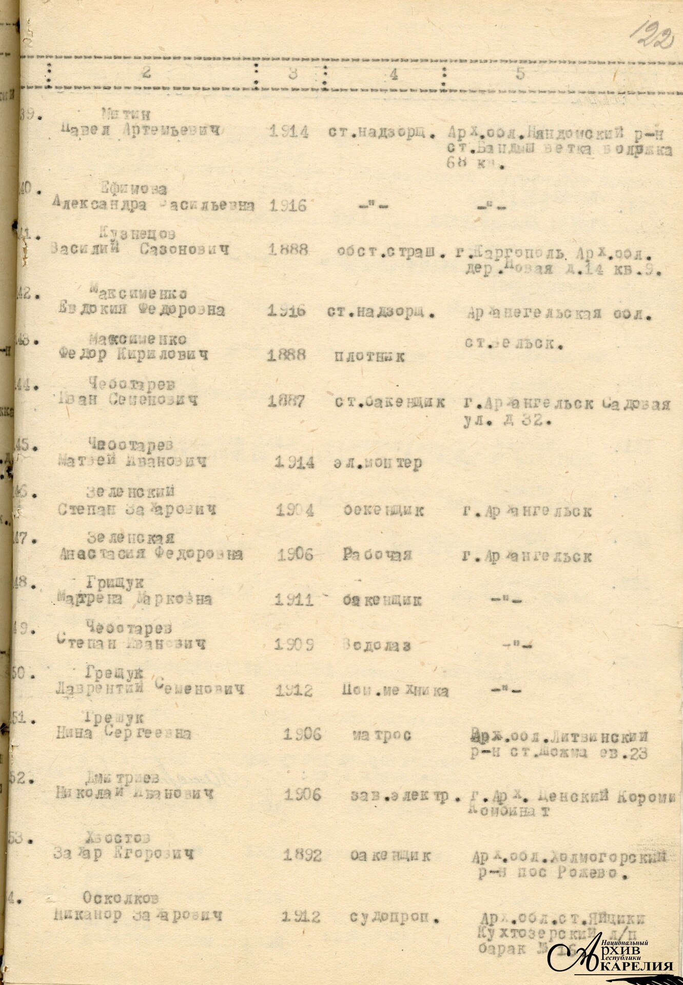 Список специалистов сельского хозяйства (агрономов, механиков, ветврачей), эвакуированных из КФССР и проживающих в Ярославской области, составленный уполномоченным СНК КФССР по Ярославской области Вайноненом для подготовки возвращения в КФССР.