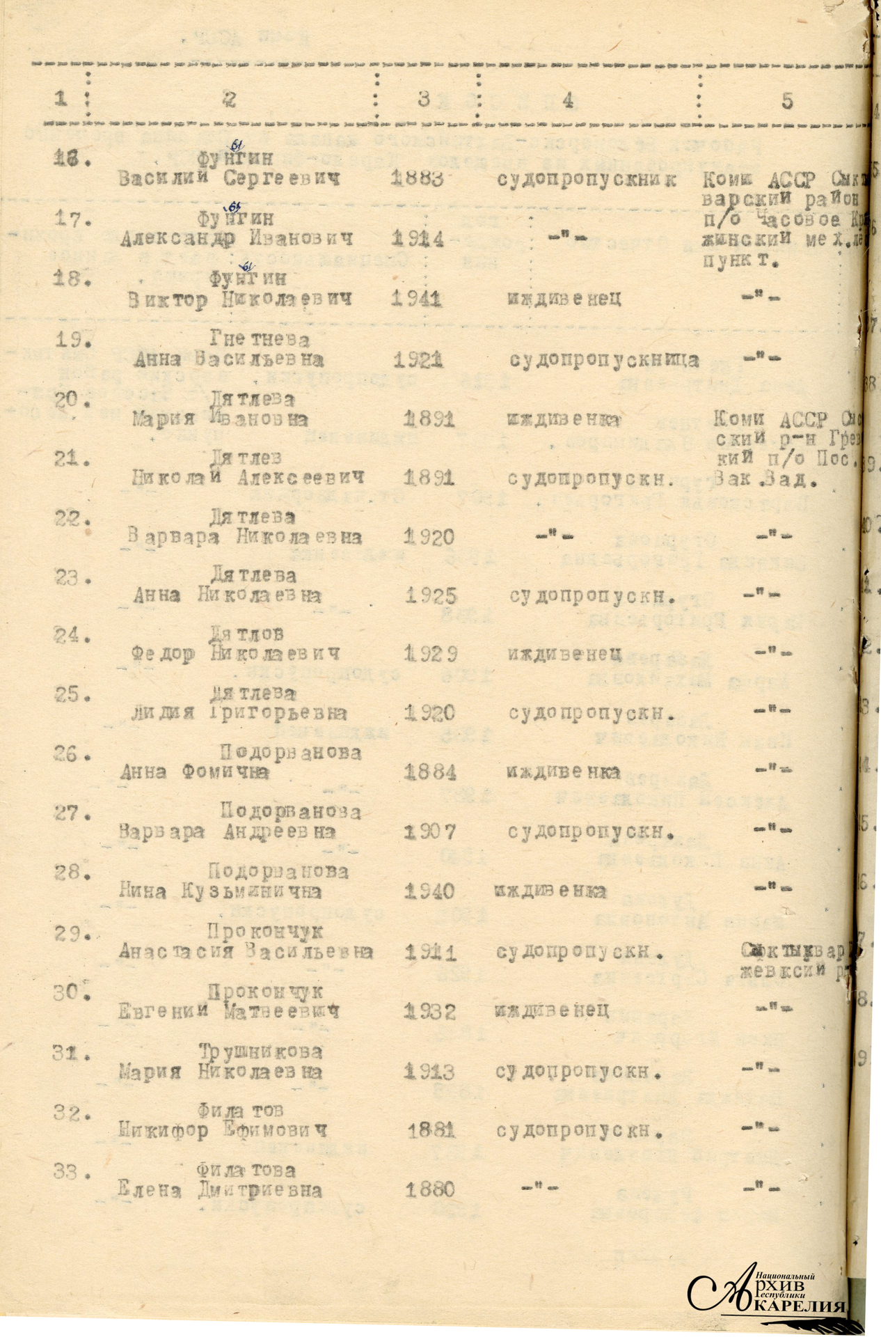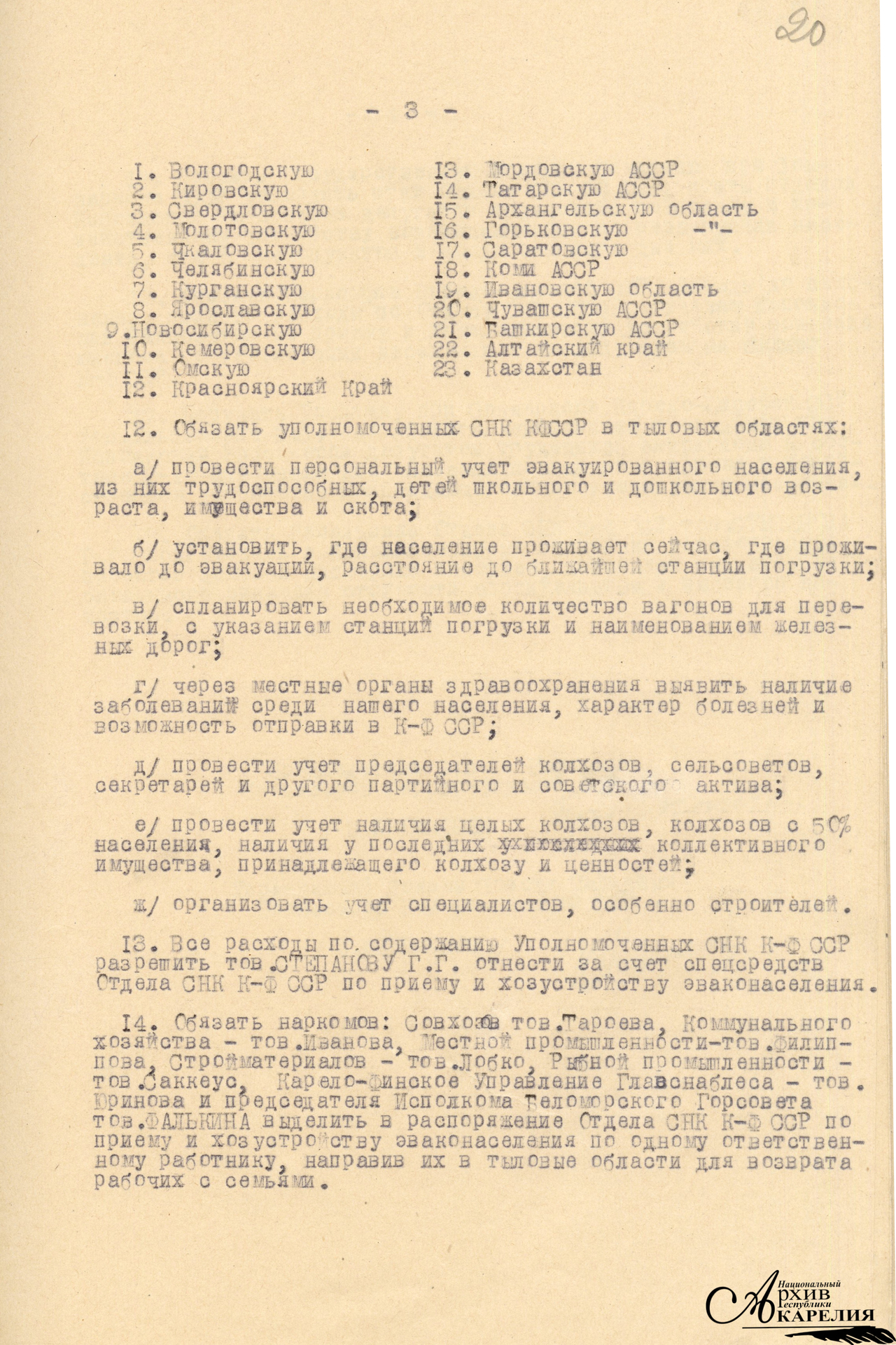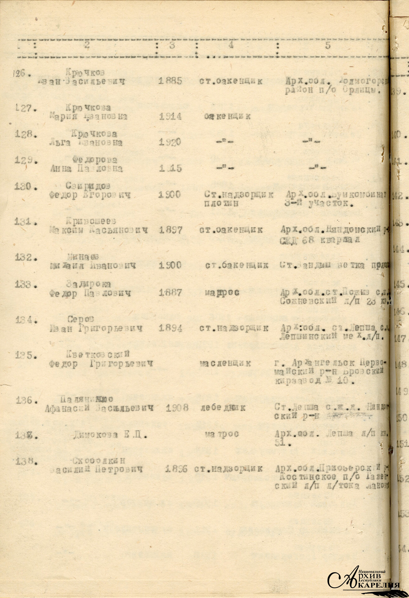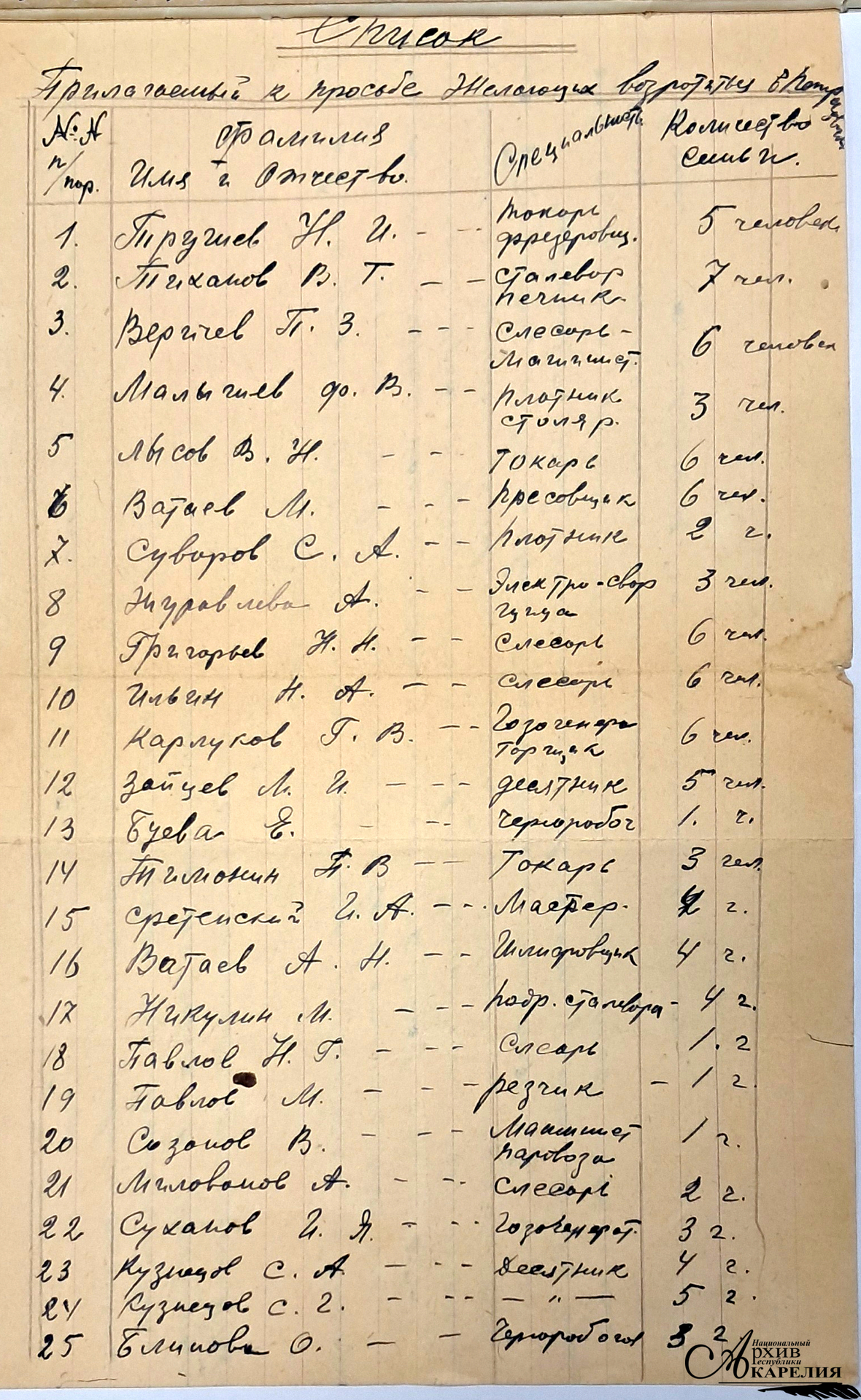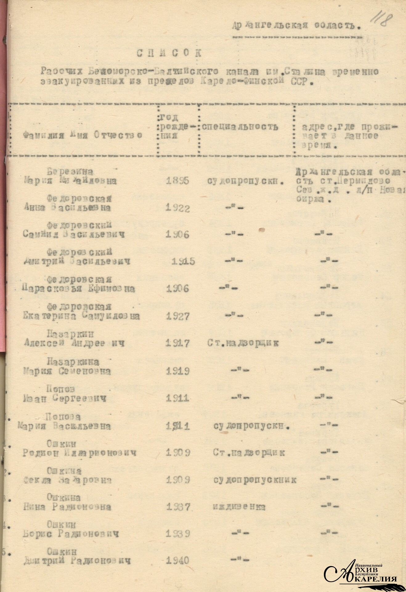 Список специалистов сельского хозяйства (агрономов, механиков, ветврачей), эвакуированных из КФССР и проживающих в Ярославской области, составленный уполномоченным СНК КФССР по Ярославской области Вайноненом для подготовки возвращения в КФССР.