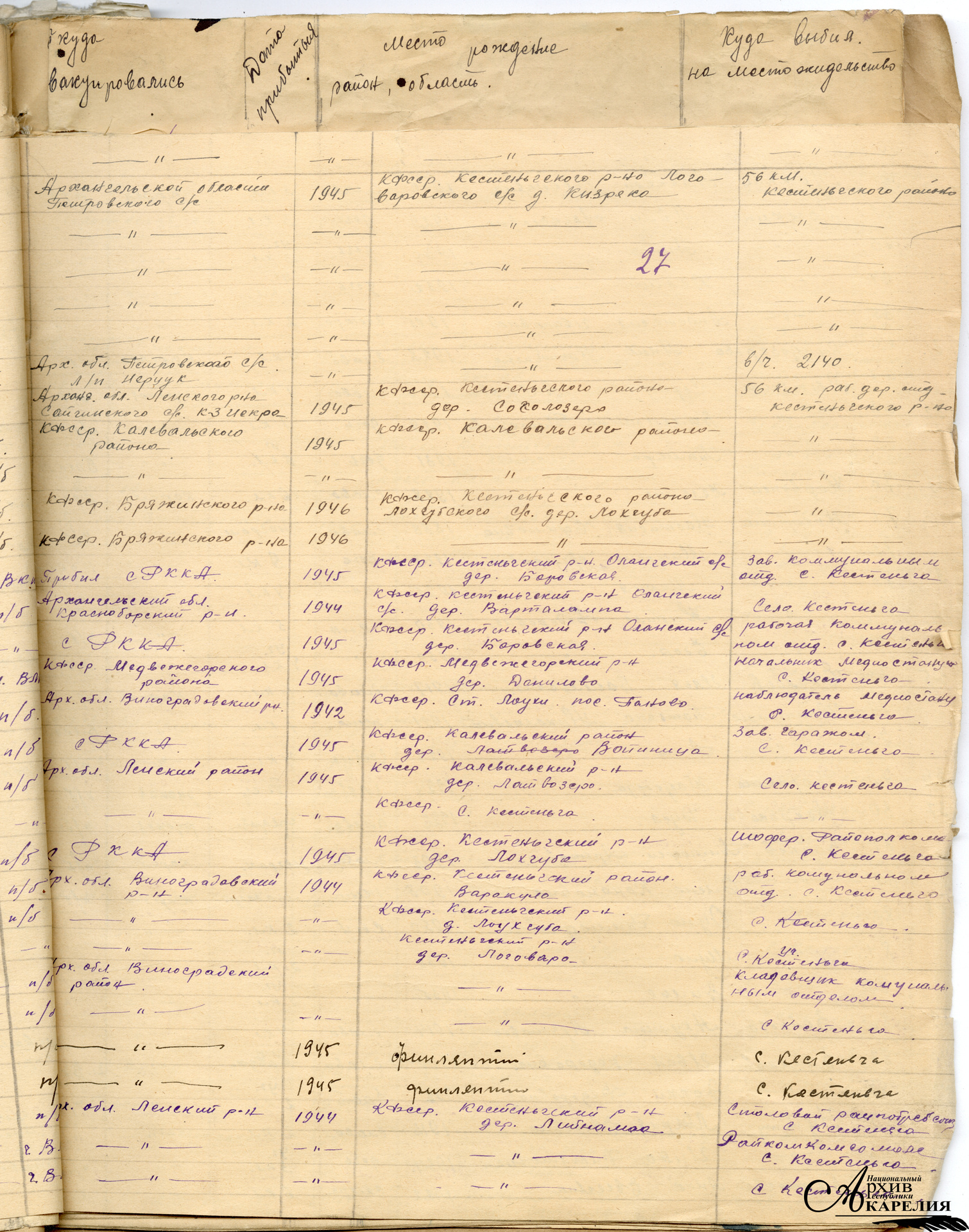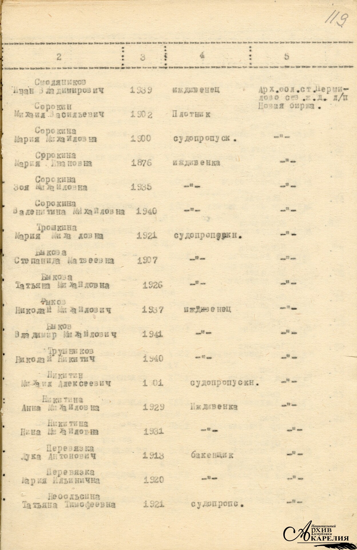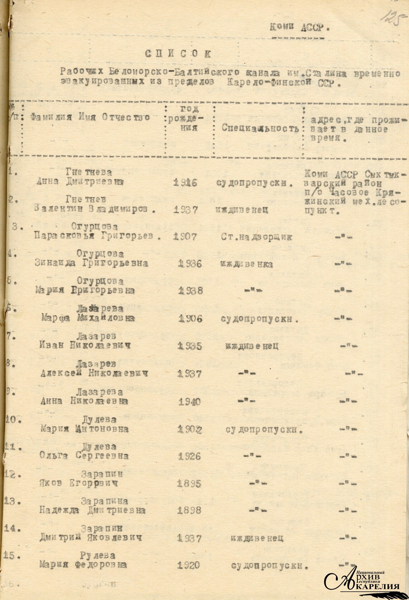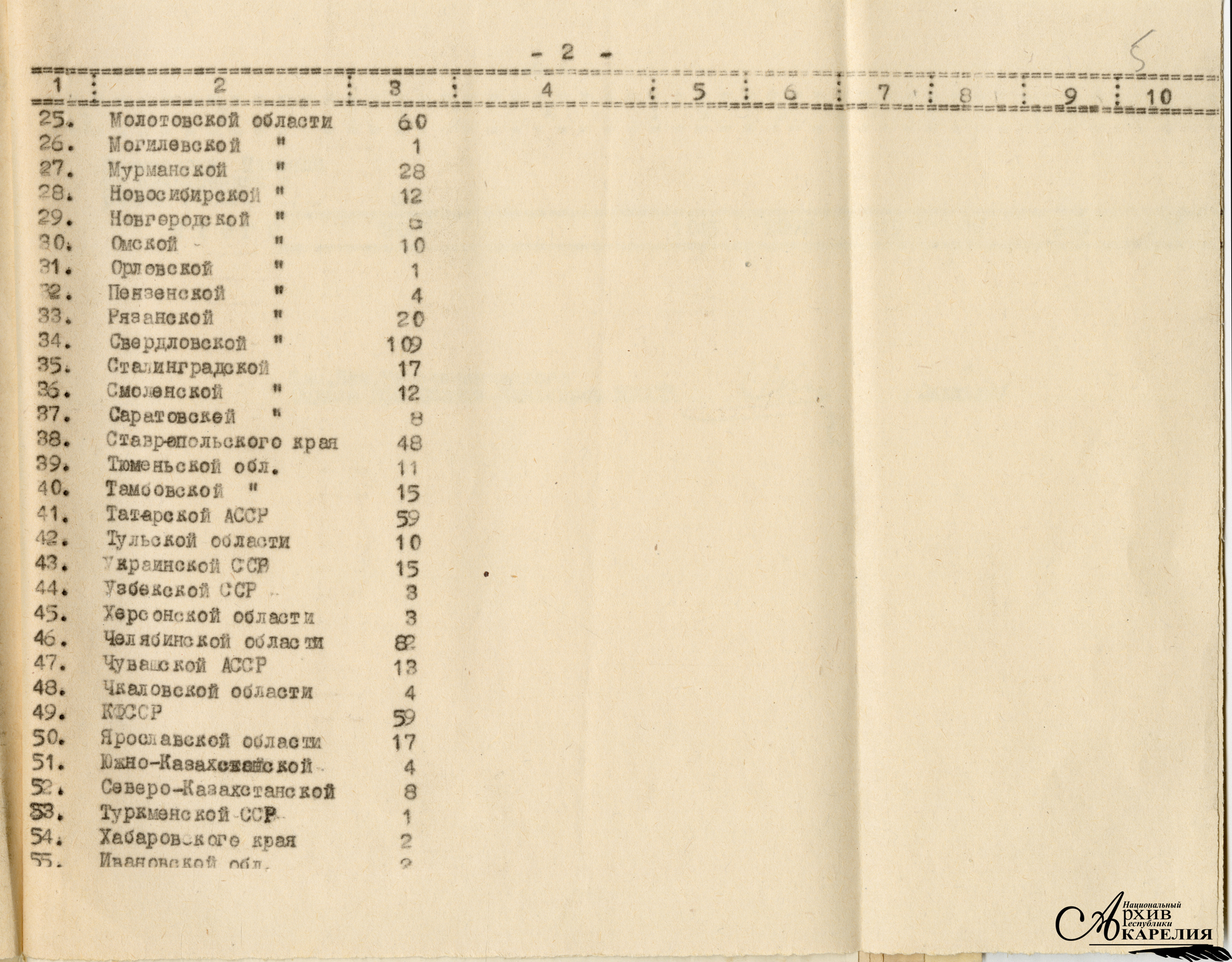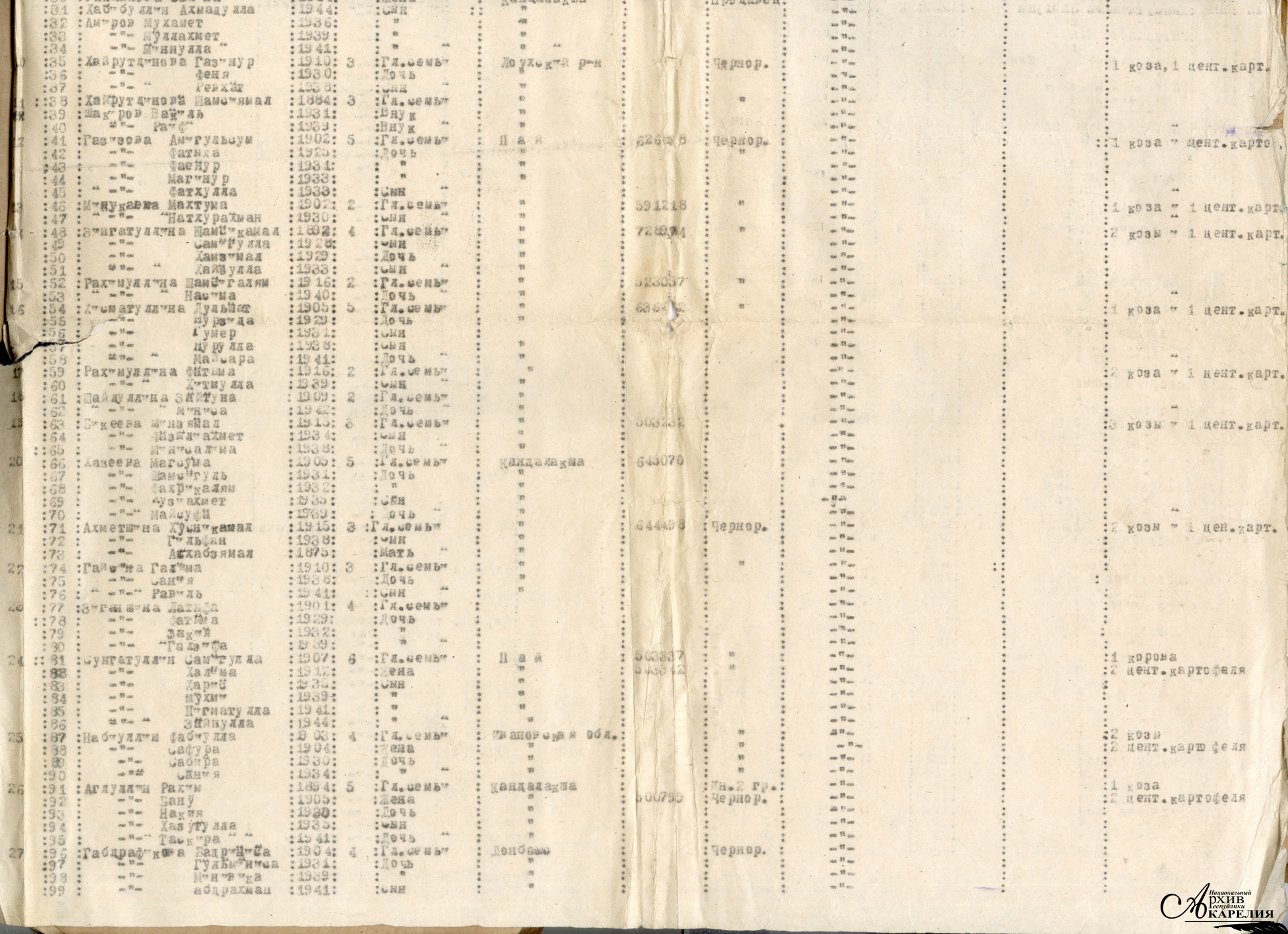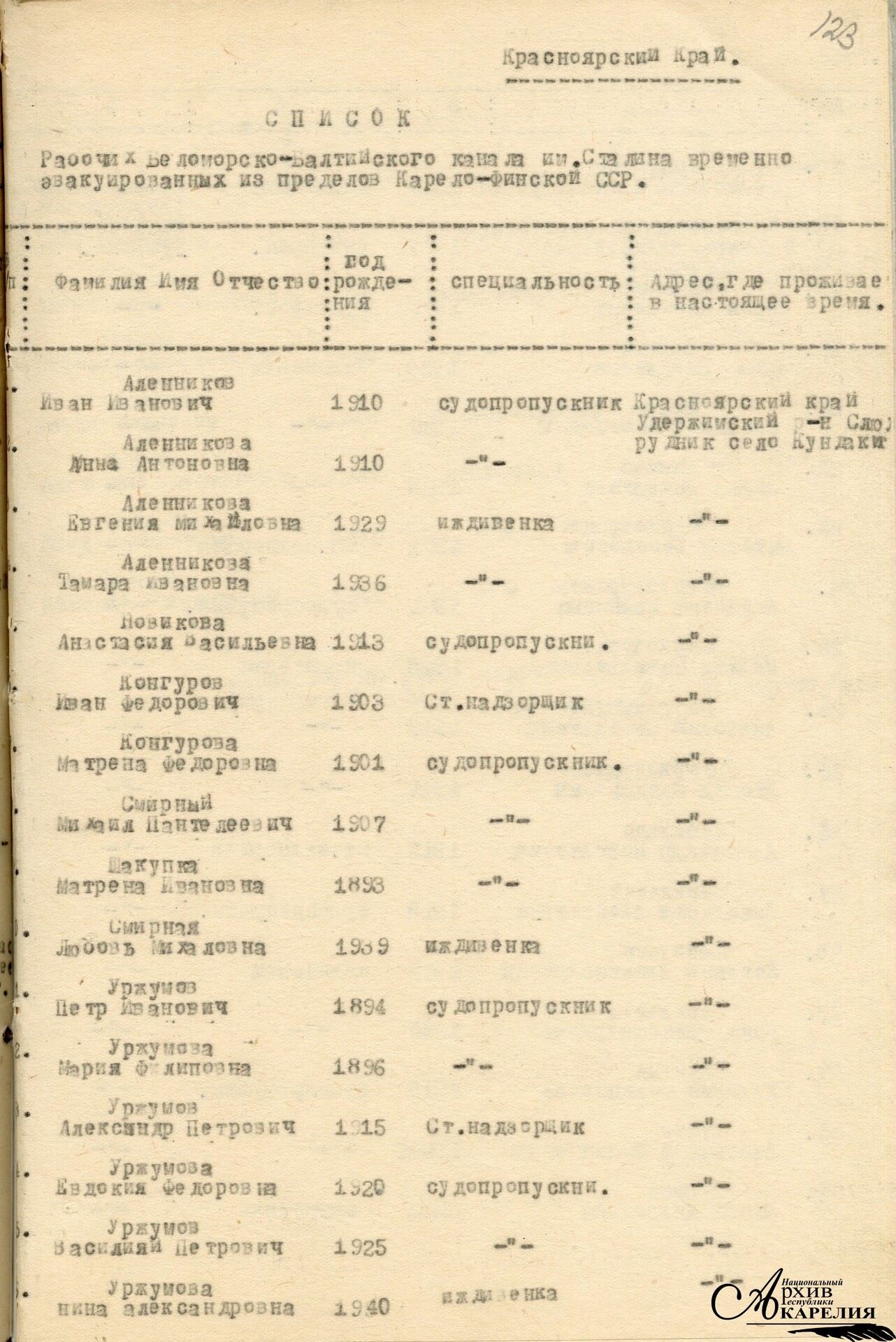 Список специалистов сельского хозяйства (агрономов, механиков, ветврачей), эвакуированных из КФССР и проживающих в Ярославской области, составленный уполномоченным СНК КФССР по Ярославской области Вайноненом для подготовки возвращения в КФССР.